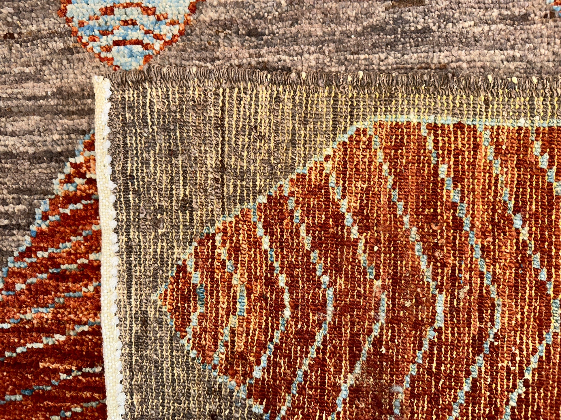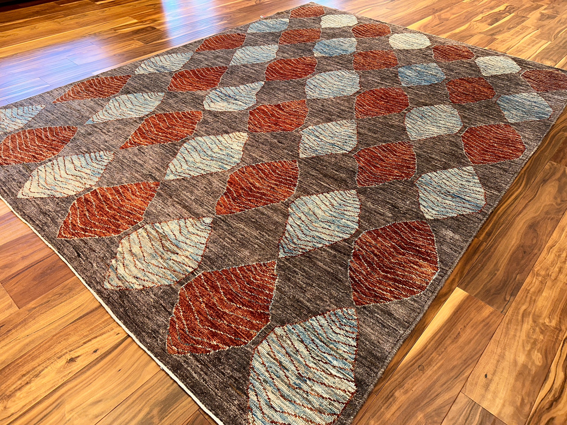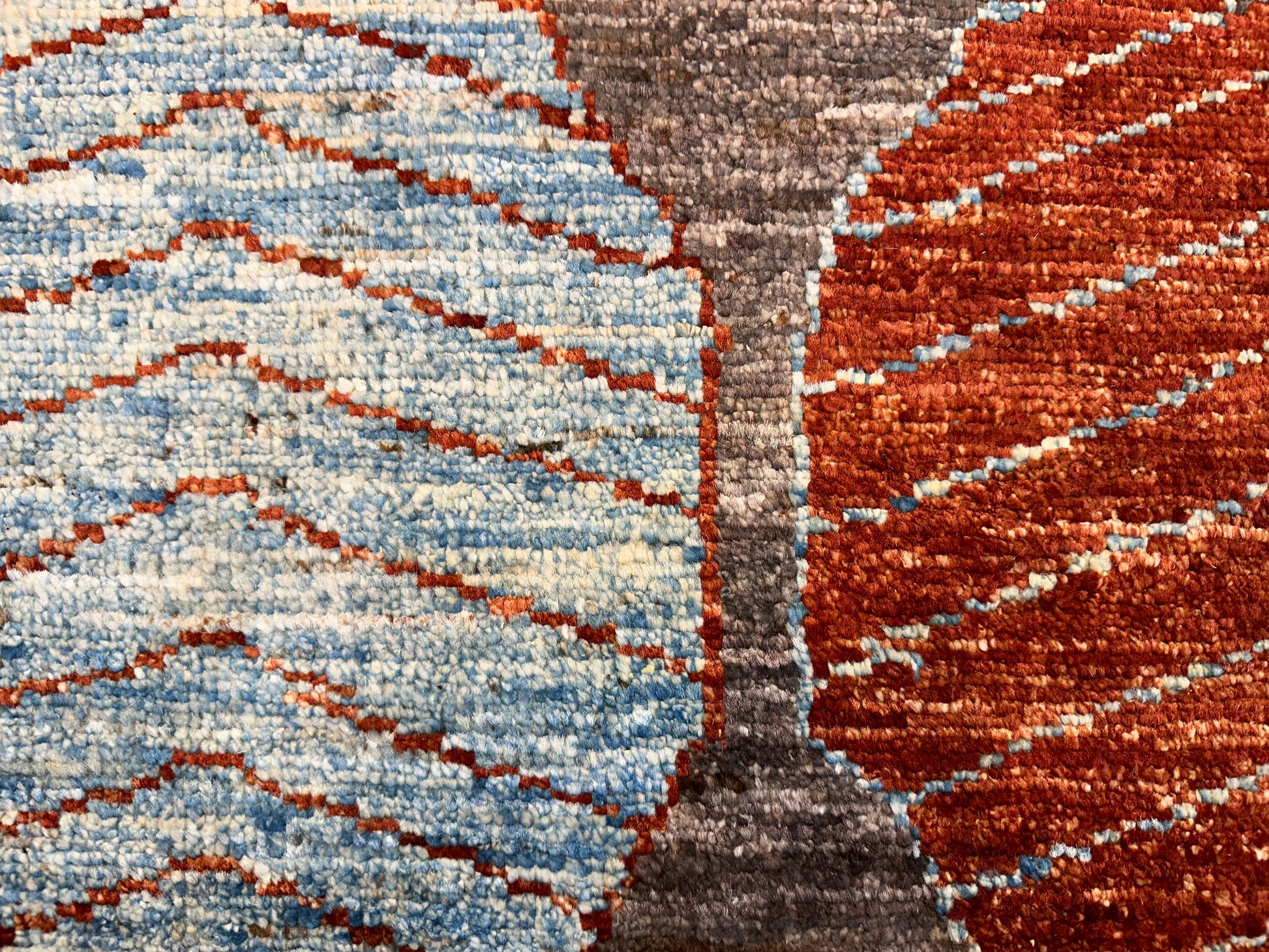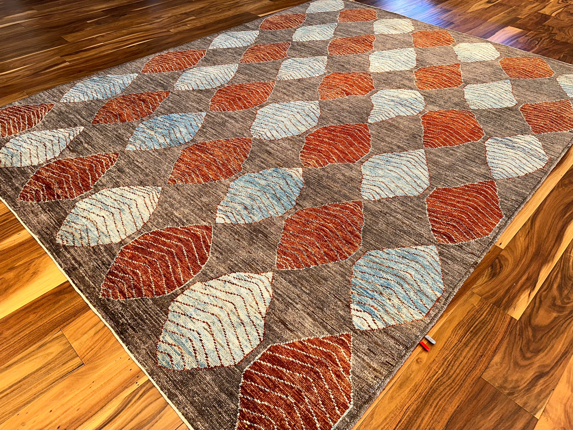 Bold and sculptural, this Moroccan-style rug makes a confident statement with its rhythmic pattern of alternating leaf-like medallions. Rich rust and soft blue motifs sit atop a smoky gray background, each shape subtly textured with fine linear detailing. It’s a perfect blend of symmetry and softness, ideal for anchoring contemporary spaces with a sense of grounded elegance.