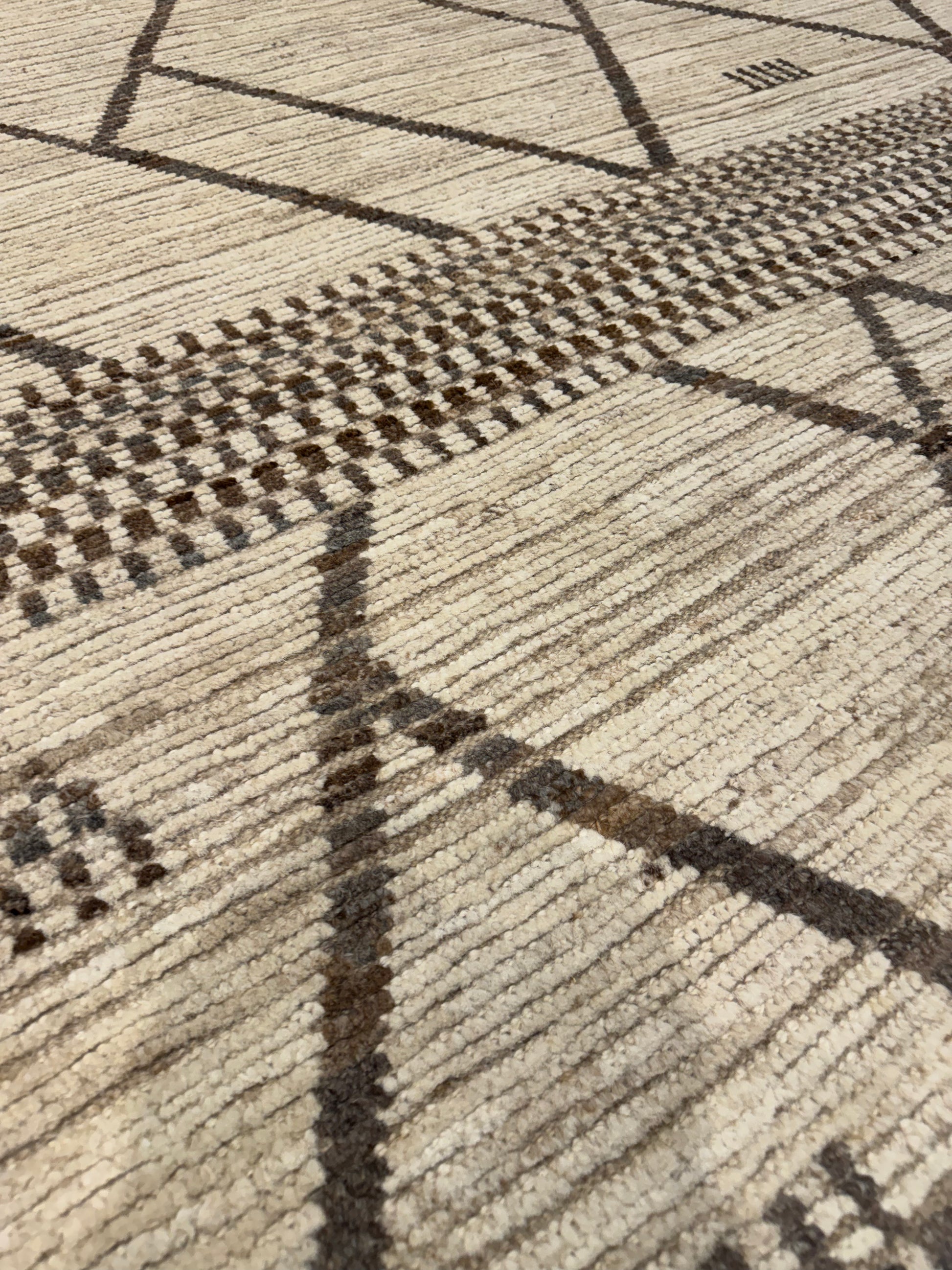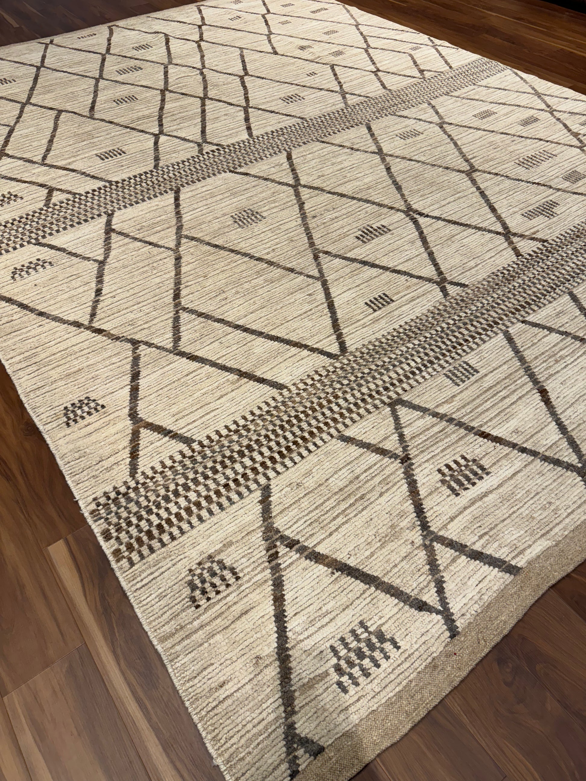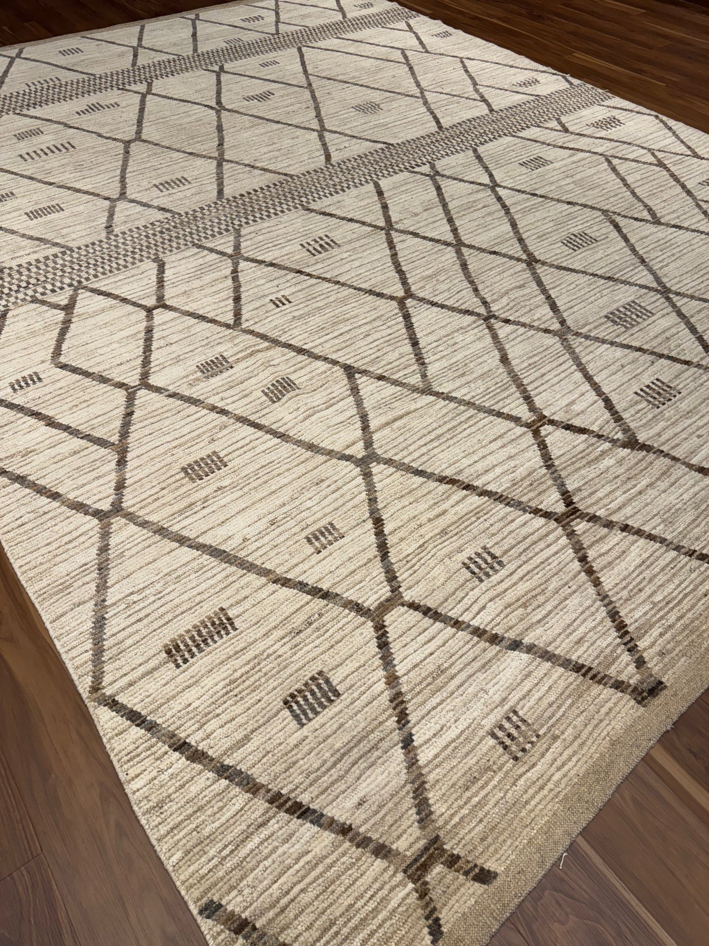 This handwoven Moroccan rug boasts a simple yet striking geometric pattern that embodies traditional Berber artistry. Crafted from high-quality wool, it showcases diamonds and linear figures in brown over a warm beige base, revealing a subtle play of natural wool tones. Its plush texture and fringe detail offer an inviting aesthetic and tactile experience, making it a versatile piece for various interior decors. The rug carries an essence of the rich Moroccan cultural heritage, suitable for those who appreciate ethnic design with a modern twist.