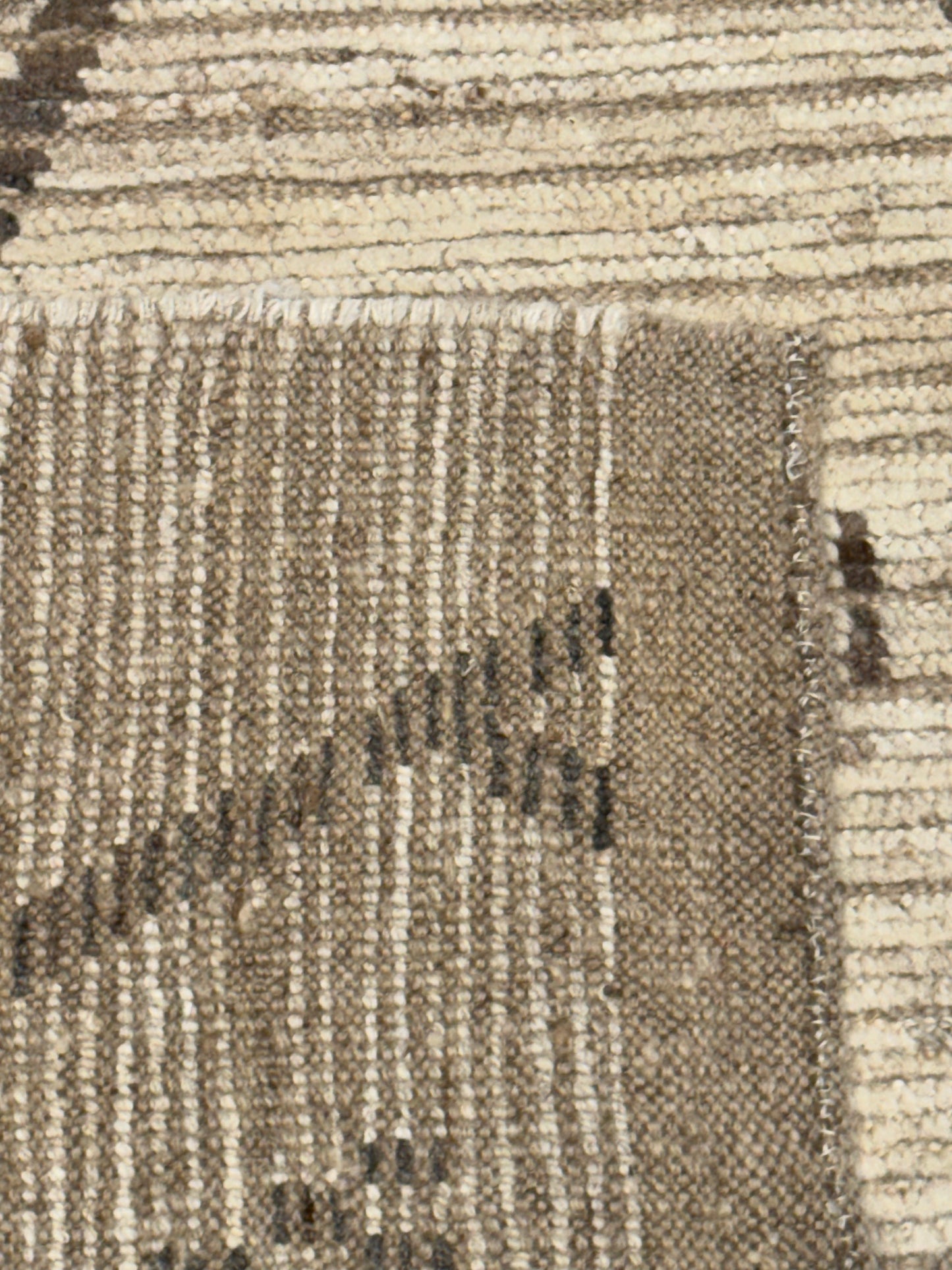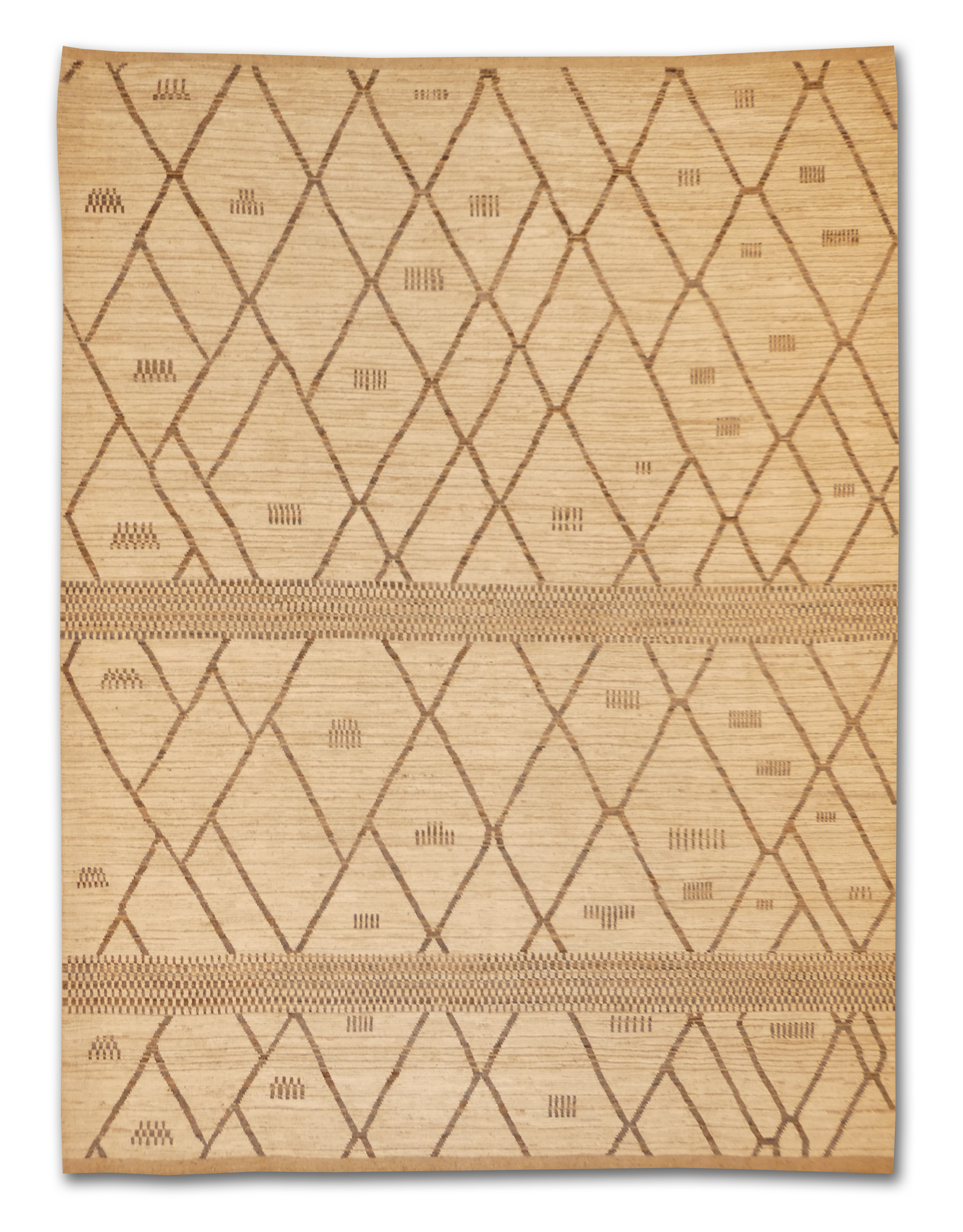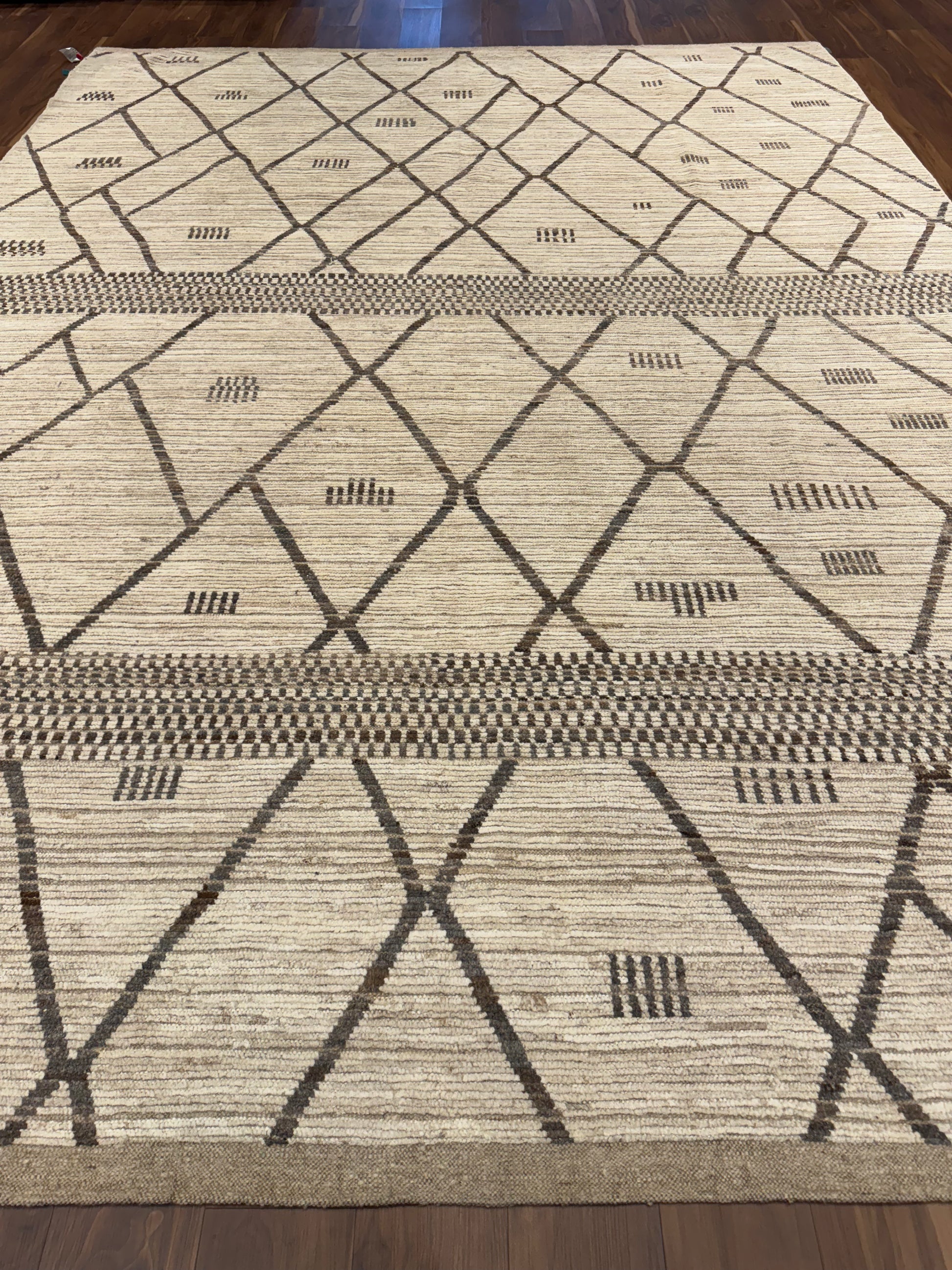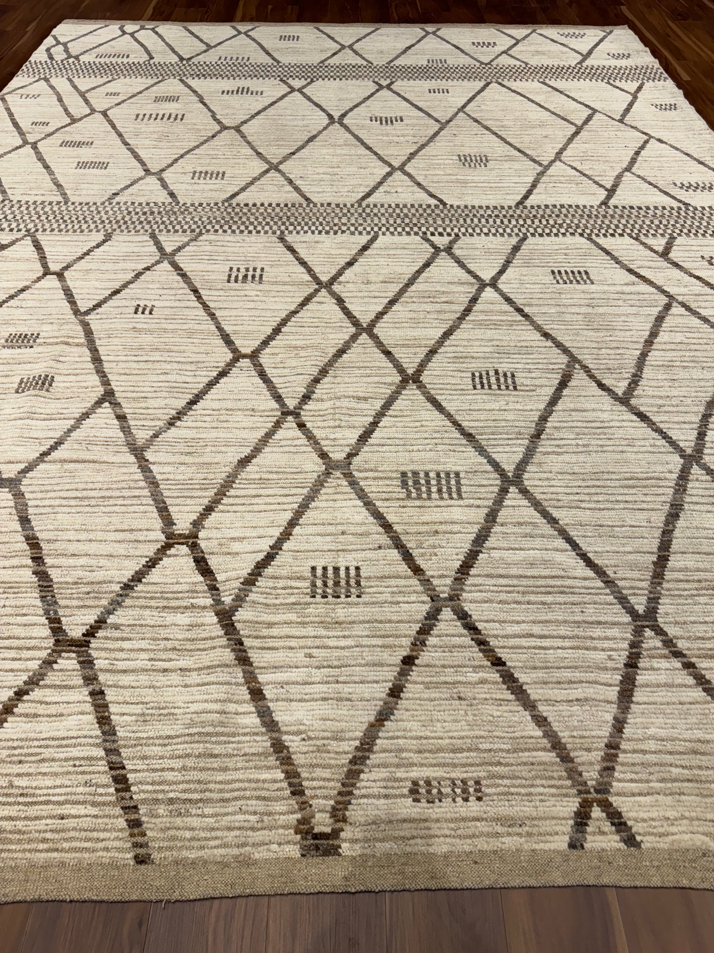 This handwoven Moroccan rug boasts a simple yet striking geometric pattern that embodies traditional Berber artistry. Crafted from high-quality wool, it showcases diamonds and linear figures in brown over a warm beige base, revealing a subtle play of natural wool tones. Its plush texture and fringe detail offer an inviting aesthetic and tactile experience, making it a versatile piece for various interior decors. The rug carries an essence of the rich Moroccan cultural heritage, suitable for those who appreciate ethnic design with a modern twist.