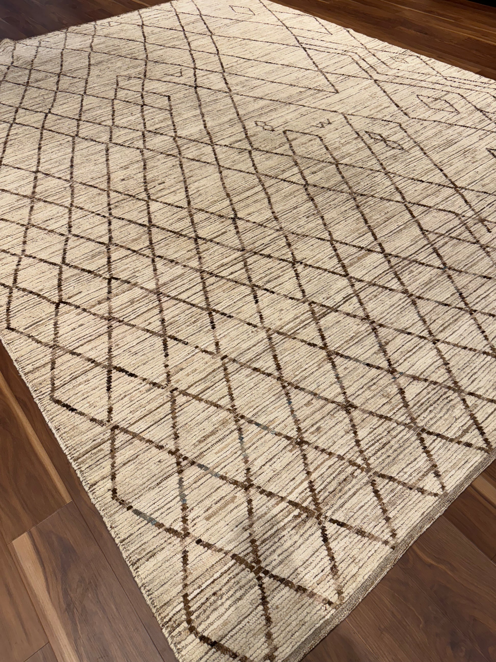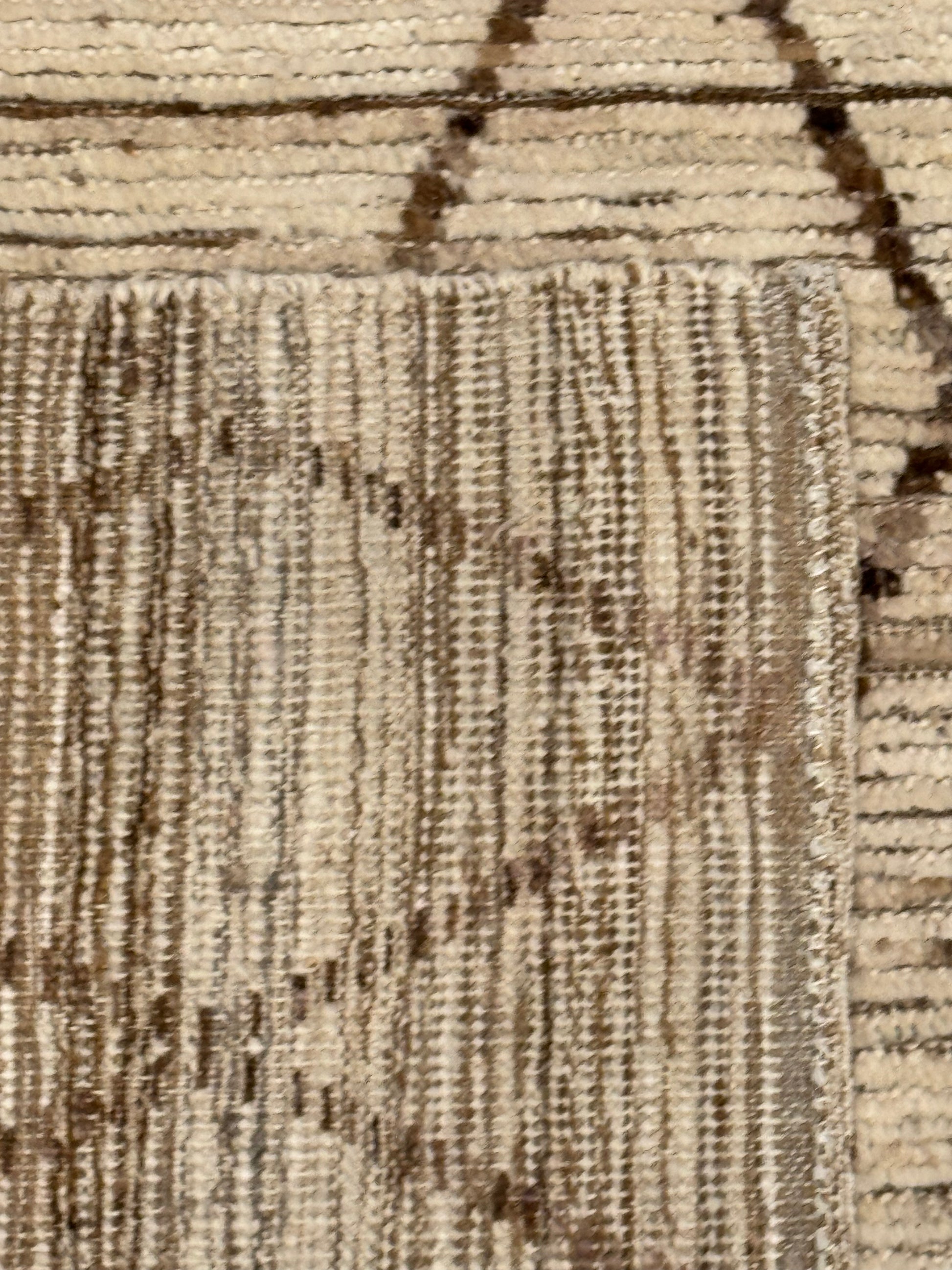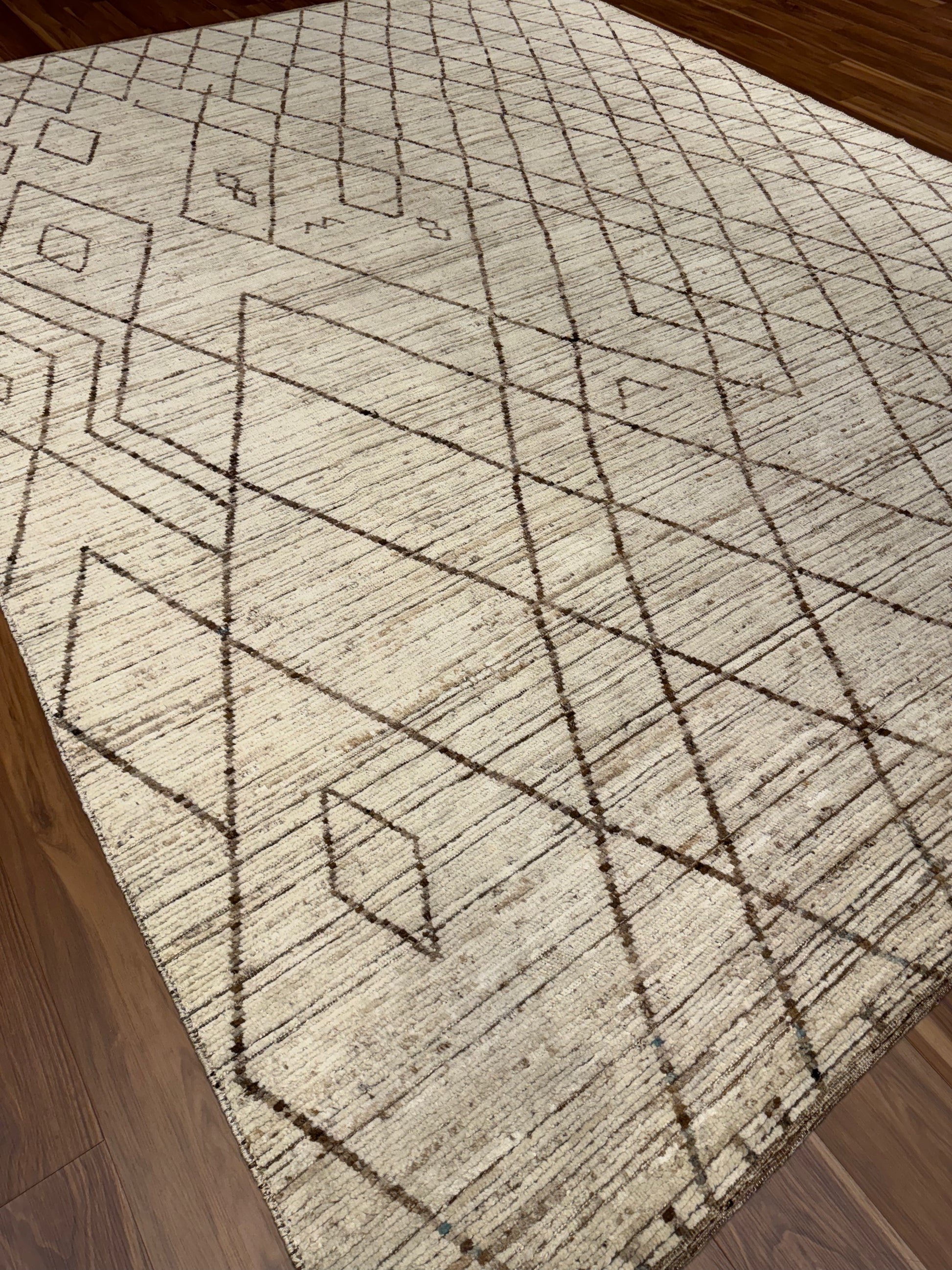 This handcrafted Moroccan wool rug presents a minimalistic yet evocative design. The natural beige hues serve as a serene base, while the intricate geometric black patterns impart an understated elegance. Perfect for both contemporary and traditional spaces, this rug is a testament to the rich heritage of Moroccan weaving, offering warmth and refined style. Its durable wool construction ensures long-lasting comfort and timeless appeal.