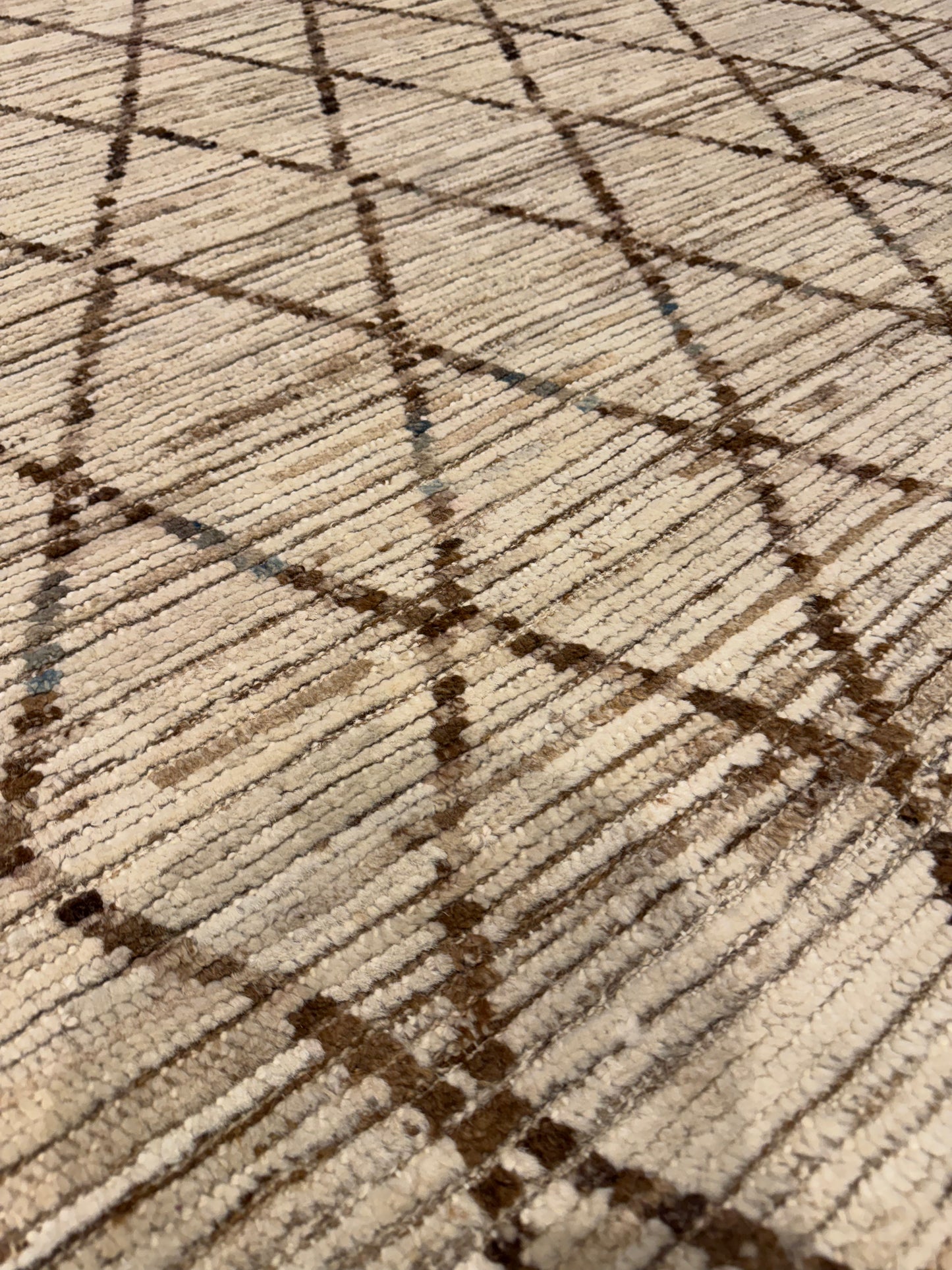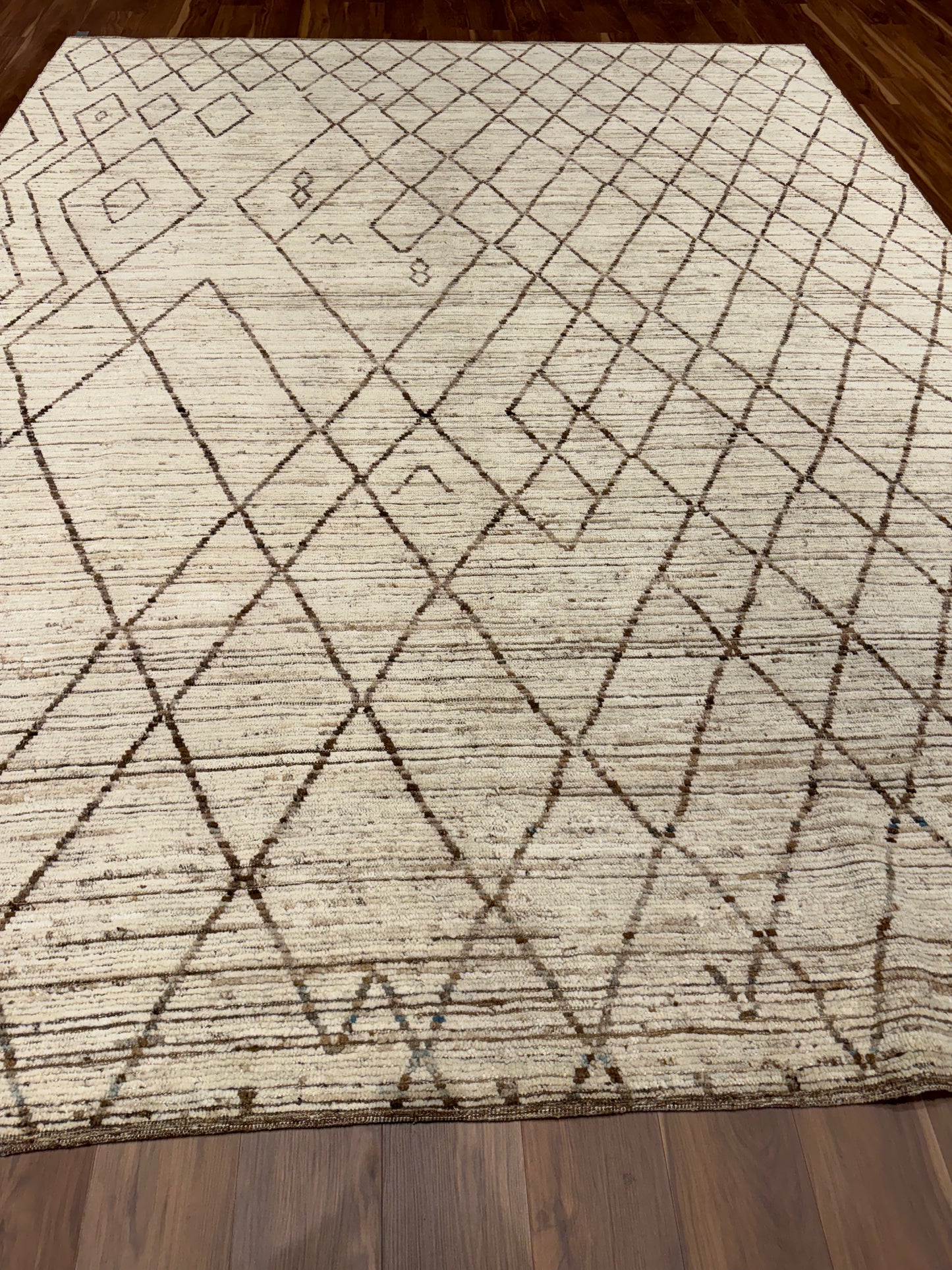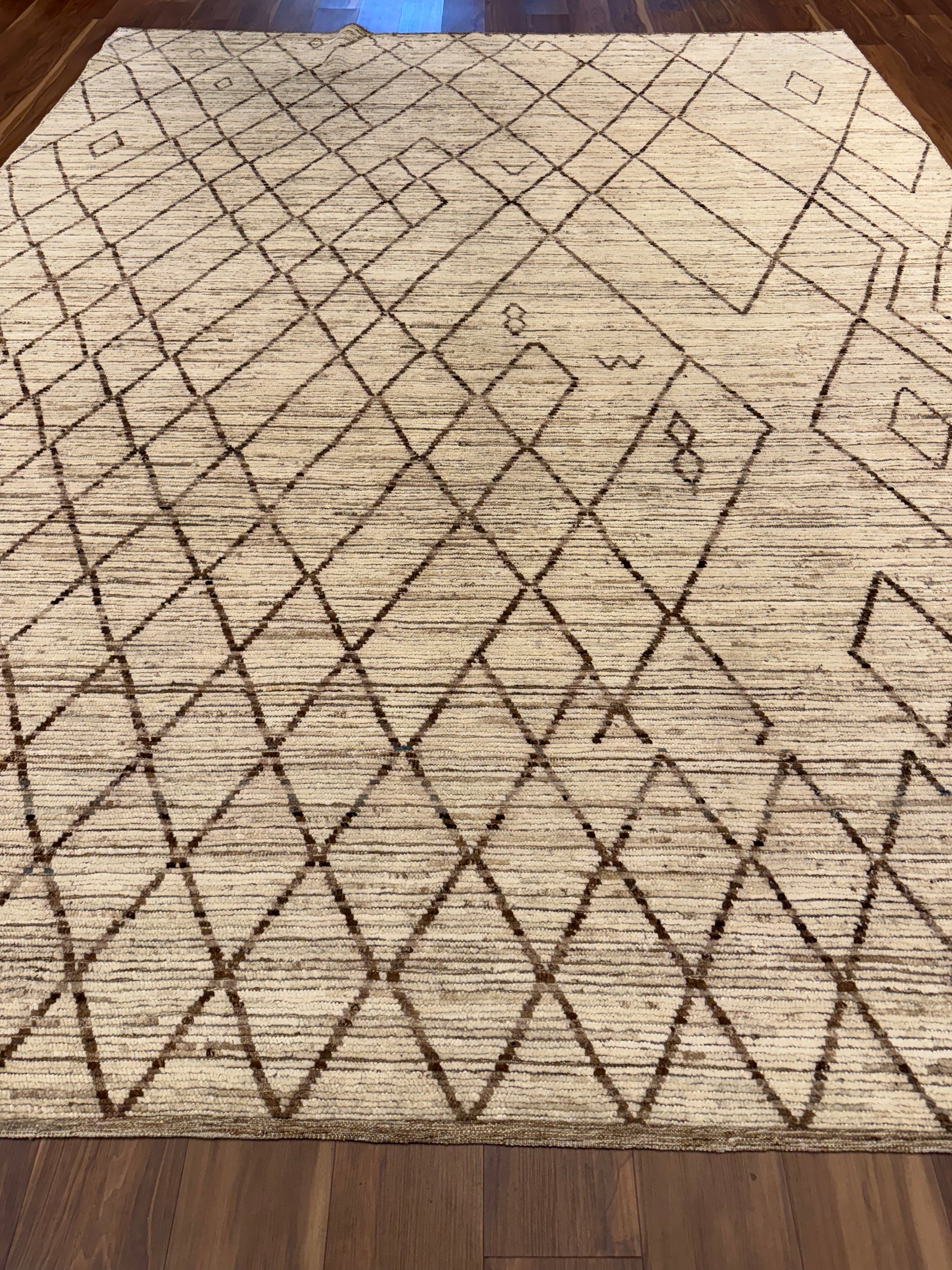 This handcrafted Moroccan wool rug presents a minimalistic yet evocative design. The natural beige hues serve as a serene base, while the intricate geometric black patterns impart an understated elegance. Perfect for both contemporary and traditional spaces, this rug is a testament to the rich heritage of Moroccan weaving, offering warmth and refined style. Its durable wool construction ensures long-lasting comfort and timeless appeal.