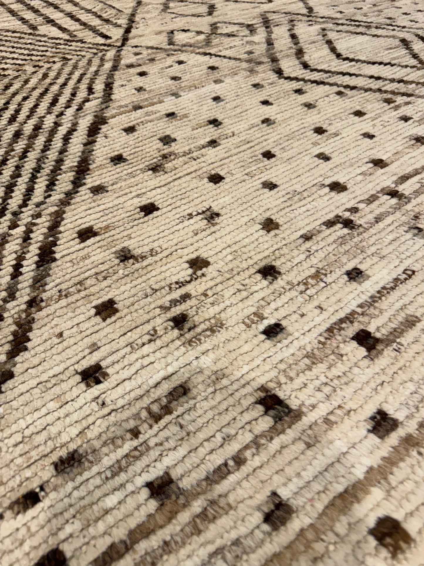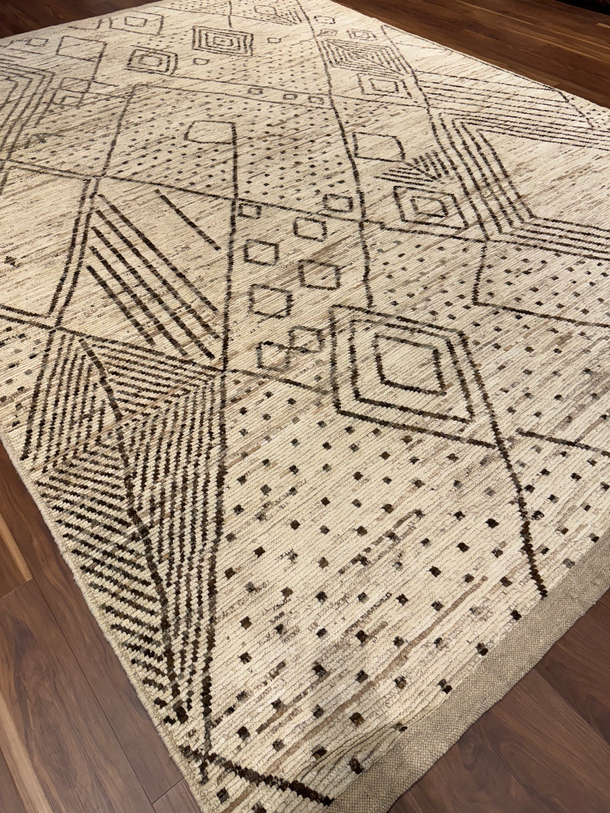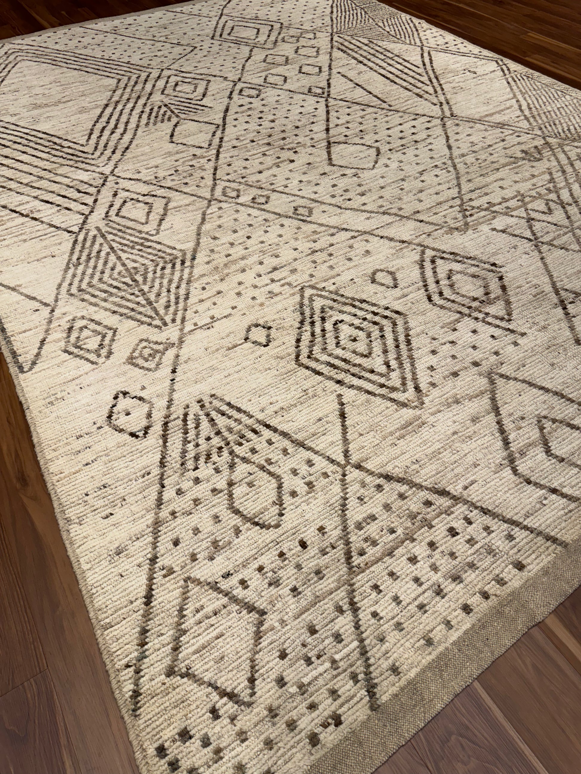 This Moroccan wool rug boasts a symphony of earthy beige and brown hues, intricately adorned with tribal geometric patterns that speak volumes of its rich heritage. Crafted from the finest wool, its texture offers unparalleled warmth and comfort. Perfect for adding an exotic yet sophisticated touch to any living space, its minimalistic color palette ensures it complements a wide range of interior decors.