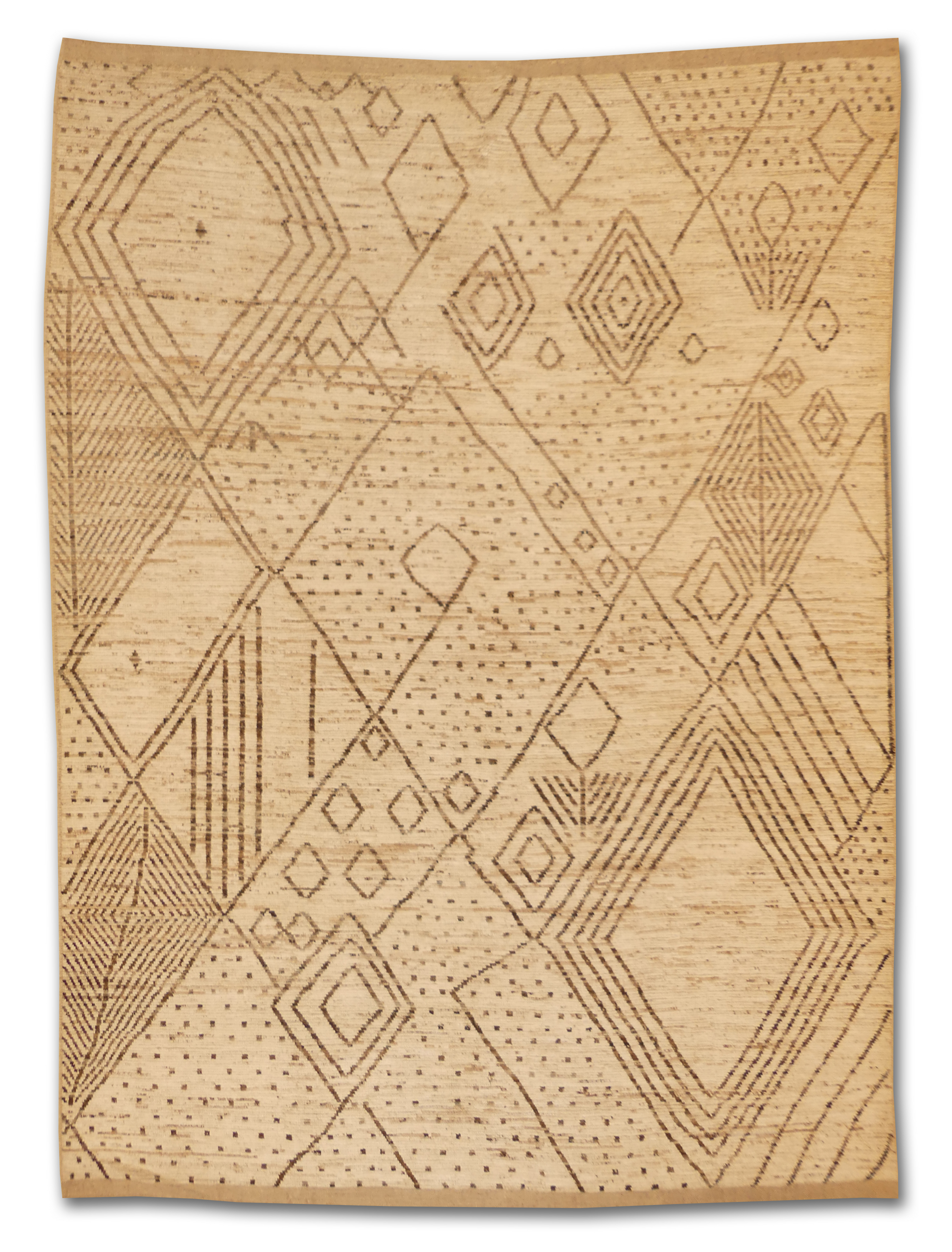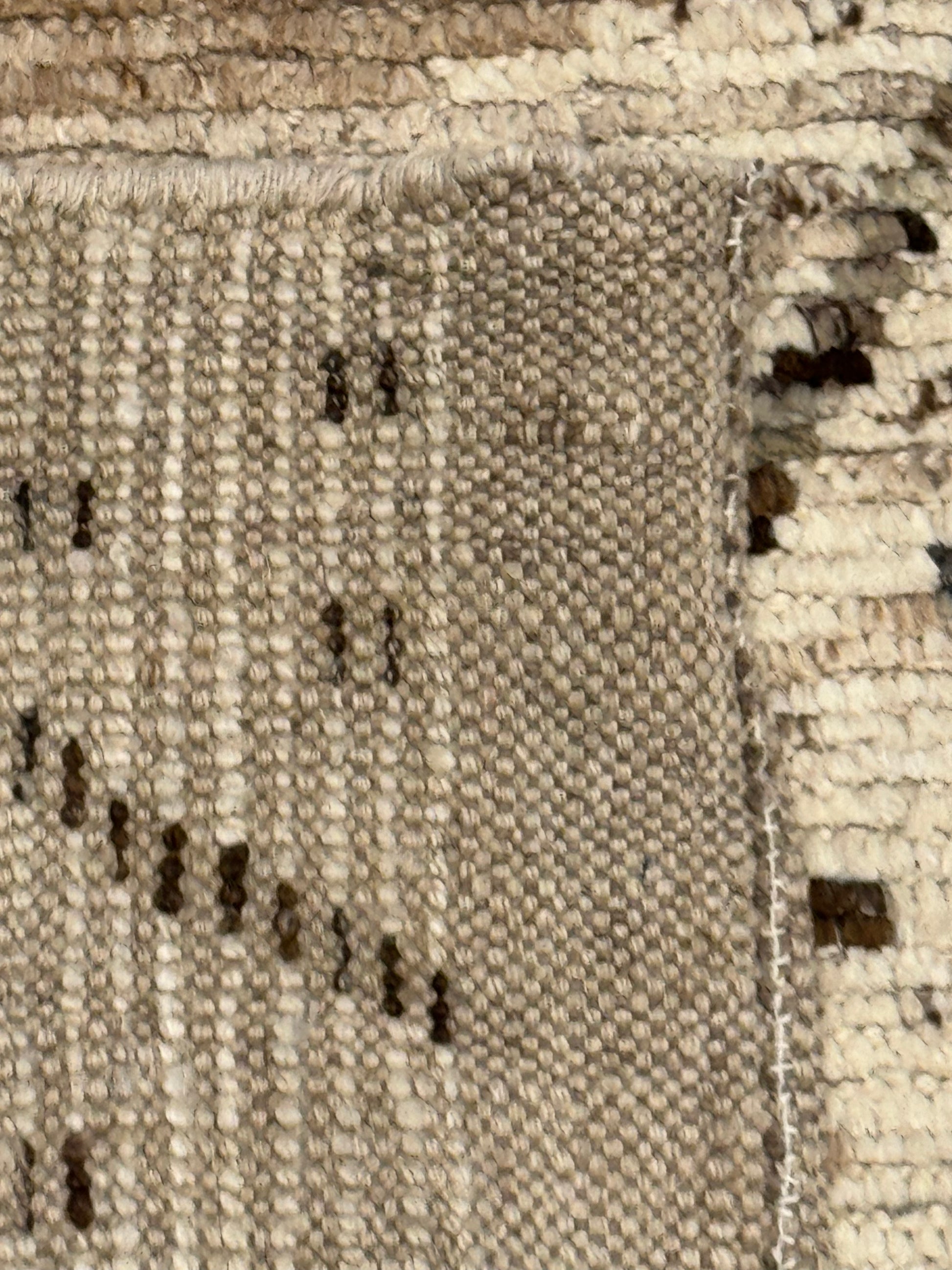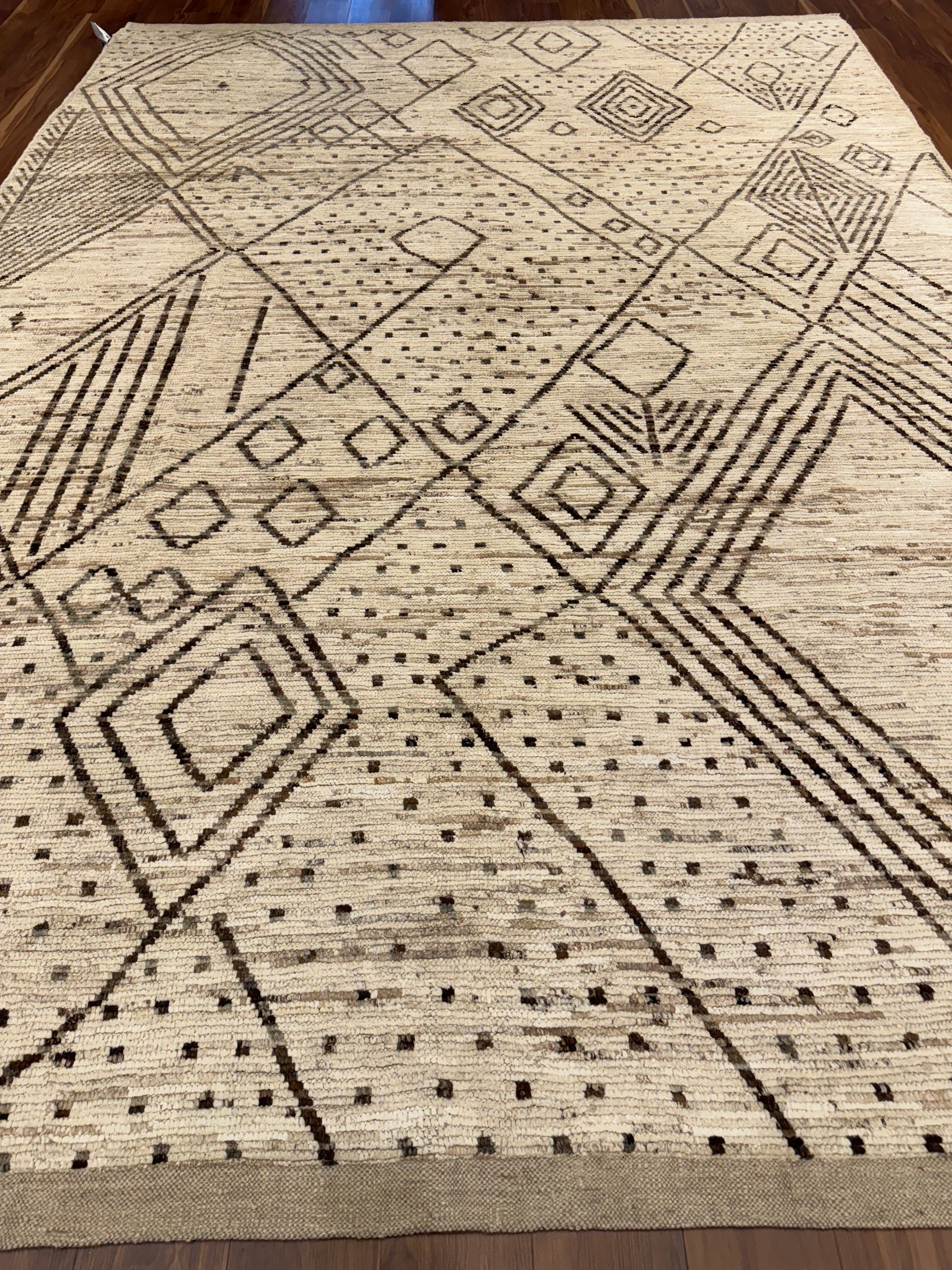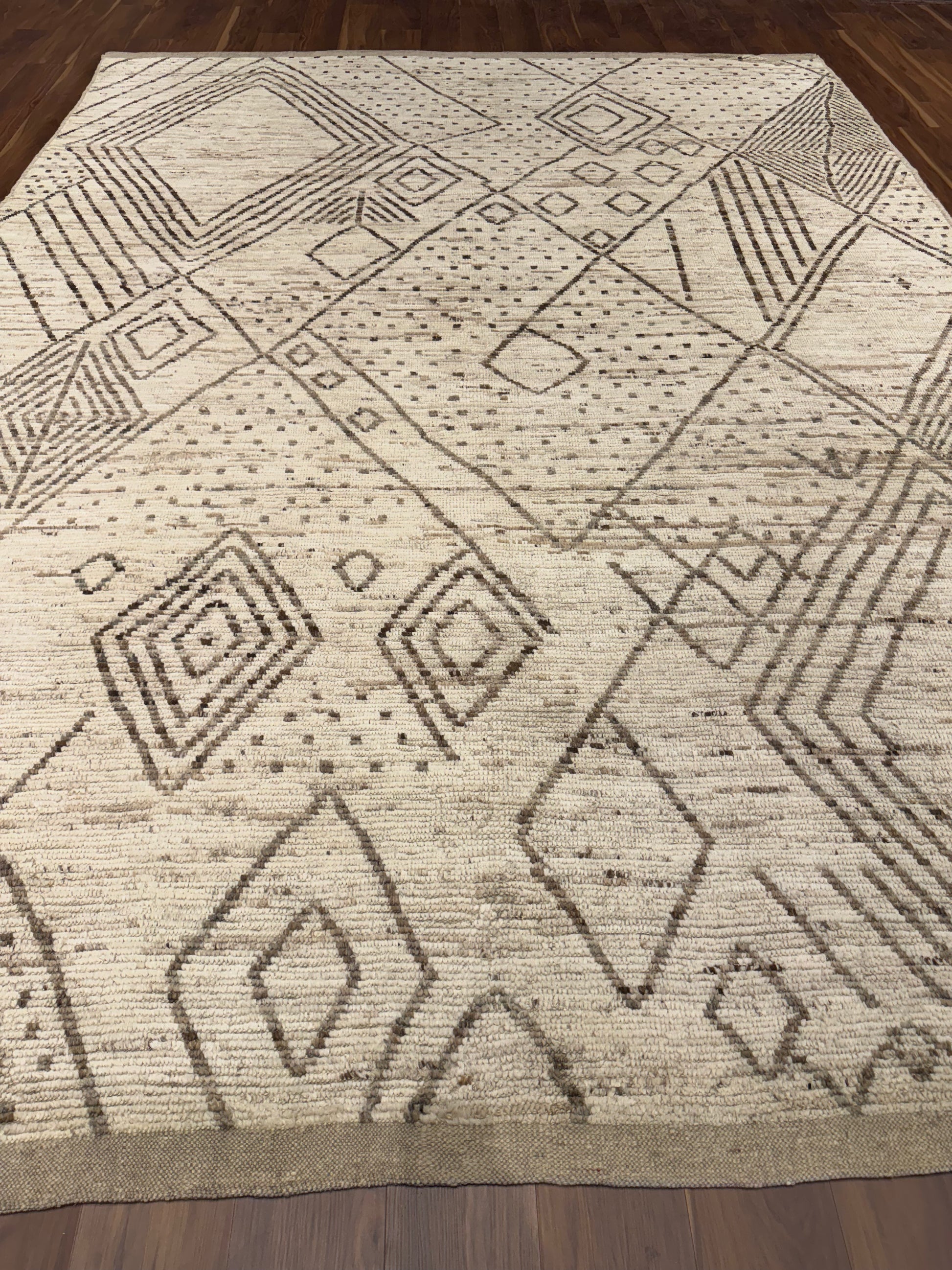 This Moroccan wool rug boasts a symphony of earthy beige and brown hues, intricately adorned with tribal geometric patterns that speak volumes of its rich heritage. Crafted from the finest wool, its texture offers unparalleled warmth and comfort. Perfect for adding an exotic yet sophisticated touch to any living space, its minimalistic color palette ensures it complements a wide range of interior decors.