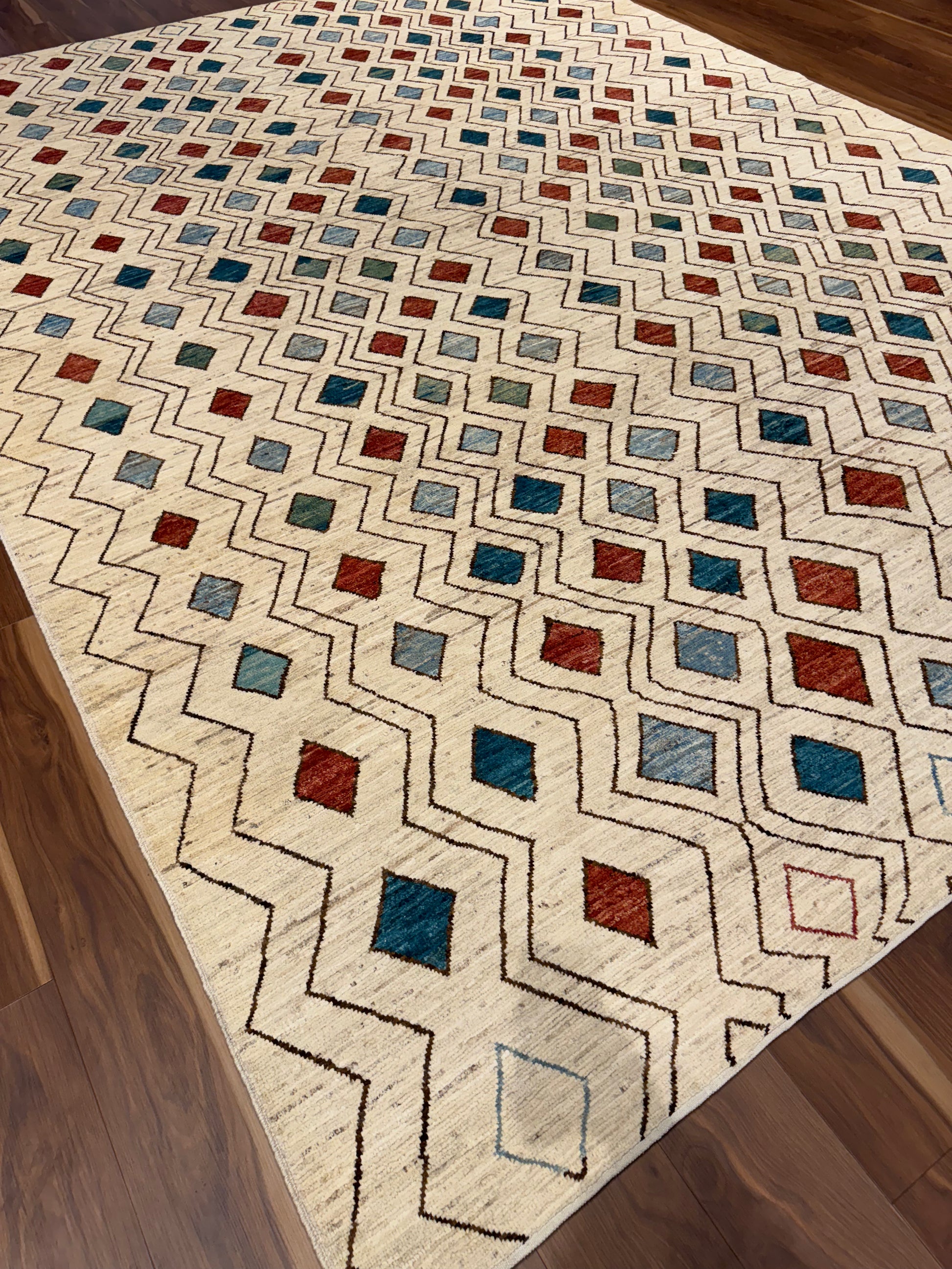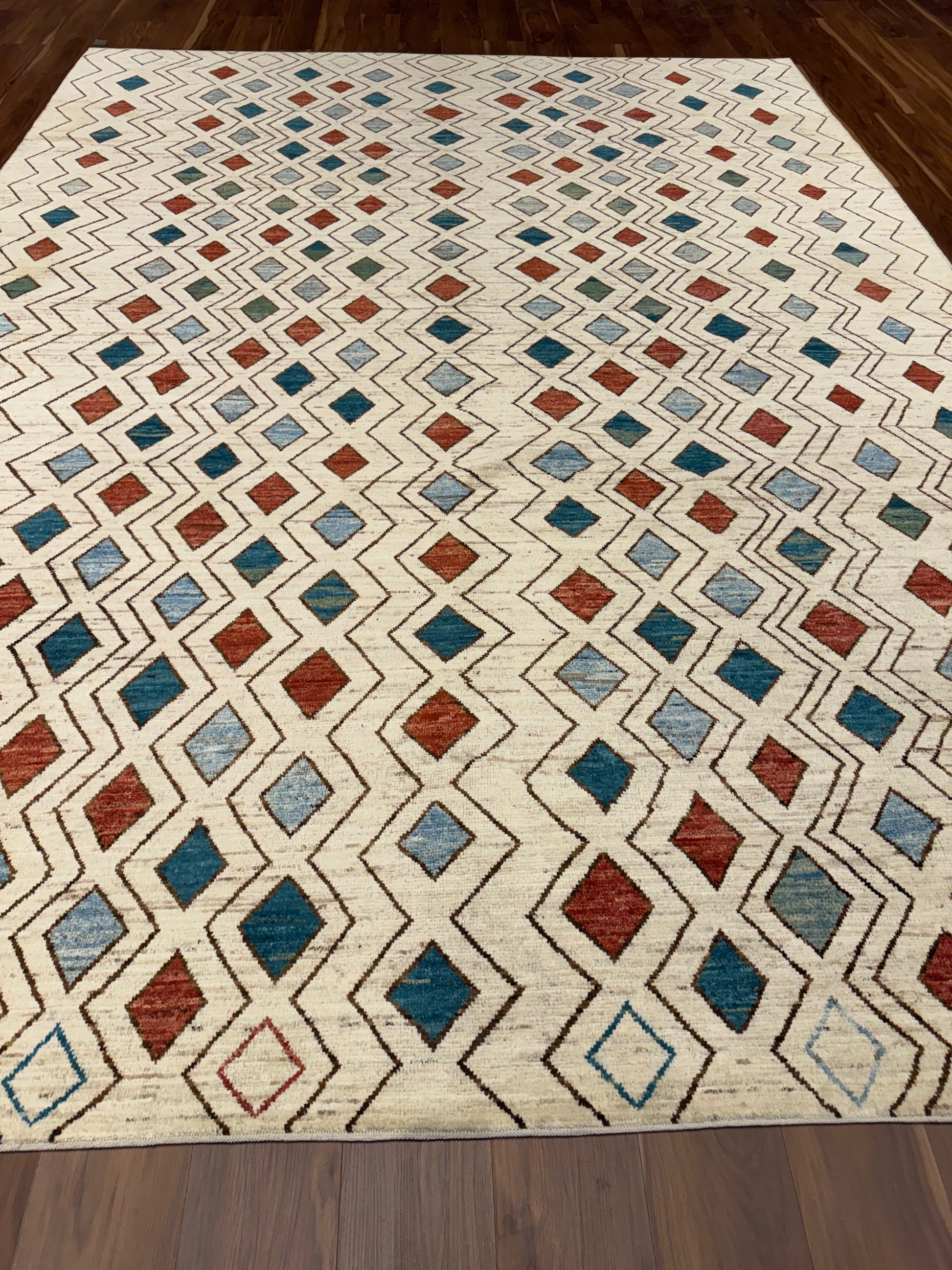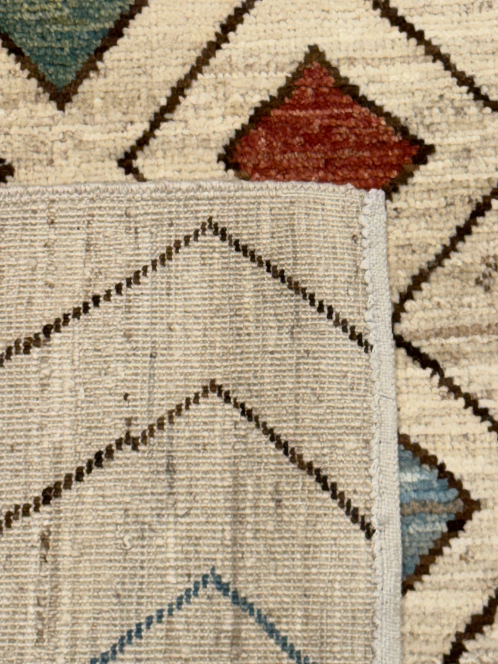 This Moroccan wool rug features a harmonious symphony of color and pattern. Traditional diamond motifs in red, blue, and green hues adorn the soft beige background, creating an inviting and warm atmosphere. Hand-woven by skilled artisans, this rug embodies the rich textile heritage of Morocco. Its plush wool construction ensures both comfort and durability, making it an excellent addition to any living space seeking a touch of authenticity and worldly charm.