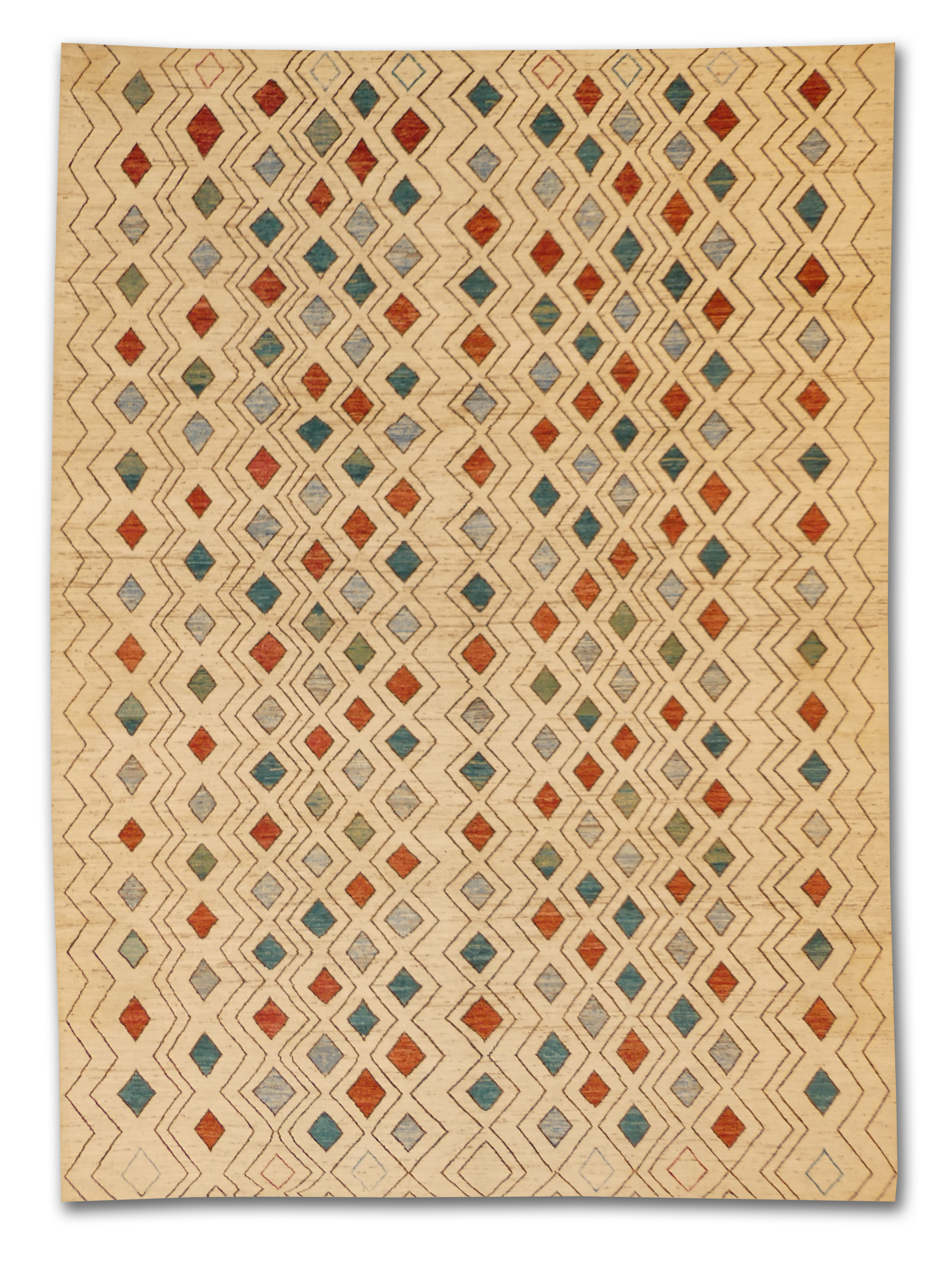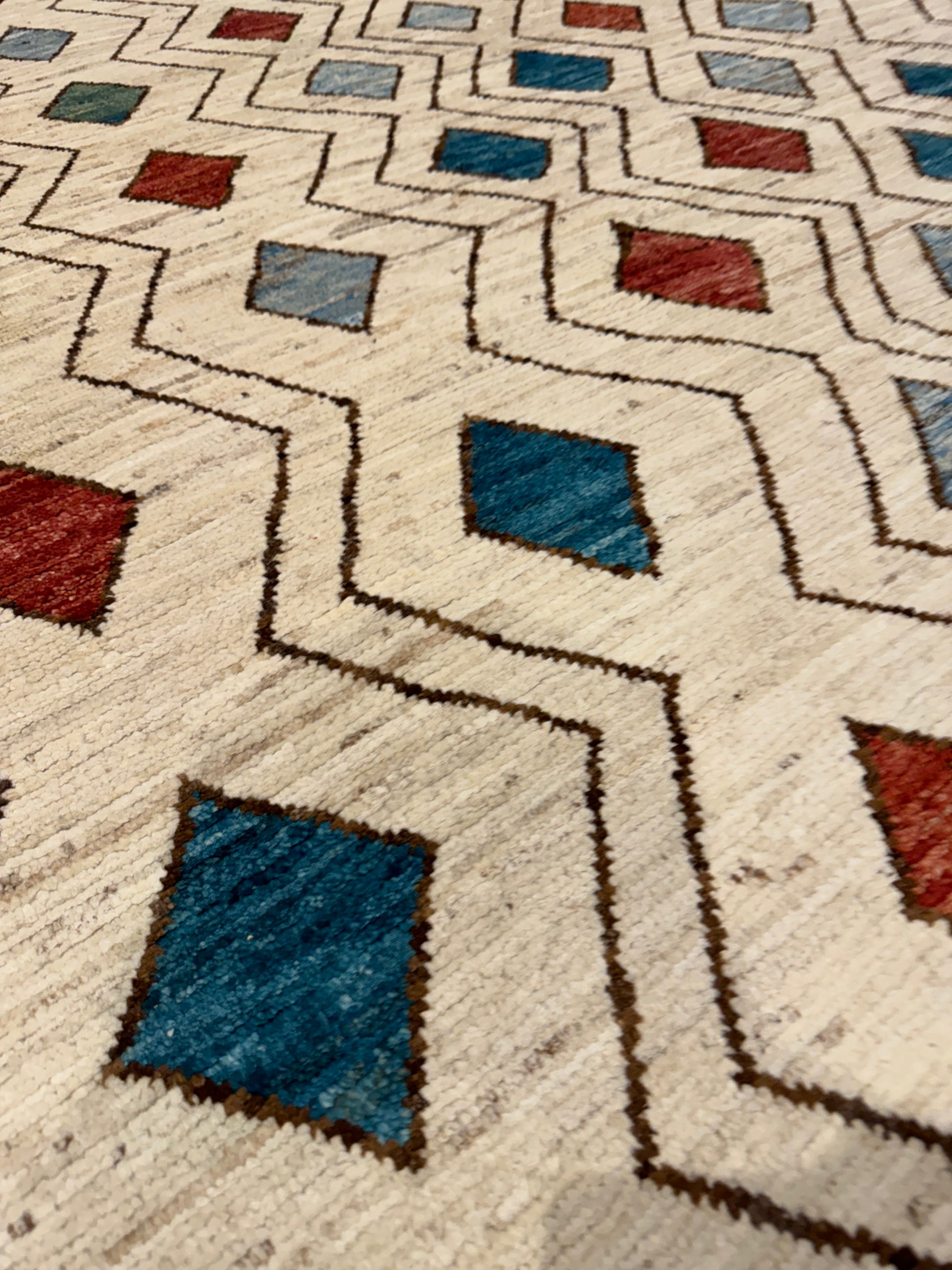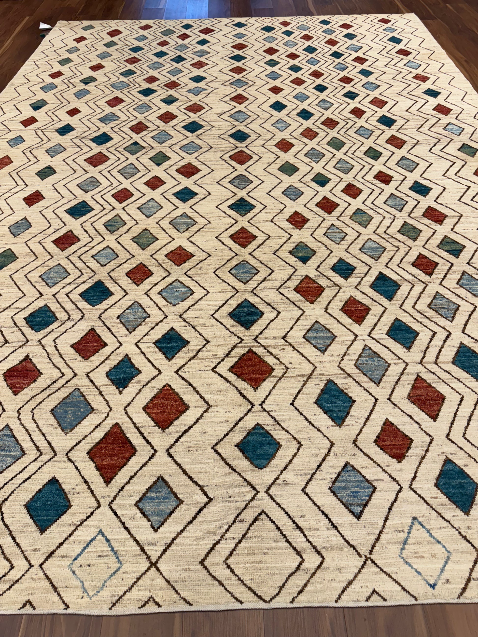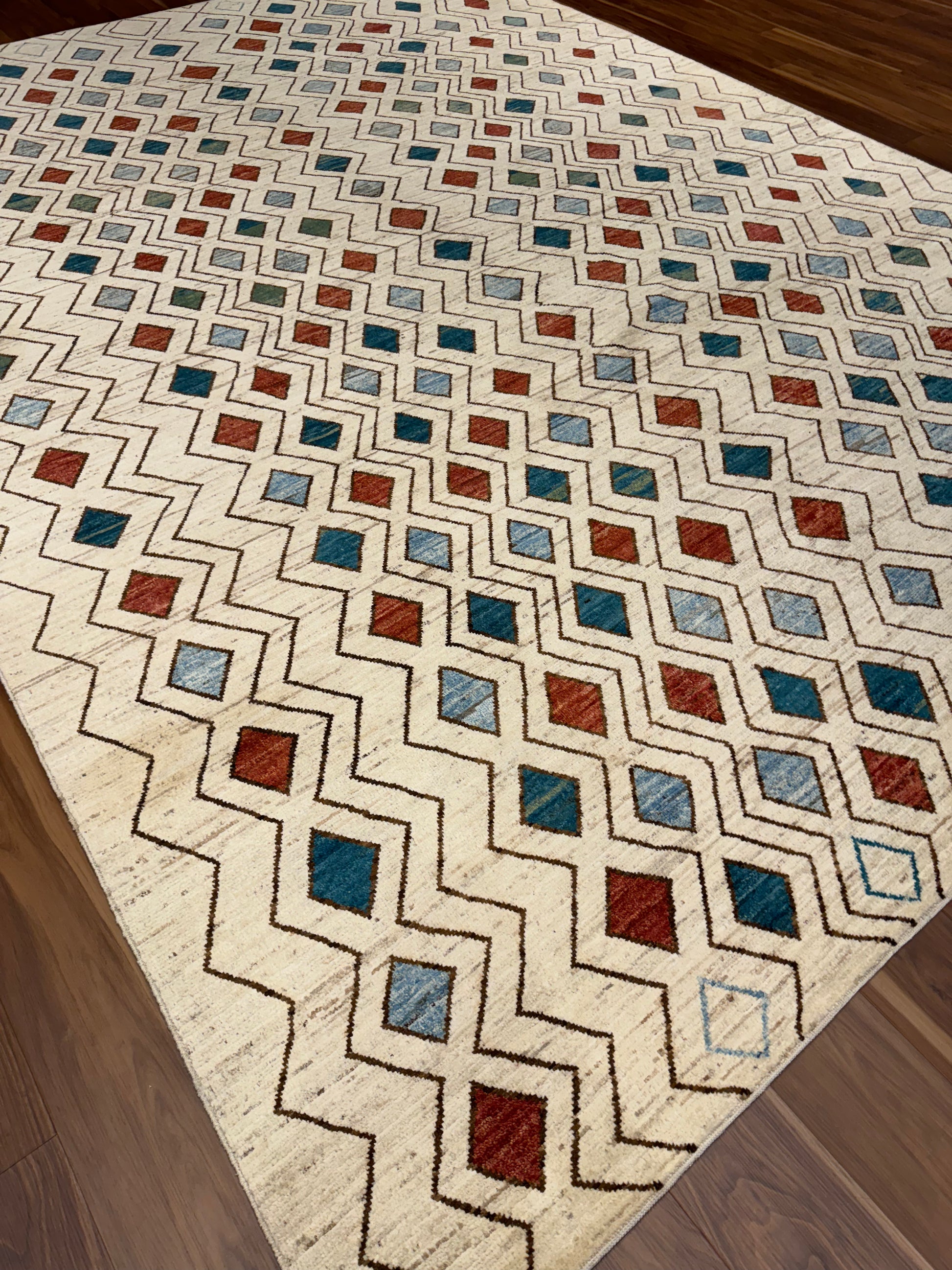 This Moroccan wool rug features a harmonious symphony of color and pattern. Traditional diamond motifs in red, blue, and green hues adorn the soft beige background, creating an inviting and warm atmosphere. Hand-woven by skilled artisans, this rug embodies the rich textile heritage of Morocco. Its plush wool construction ensures both comfort and durability, making it an excellent addition to any living space seeking a touch of authenticity and worldly charm.
