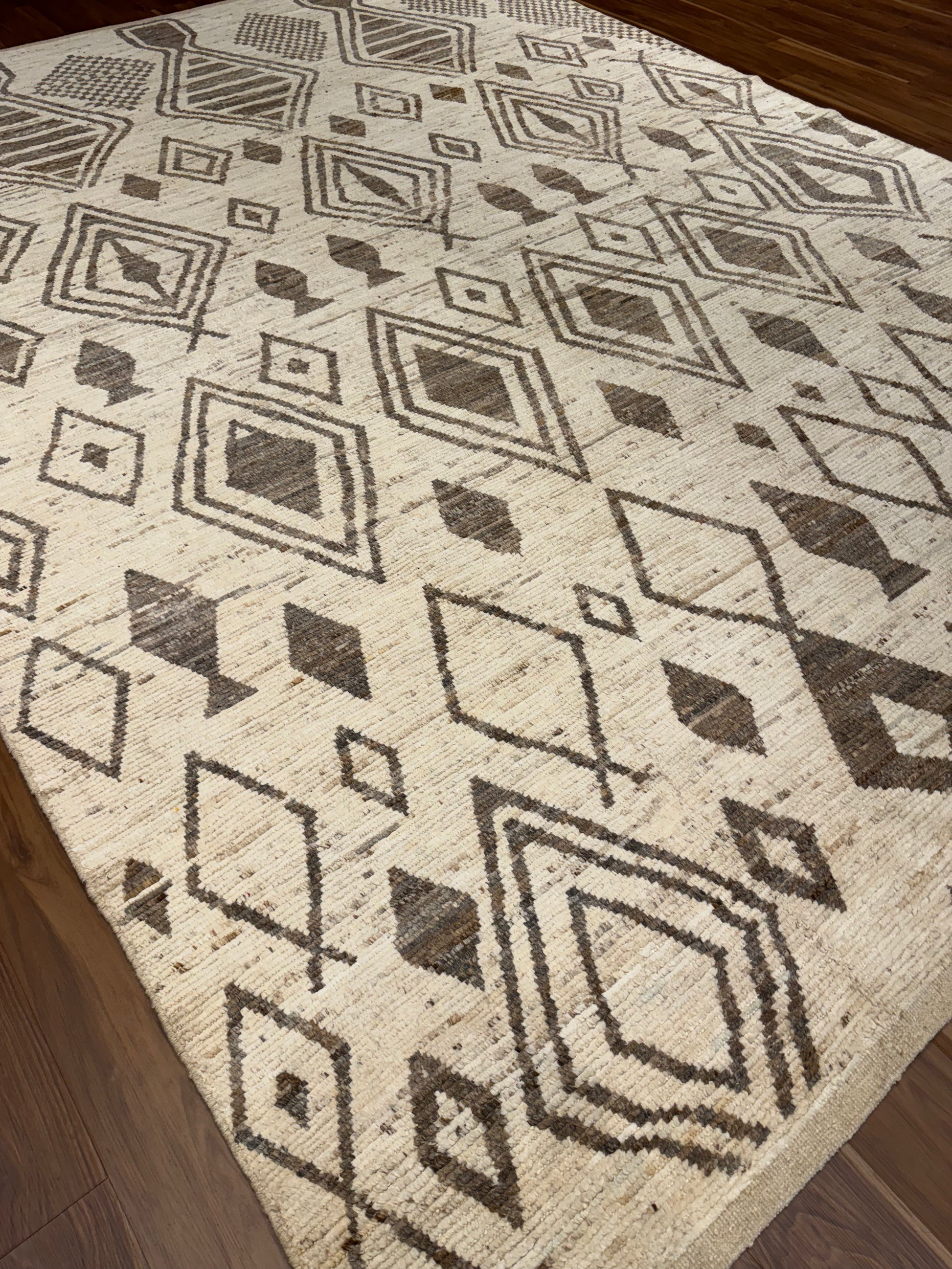 This exquisite Moroccan-style rug exudes timeless elegance with its wool construction. It features a symphony of geometric patterns and offers a harmonious blend of natural beige and brown hues. The design echoes traditional Berber motifs that have been revered for centuries, imbued with a sense of history and artisanship. Perfect for adding a touch of organic texture and cultural flair to any living space, this rug is both a functional piece and a work of art.