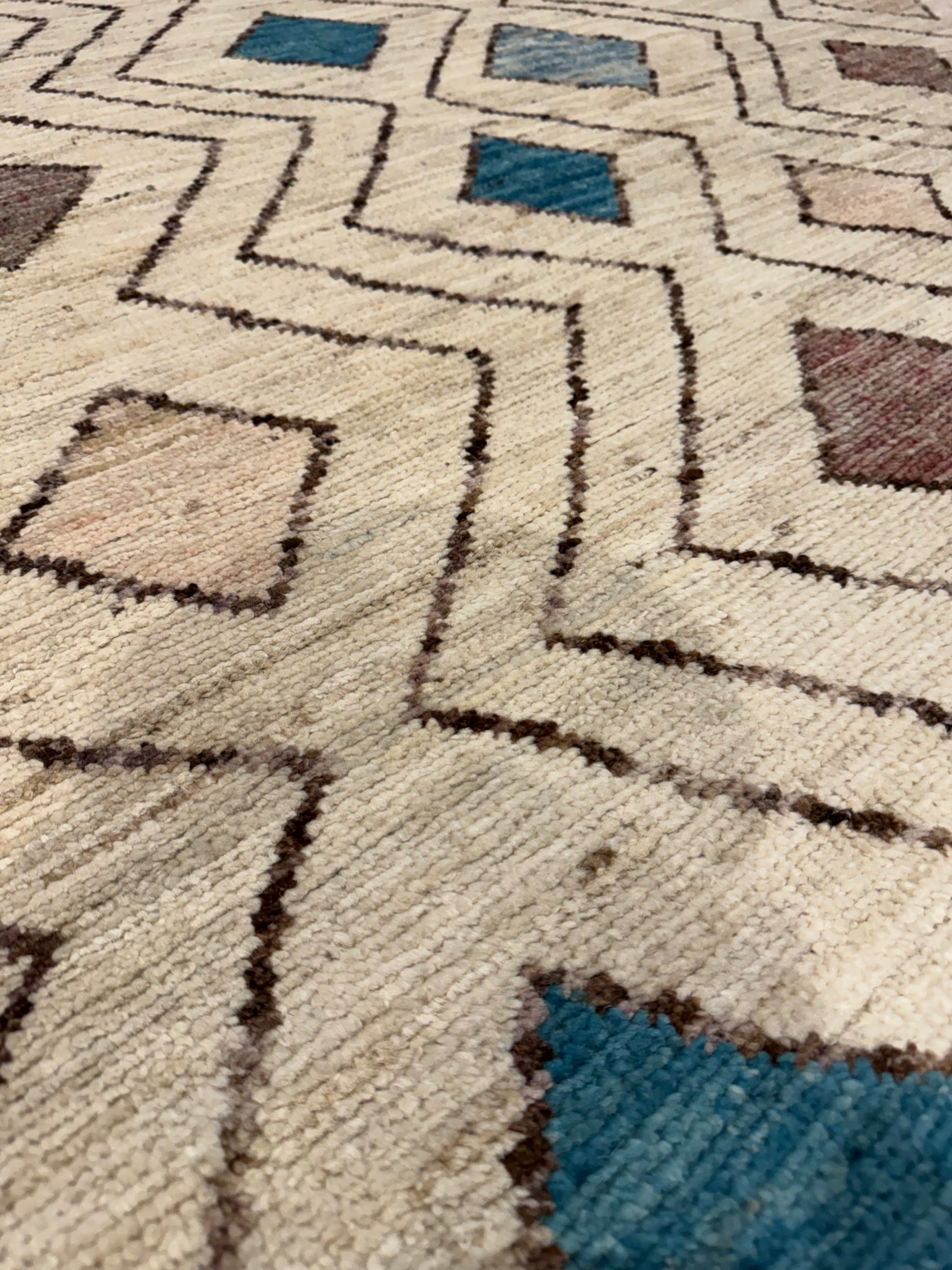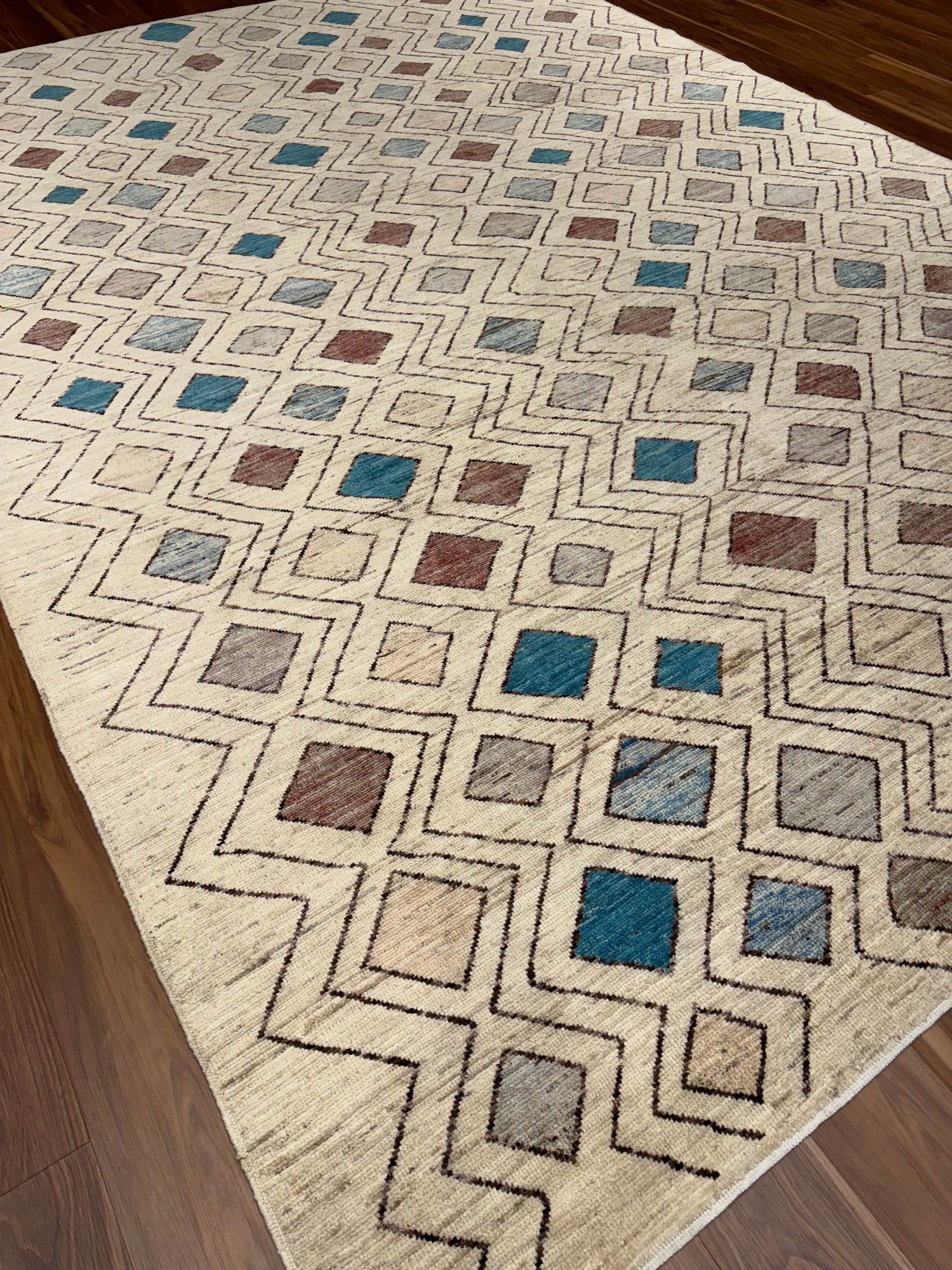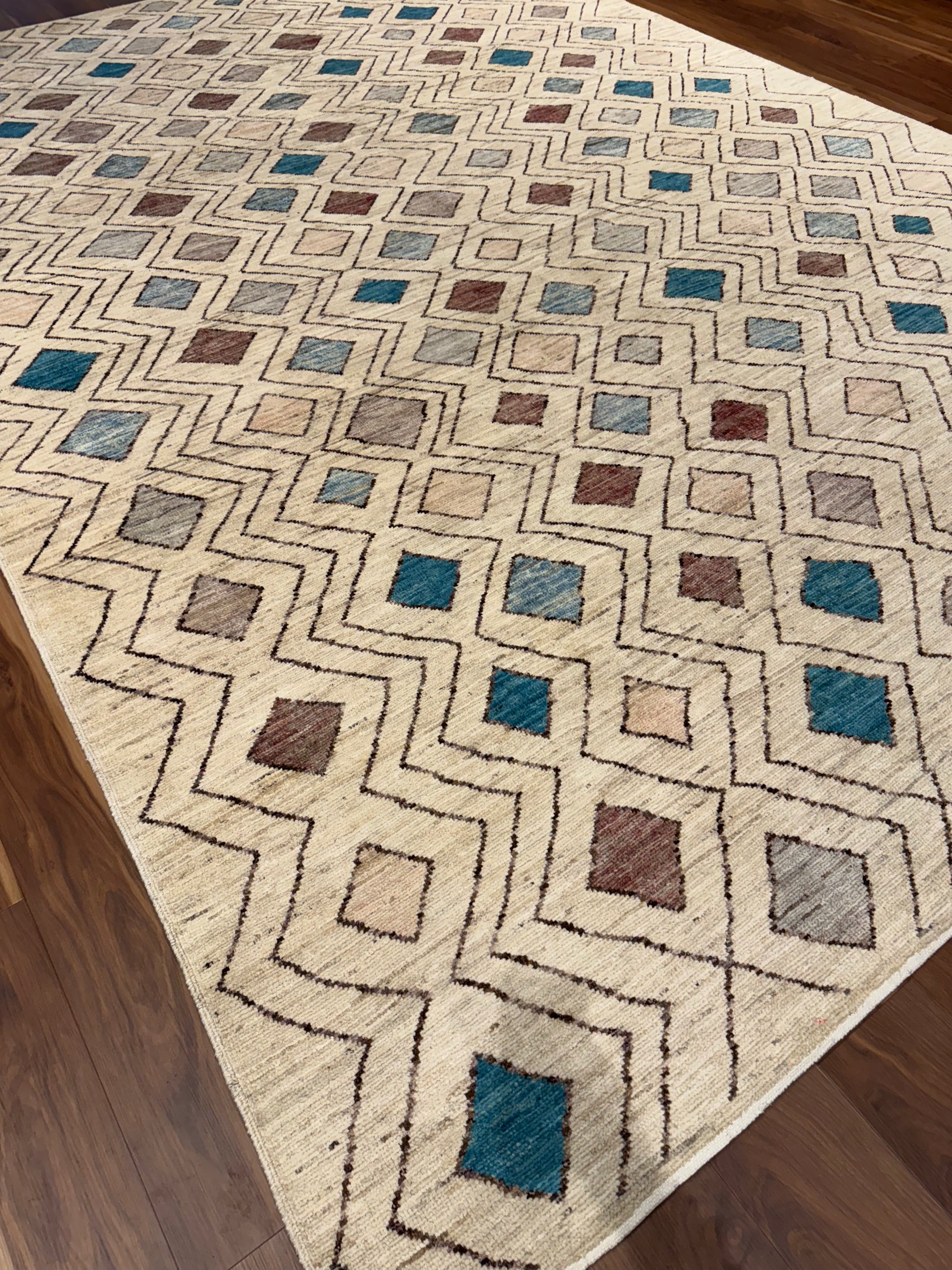 This Moroccan Wool Rug showcases a harmonious blend of beige, blue, brown, and rust hues, interwoven to create a sophisticated geometric pattern that exudes traditional charm with a modern twist. It embodies the essence of Moroccan artistry, masterfully handcrafted from high-quality wool to enhance both the comfort and elegance of your living space. With its intricate diamond lattice design, this rug adds a cozy yet chic aesthetic, perfect for anchoring furniture in a living room, bedroom, or any area seeking a touch of warmth.