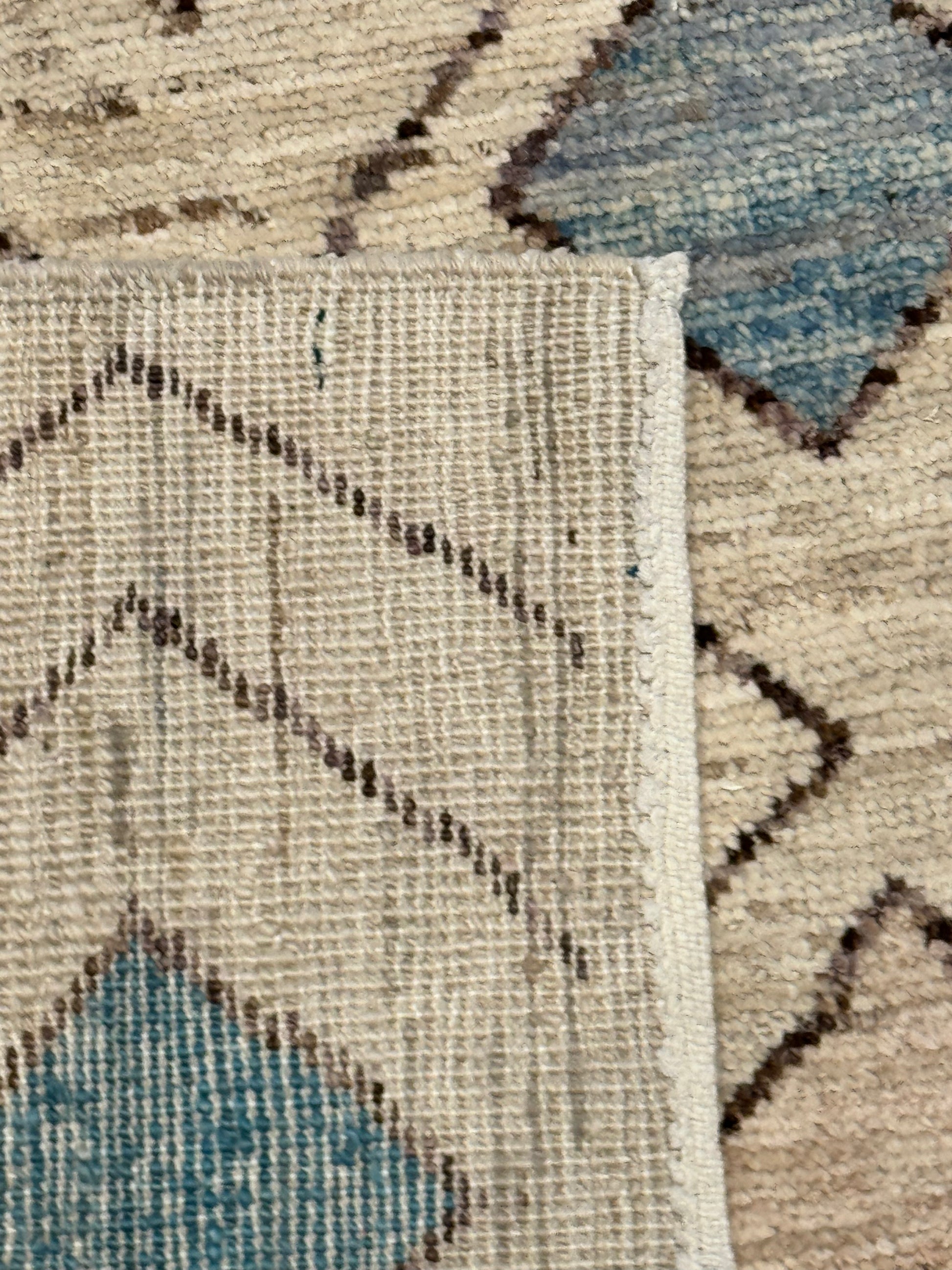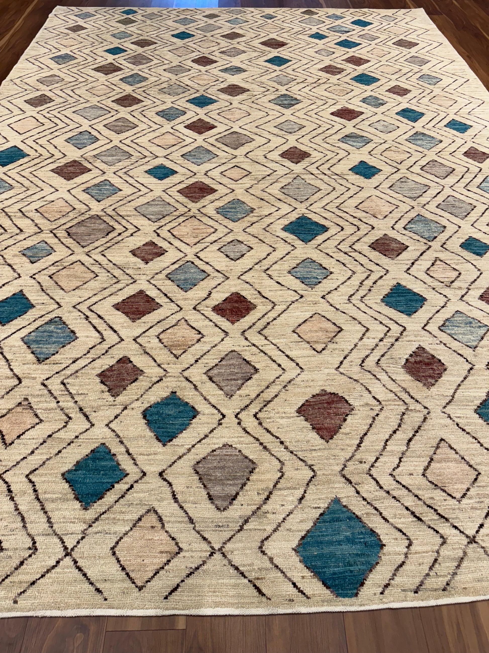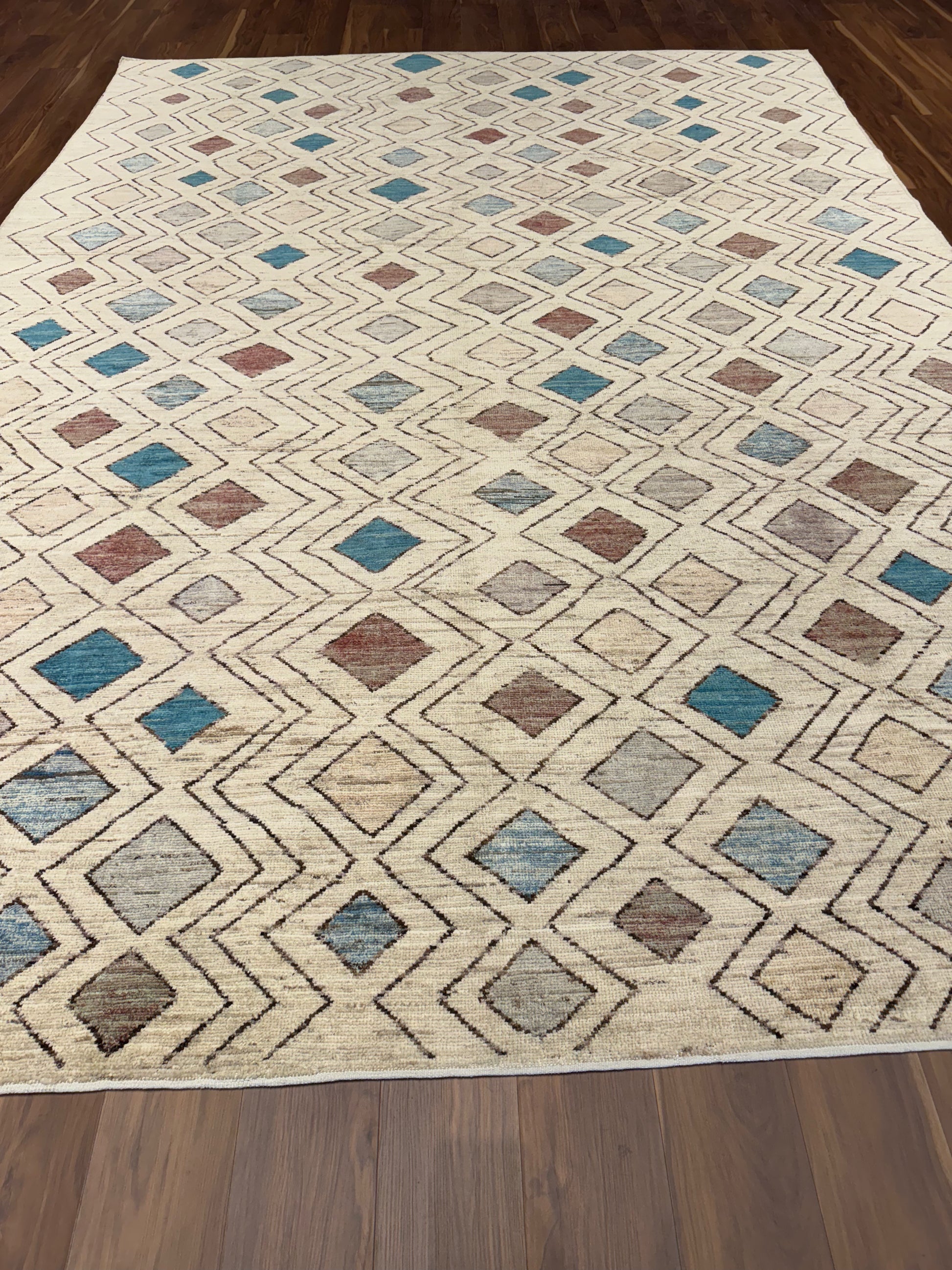 This Moroccan Wool Rug showcases a harmonious blend of beige, blue, brown, and rust hues, interwoven to create a sophisticated geometric pattern that exudes traditional charm with a modern twist. It embodies the essence of Moroccan artistry, masterfully handcrafted from high-quality wool to enhance both the comfort and elegance of your living space. With its intricate diamond lattice design, this rug adds a cozy yet chic aesthetic, perfect for anchoring furniture in a living room, bedroom, or any area seeking a touch of warmth.
