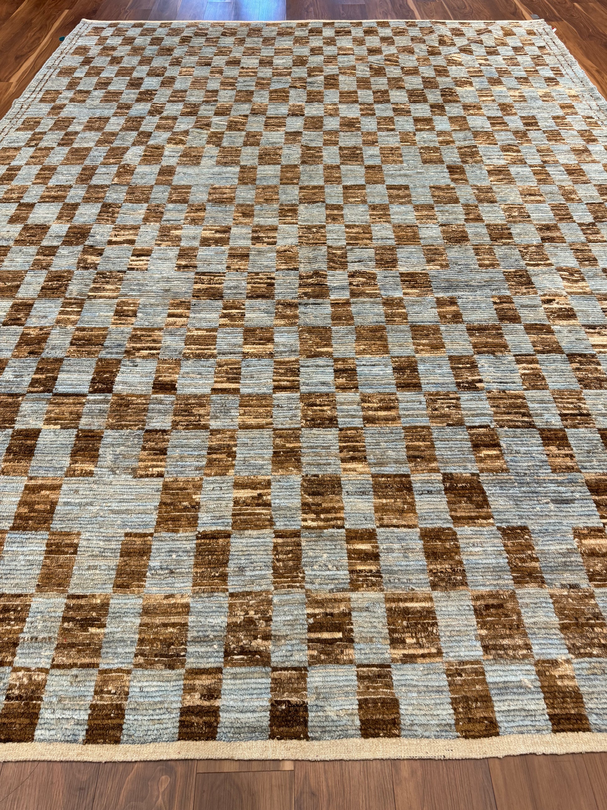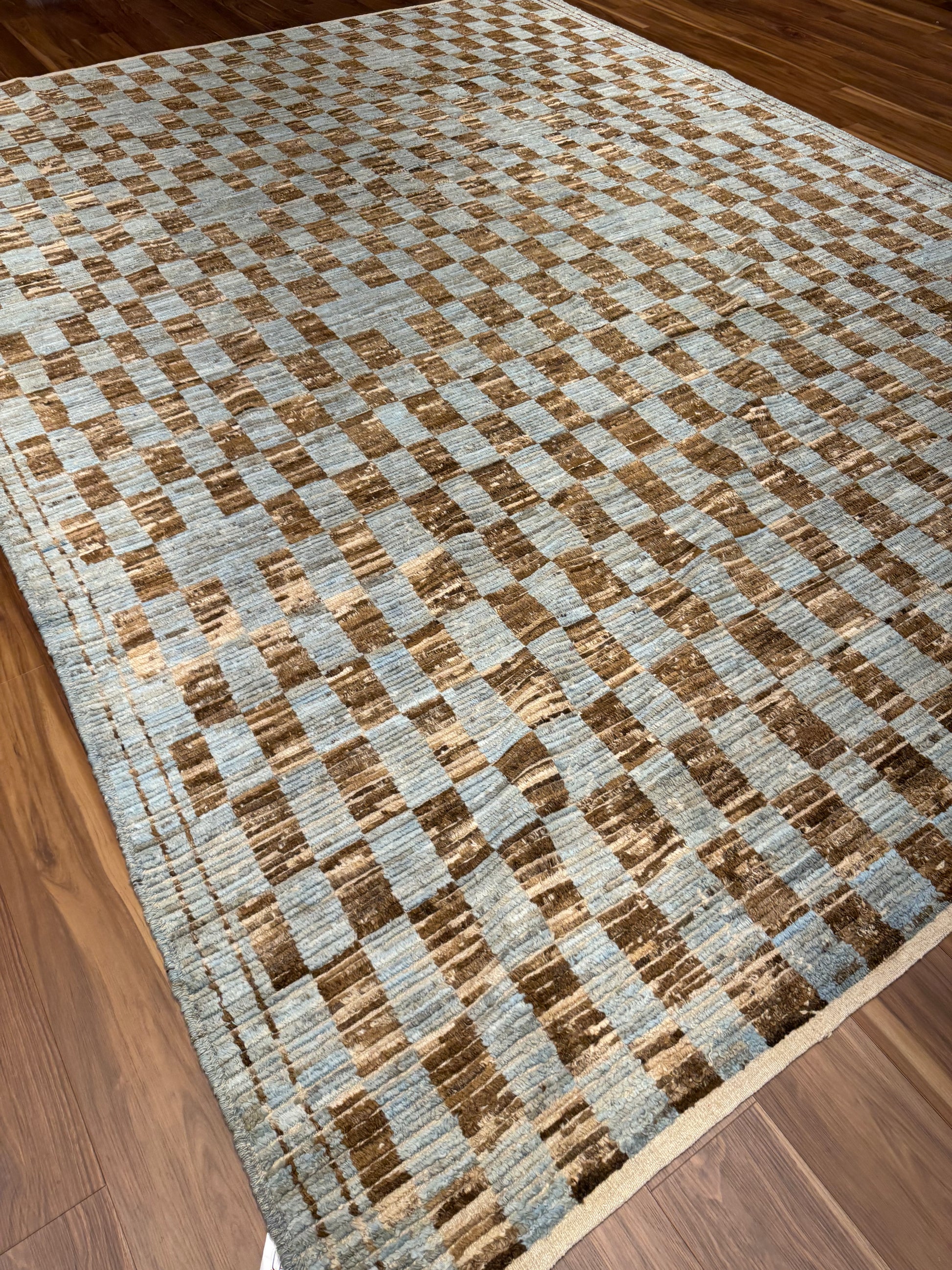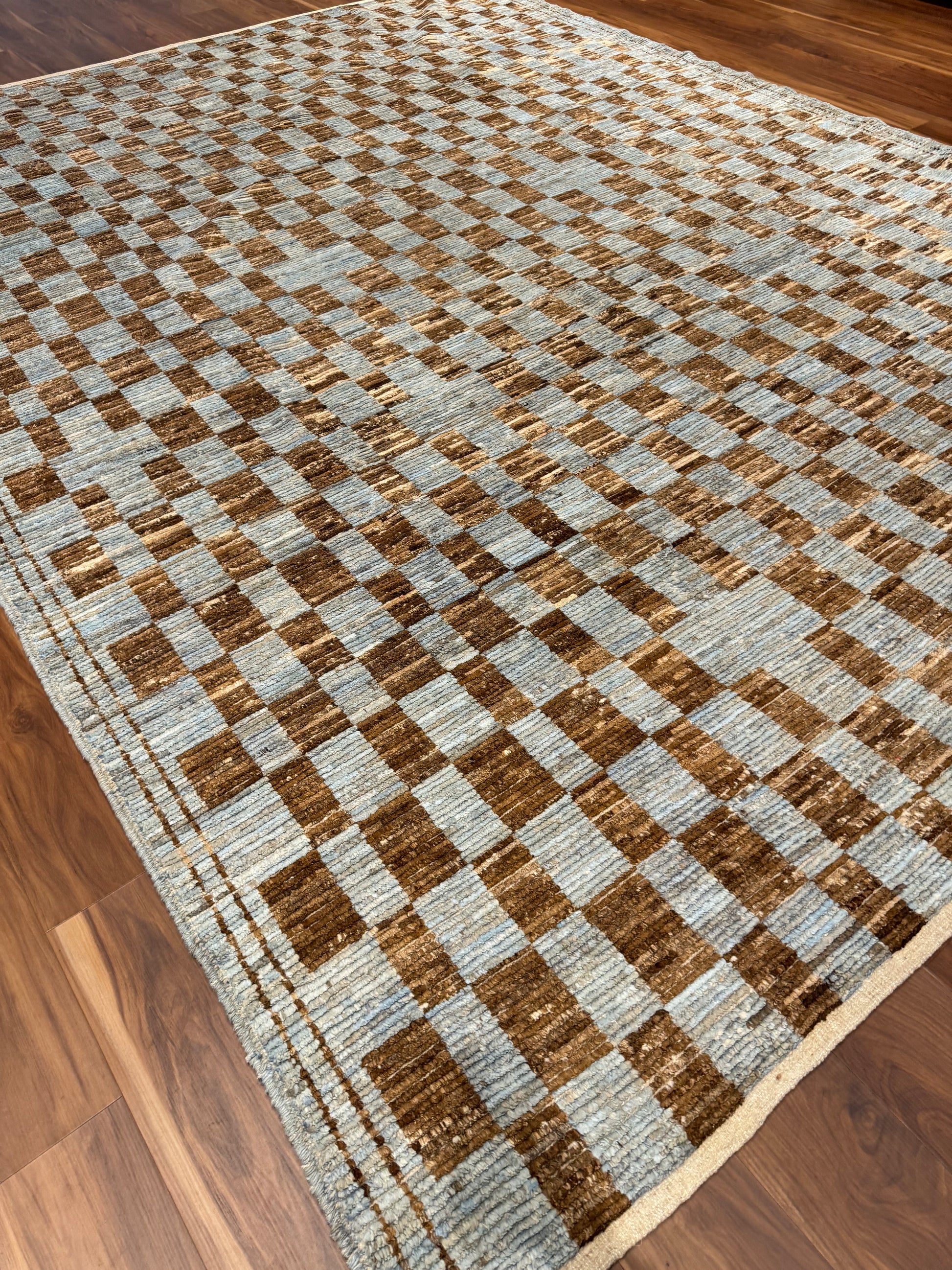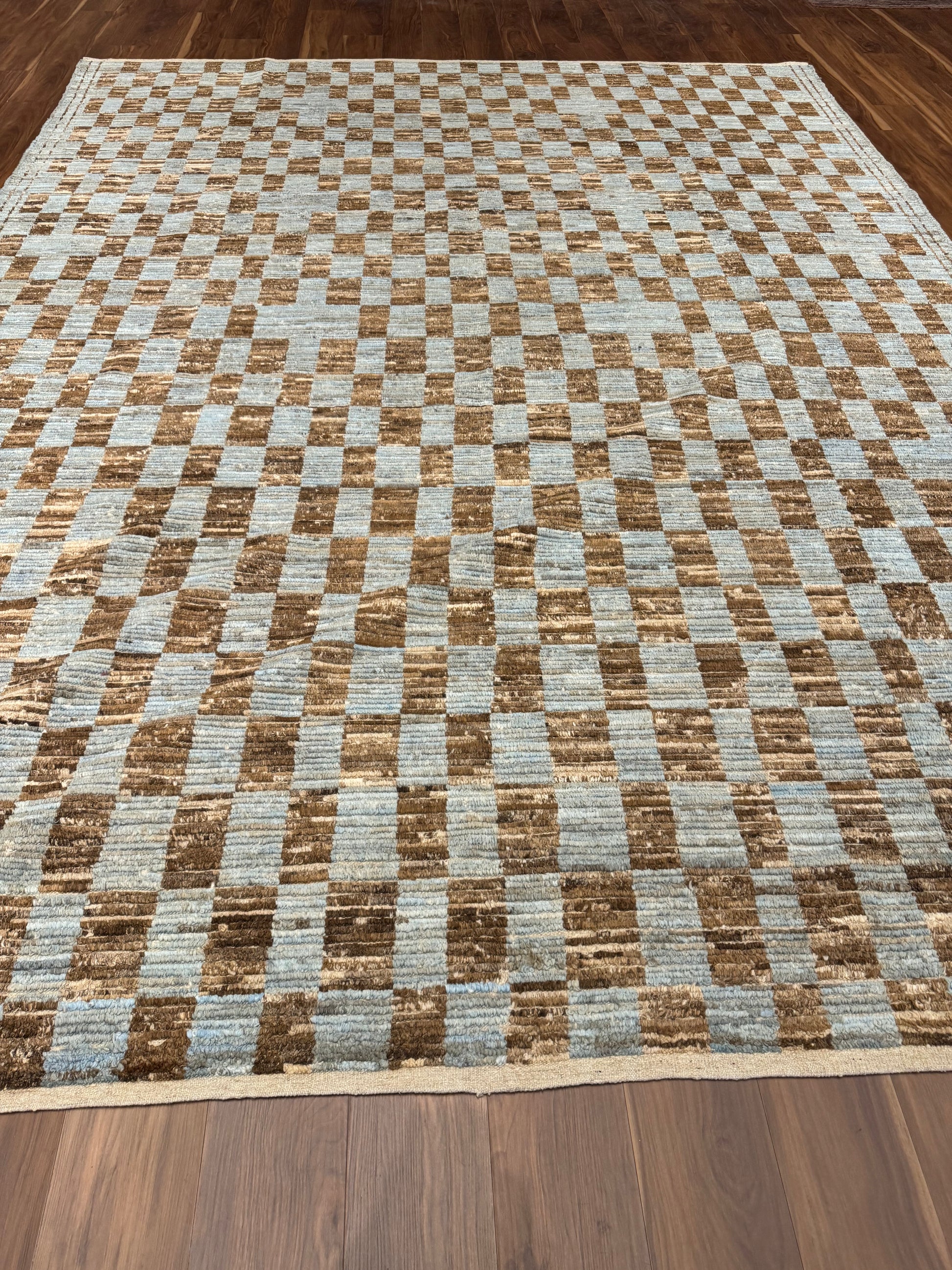This exquisite Moroccan wool rug features a checkerboard pattern that beautifully blends modern design with traditional craftsmanship. The interplay of beige and brown hues gives it a warm and inviting feel, making it an ideal addition to any living space seeking a touch of earthy elegance. Handwoven by skilled artisans, the rich texture and durable wool material promise lasting comfort and style.