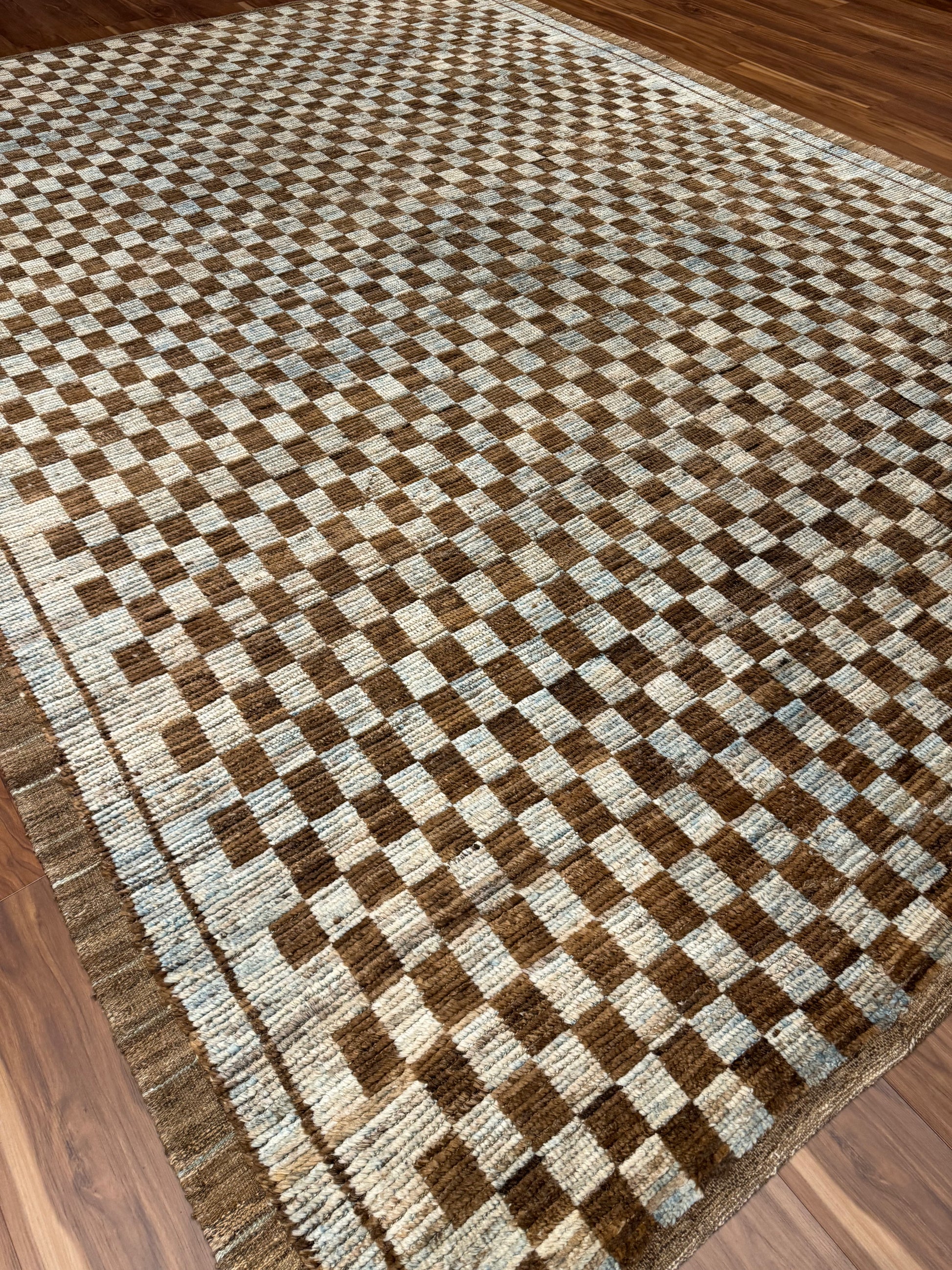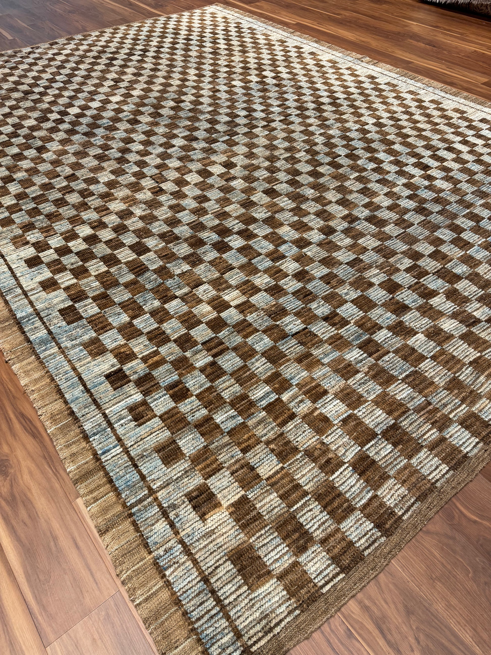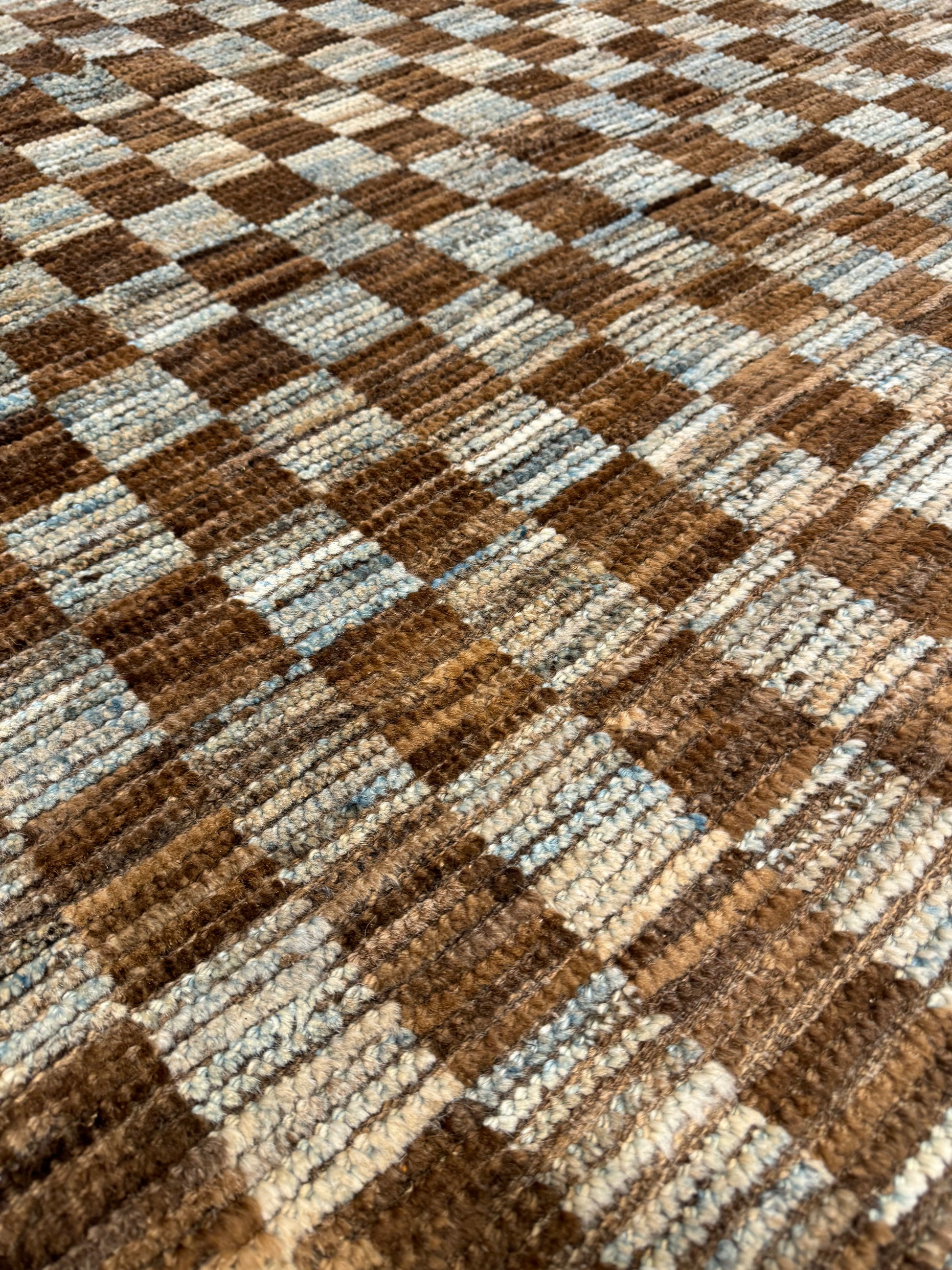 This exquisite Moroccan rug features a sophisticated, minimalist geometric pattern that exhibits the expert weaving techniques of the region. The chic brown and beige hues create a warm and inviting aesthetic, suitable for enhancing any contemporary or traditional decor. The high-quality wool used in this rug's construction offers a luxuriously soft texture underfoot and promises durability for high-traffic areas. A perfect blend of modern design with traditional craftsmanship.
