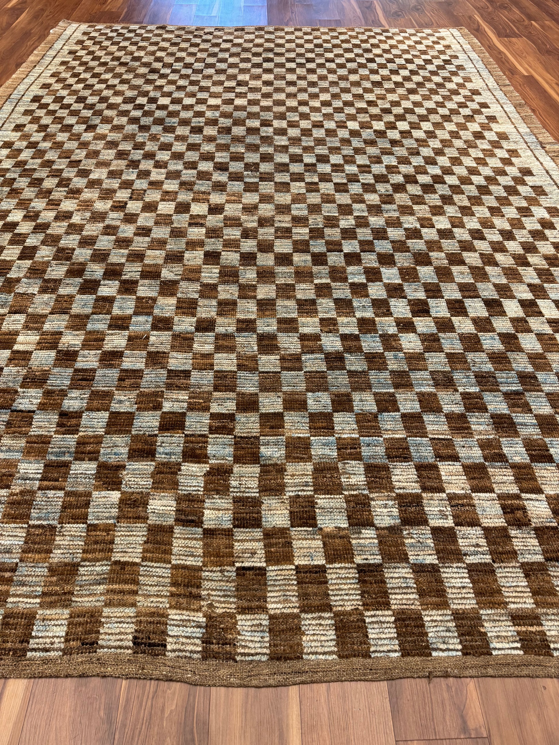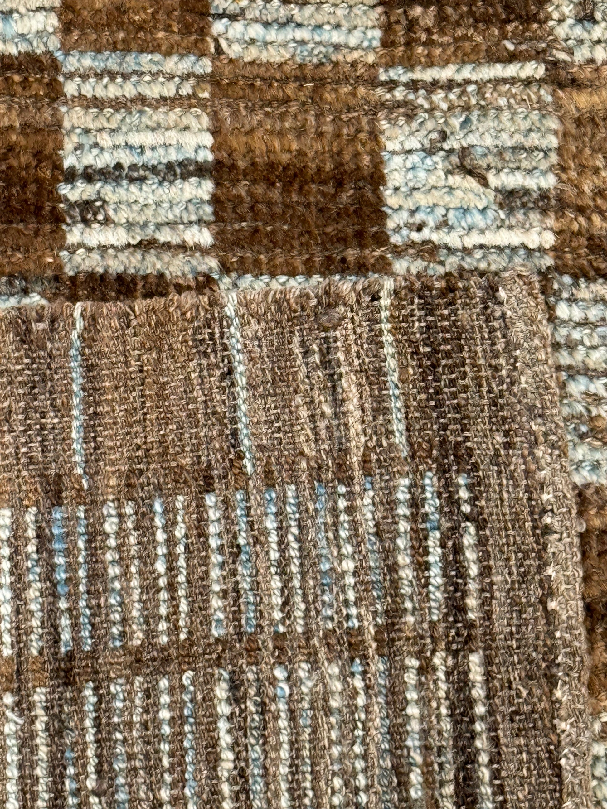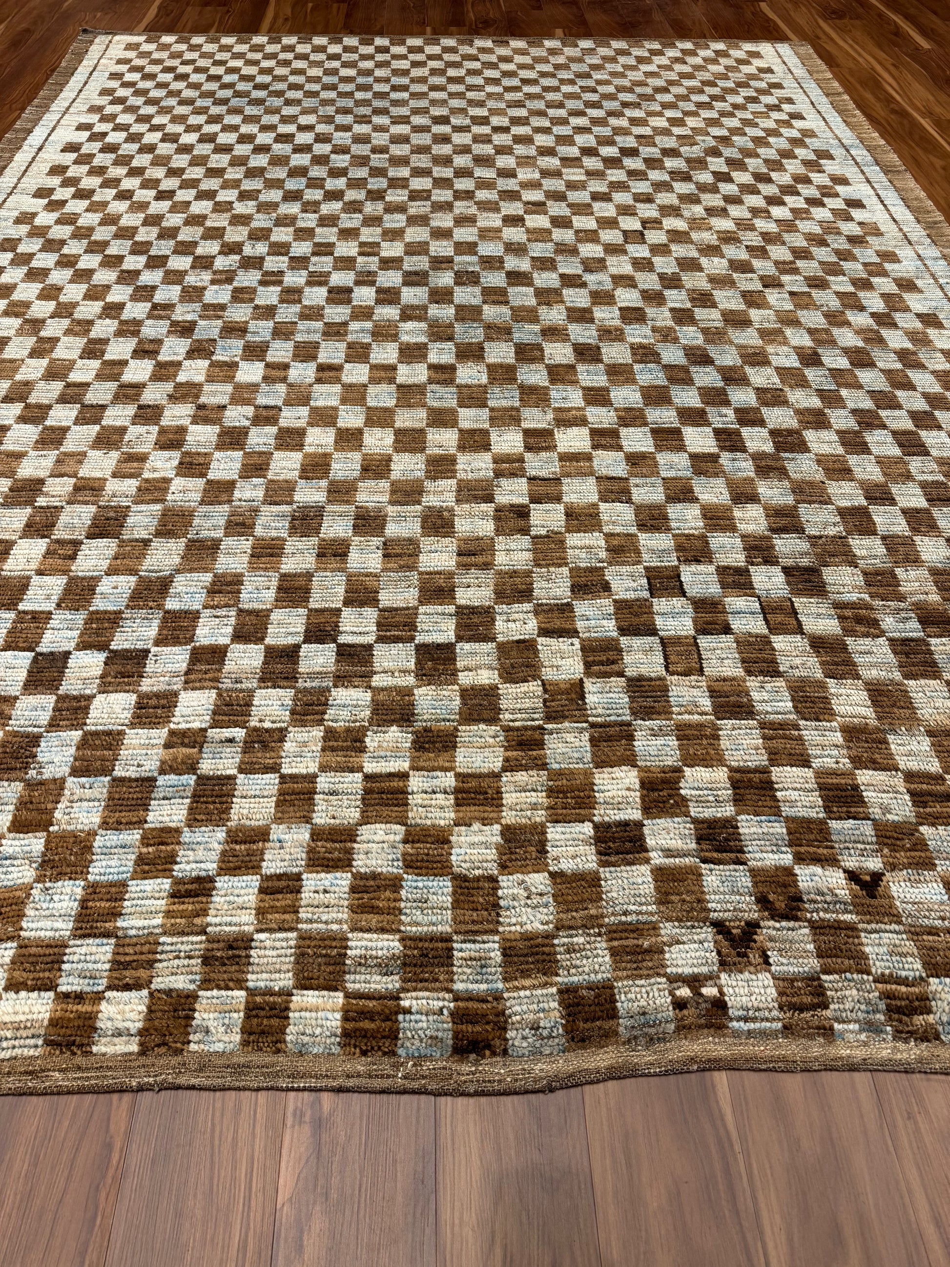 This exquisite Moroccan rug features a sophisticated, minimalist geometric pattern that exhibits the expert weaving techniques of the region. The chic brown and beige hues create a warm and inviting aesthetic, suitable for enhancing any contemporary or traditional decor. The high-quality wool used in this rug's construction offers a luxuriously soft texture underfoot and promises durability for high-traffic areas. A perfect blend of modern design with traditional craftsmanship.