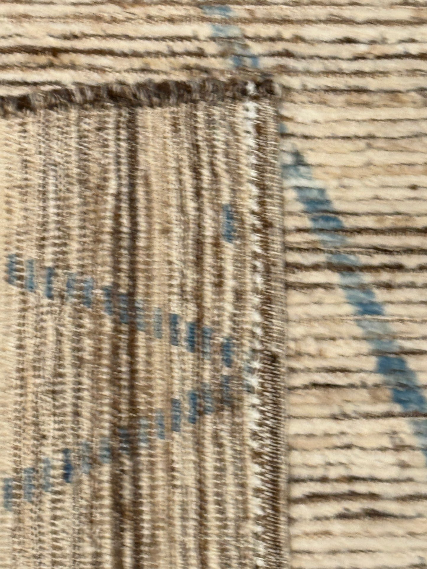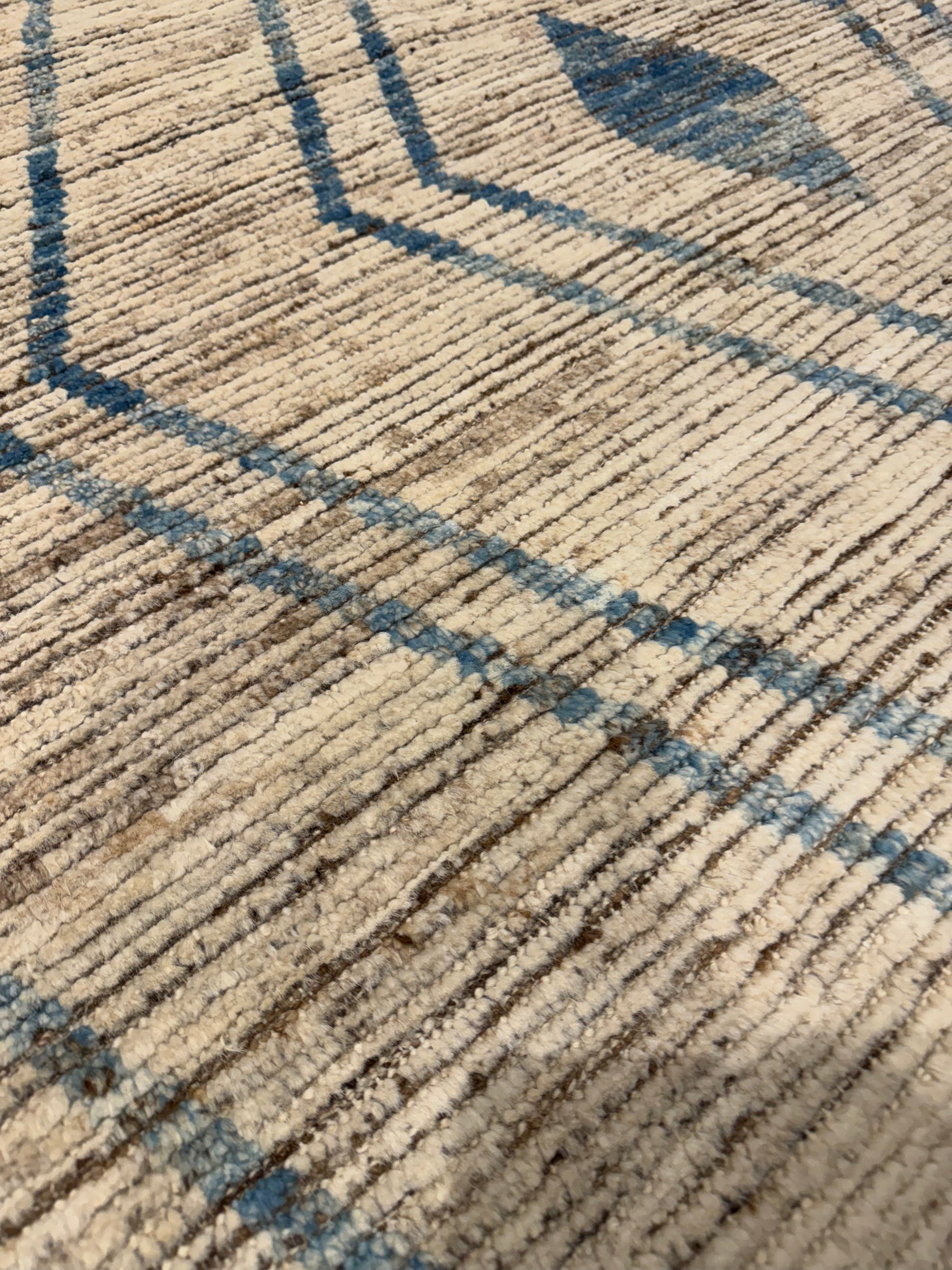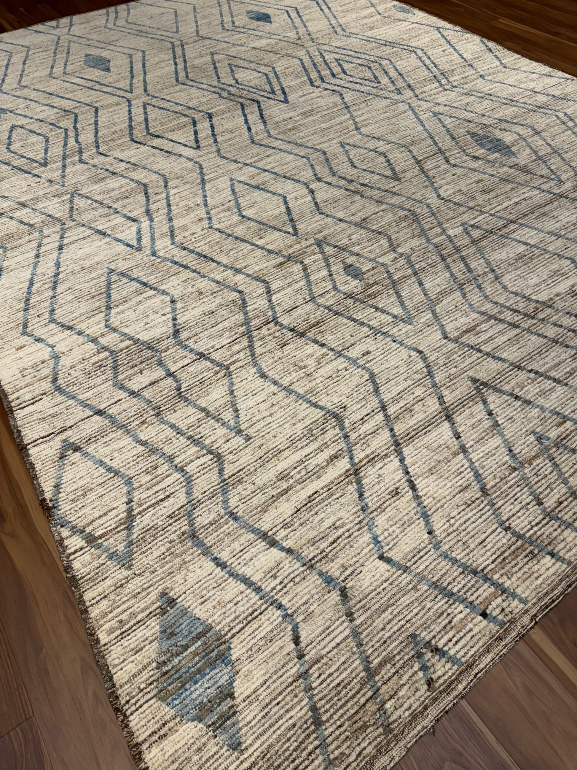This exquisitely handcrafted Moroccan wool rug features a sophisticated beige background complemented by a minimalist blue and brown geometric pattern, evoking the traditional Berber tribal designs. Its plush woolen texture offers both comfort and durability, perfect for adding a touch of elegance and warmth to any room. The rug's natural fibers ensure long-lasting use and organic charm.