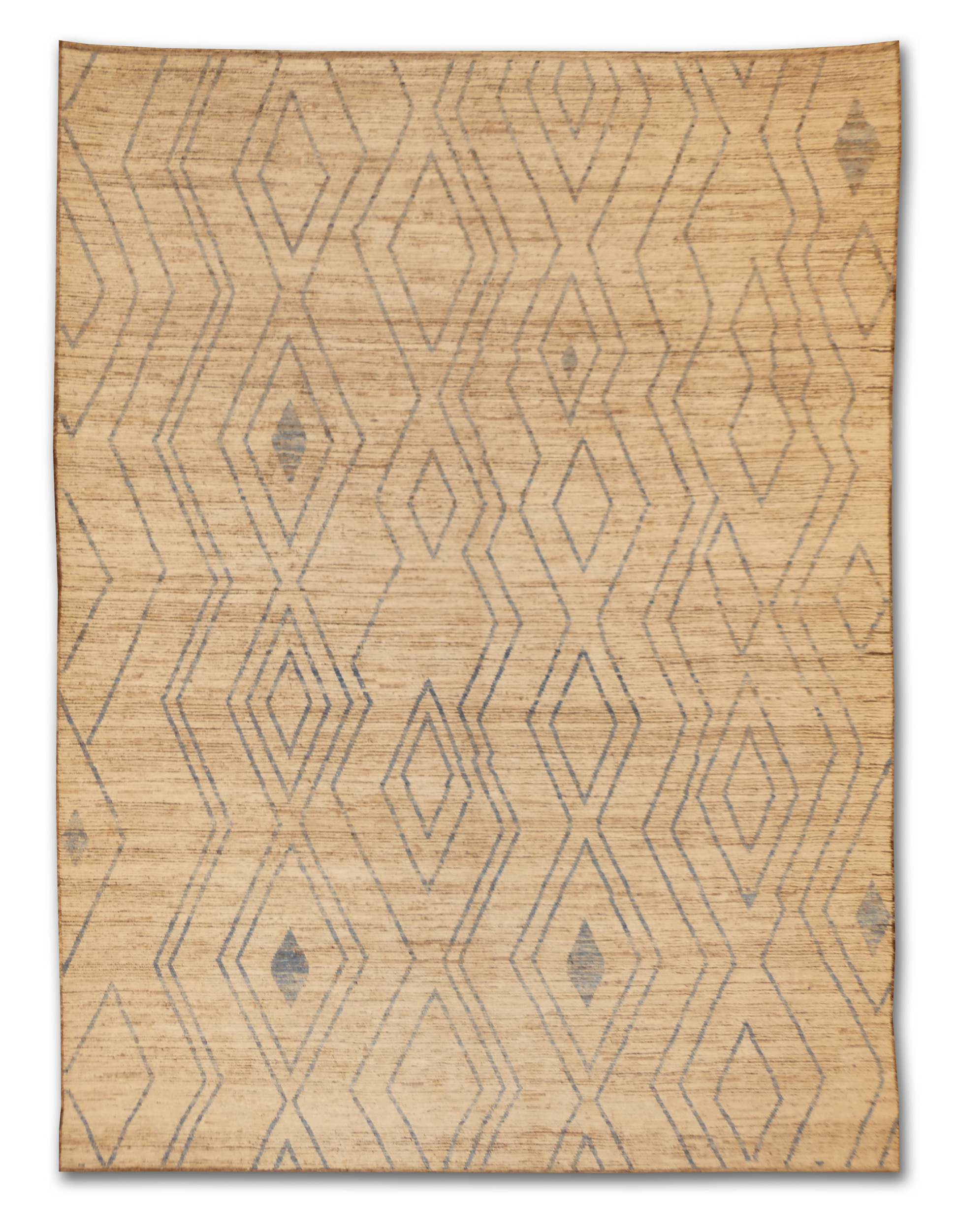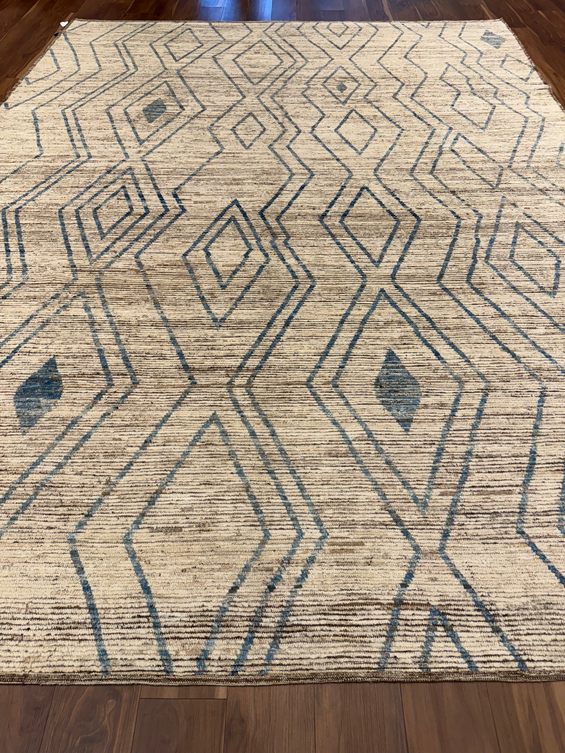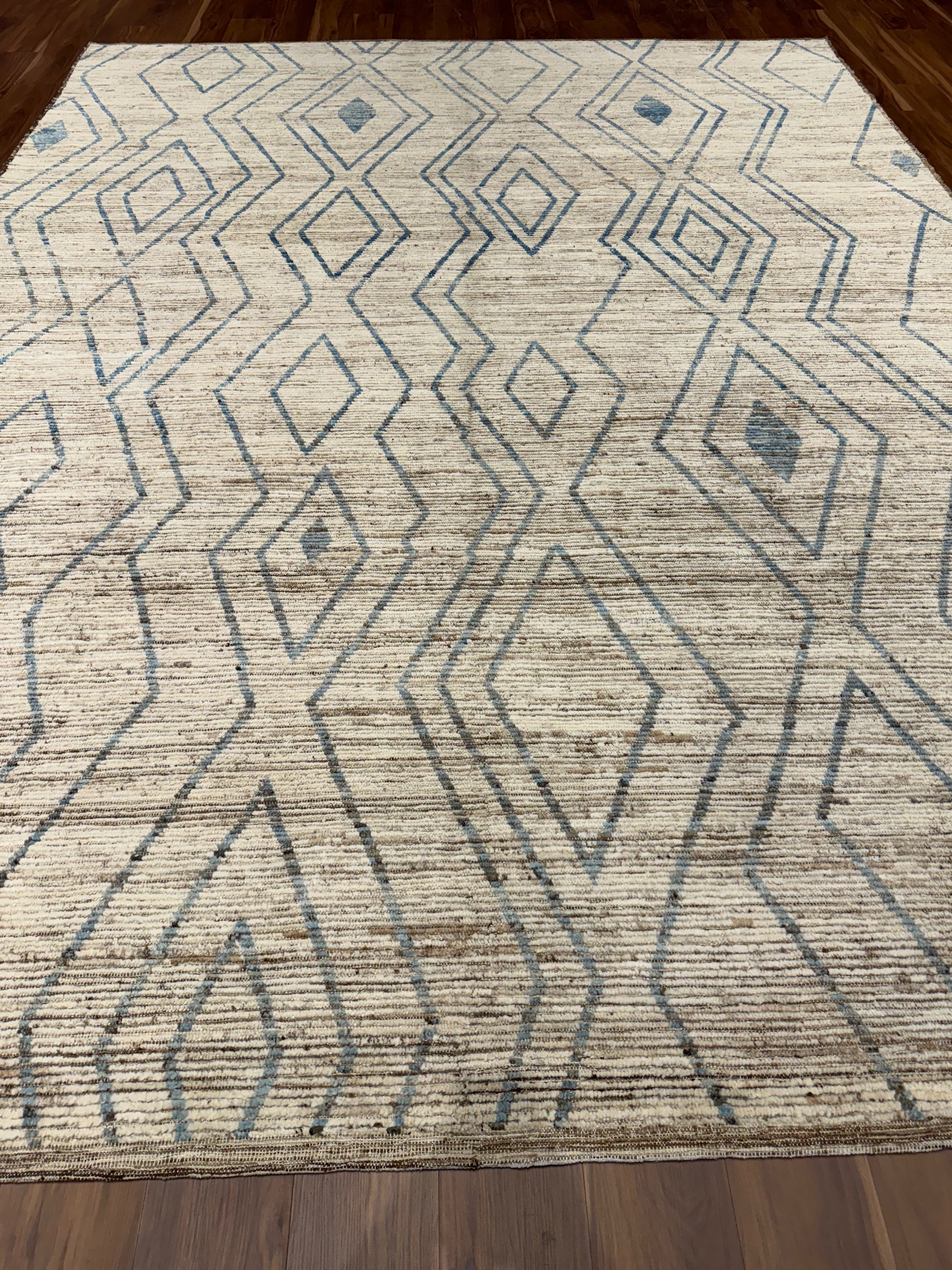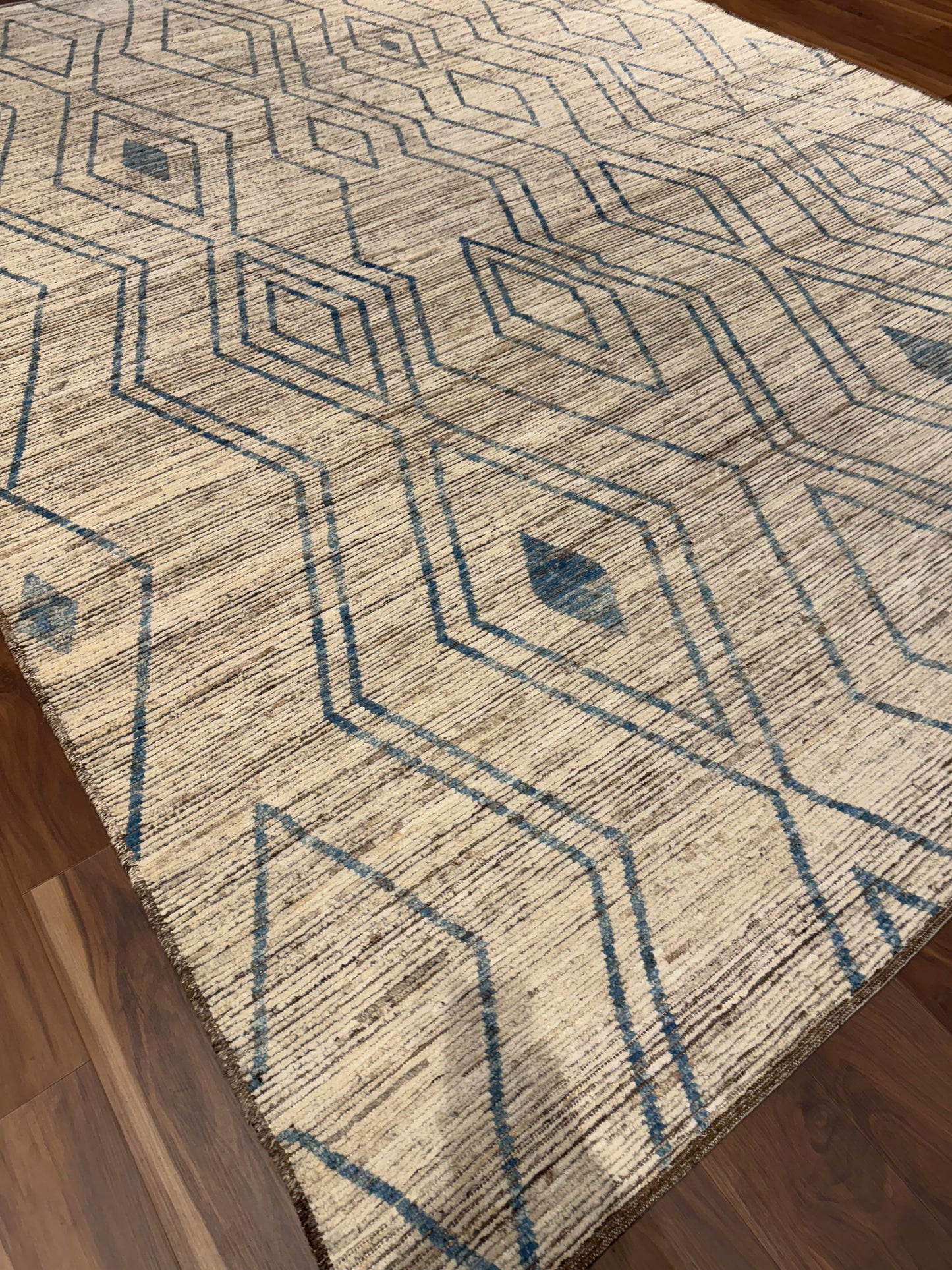 This exquisitely handcrafted Moroccan wool rug features a sophisticated beige background complemented by a minimalist blue and brown geometric pattern, evoking the traditional Berber tribal designs. Its plush woolen texture offers both comfort and durability, perfect for adding a touch of elegance and warmth to any room. The rug's natural fibers ensure long-lasting use and organic charm.