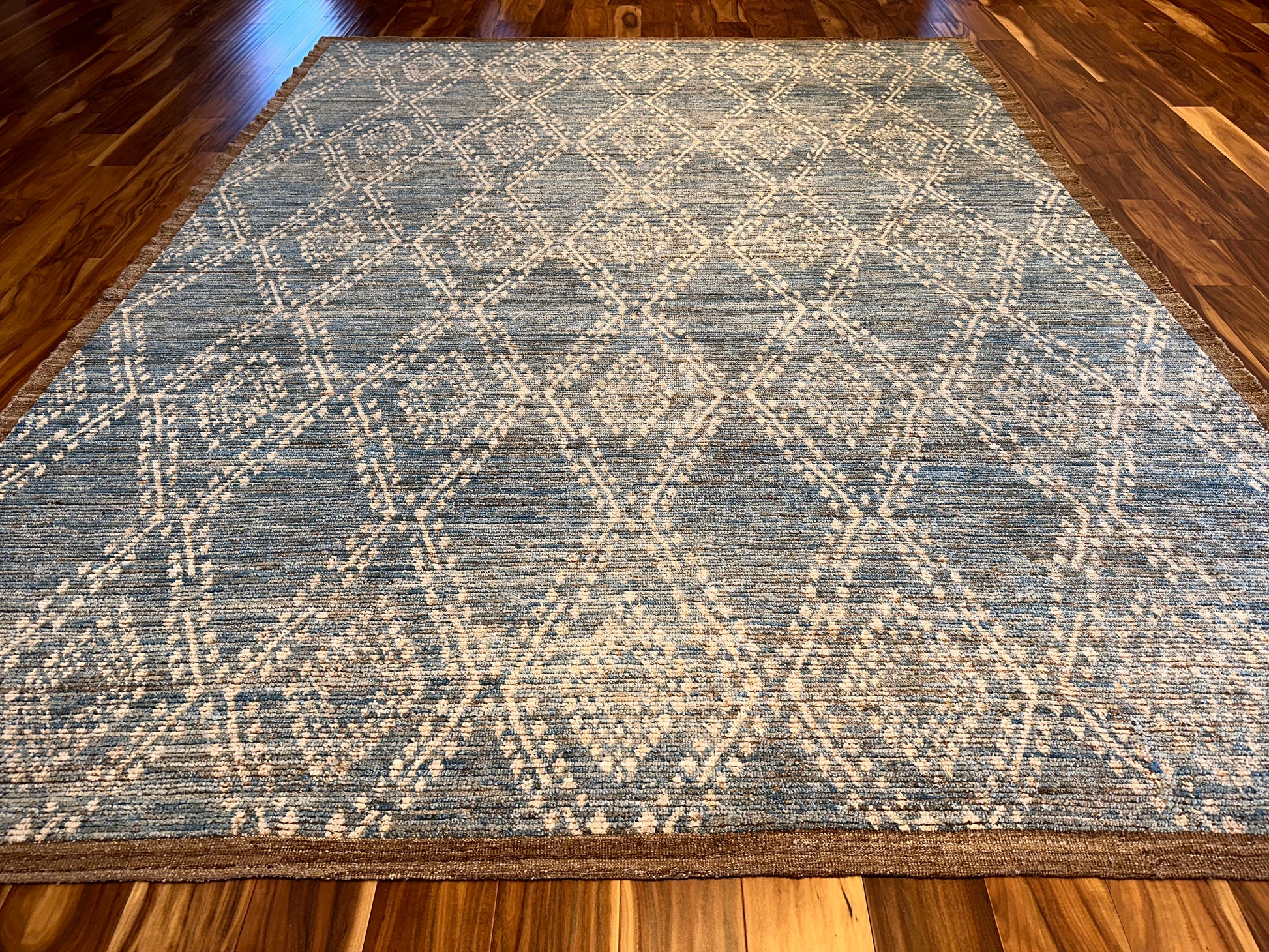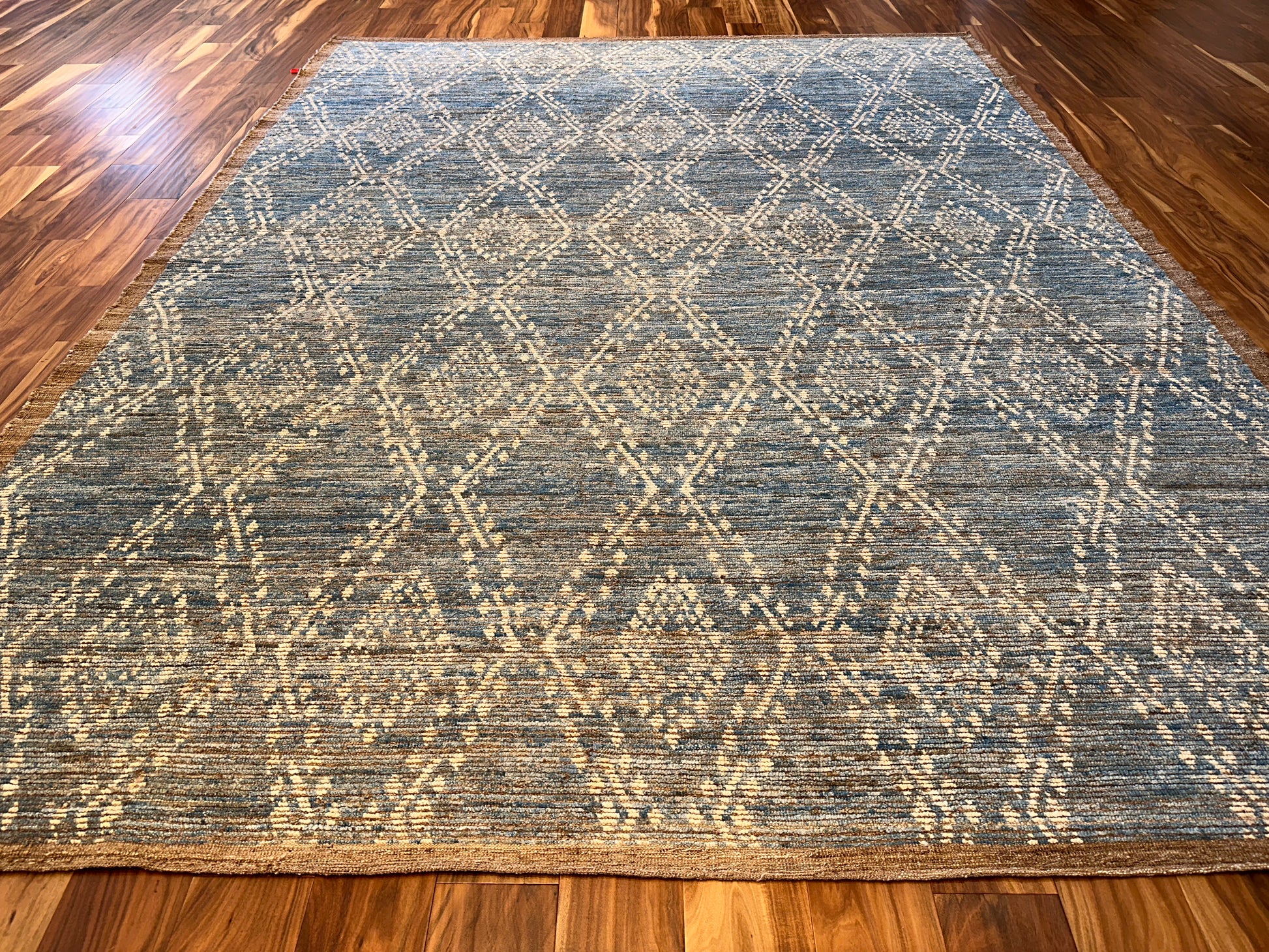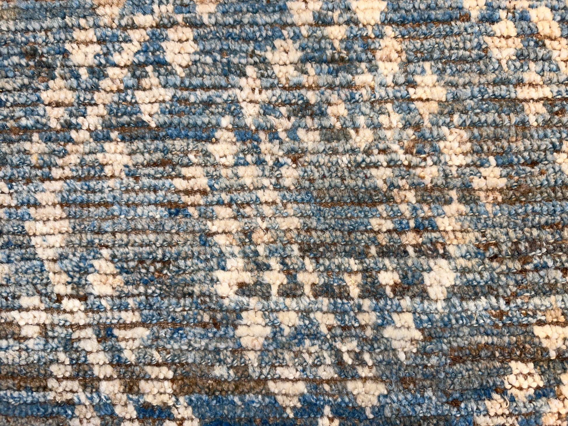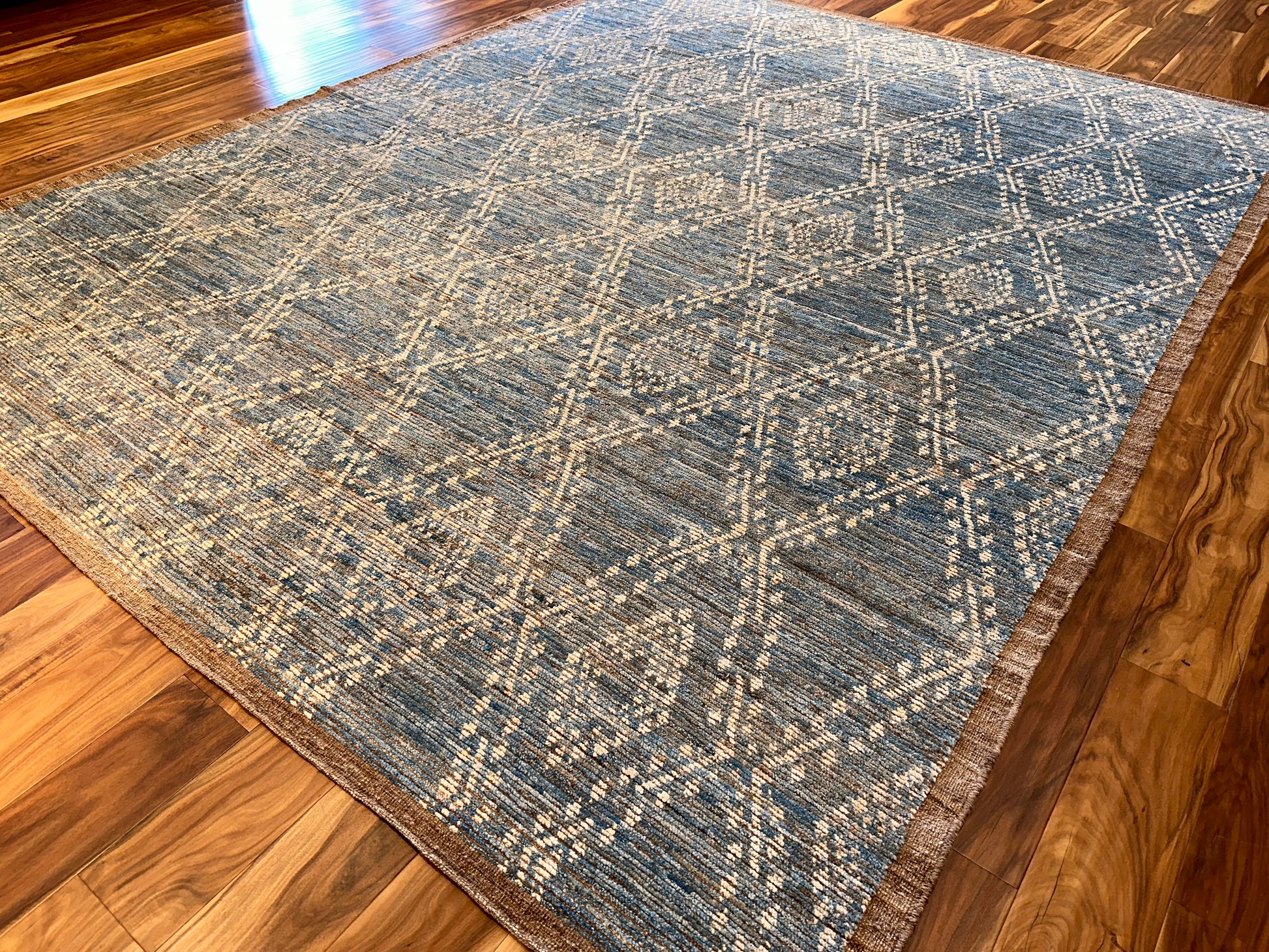 This rug presents a quiet sophistication with its washed indigo base and gently fading diamond lattice pattern. The design blends subtle irregularities with rhythmic structure, giving it the organic, lived-in feeling of a well-loved textile. Its softly distressed finish and moody tones bring a sense of depth and calm to the room.
