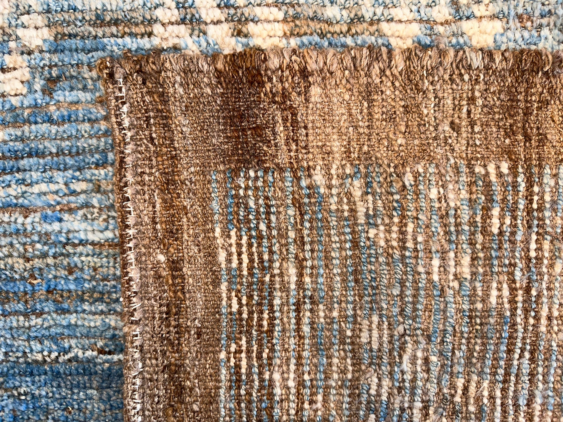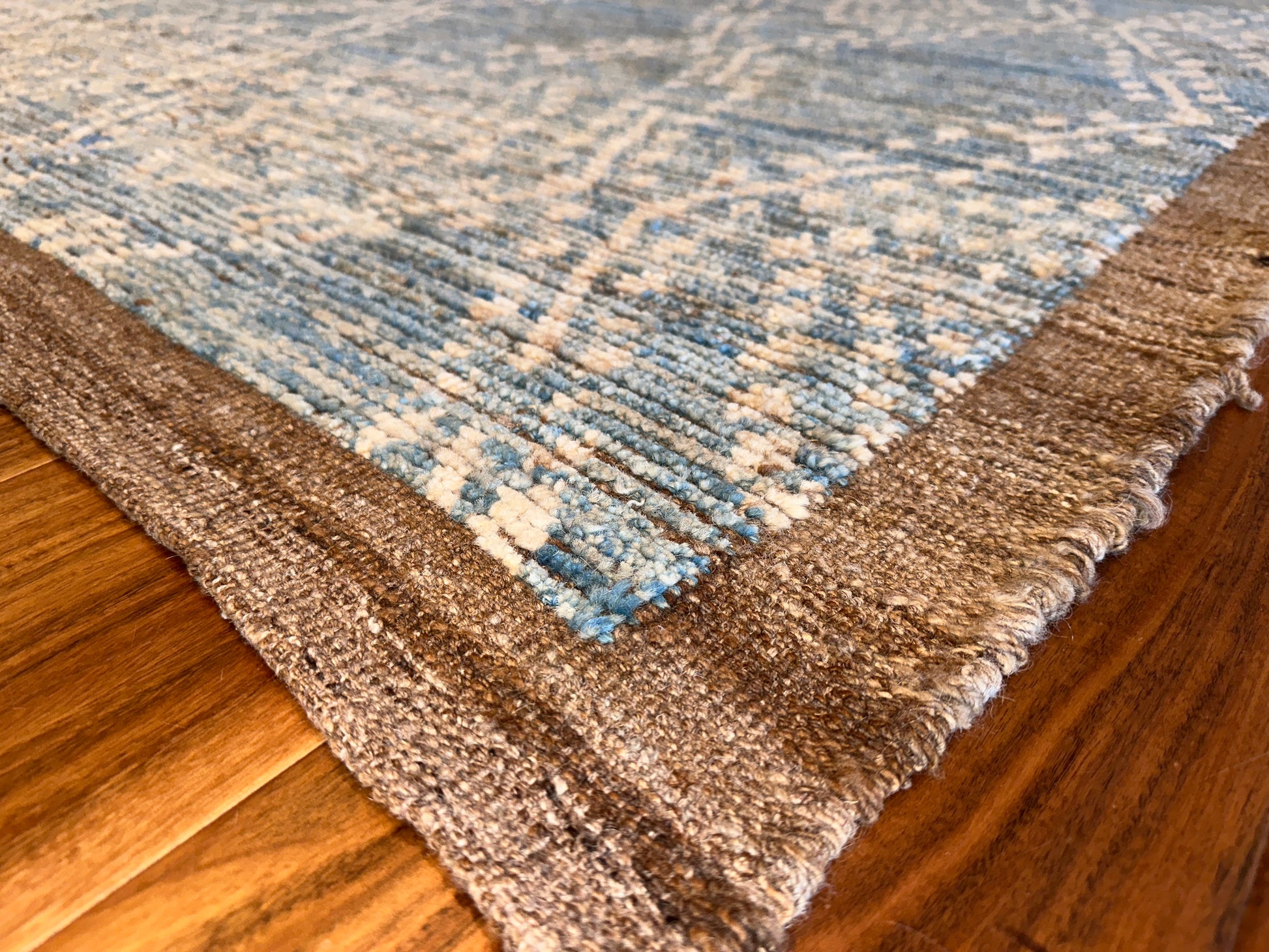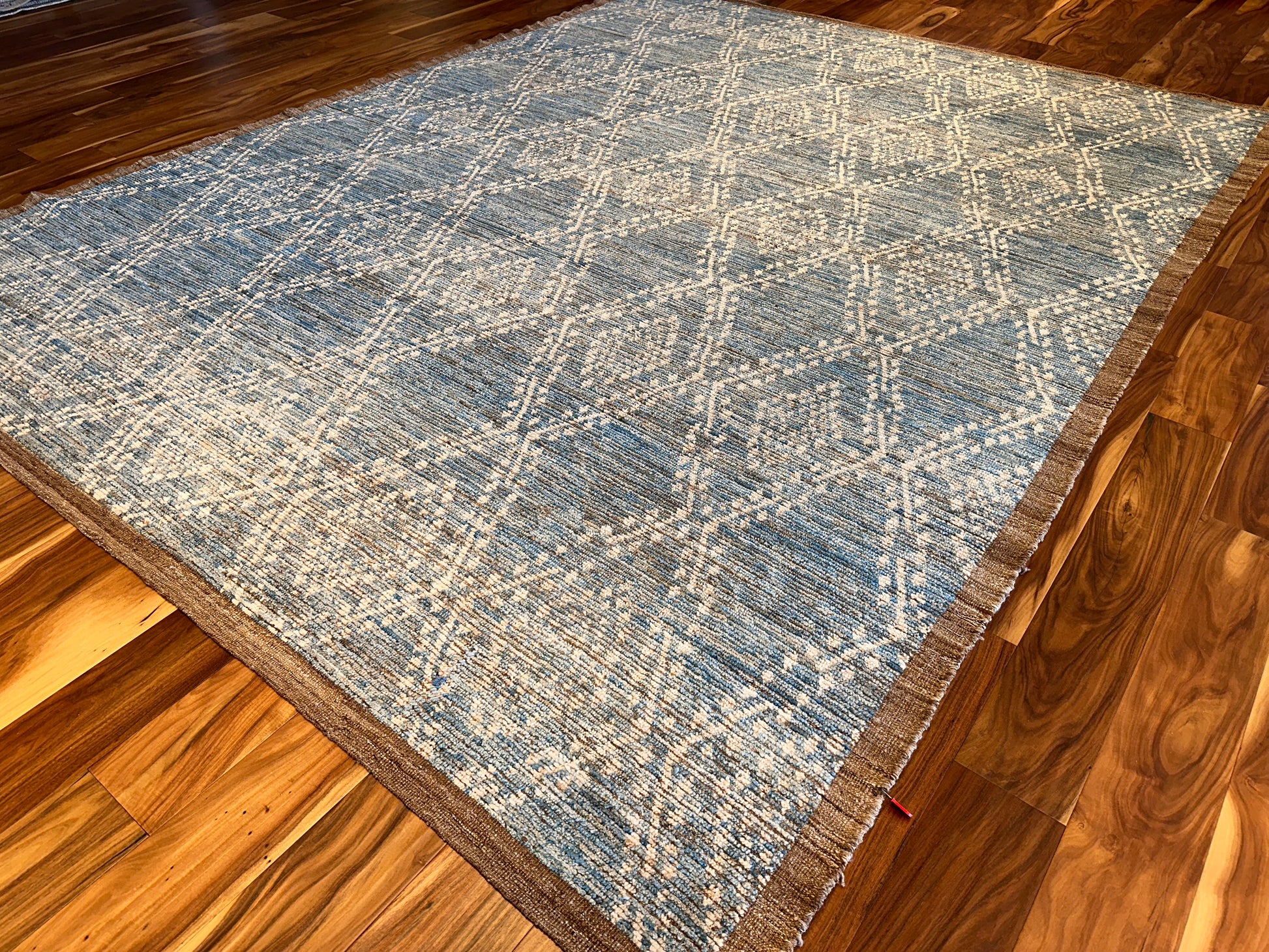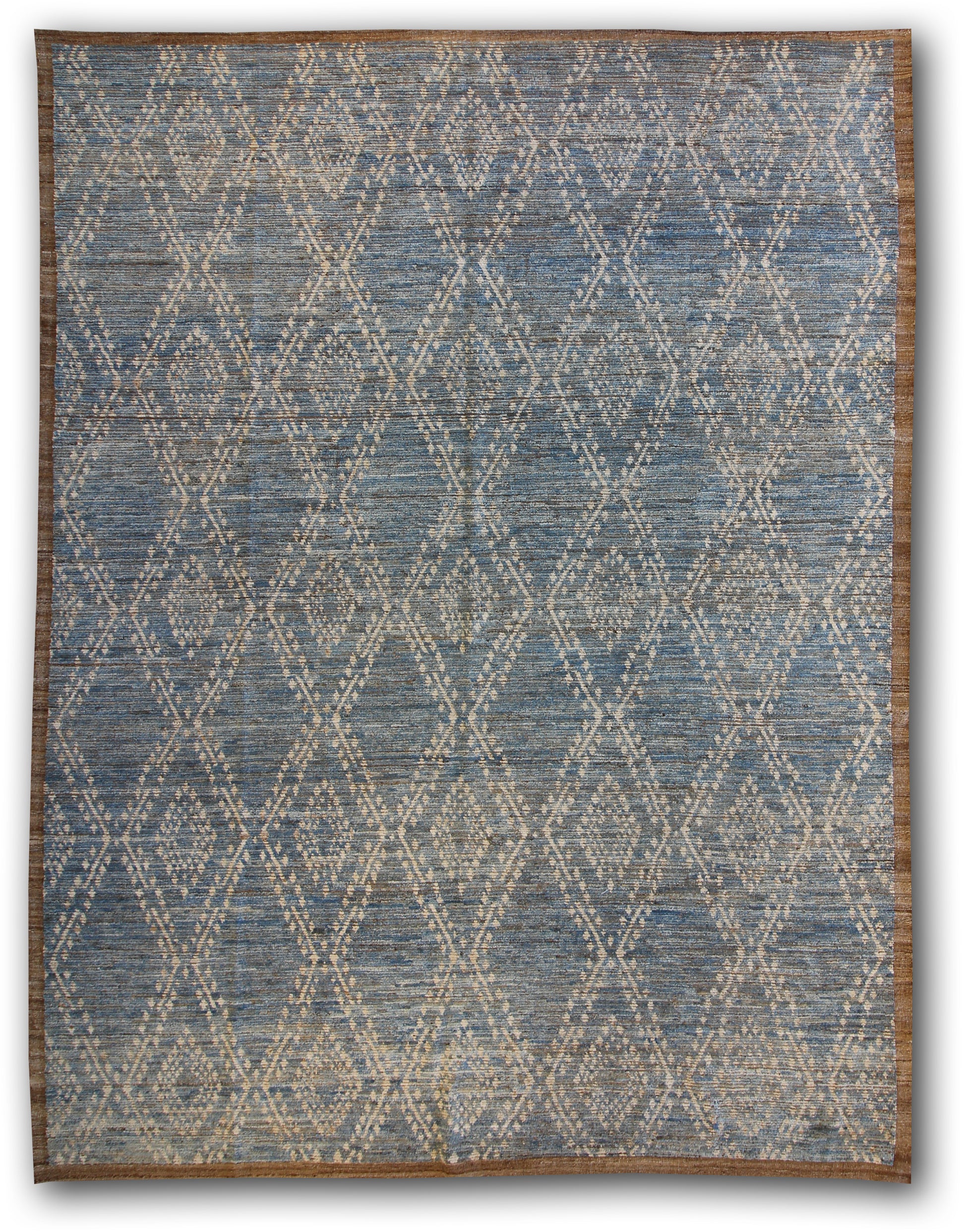 This rug presents a quiet sophistication with its washed indigo base and gently fading diamond lattice pattern. The design blends subtle irregularities with rhythmic structure, giving it the organic, lived-in feeling of a well-loved textile. Its softly distressed finish and moody tones bring a sense of depth and calm to the room.