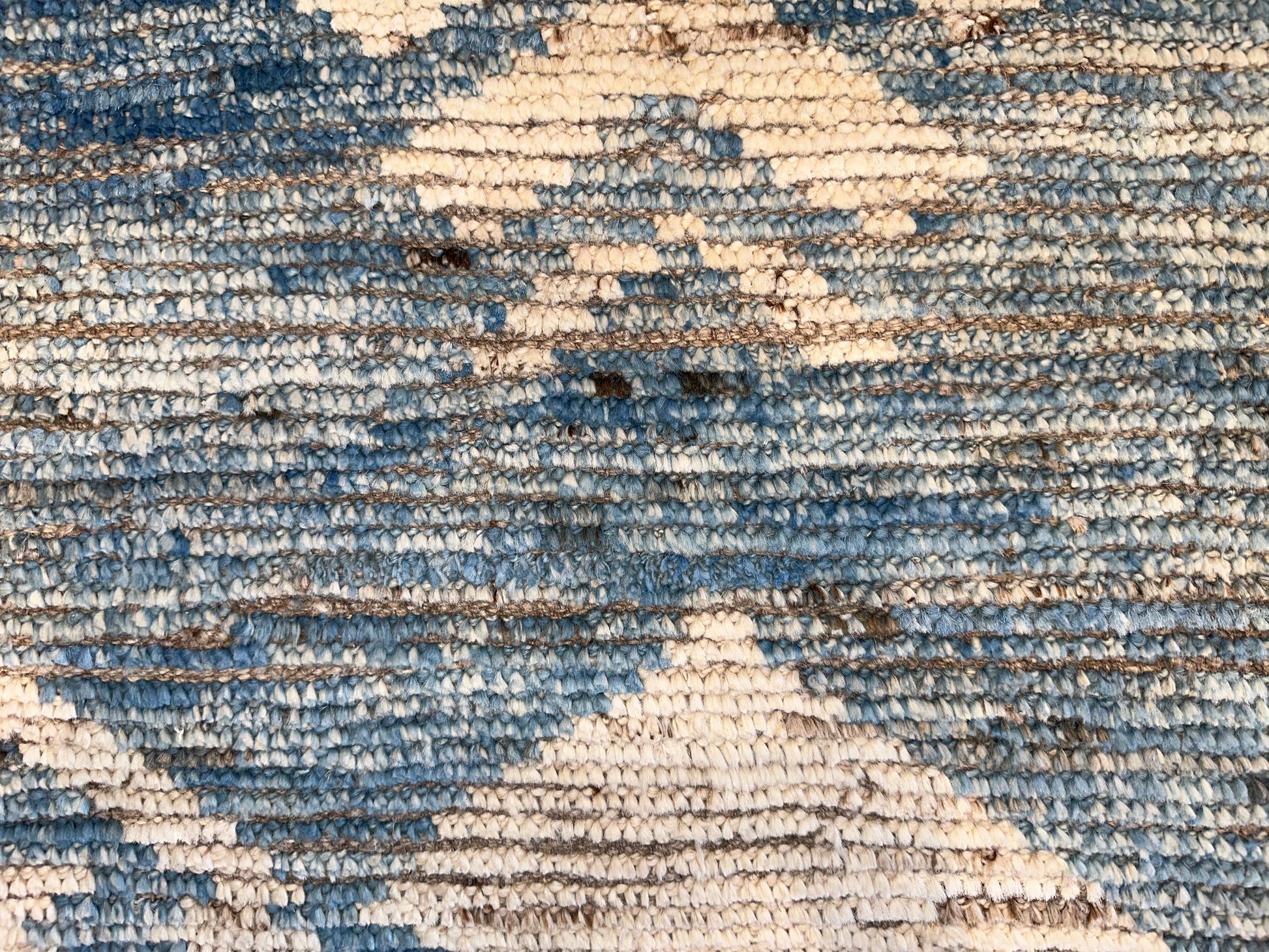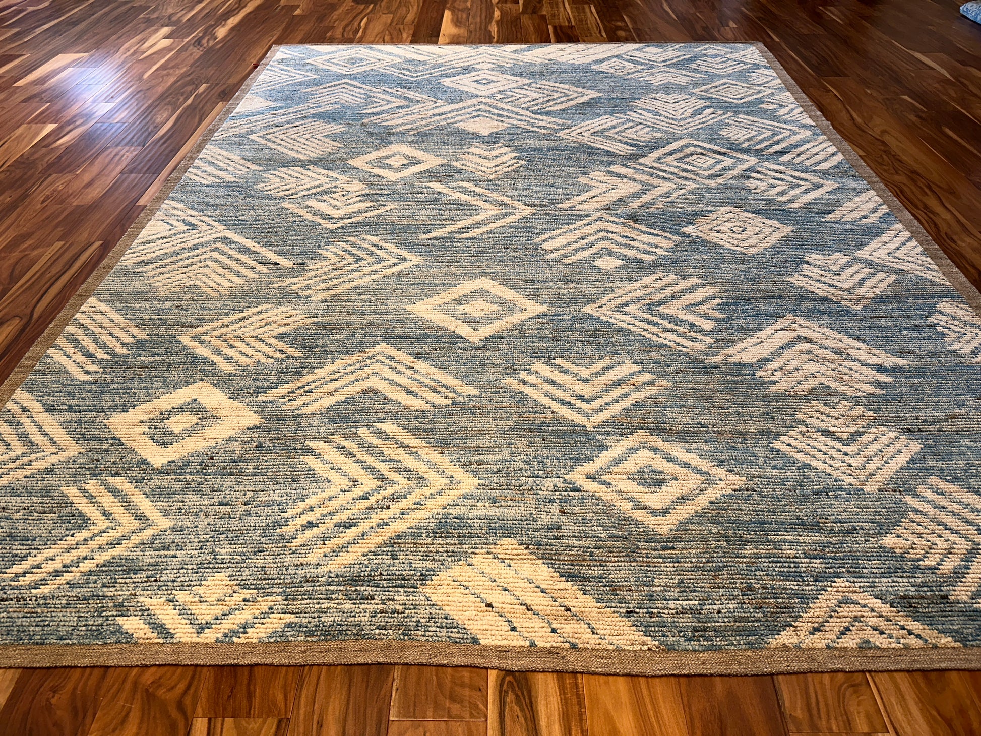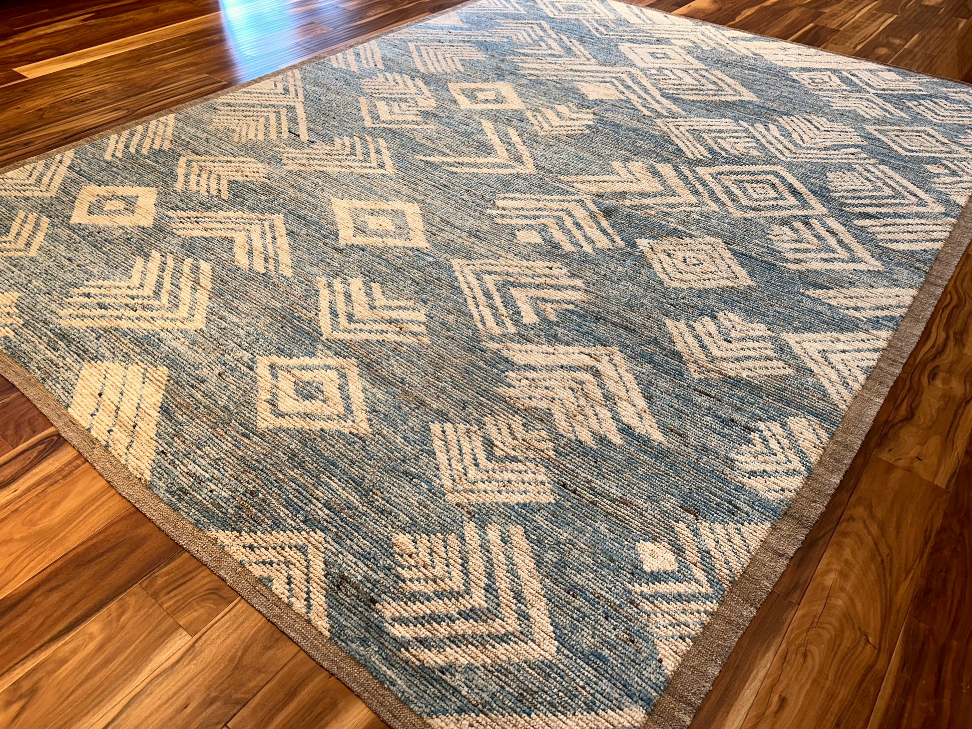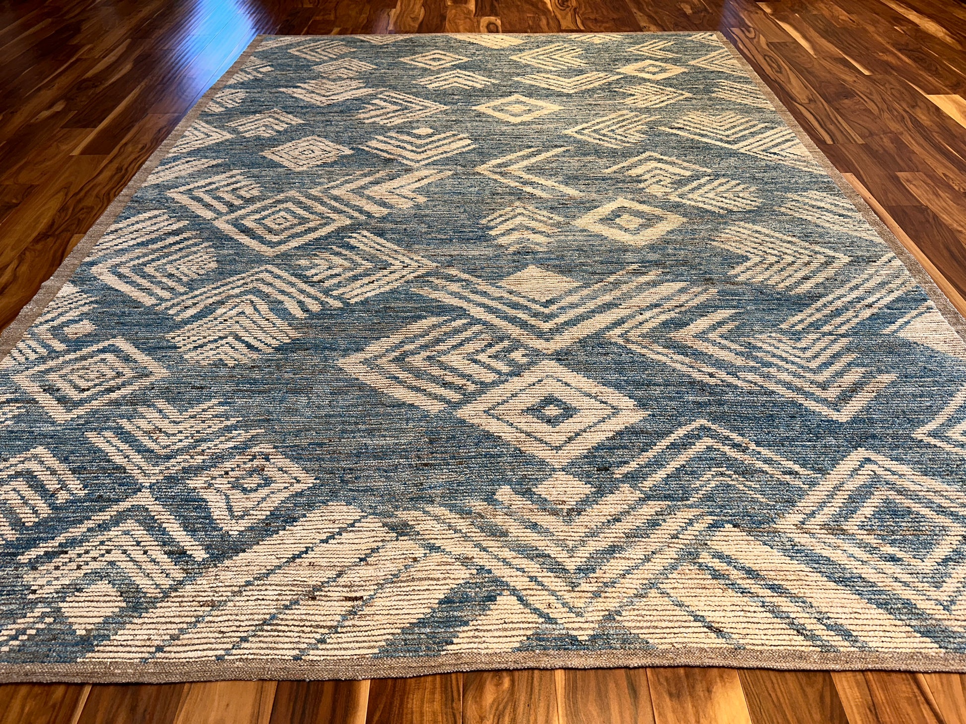 With its bold geometric rhythm and sun-washed texture, this handwoven rug blends tribal influence with modern clarity. Creamy diamond motifs ripple across a blue-toned field, creating a layered effect that evokes motion and symmetry. The distressed finish adds depth and character, making it a striking yet grounded centerpiece.