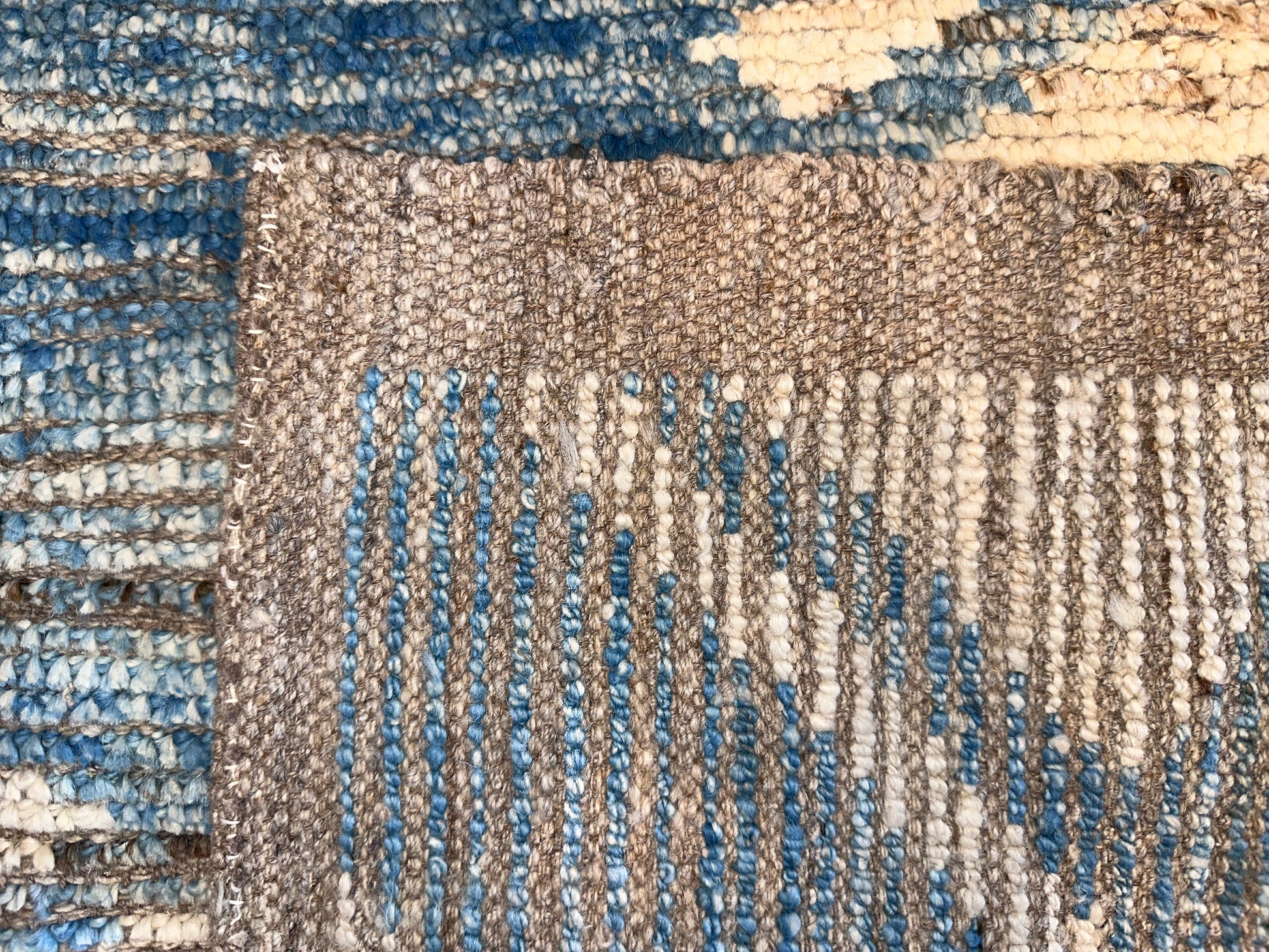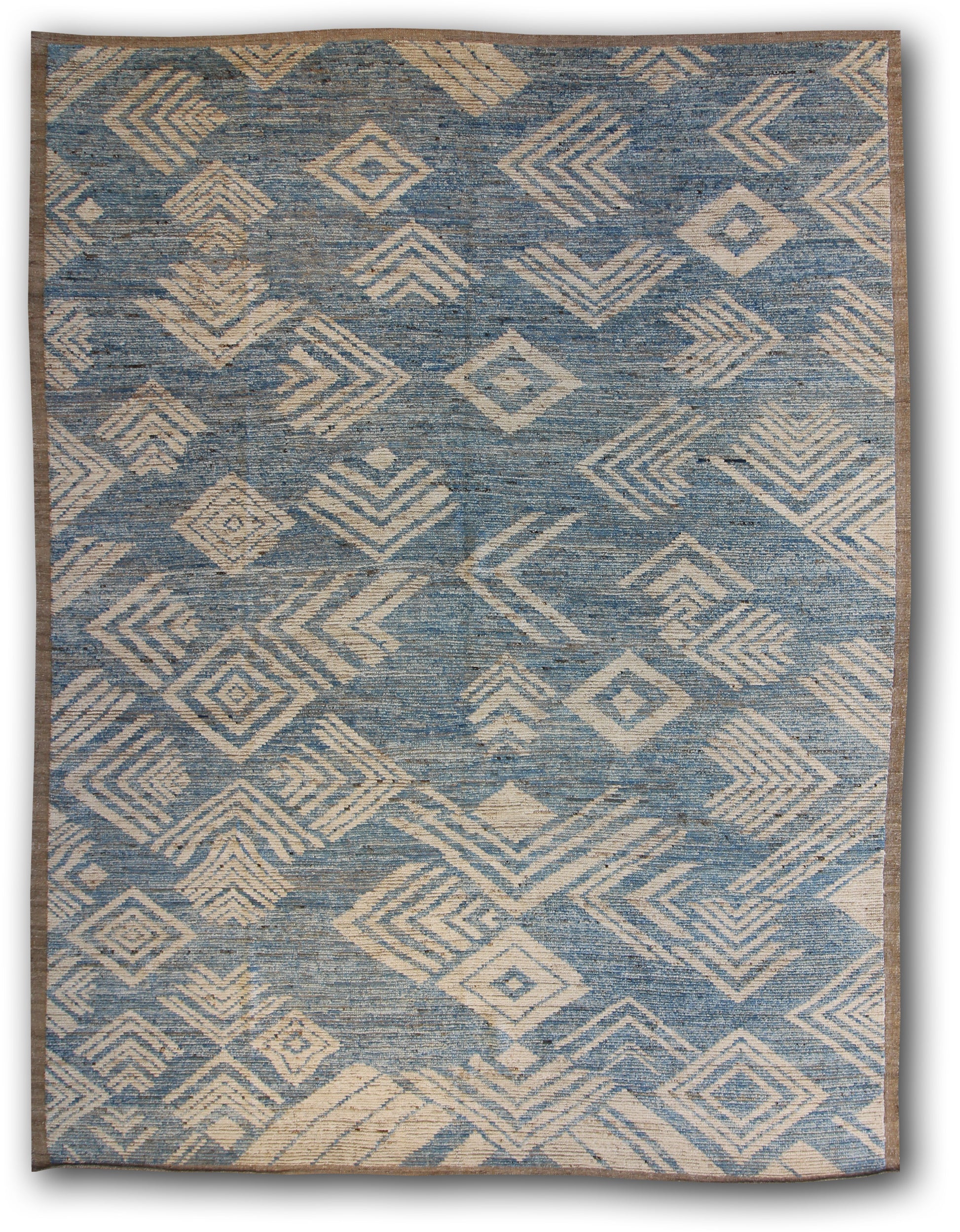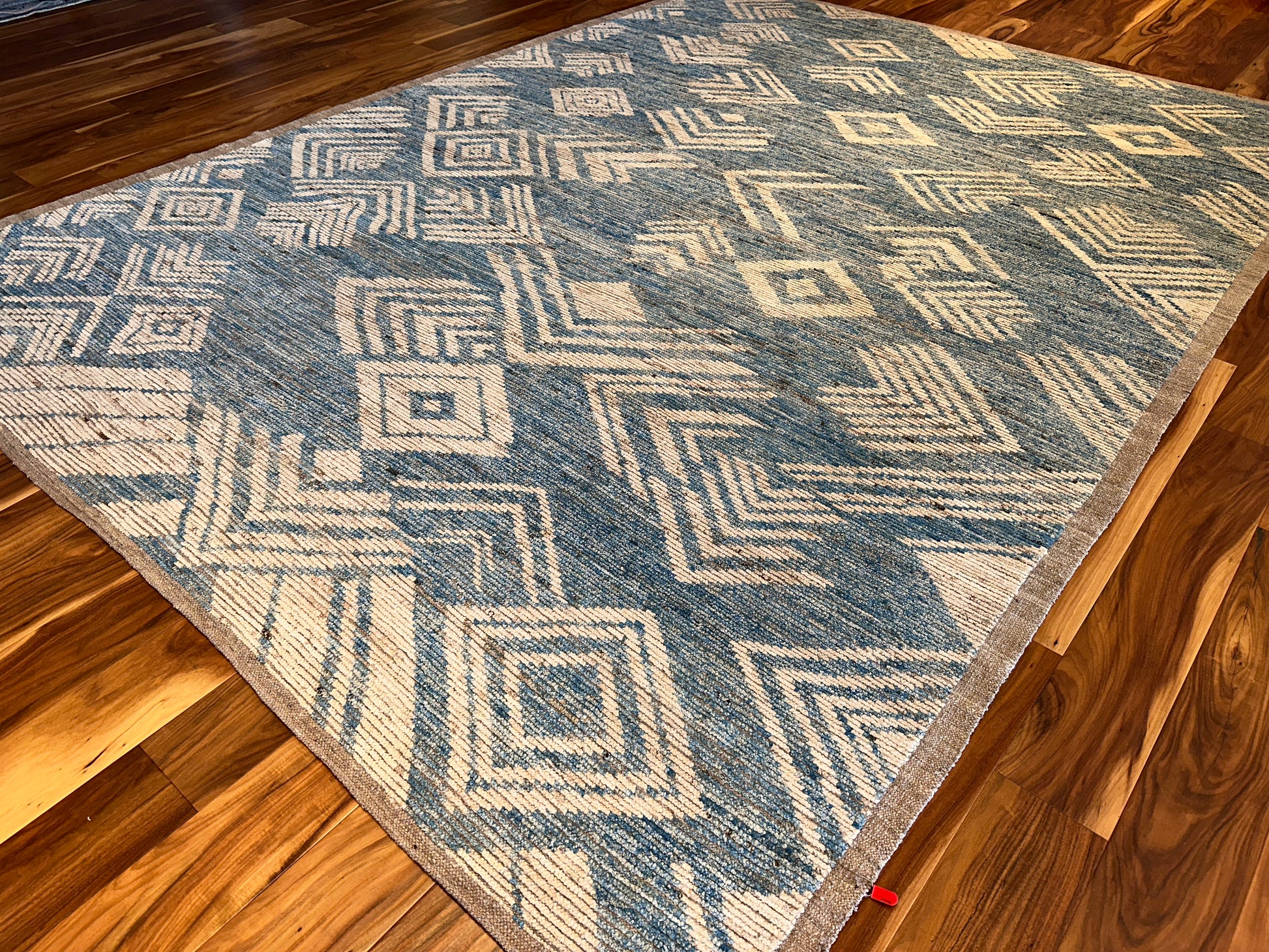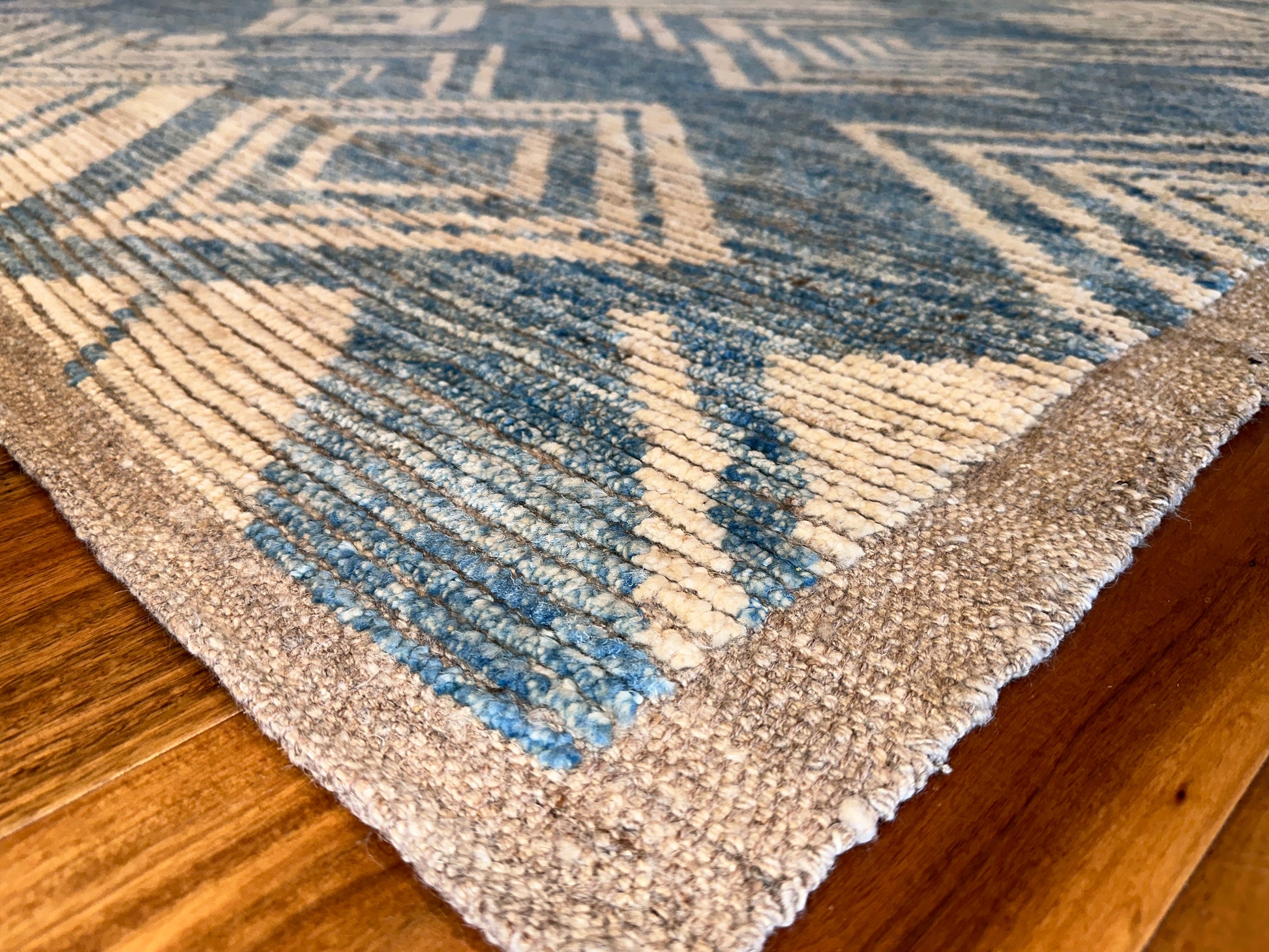 With its bold geometric rhythm and sun-washed texture, this handwoven rug blends tribal influence with modern clarity. Creamy diamond motifs ripple across a blue-toned field, creating a layered effect that evokes motion and symmetry. The distressed finish adds depth and character, making it a striking yet grounded centerpiece.