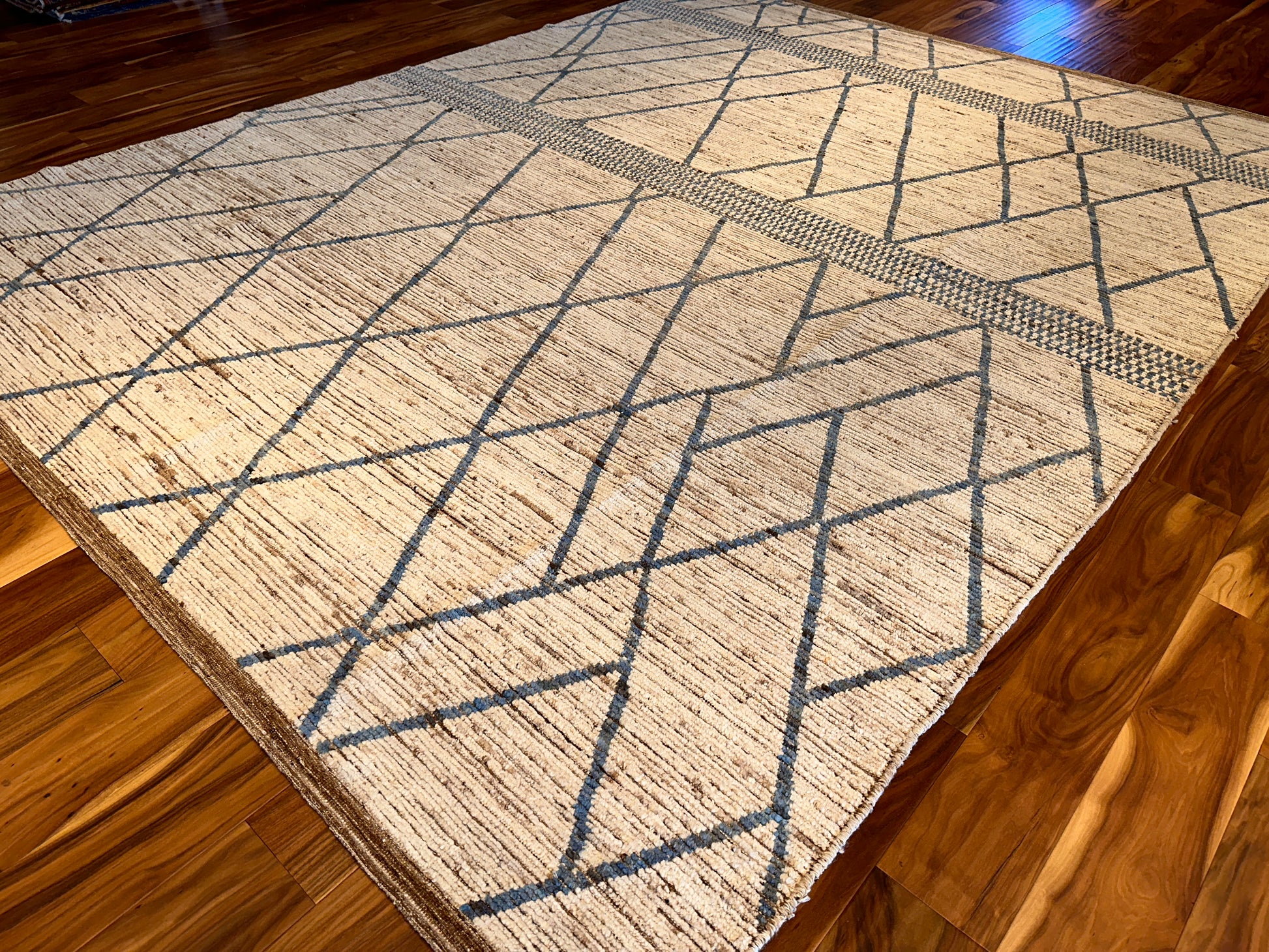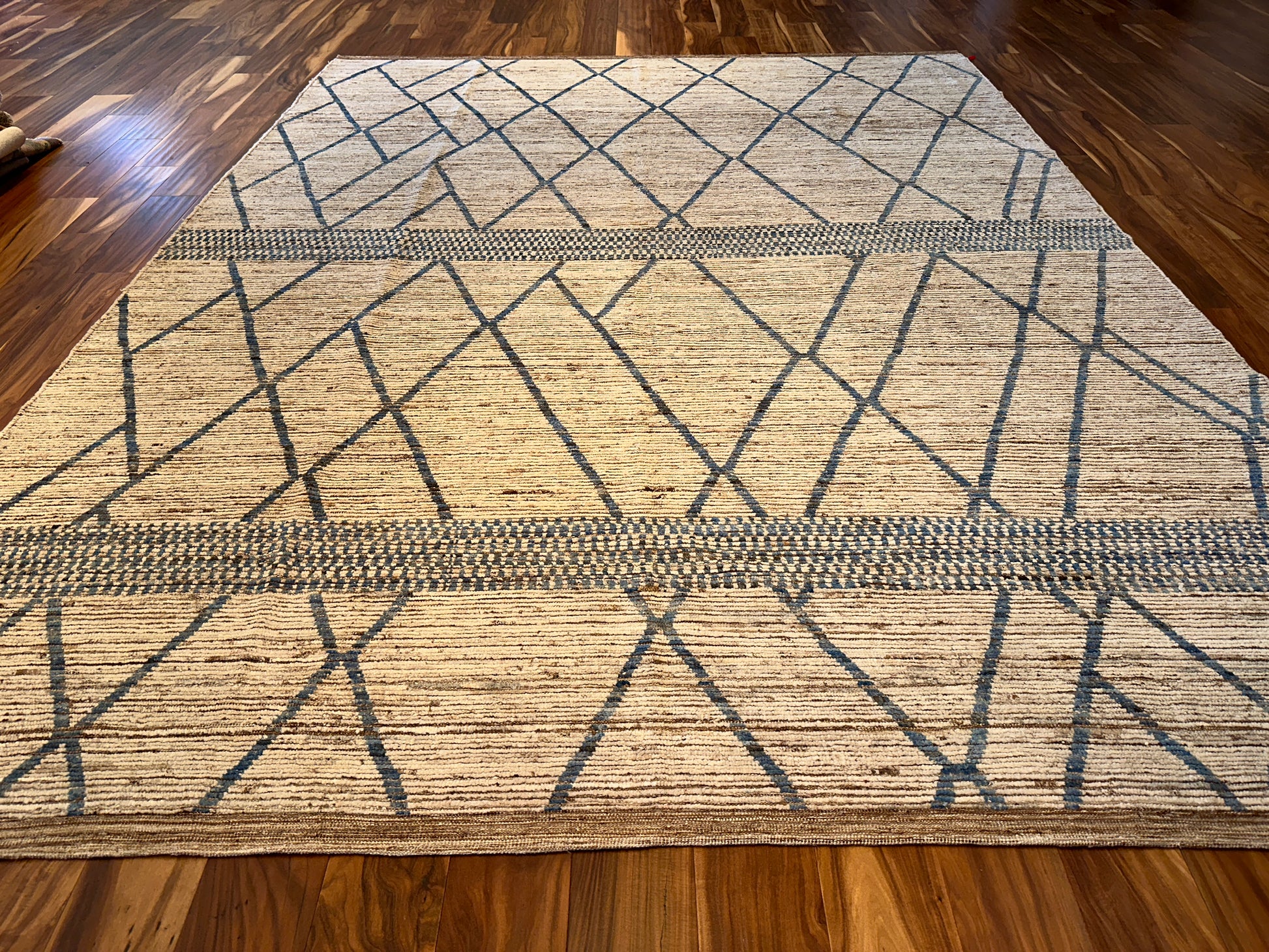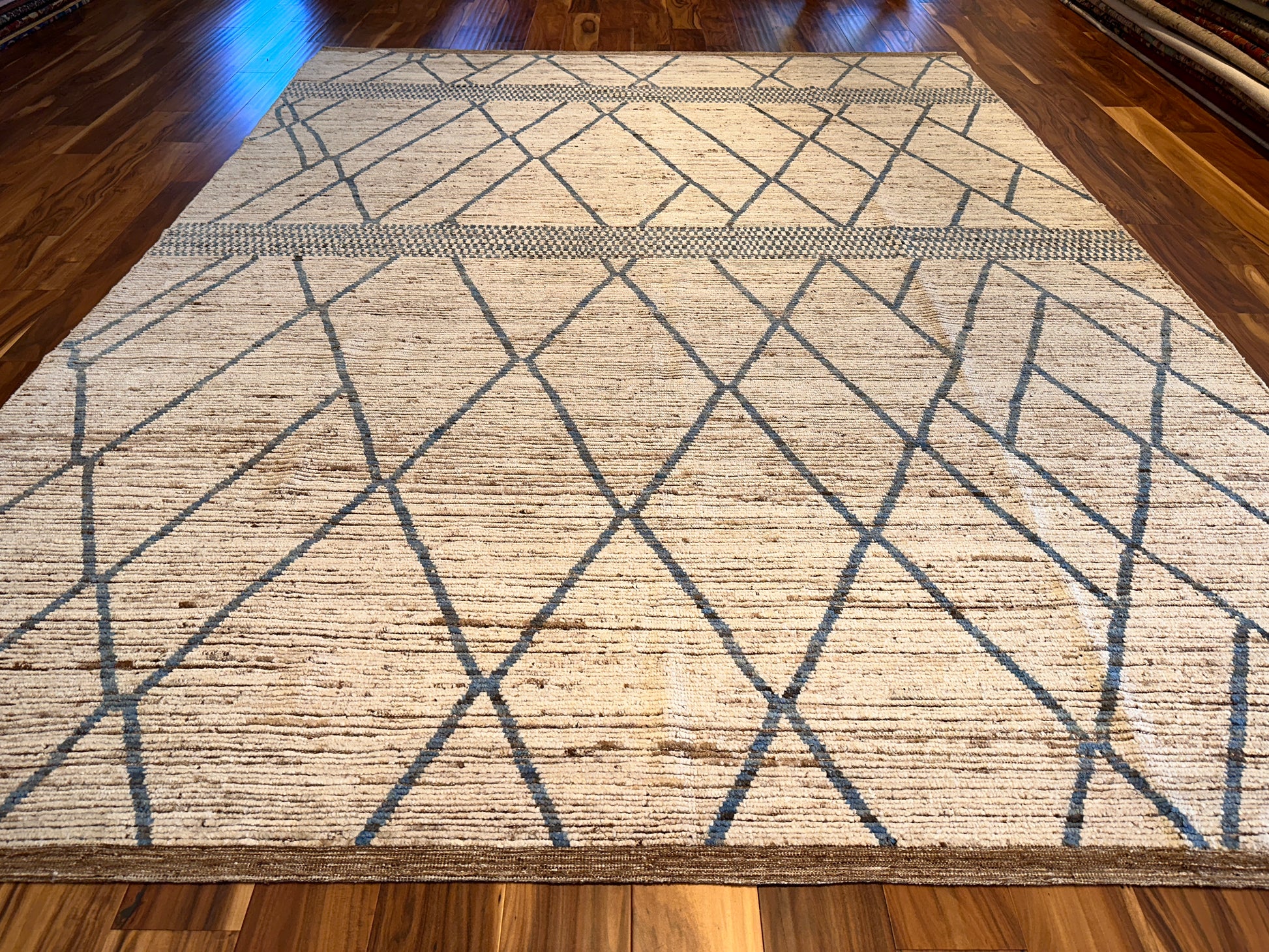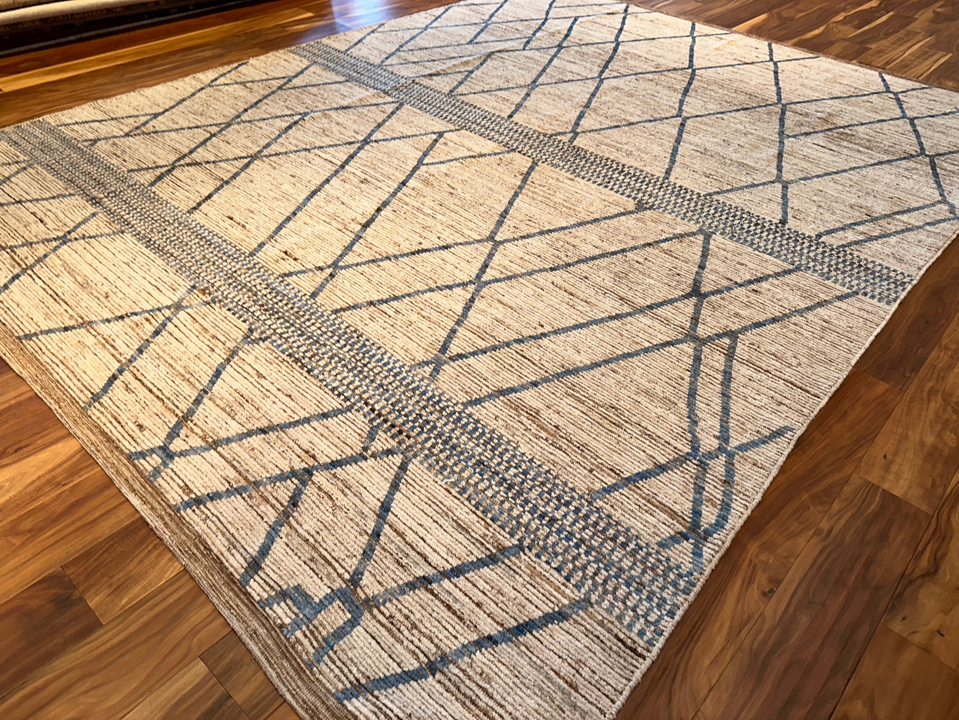 This handwoven rug offers a striking interplay of simplicity and geometry, featuring slender latticework lines in slate blue that cross a softly striated beige ground. Two dotted bands run horizontally, adding a touch of rhythm and texture. Its linear elegance and neutral palette make it a versatile foundation for both modern and transitional settings.