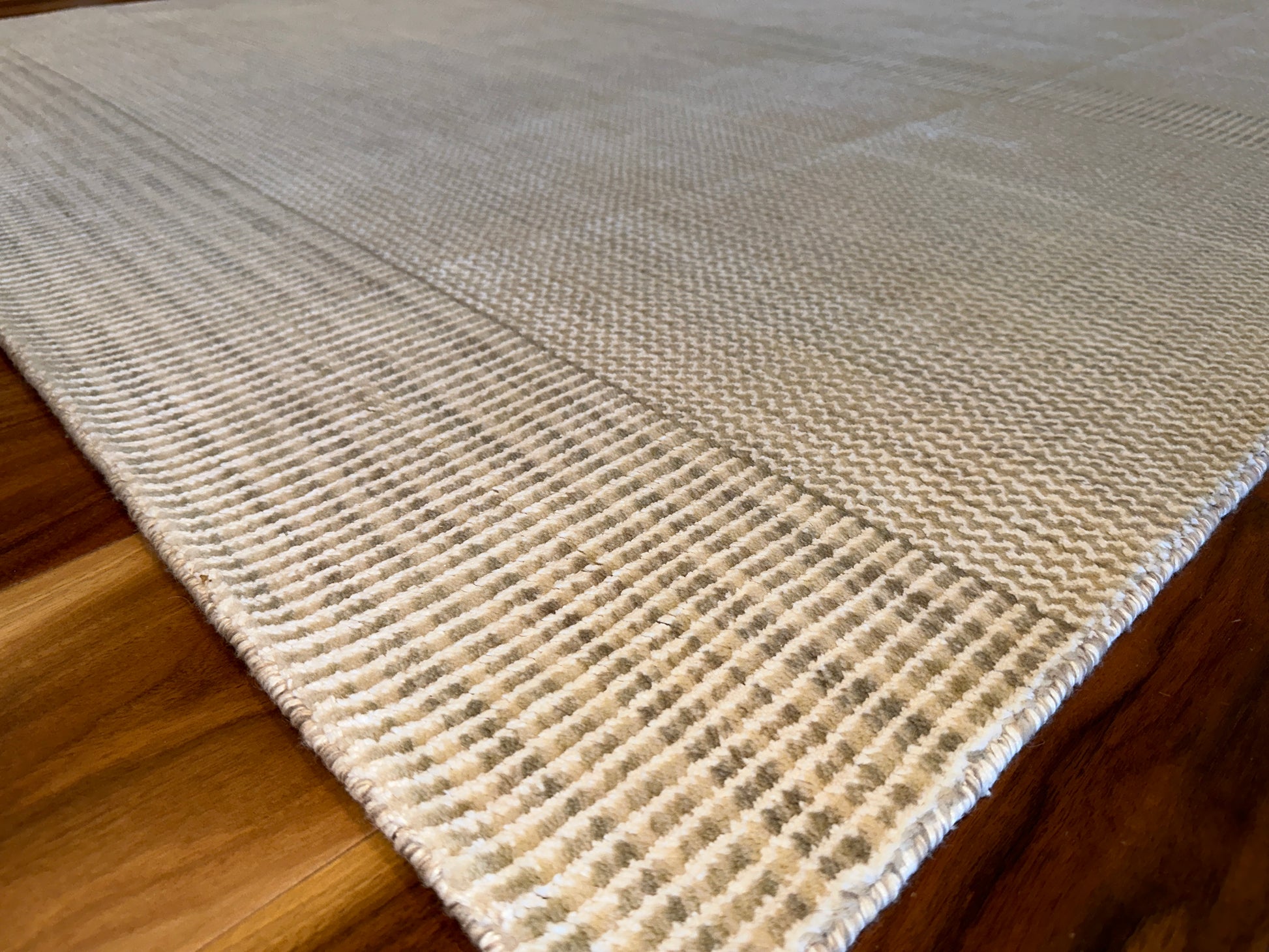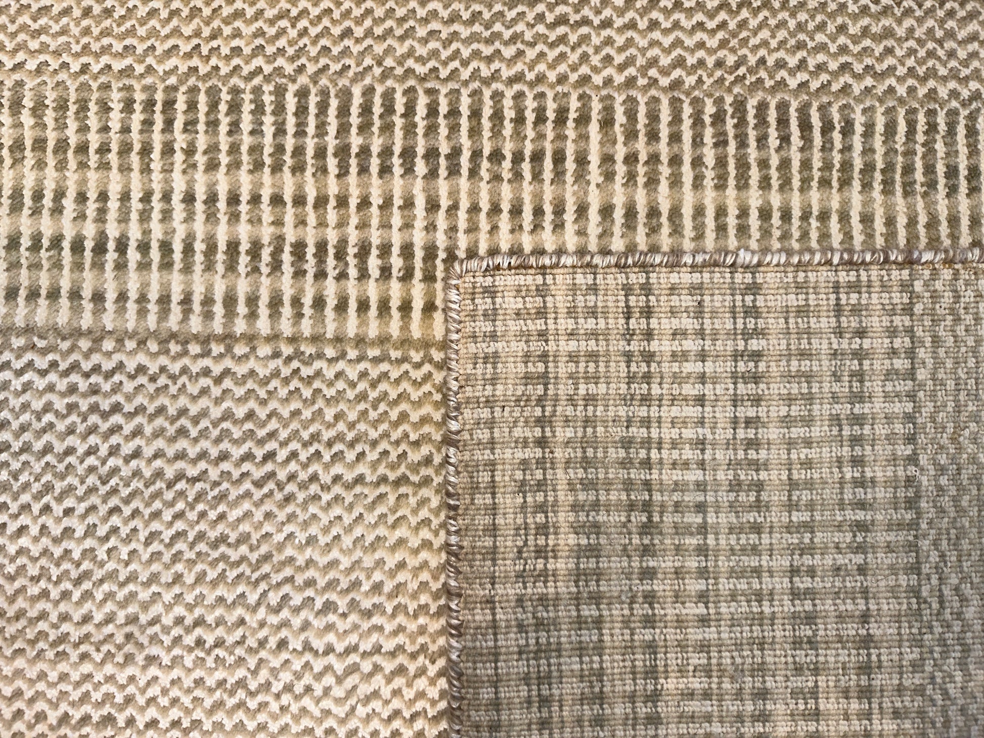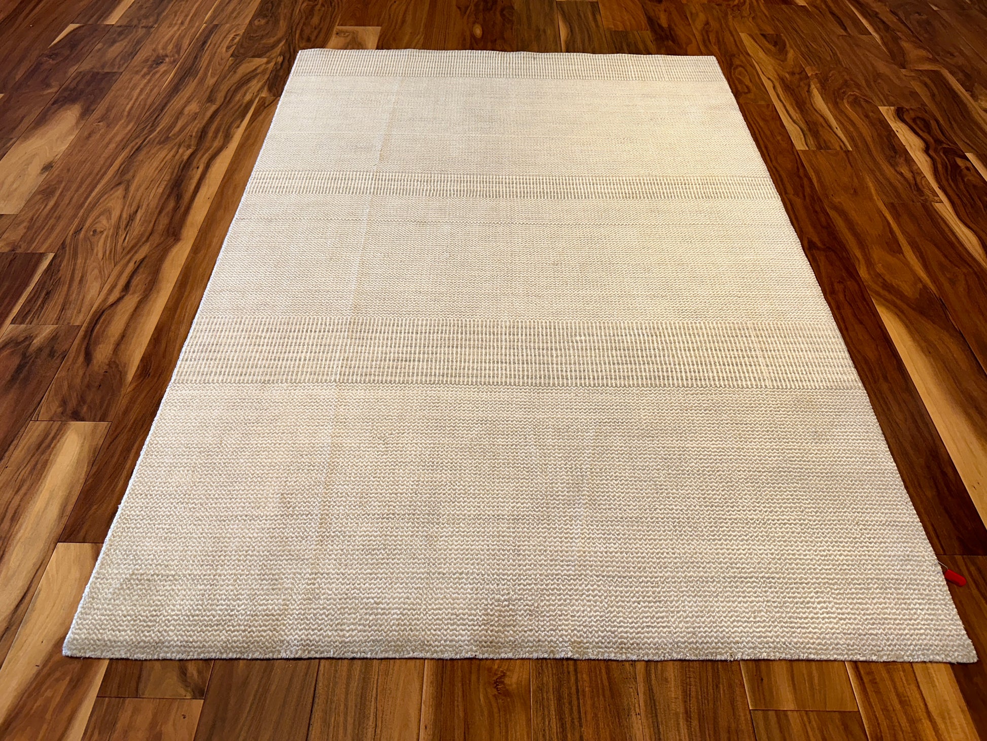 Woven in gentle cream tones, this understated handmade wool rug features alternating panels of fine linear texture and subtle zigzag weave. The tone-on-tone composition lends softness and dimension, offering a quiet elegance that works effortlessly in serene, light-filled spaces. Its minimalist structure and neutral palette provide a versatile foundation for modern or organic interiors.