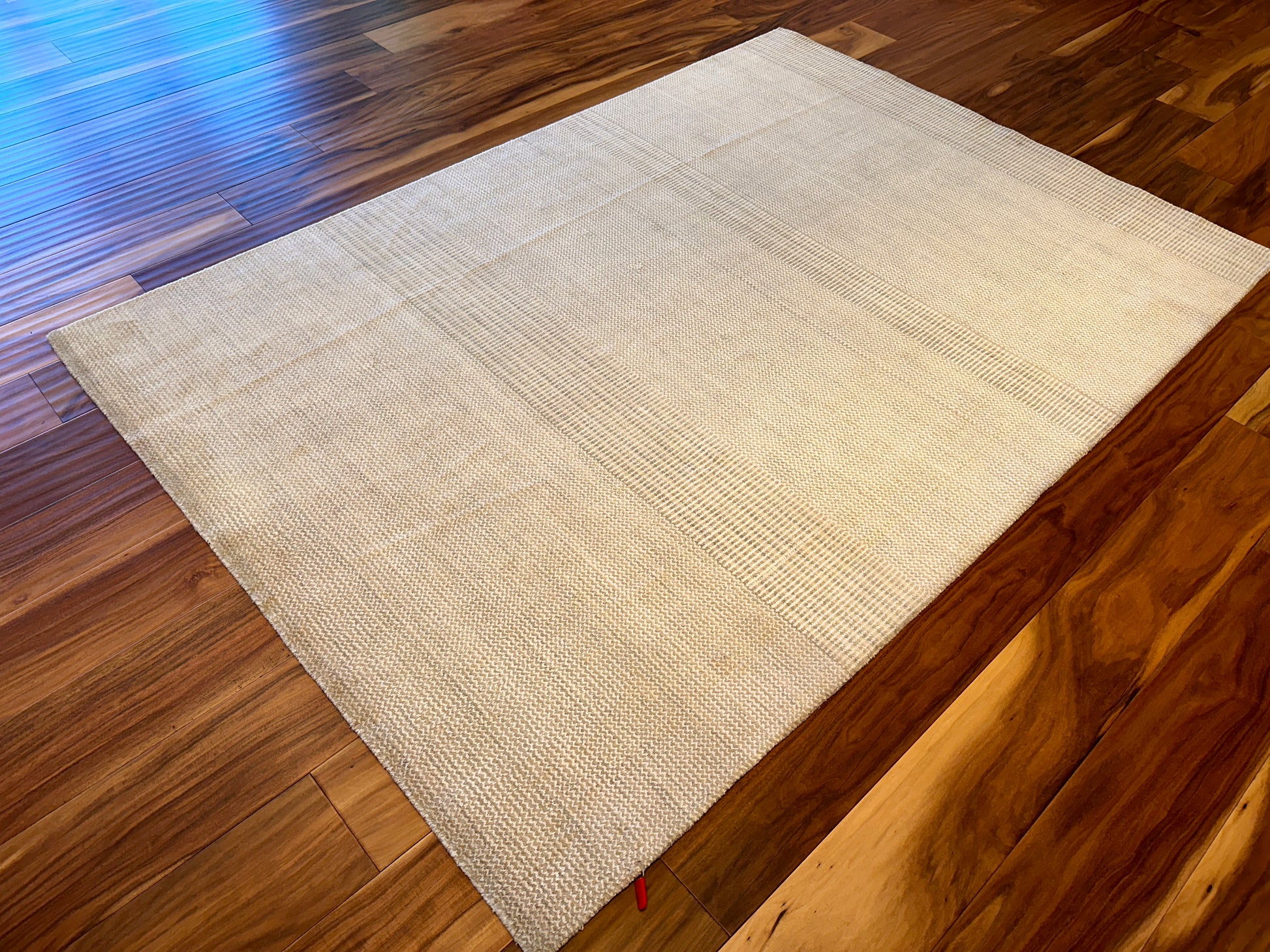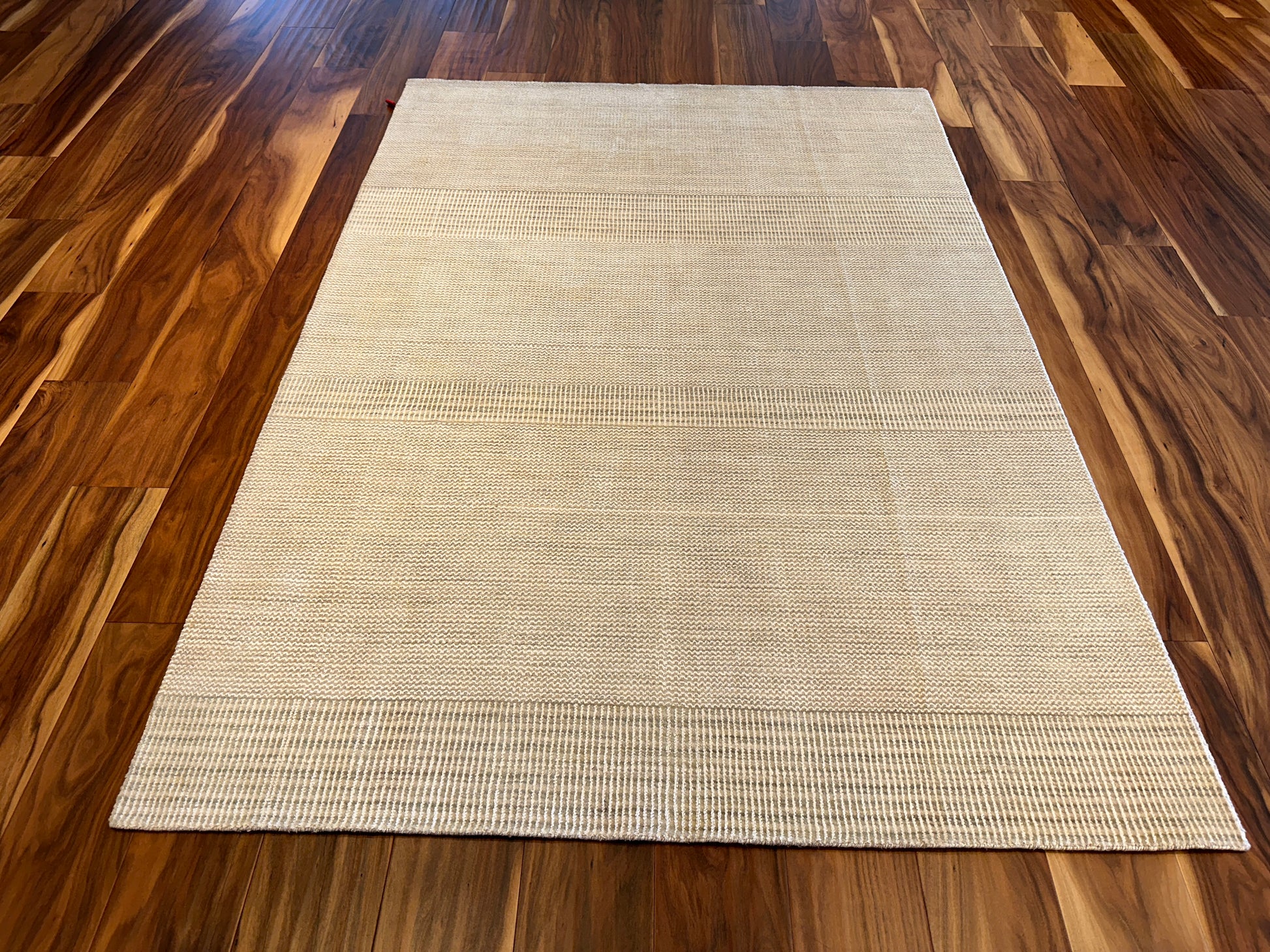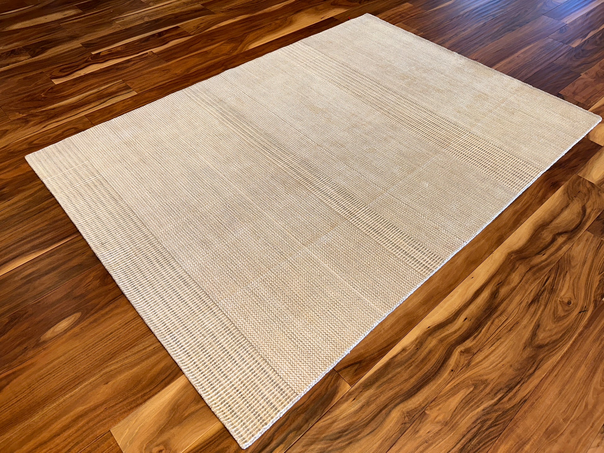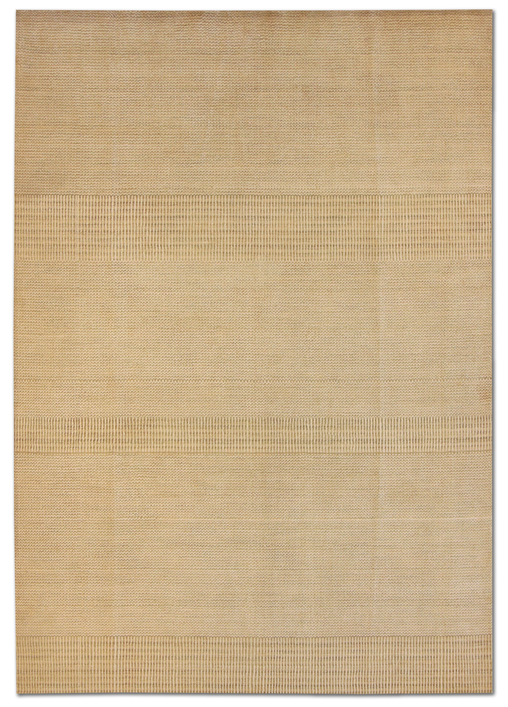 Woven in gentle cream tones, this understated handmade wool rug features alternating panels of fine linear texture and subtle zigzag weave. The tone-on-tone composition lends softness and dimension, offering a quiet elegance that works effortlessly in serene, light-filled spaces. Its minimalist structure and neutral palette provide a versatile foundation for modern or organic interiors.