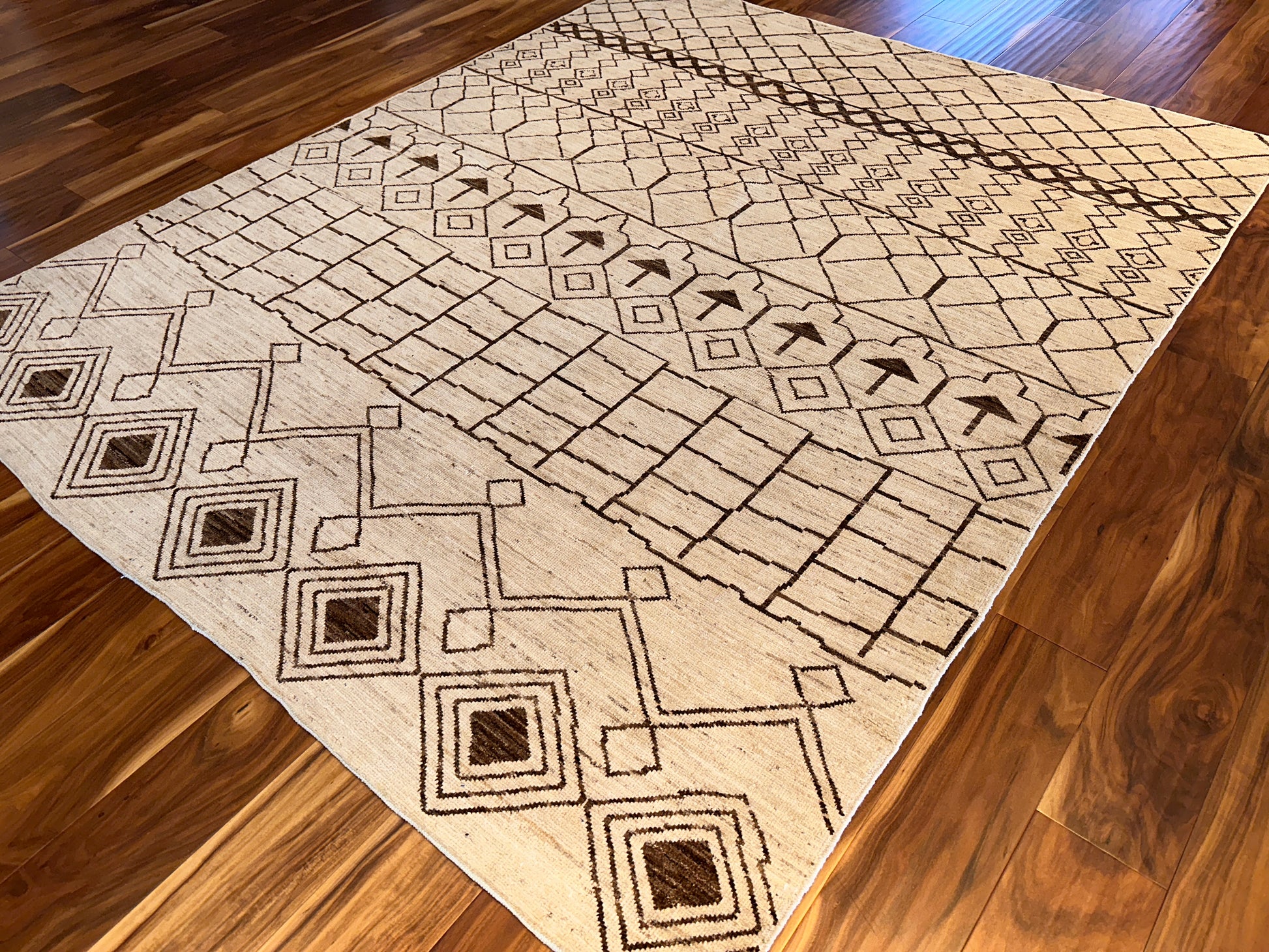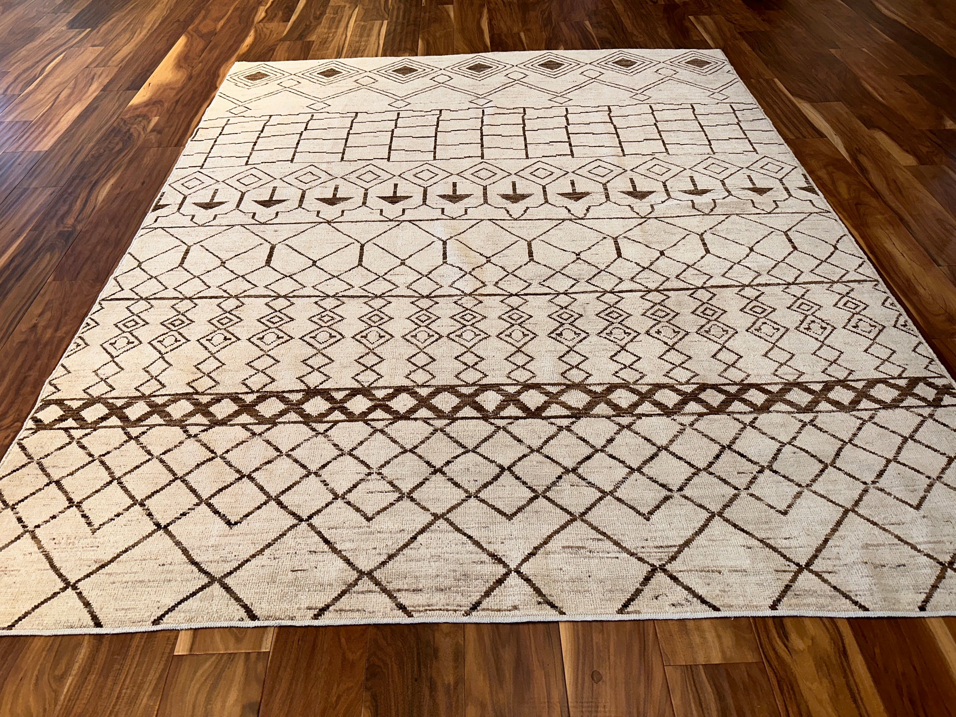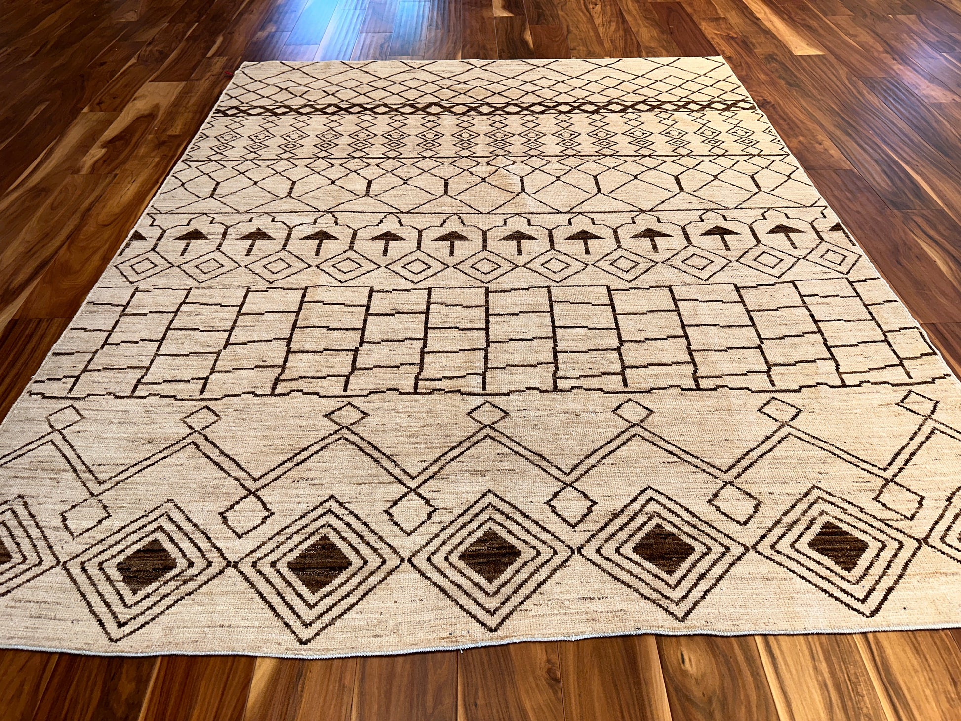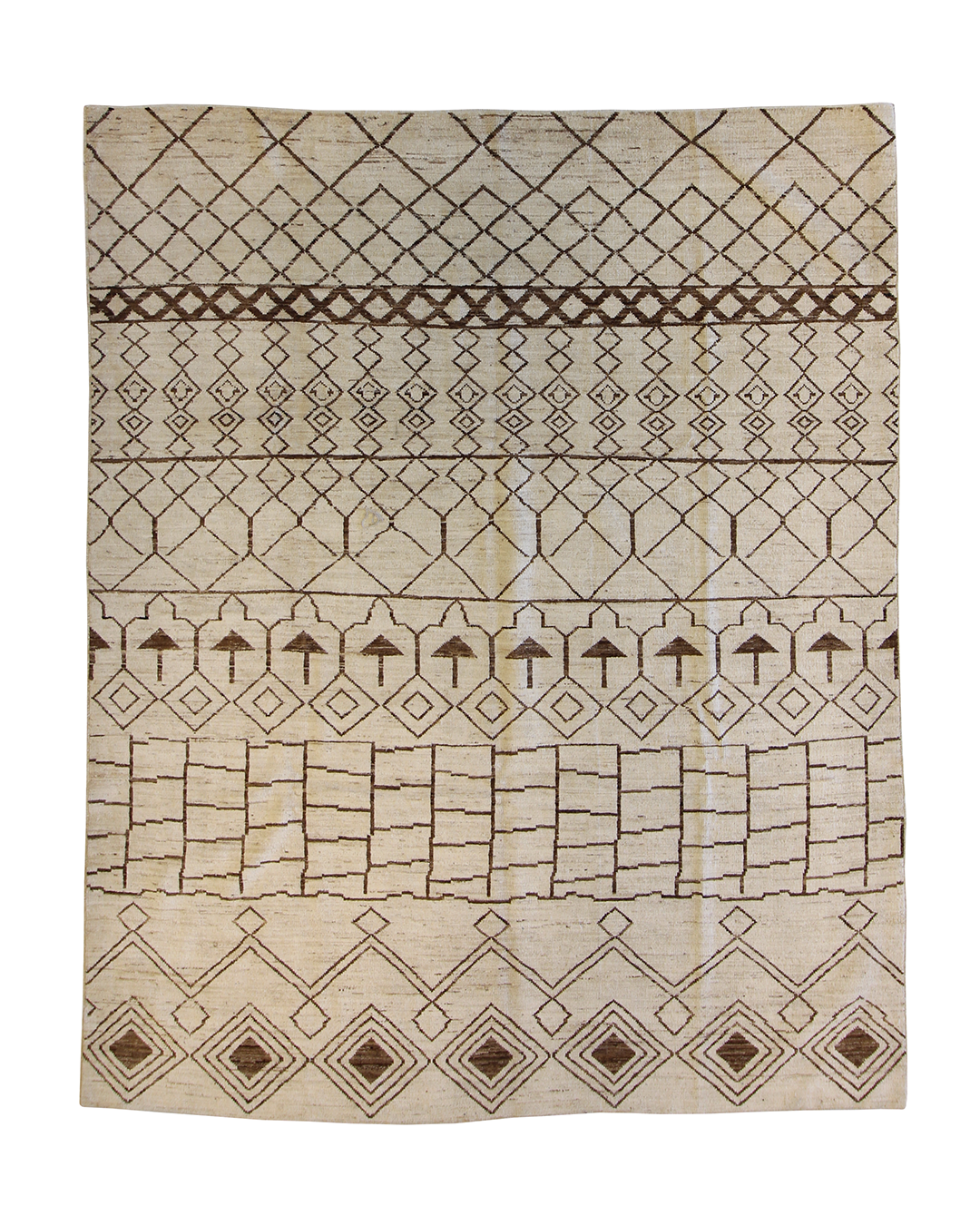 This Moroccan-inspired rug is defined by its rhythmic, tribal linework and minimalist balance of form. A palette of soft beige and cocoa brown gives the design a grounded warmth, while the structured sequence of geometric bands introduces a visual tempo across the rug’s surface. Its contemporary take on classic Berber motifs makes it a striking yet versatile piece for curated interiors.