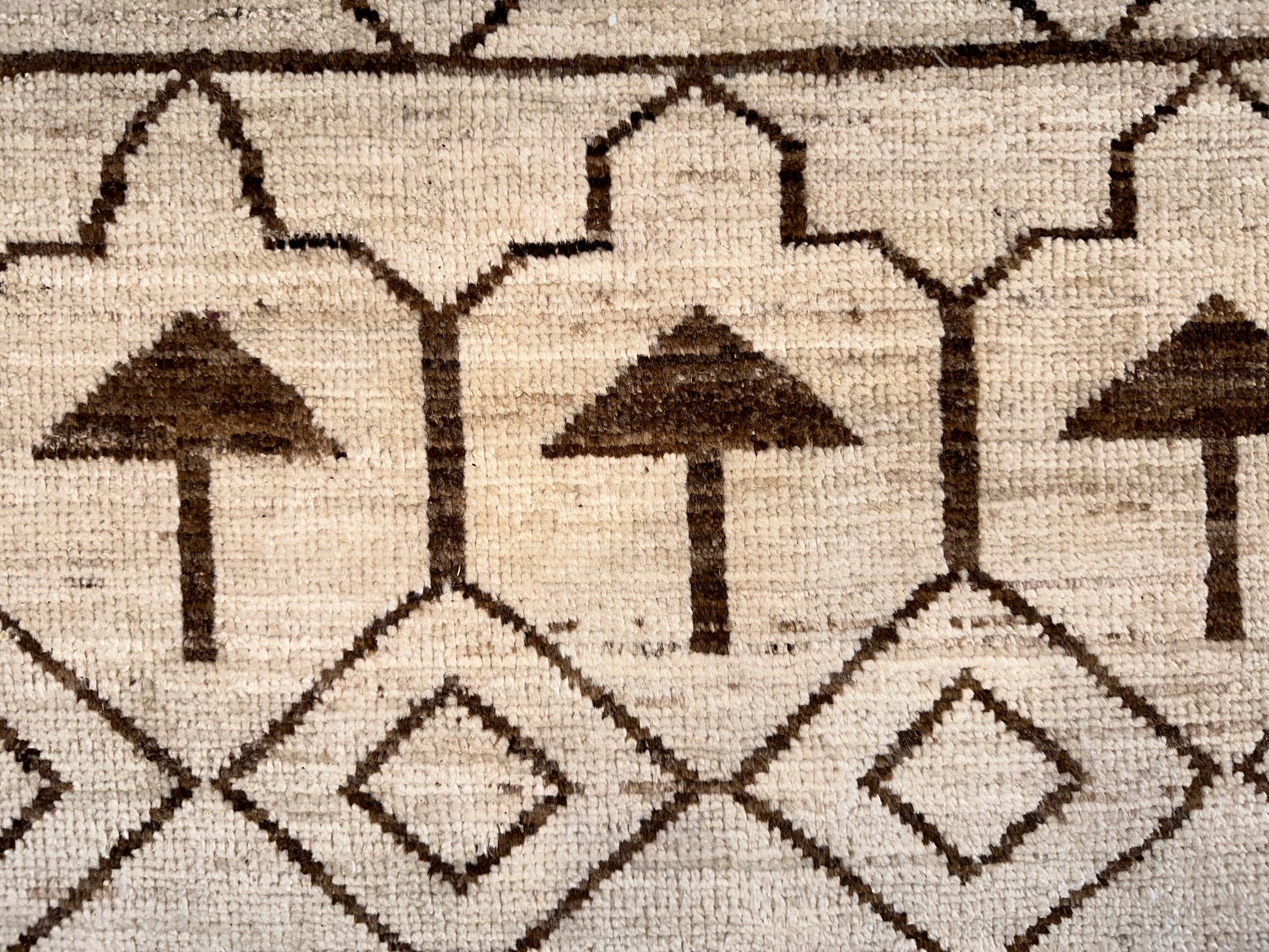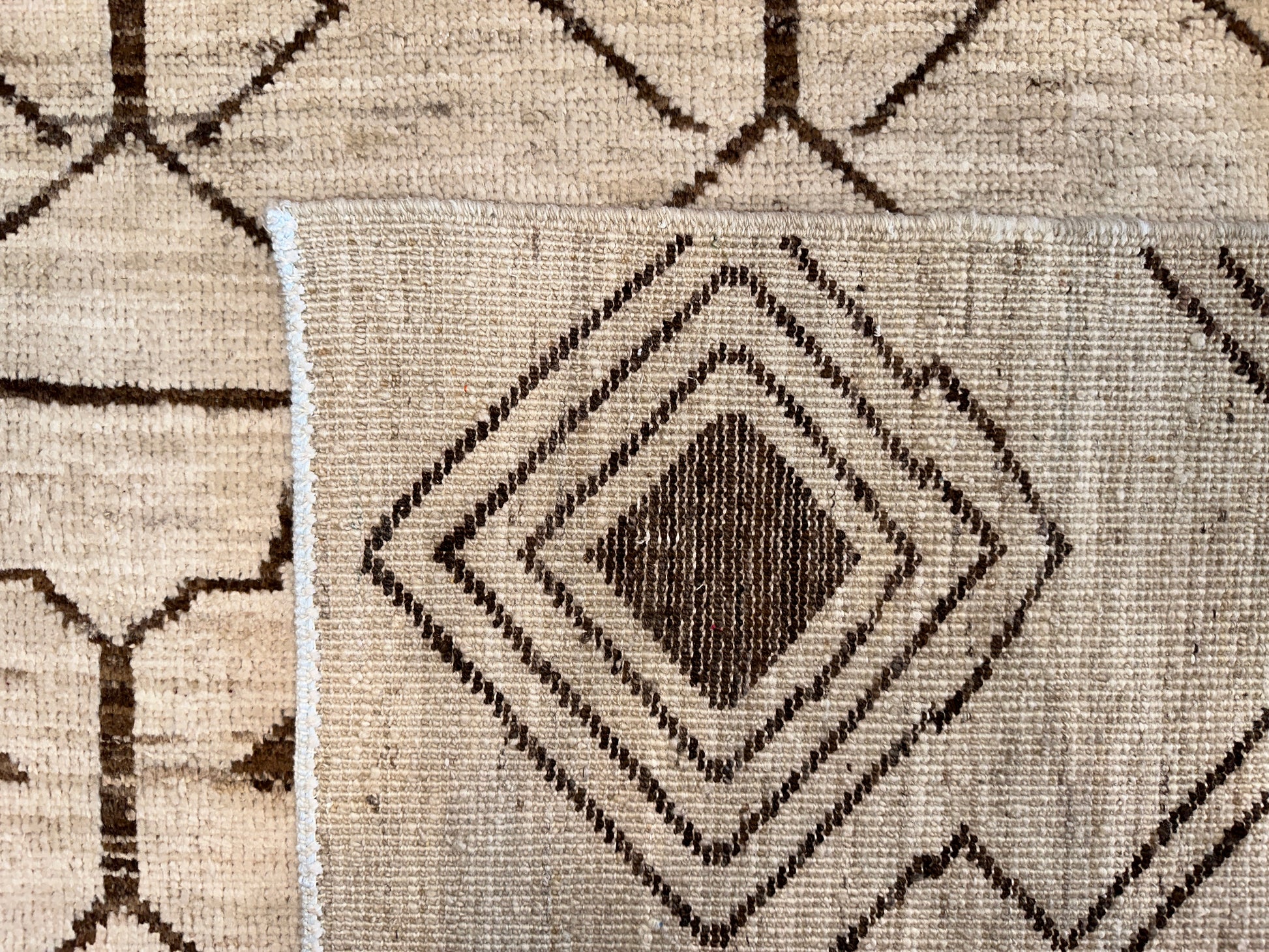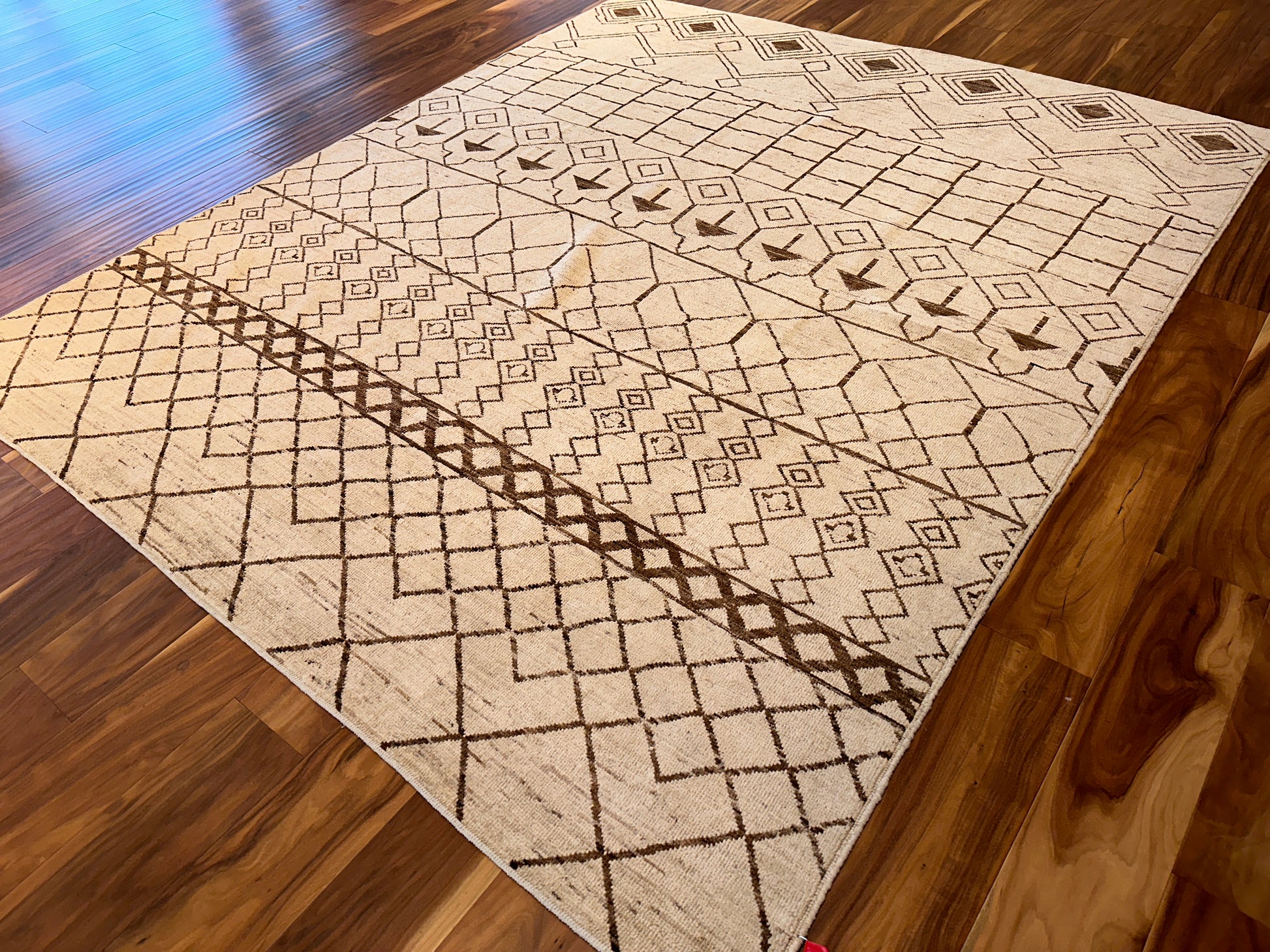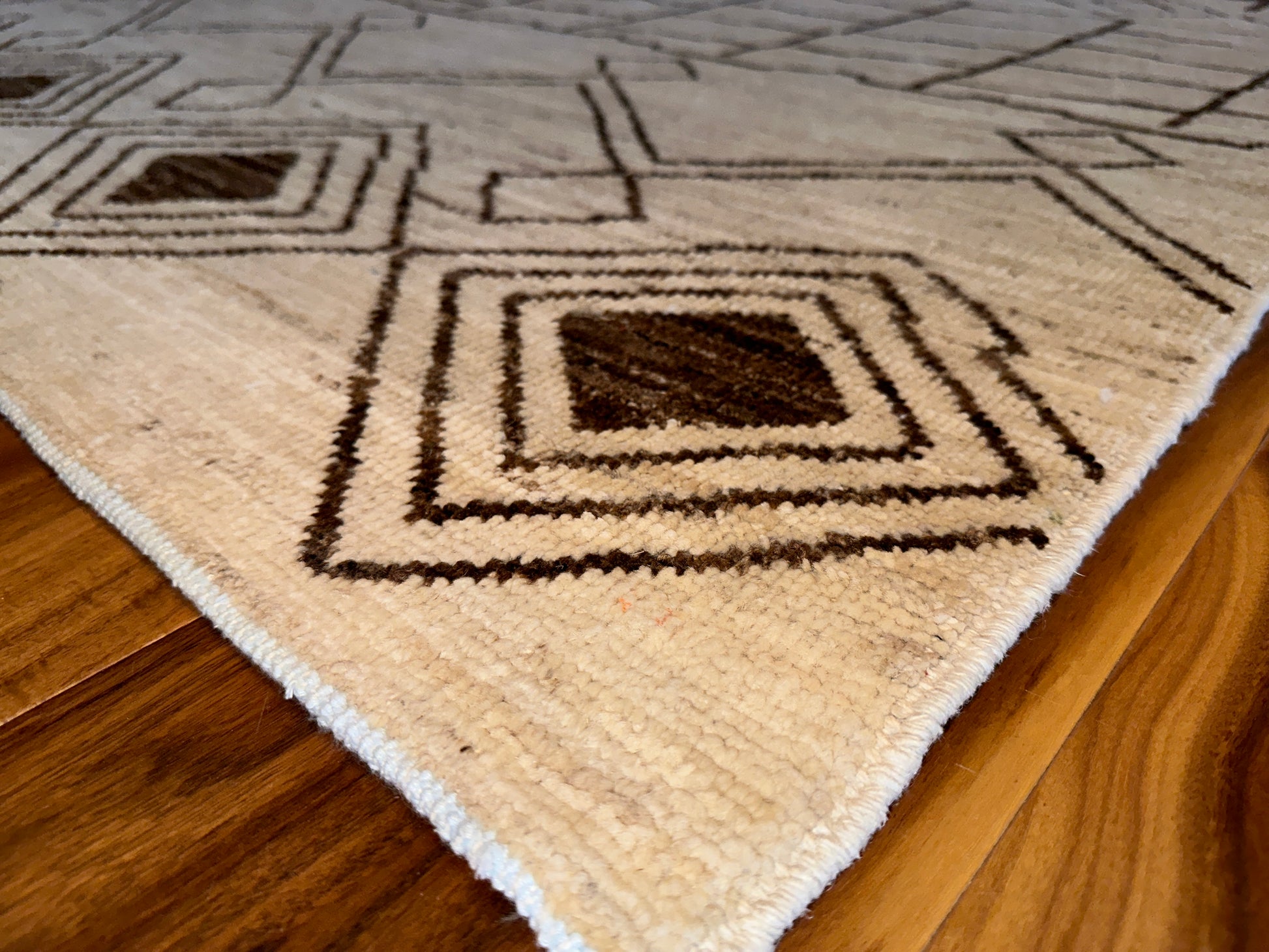 This Moroccan-inspired rug is defined by its rhythmic, tribal linework and minimalist balance of form. A palette of soft beige and cocoa brown gives the design a grounded warmth, while the structured sequence of geometric bands introduces a visual tempo across the rug’s surface. Its contemporary take on classic Berber motifs makes it a striking yet versatile piece for curated interiors.
