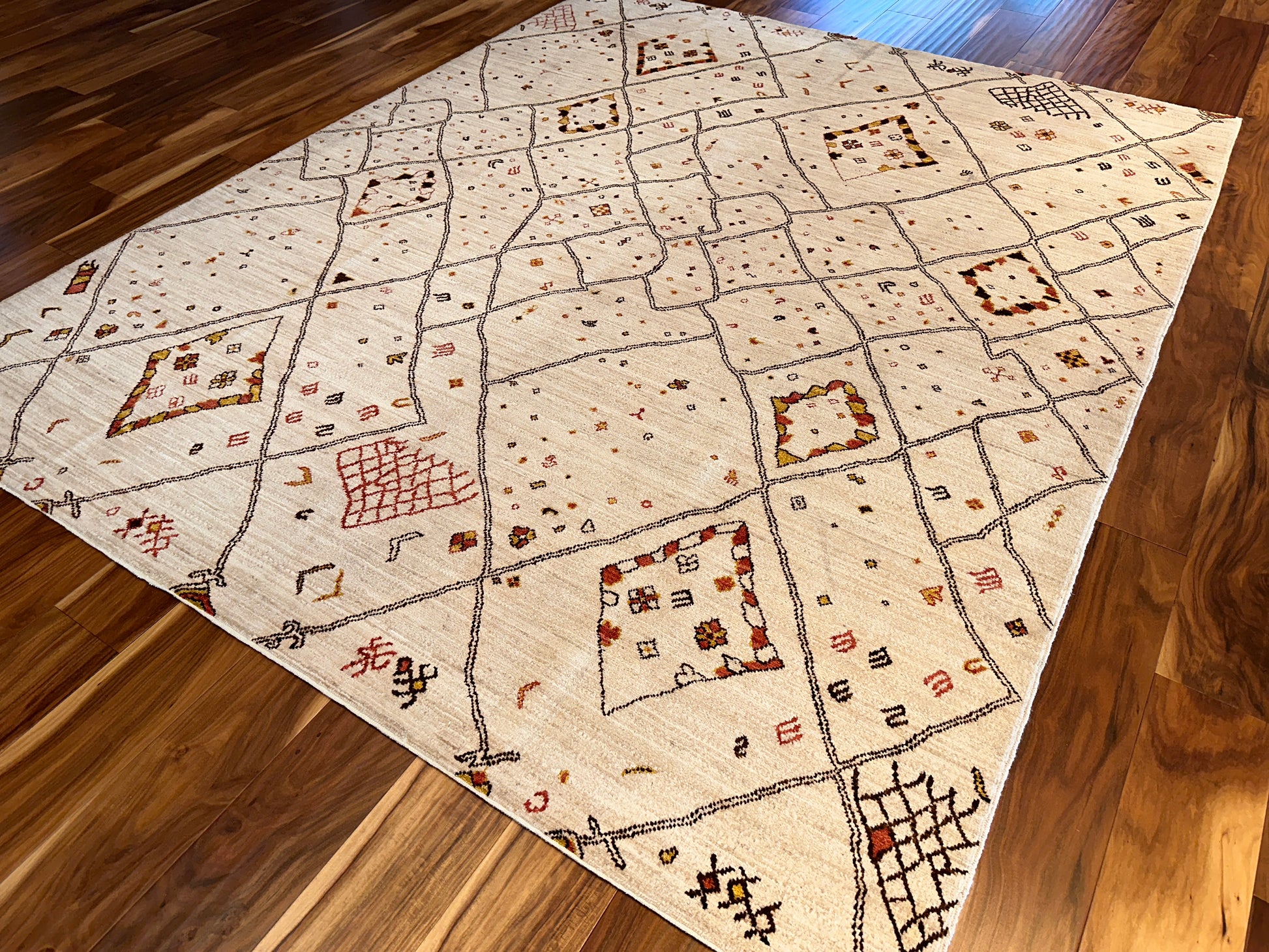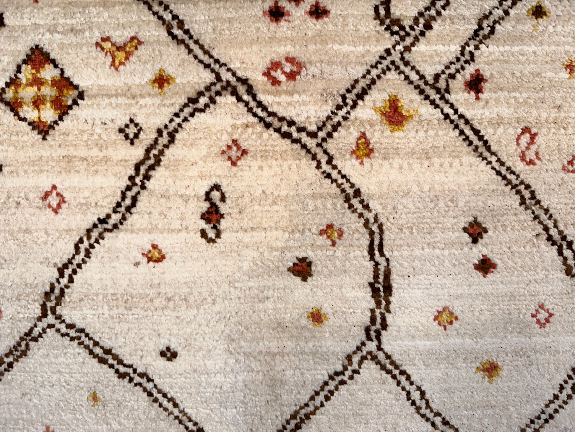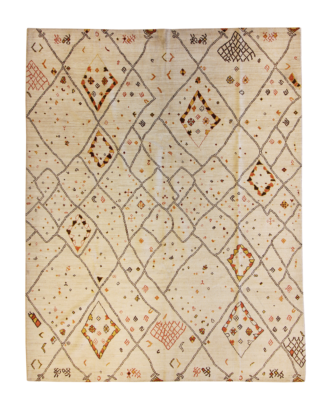 This contemporary Moroccan-style rug is a playful reimagining of traditional Berber motifs, featuring an abstract lattice of irregular diamonds and whimsical symbols scattered across a soft cream field. Accents in ochre, rust, and espresso lend warmth and movement to the open design, while the hand-drawn quality of the lines gives it a relaxed, organic energy. Ideal for modern spaces that crave artistry and a touch of soul.