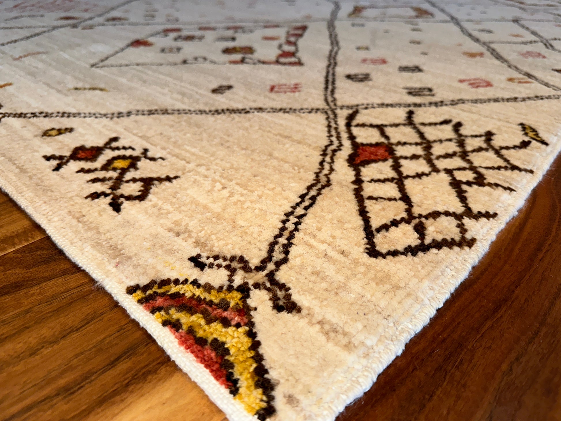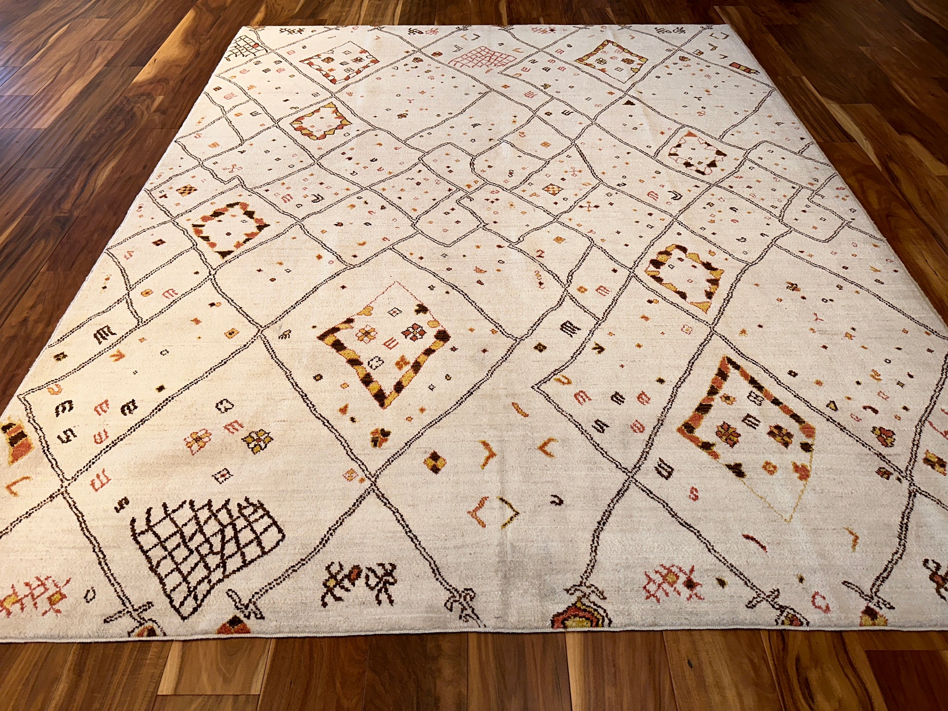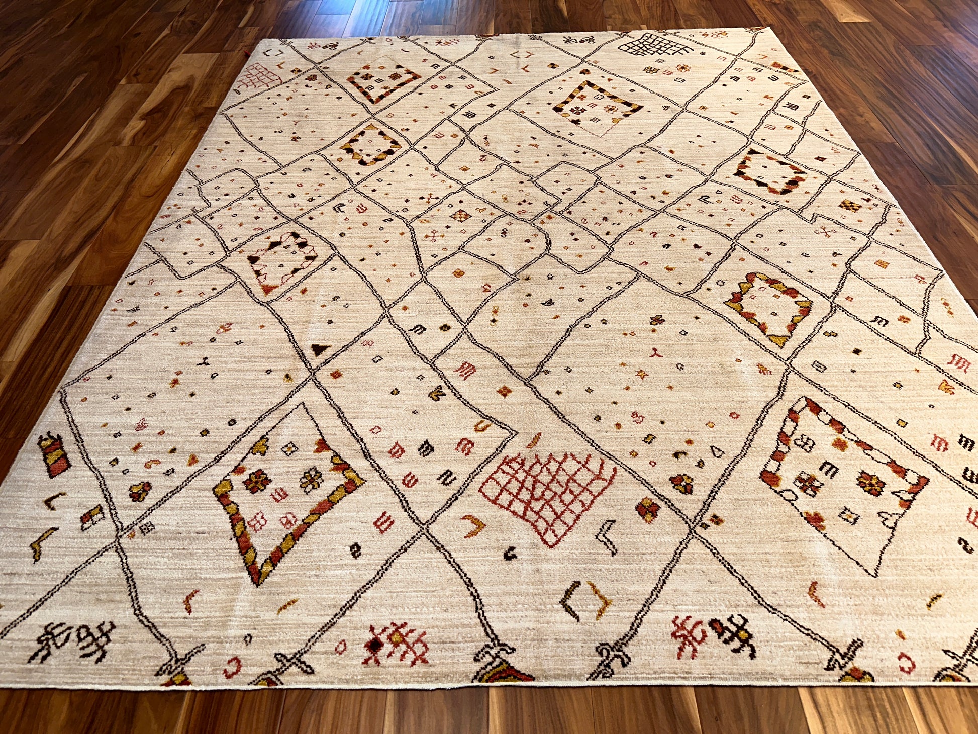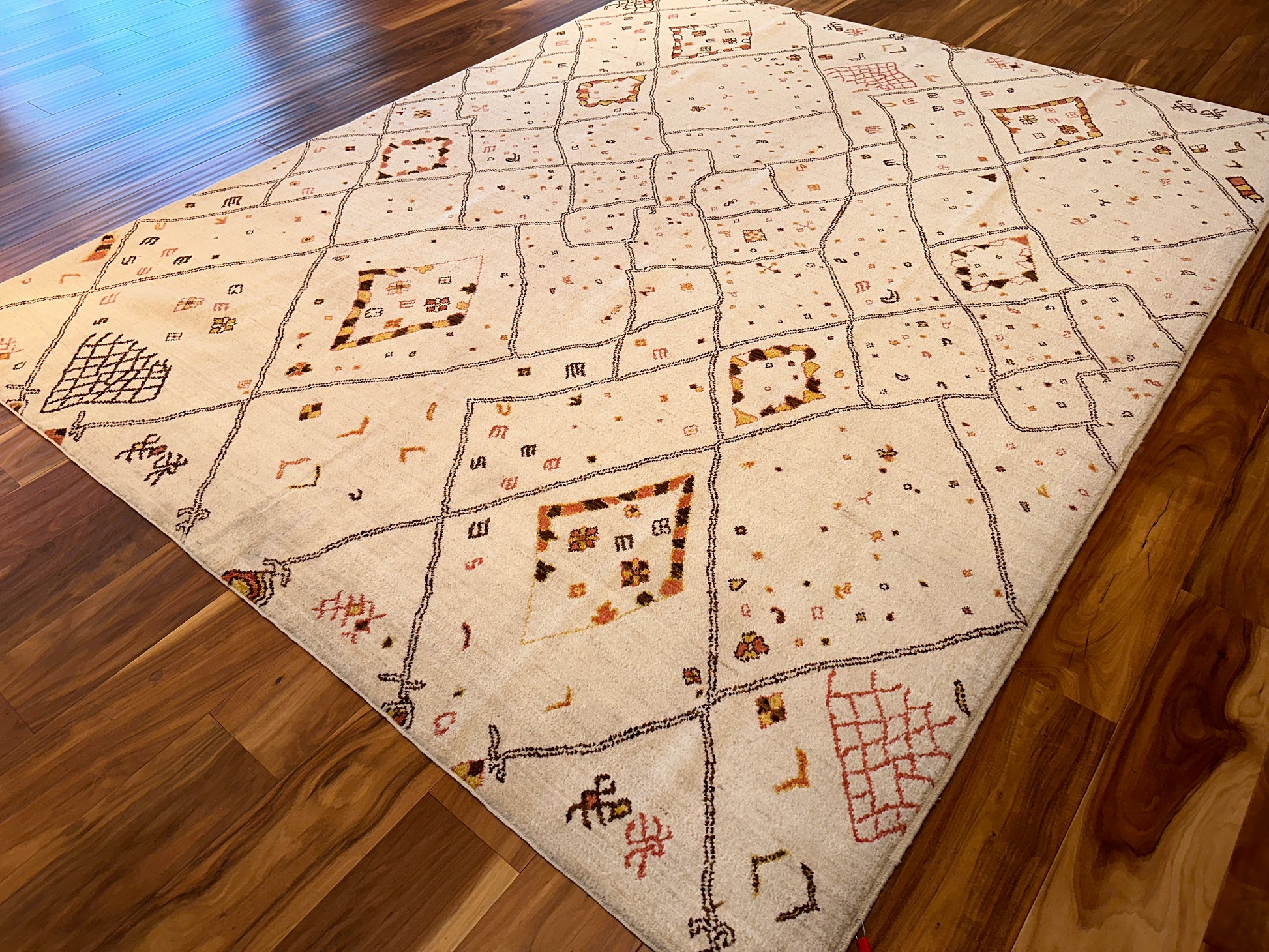 This contemporary Moroccan-style rug is a playful reimagining of traditional Berber motifs, featuring an abstract lattice of irregular diamonds and whimsical symbols scattered across a soft cream field. Accents in ochre, rust, and espresso lend warmth and movement to the open design, while the hand-drawn quality of the lines gives it a relaxed, organic energy. Ideal for modern spaces that crave artistry and a touch of soul.