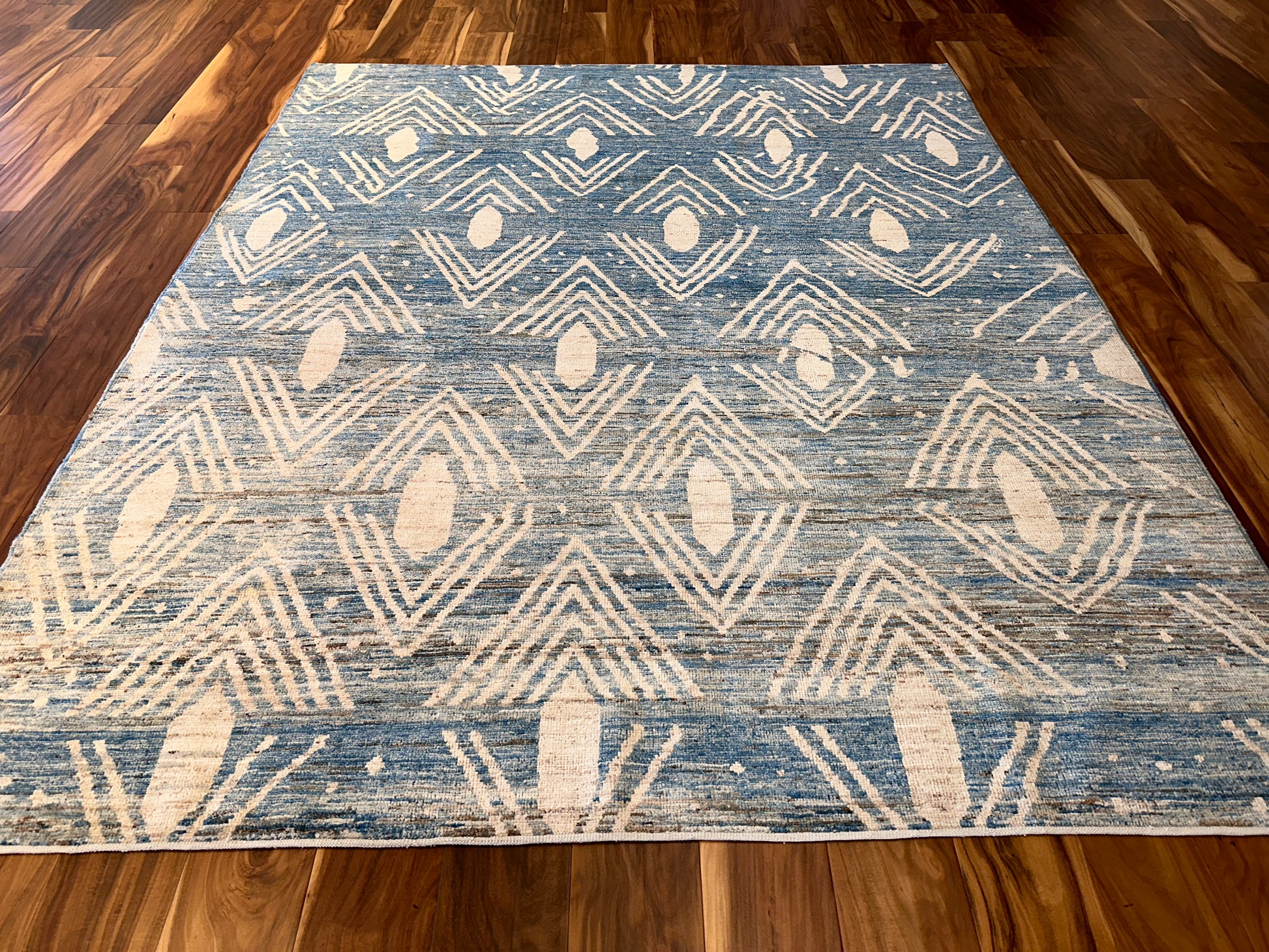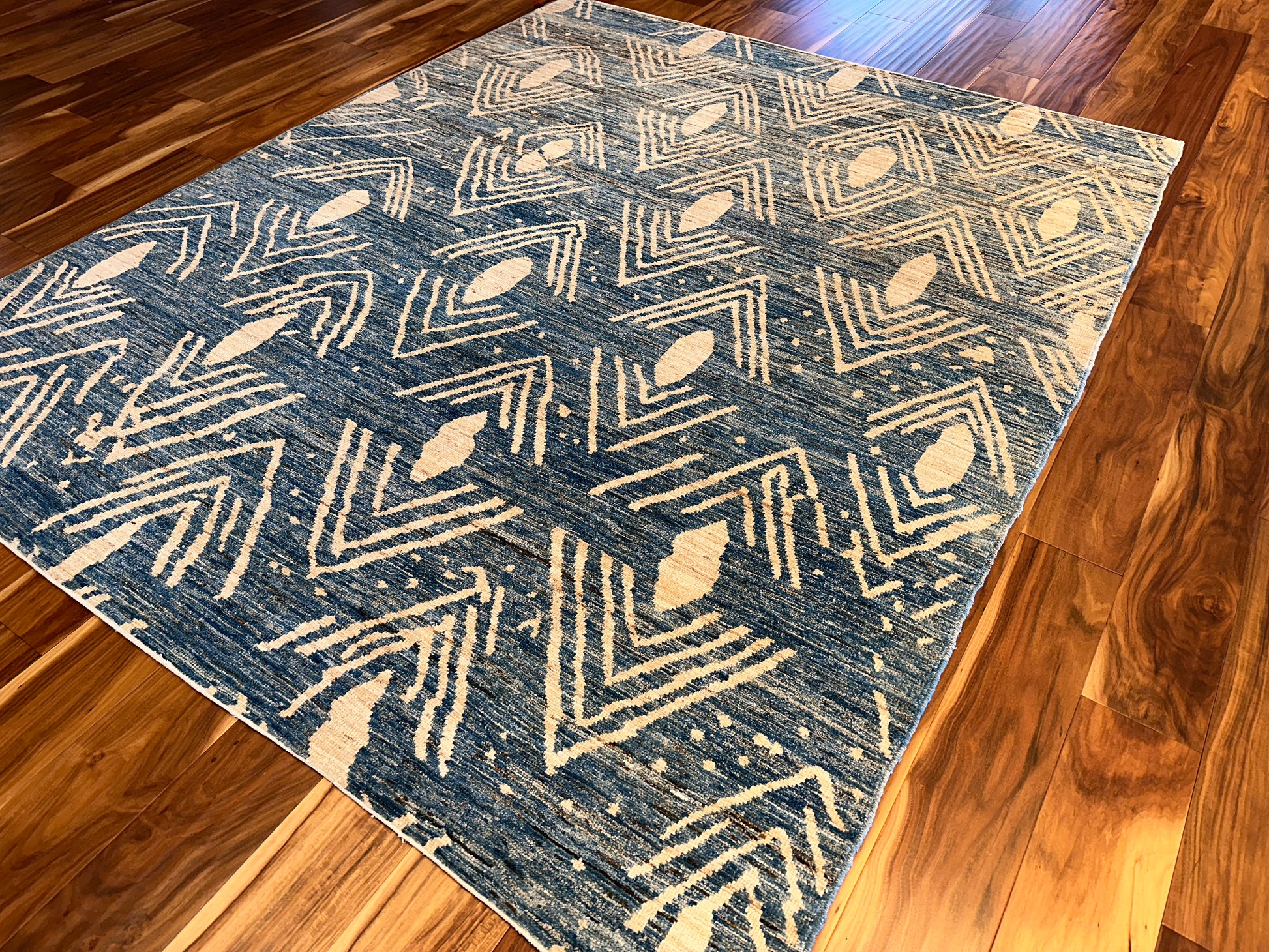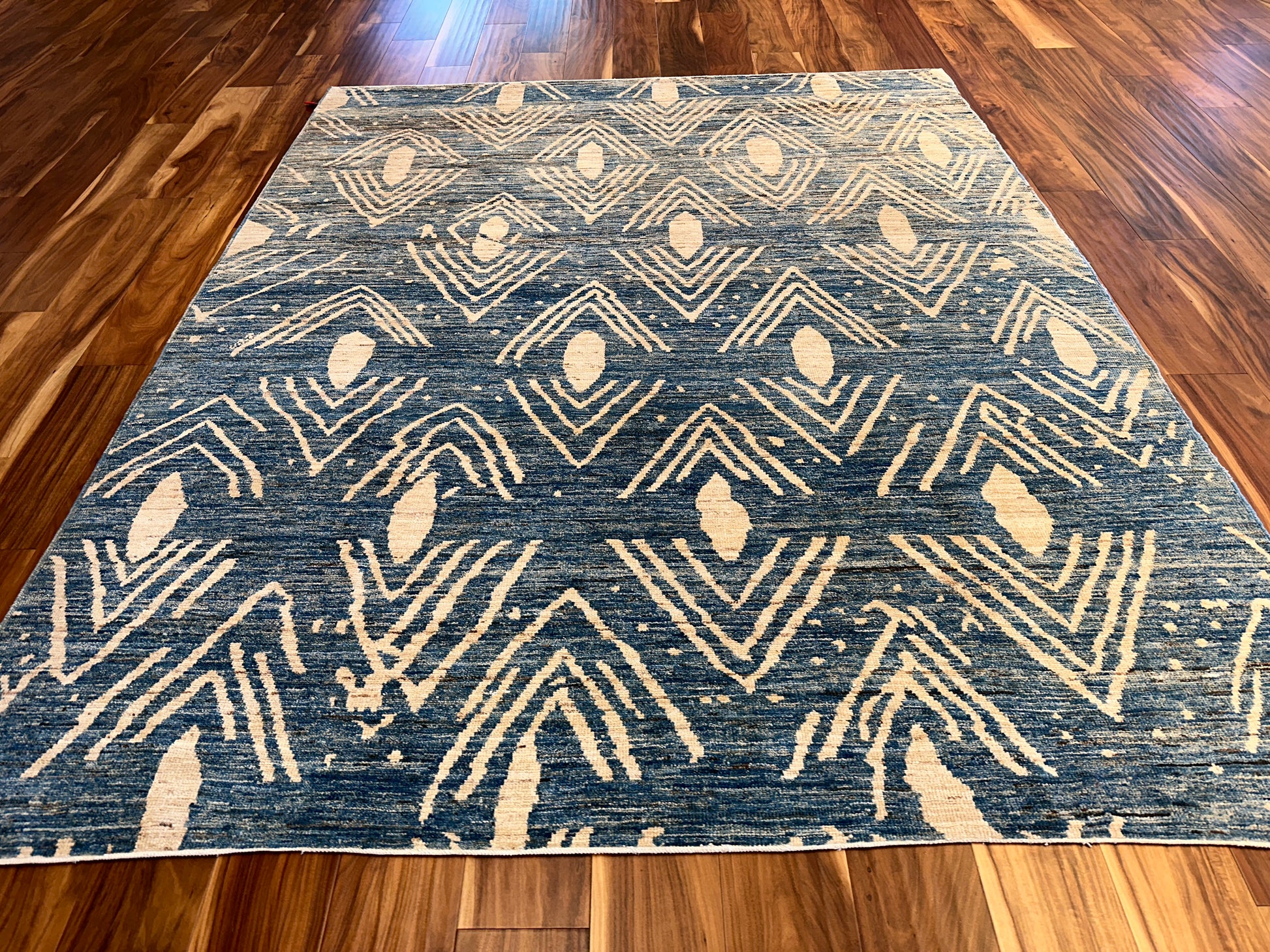 A vivid blue field hosts a rhythmic arrangement of hand-drawn diamond motifs, each layered in tapering lines that create an almost arrow-like effect. The warm cream details soften the bold geometry, giving this handmade rug a contemporary tribal flair that feels grounded yet full of movement. Its artistic repetition and textural variation lend a dynamic energy to clean, modern spaces.