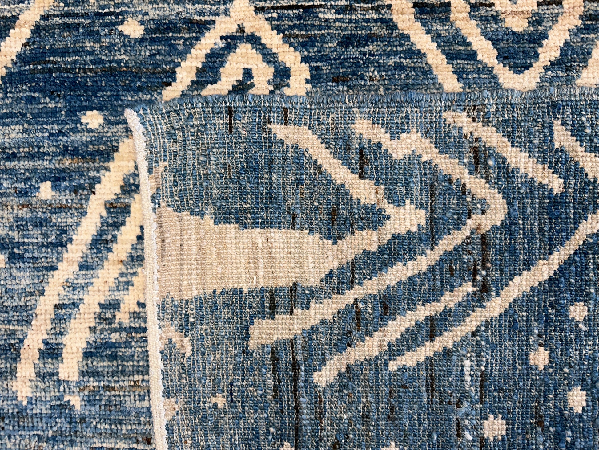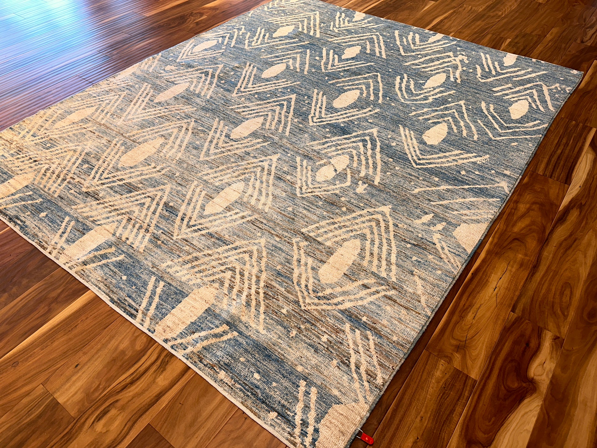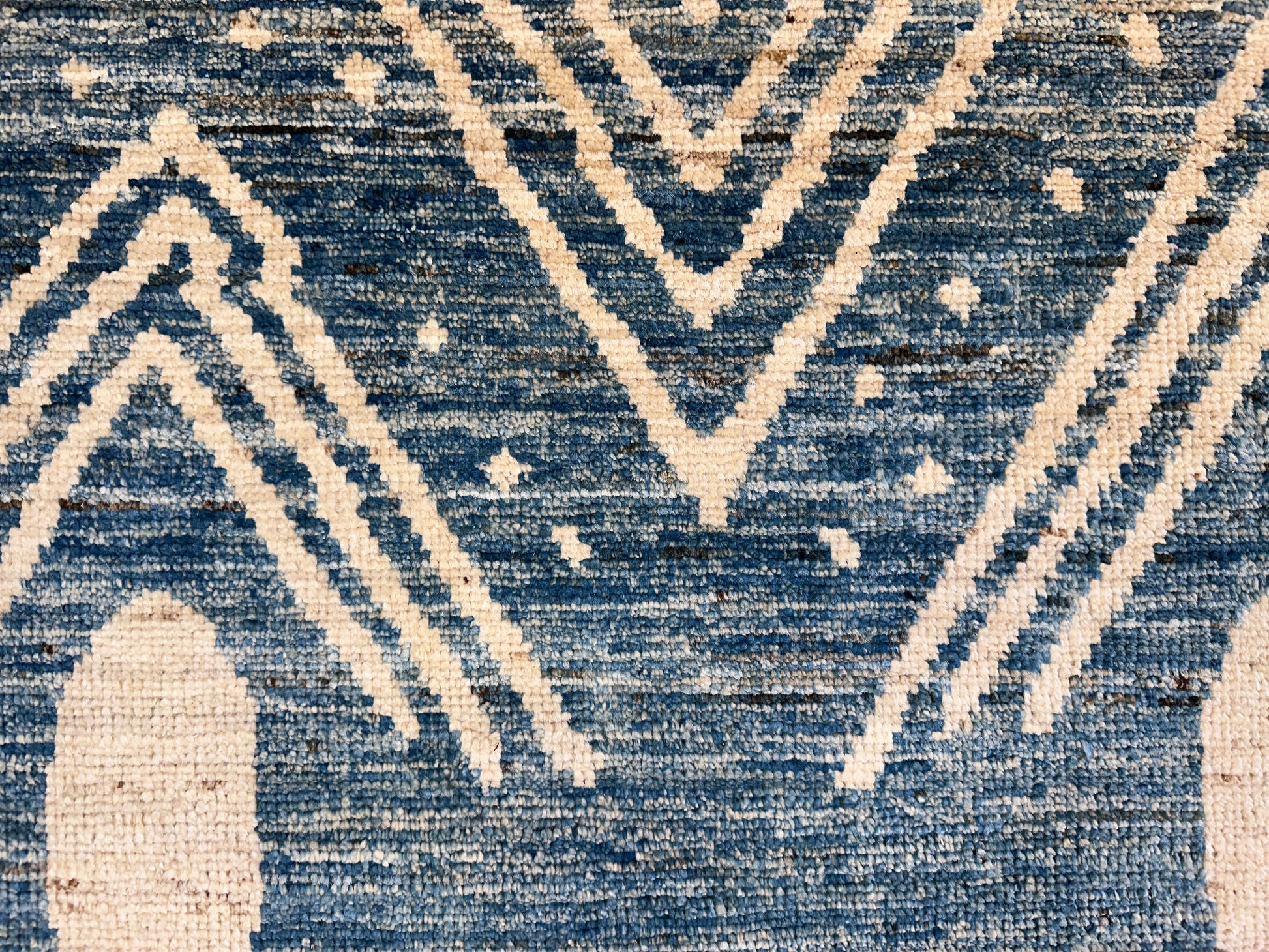 A vivid blue field hosts a rhythmic arrangement of hand-drawn diamond motifs, each layered in tapering lines that create an almost arrow-like effect. The warm cream details soften the bold geometry, giving this handmade rug a contemporary tribal flair that feels grounded yet full of movement. Its artistic repetition and textural variation lend a dynamic energy to clean, modern spaces.