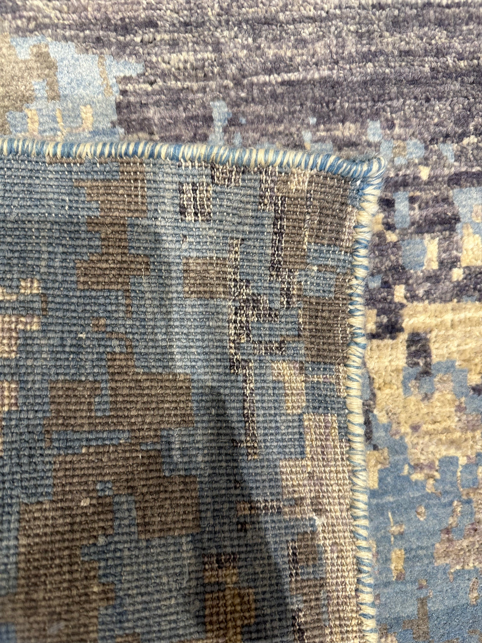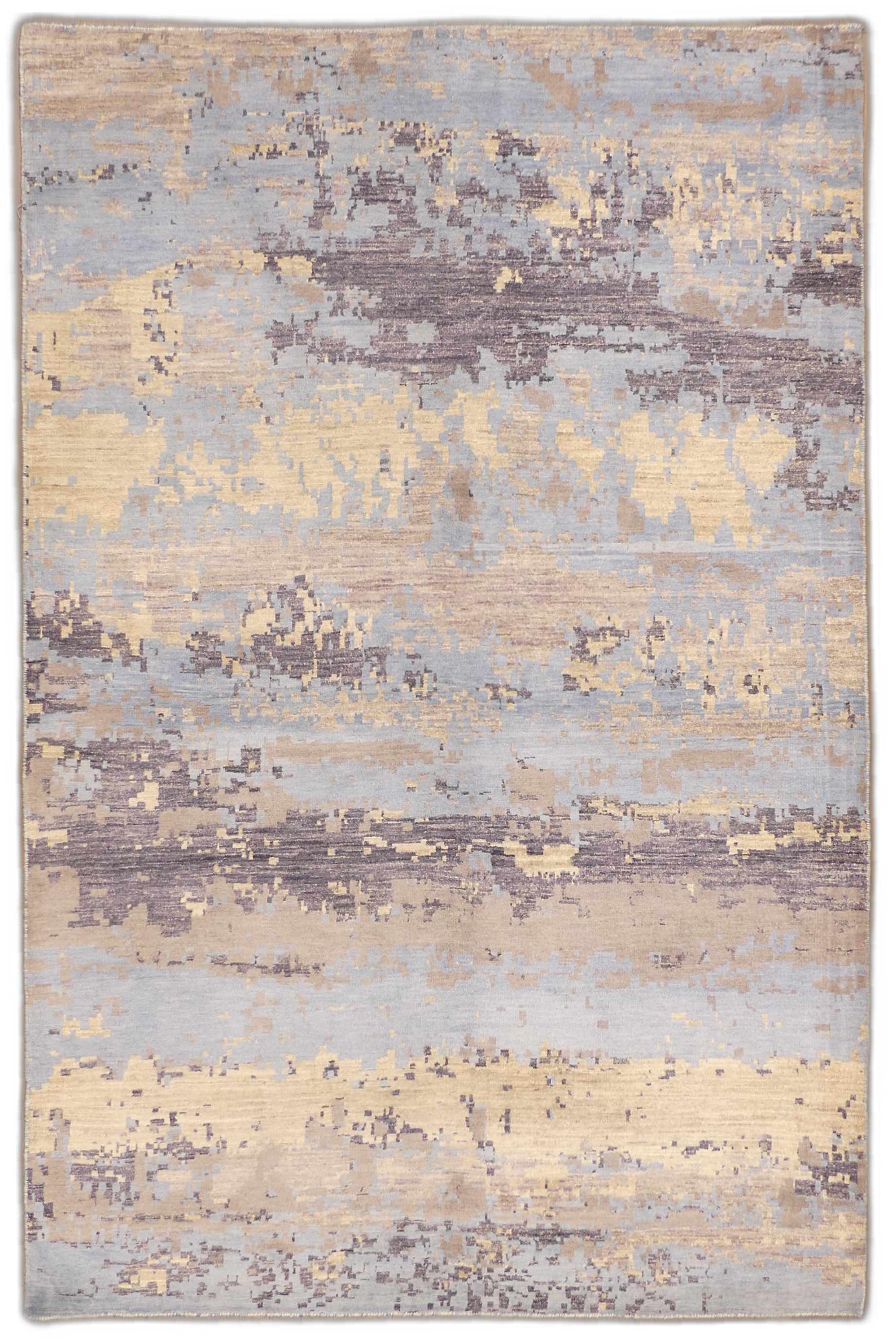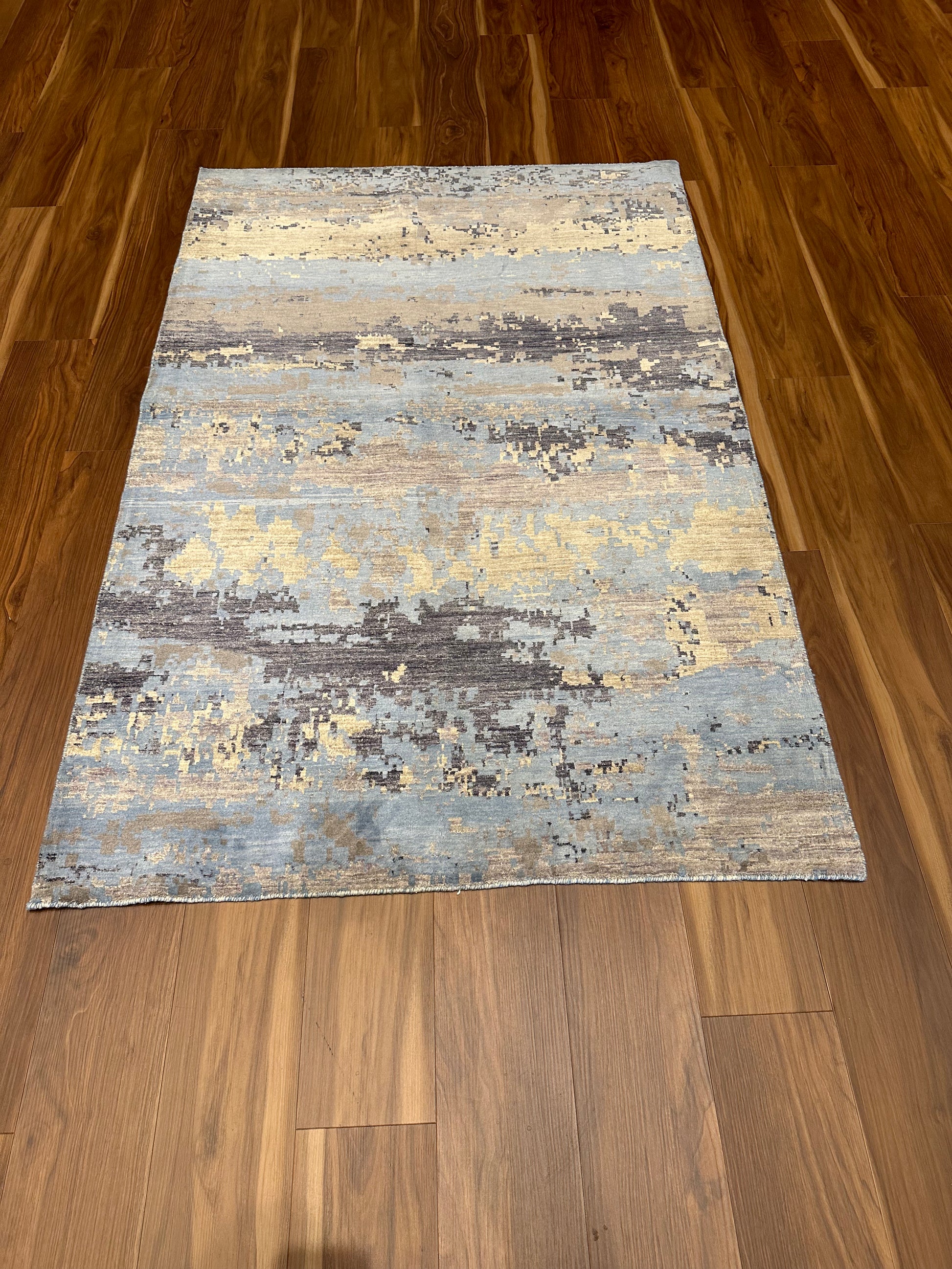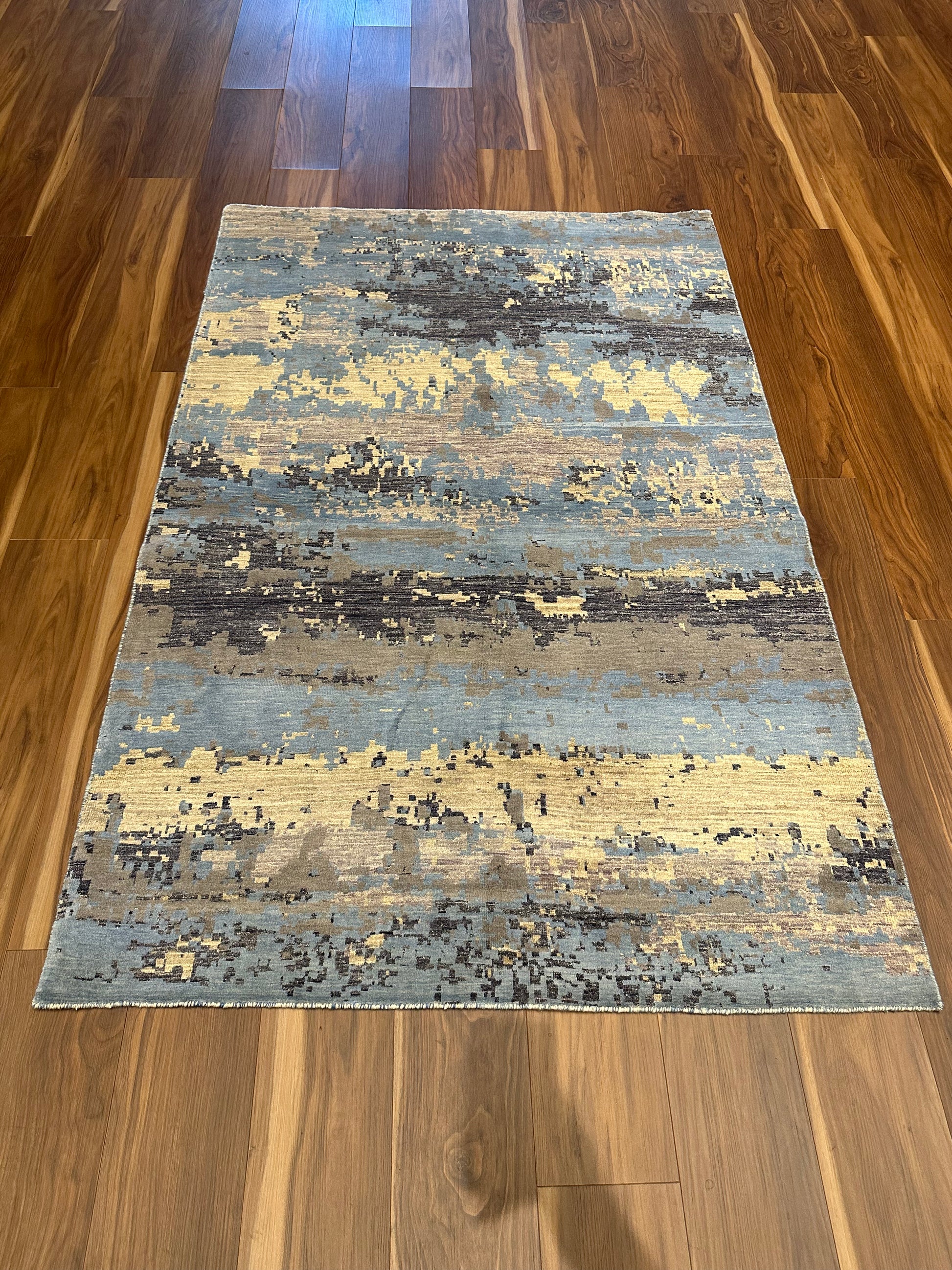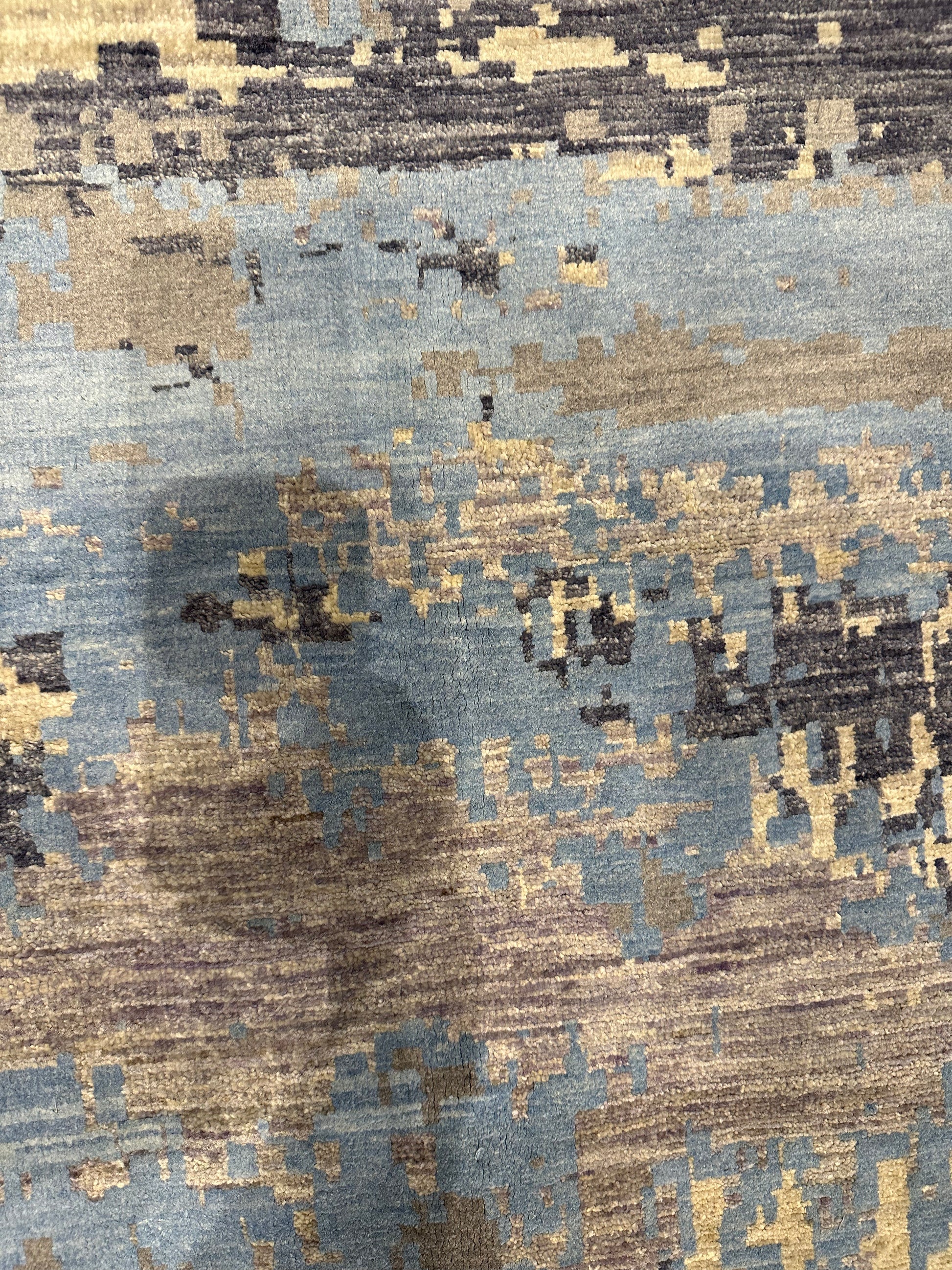 This exquisite modern rug showcases a sophisticated abstract pattern with a harmonious blend of beige, blue, and brown hues. Crafted from a luxurious mix of wool and silk, it offers a plush texture and a subtle sheen that exudes elegance. The contemporary design creates a sense of movement and depth, making it a stunning centerpiece for any modern living space.