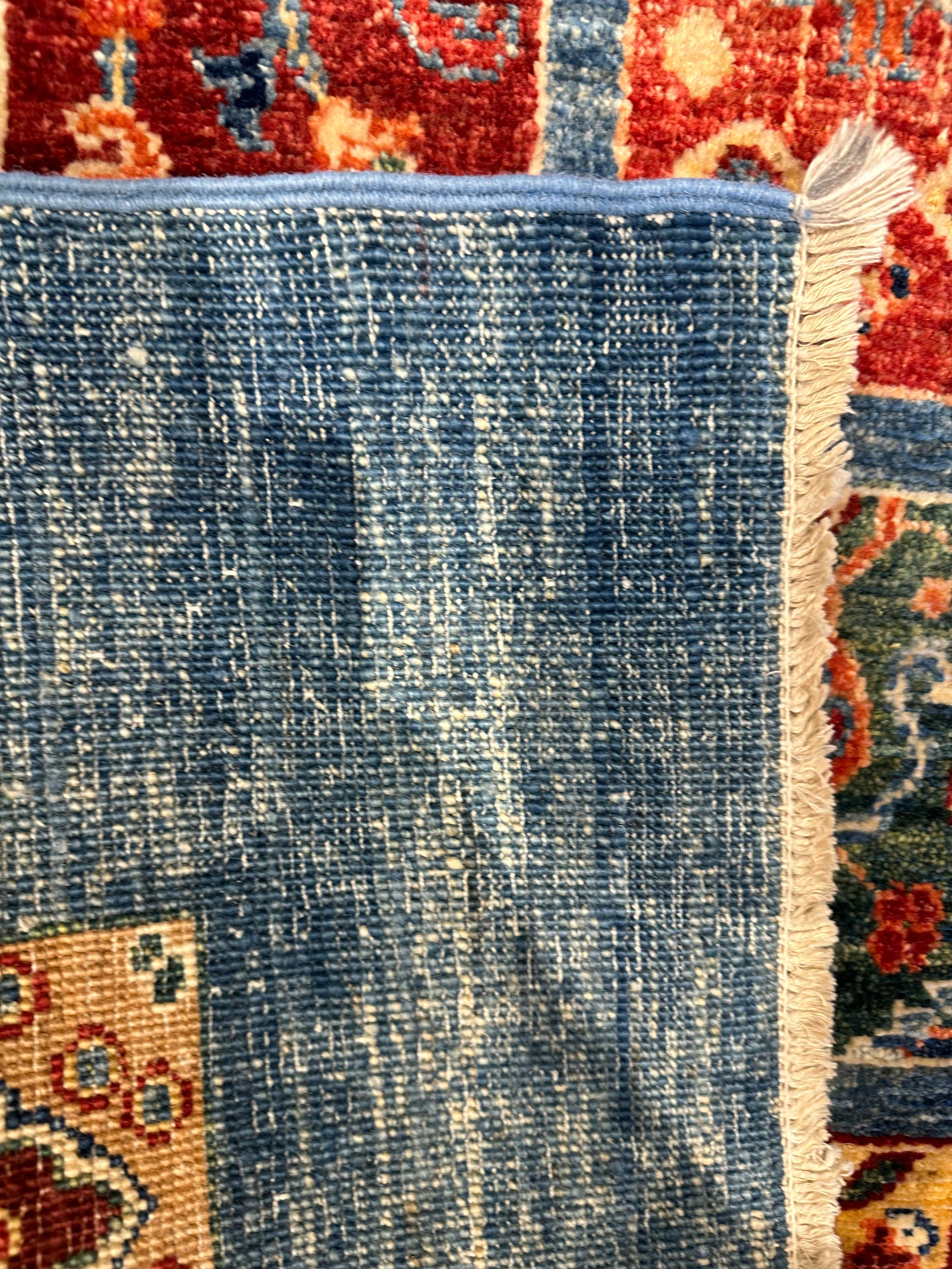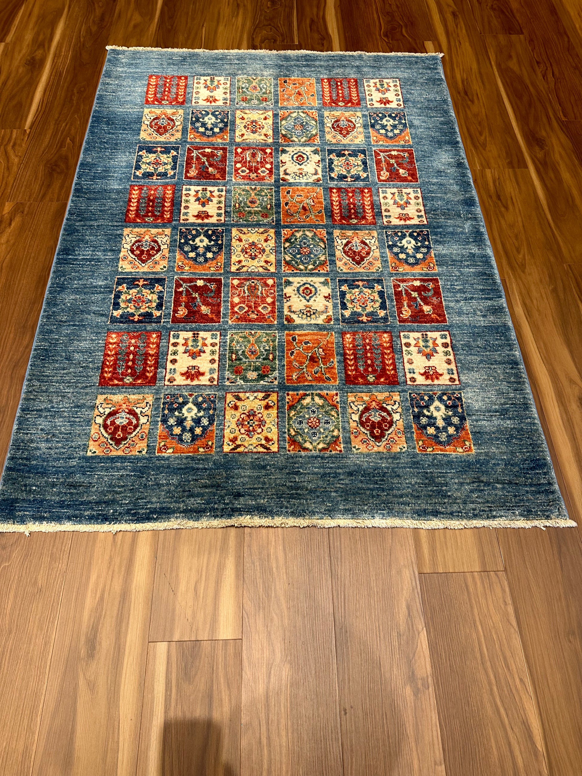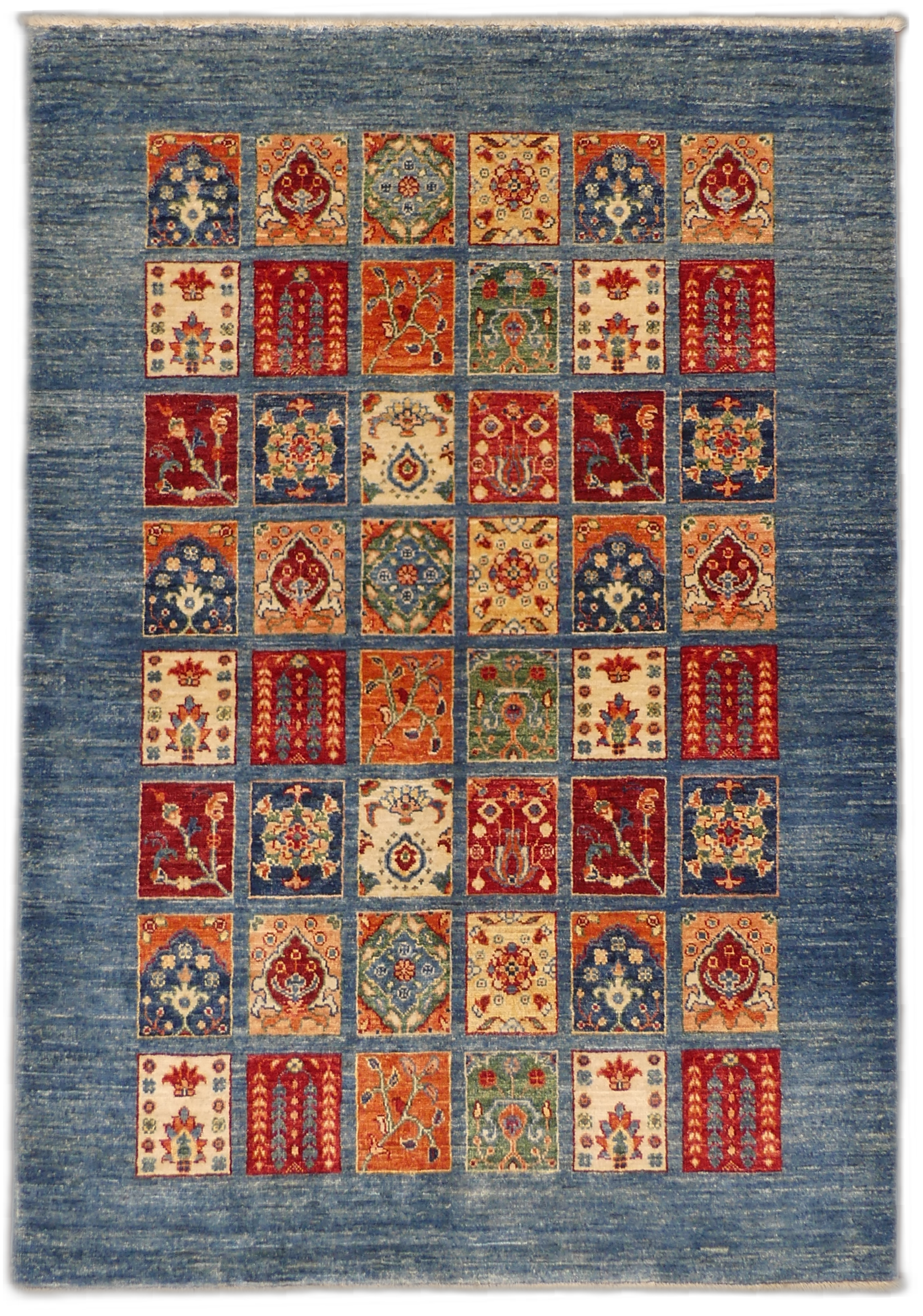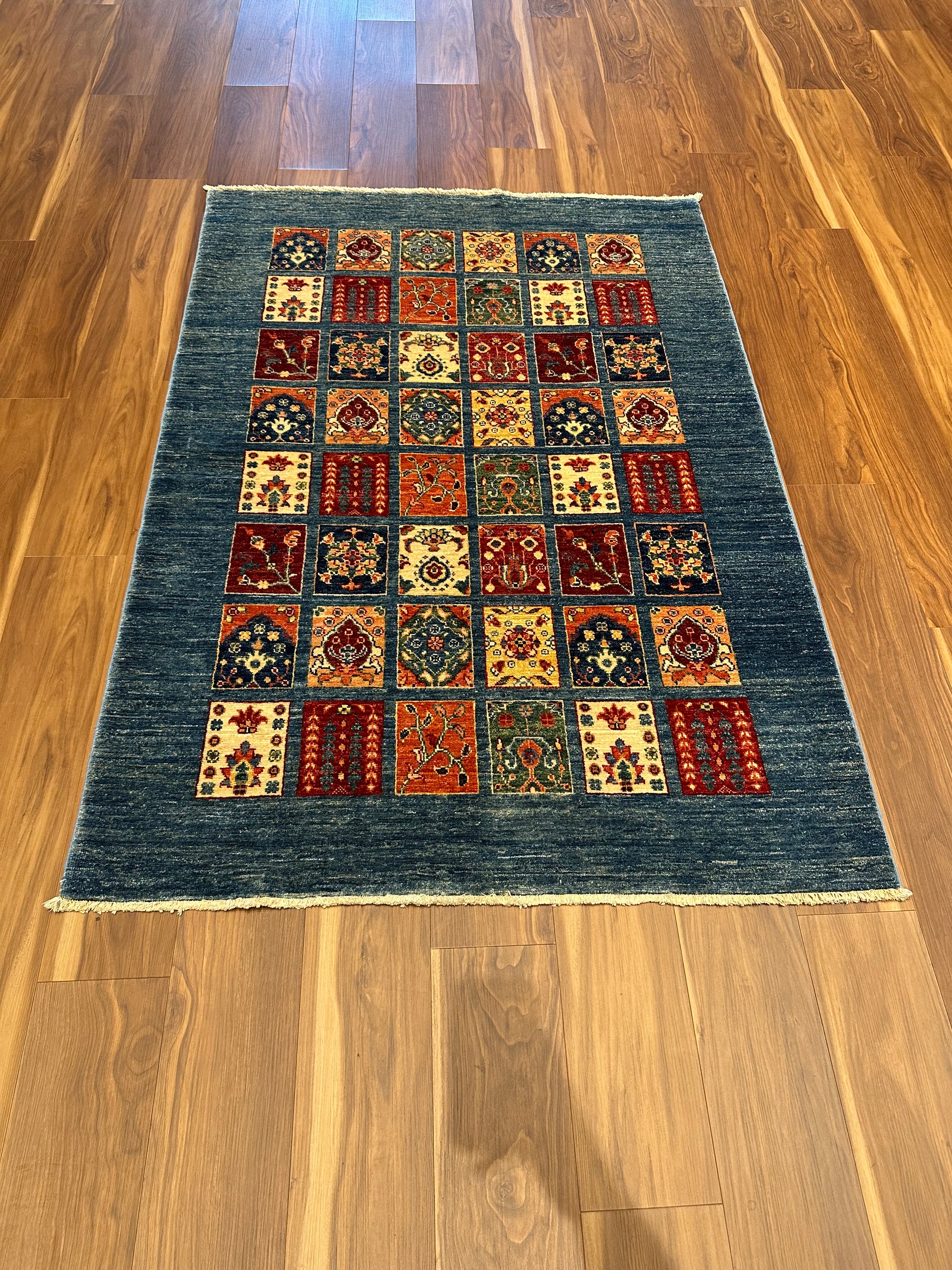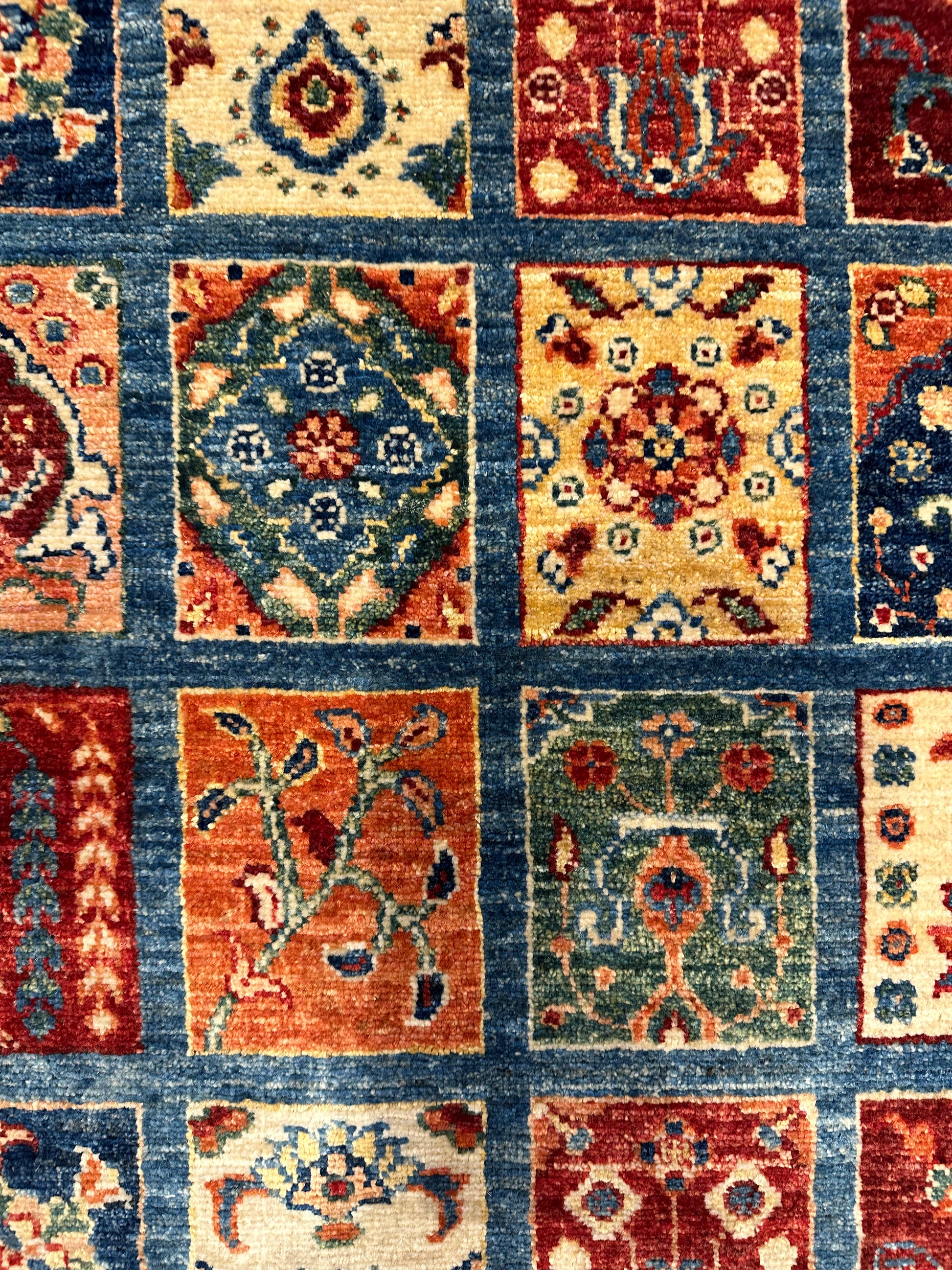 This exquisite Bakhtiari rug features a traditional garden design, composed of rectangular panels each with unique floral motifs, symbolizing the Persian love for gardens and nature. The vibrant hues of red, orange, green, and the dominant deep blue background provide a warm and inviting feel. Crafted from high-quality wool, this rug offers both durability and comfort, making it an ideal accent for any space seeking to add a touch of timeless elegance.
