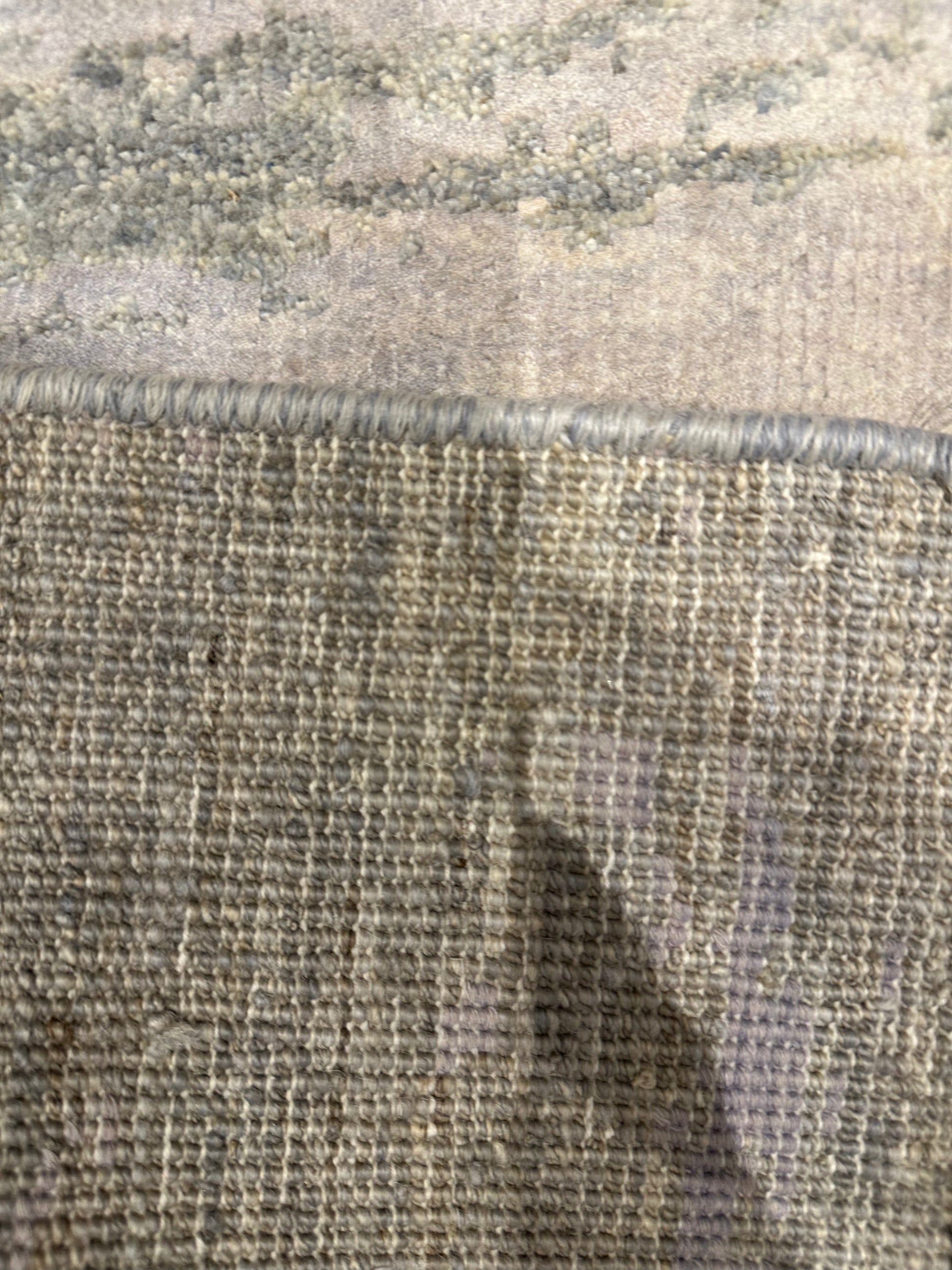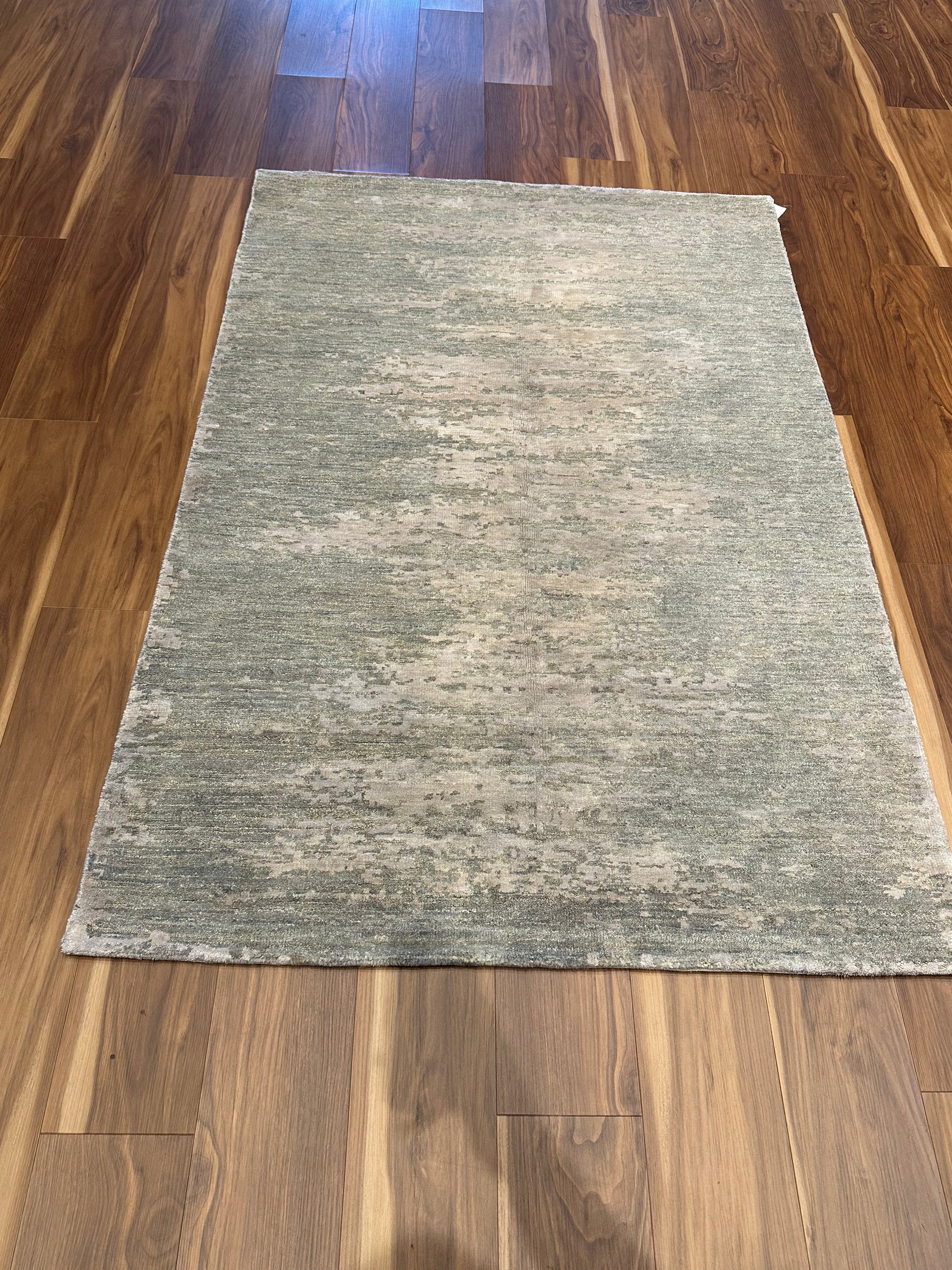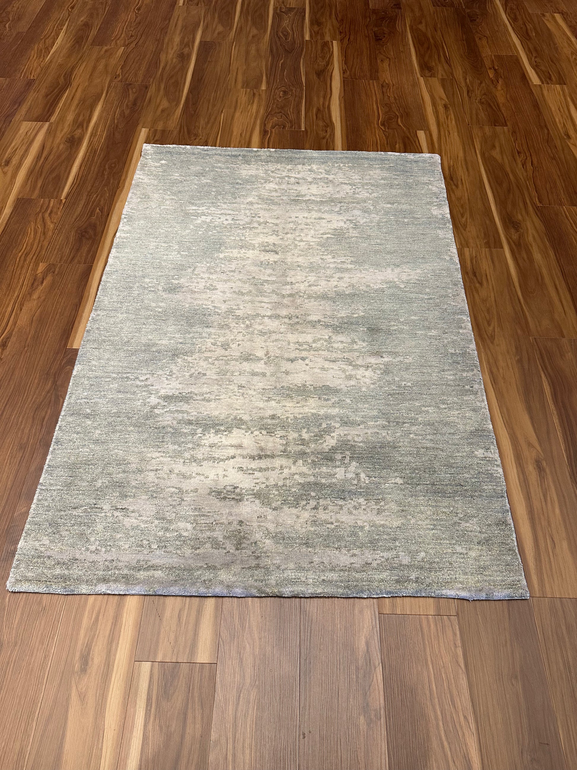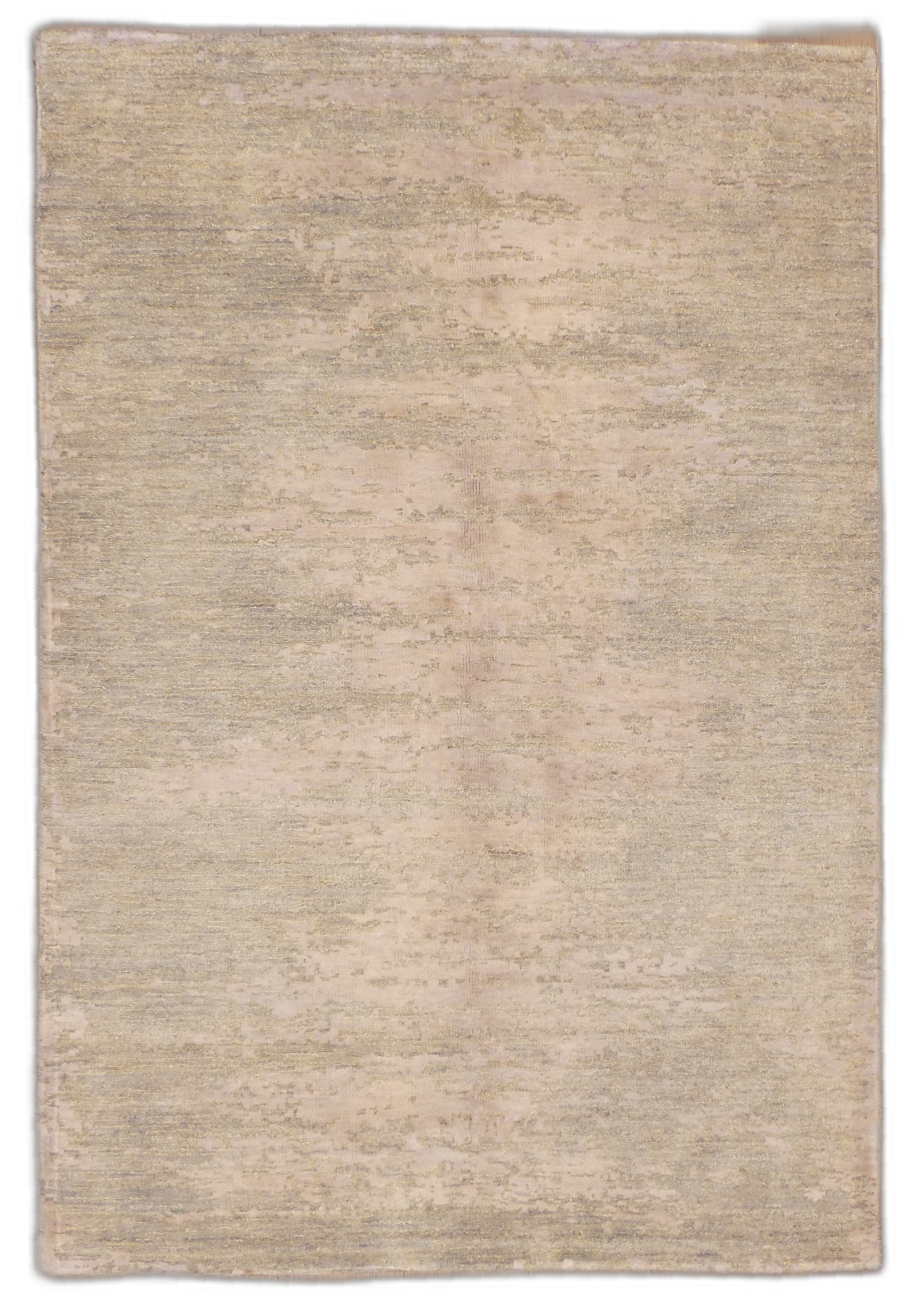 This elegant Modern wool and silk rug showcases a sophisticated, minimalist aesthetic perfect for contemporary interiors. The subtle blend of beige, ivory, and taupe hues creates a tranquil foundation that complements a range of color schemes. Luxuriously soft to the touch, it features a luminous sheen and a refined texture that reflects its high-quality materials. Its understated abstract design offers a versatile appeal that can anchor living spaces or private retreats, bringing a serene, modern elegance to any room.