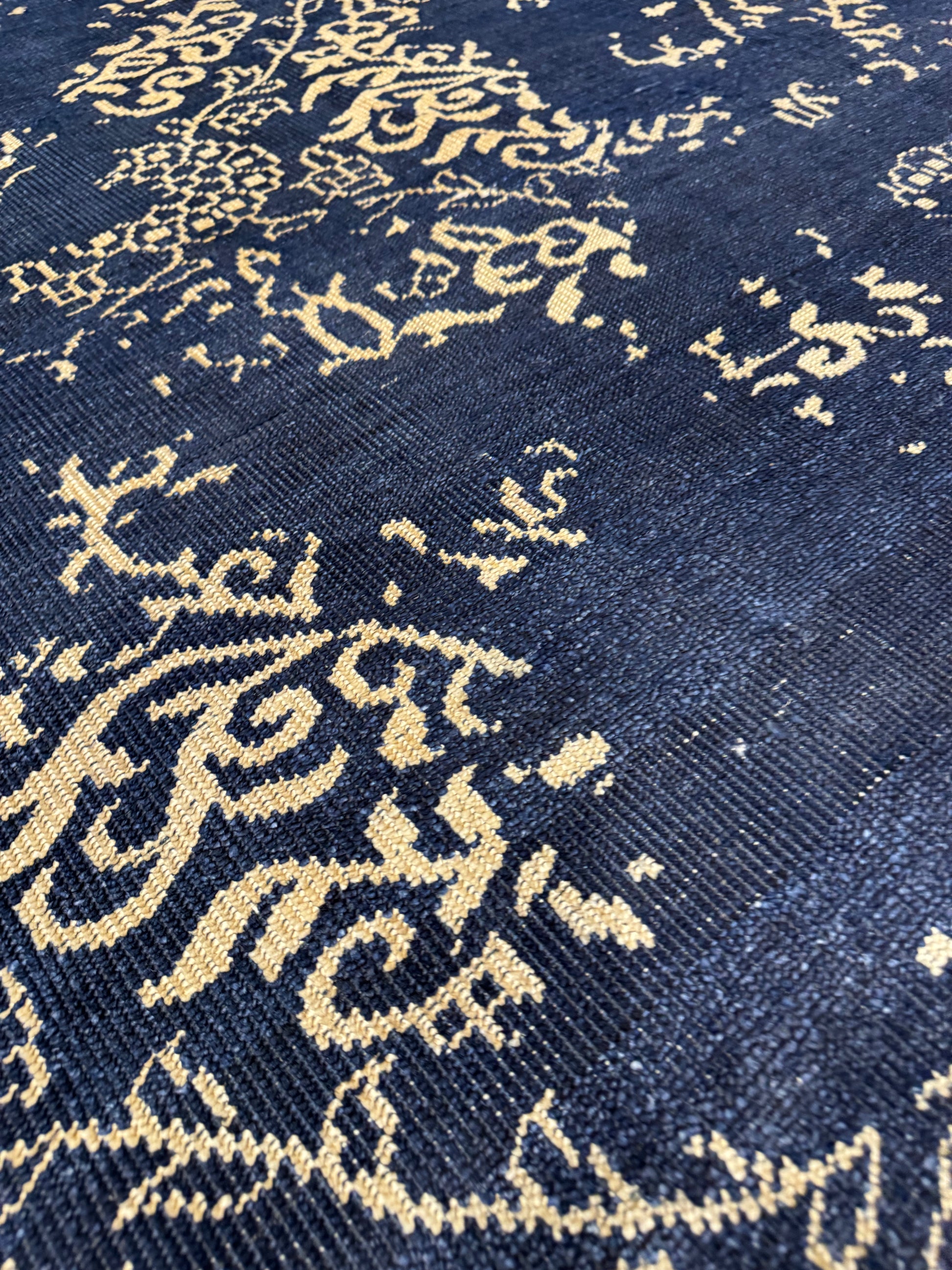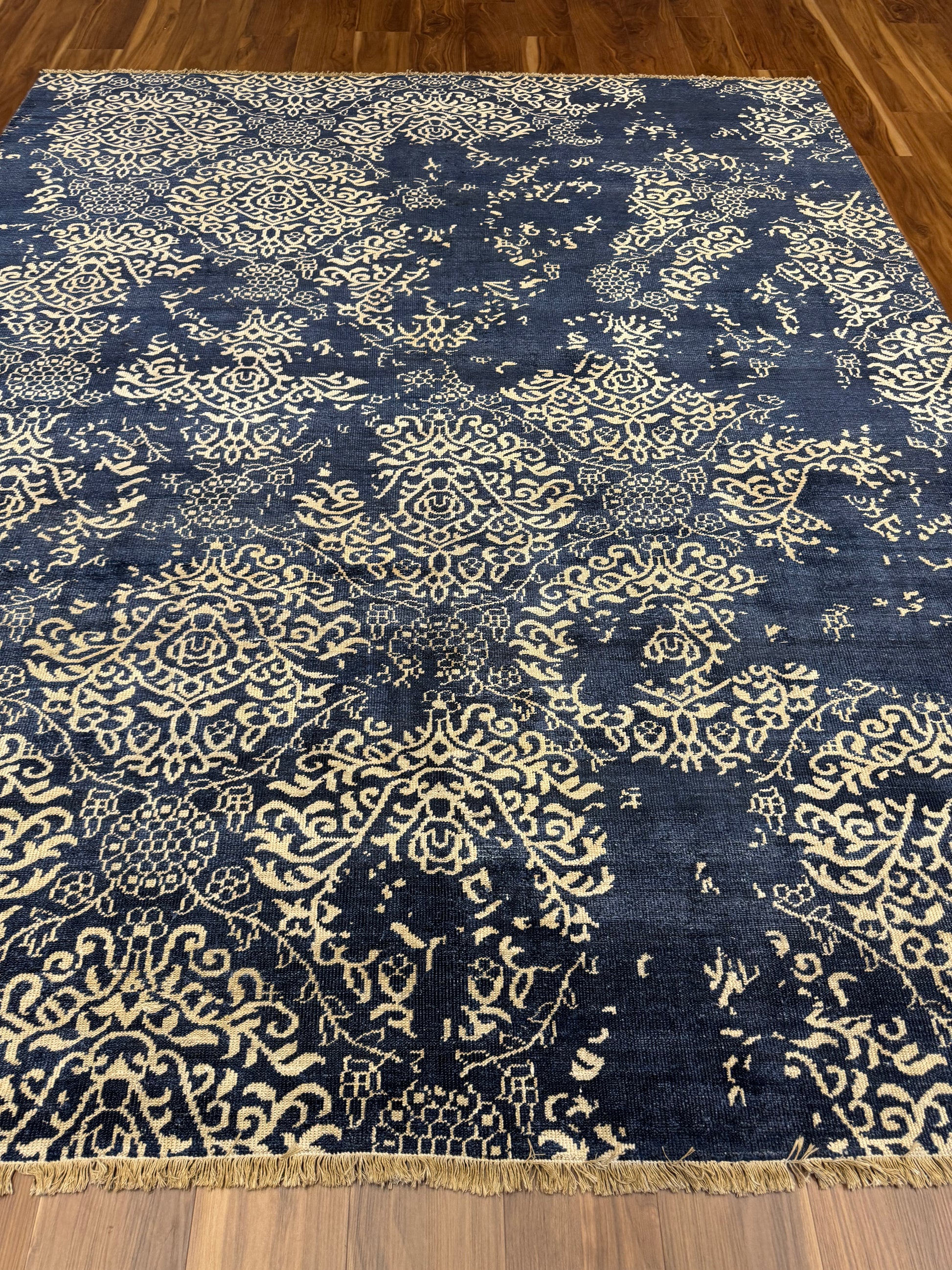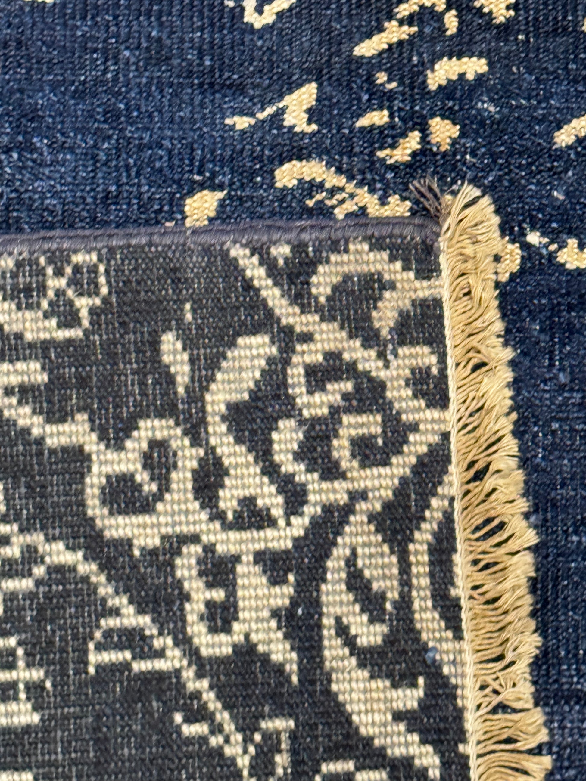 This exquisite Modern Pattern rug is a pinnacle of contemporary design paired with luxurious refinement. Crafted from the finest silk, it showcases an intricate pattern in rich navy blue and gold hues, giving it an opulent yet modern aesthetic. The rug's sheen and smooth texture reflect its high-quality material, making it a tasteful addition to any modern interior. Perfect for those who seek to blend tradition with a sleek, current look.
