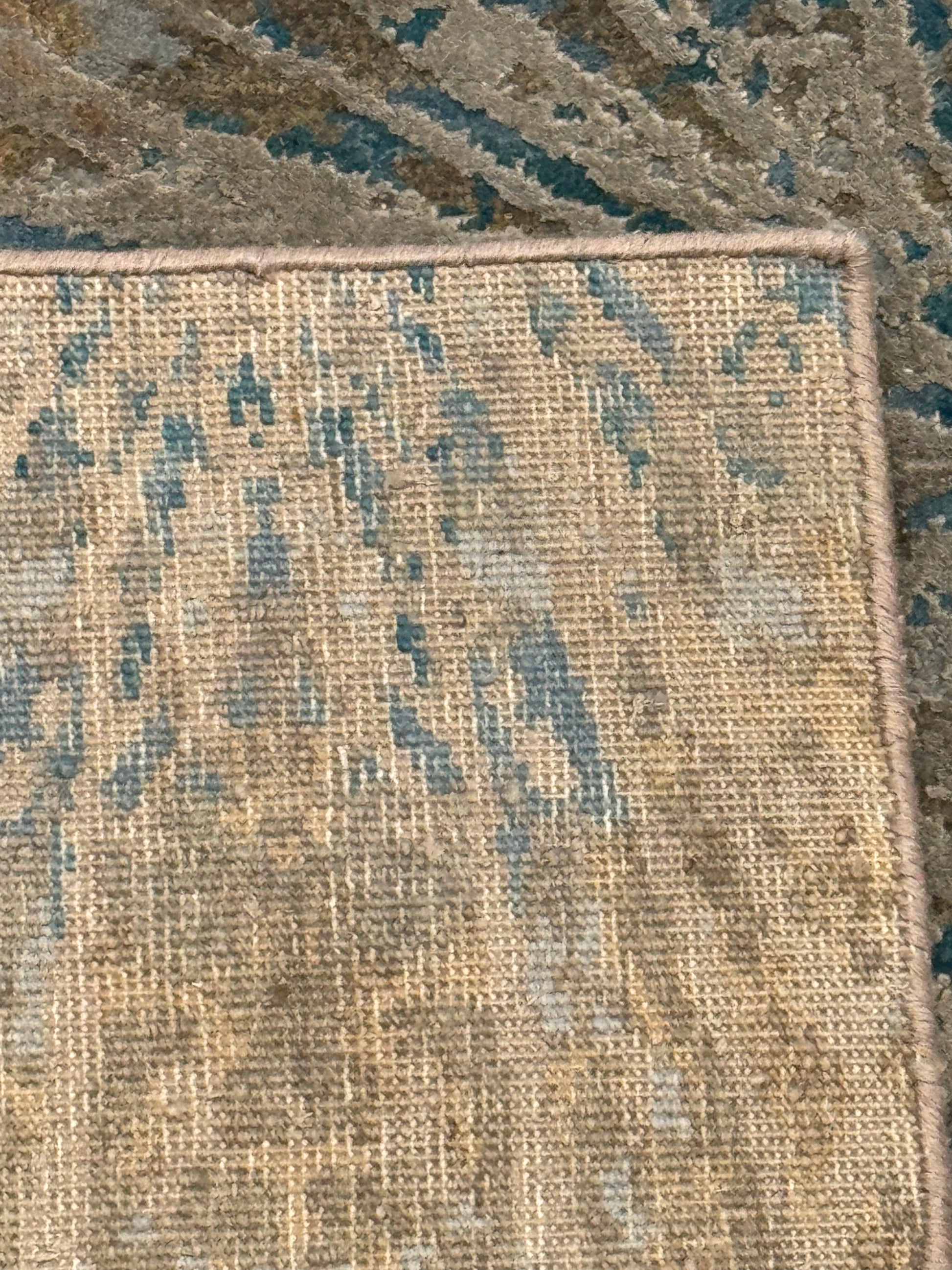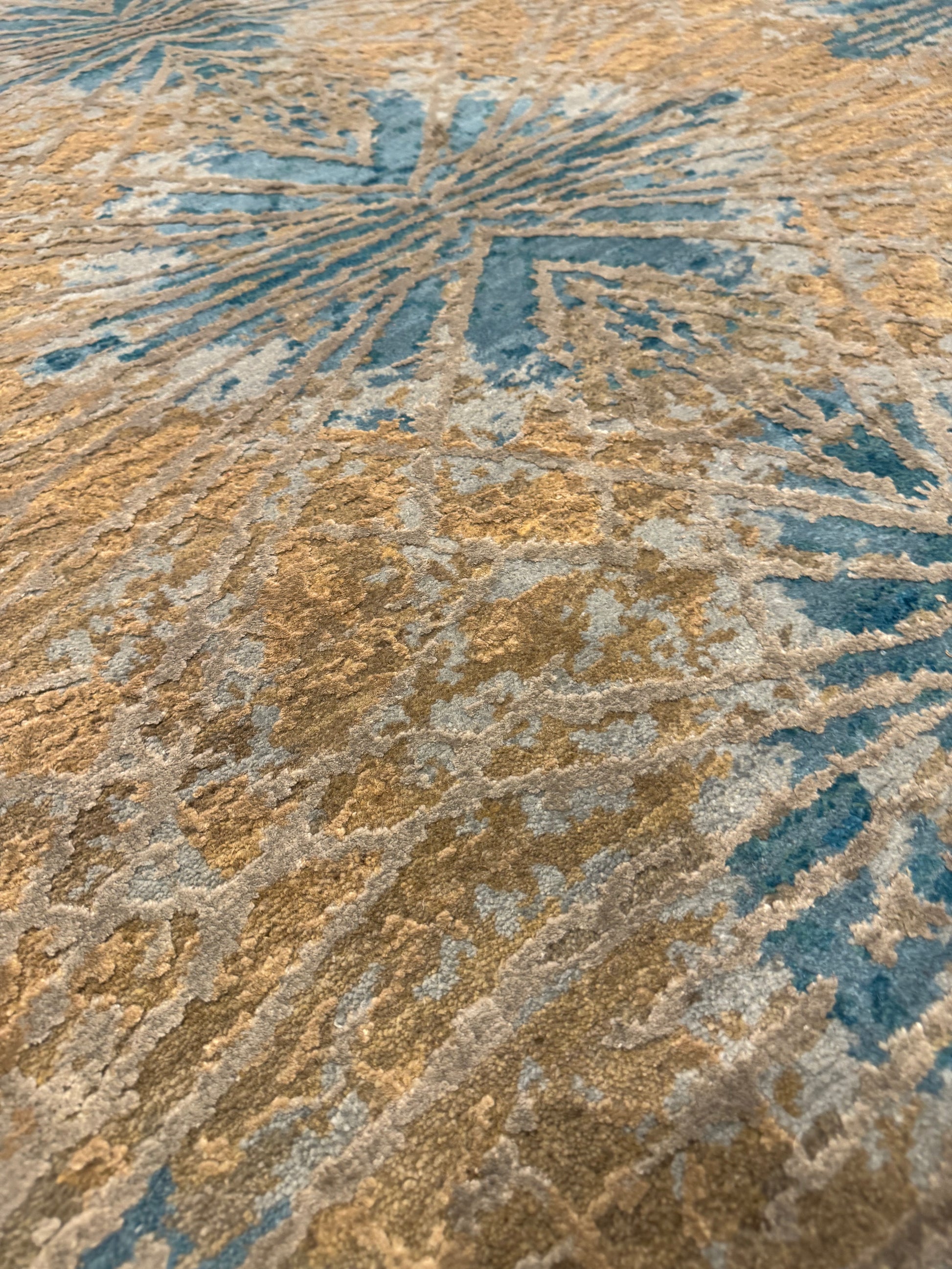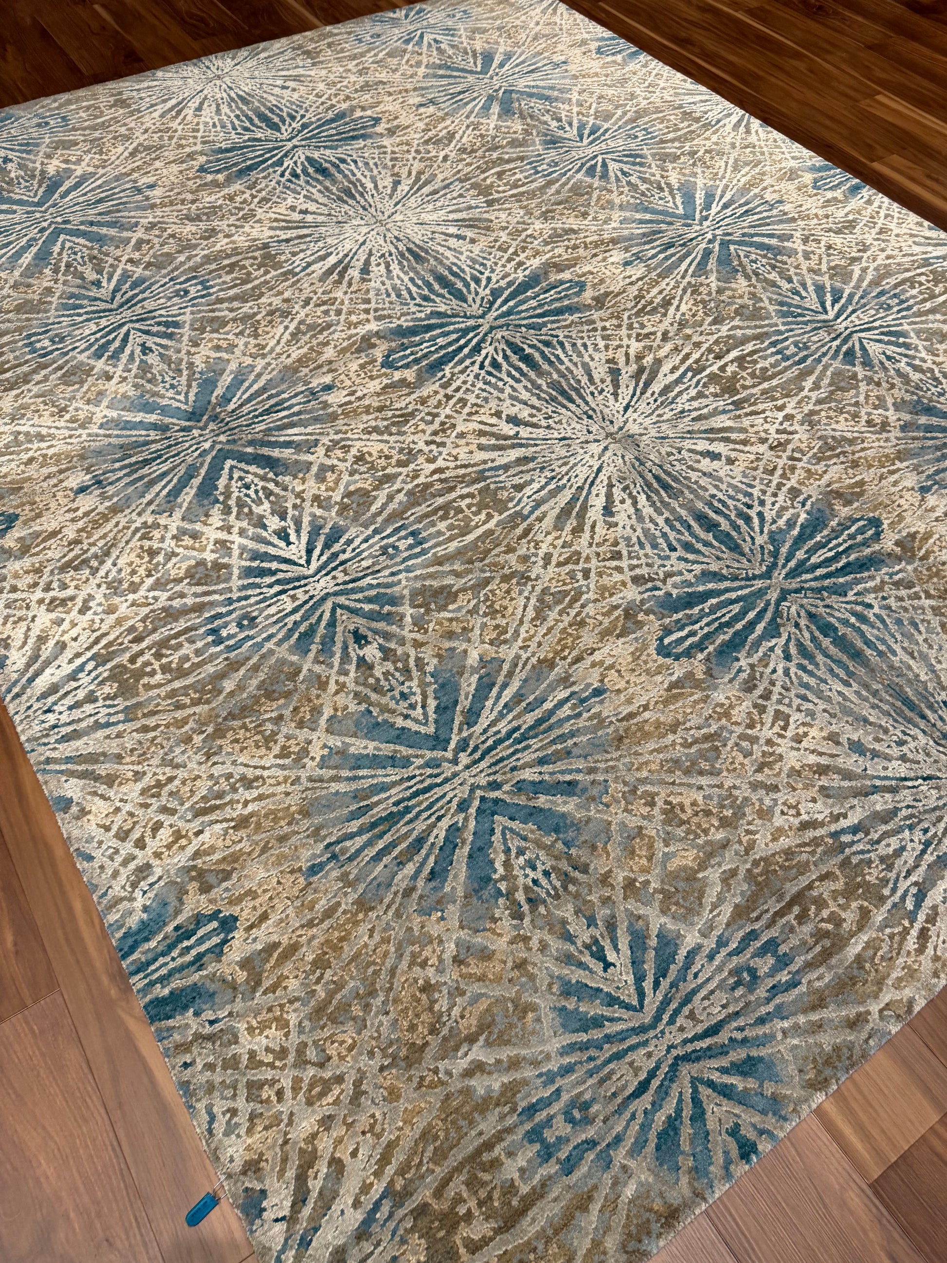 This Modern Pattern rug is an exquisite piece of artistry with a blend of rich caramel and teal hues on a warm beige background. Its contemporary design features an interplay of geometric shapes that evoke a sense of balance and sophistication. Woven from the finest silk, the rug boasts a luxuriously soft texture and a subtle sheen that gently reflects light, highlighting its intricate pattern. Ideal for modern and minimalist interiors, this piece makes a bold statement without overwhelming the space.
