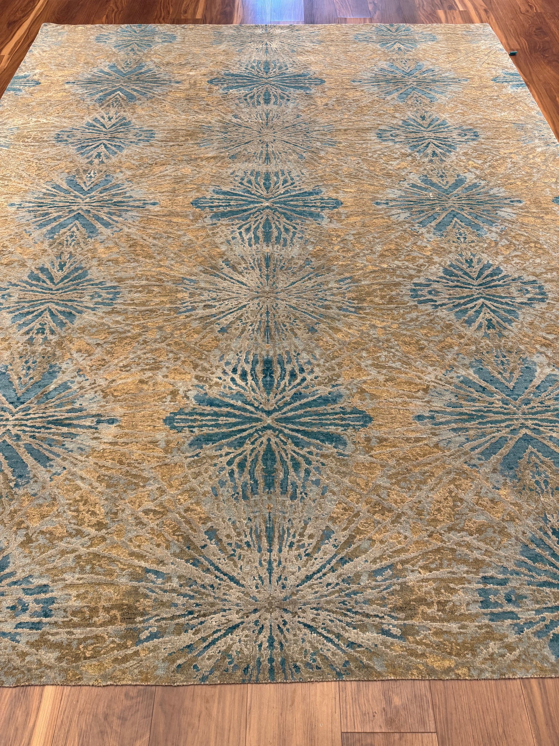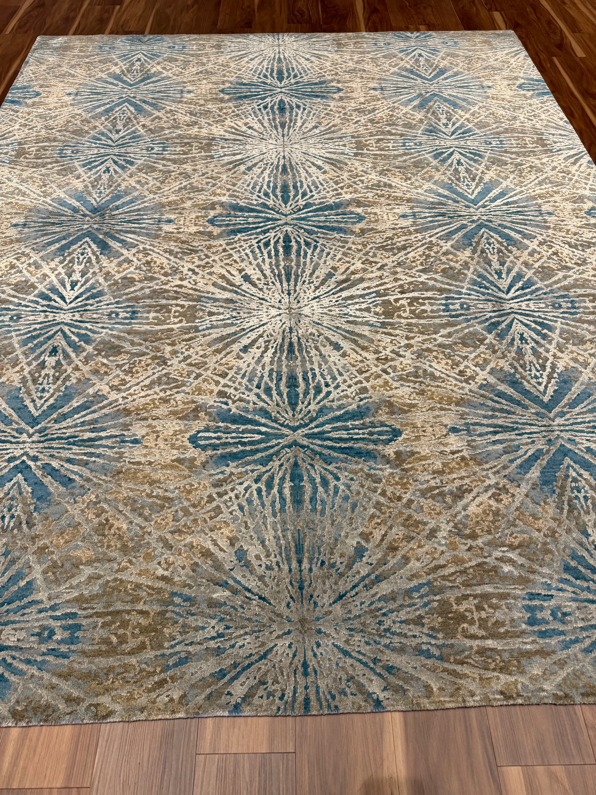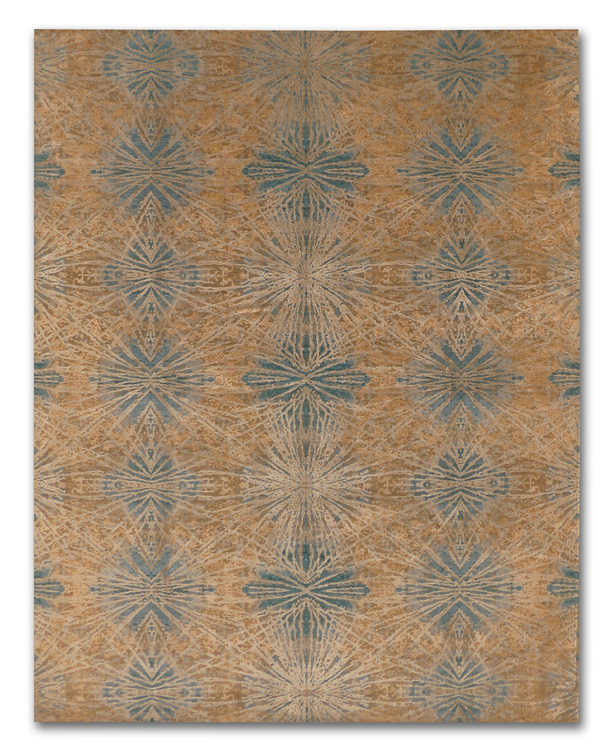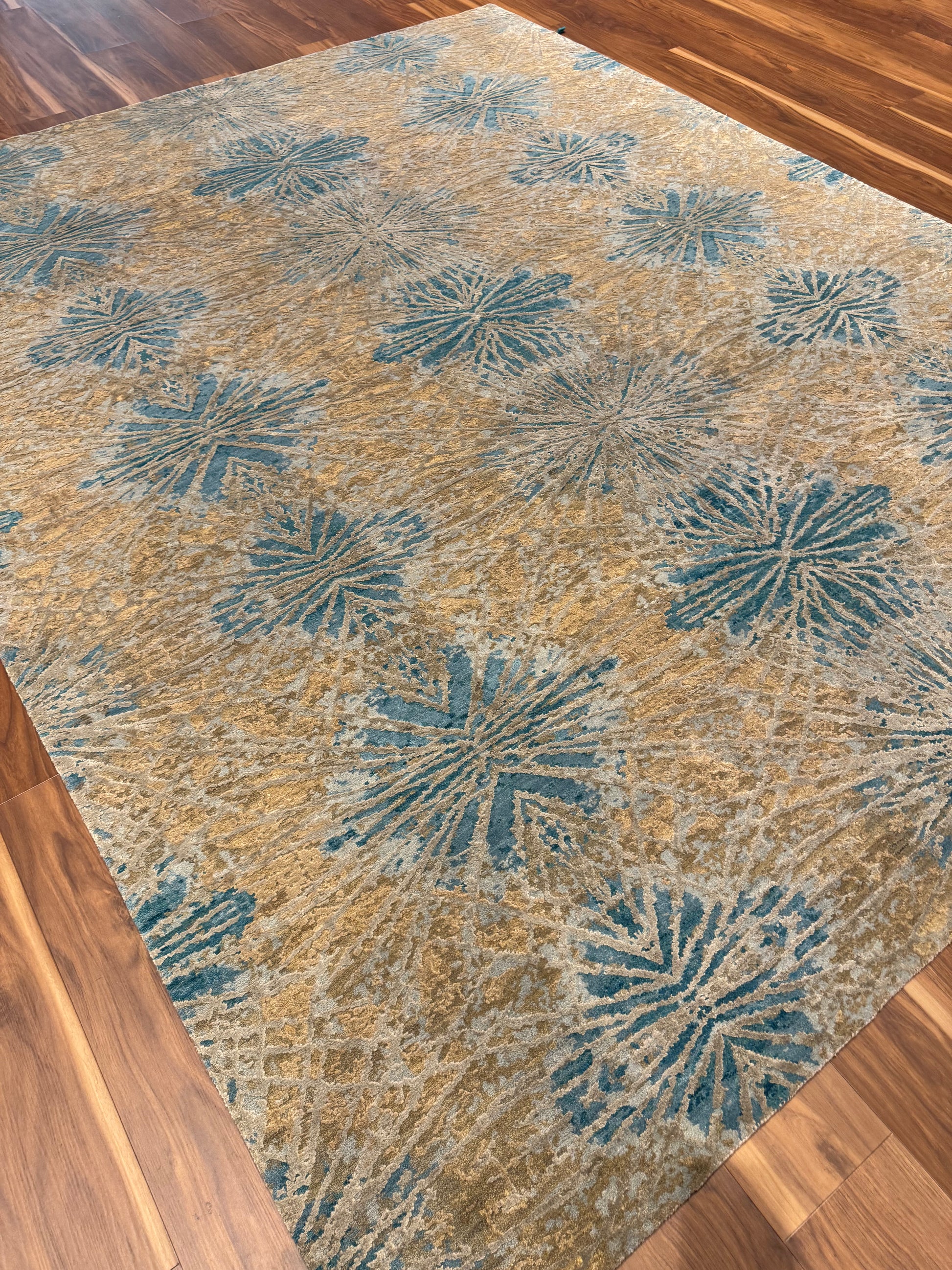 This Modern Pattern rug is an exquisite piece of artistry with a blend of rich caramel and teal hues on a warm beige background. Its contemporary design features an interplay of geometric shapes that evoke a sense of balance and sophistication. Woven from the finest silk, the rug boasts a luxuriously soft texture and a subtle sheen that gently reflects light, highlighting its intricate pattern. Ideal for modern and minimalist interiors, this piece makes a bold statement without overwhelming the space.