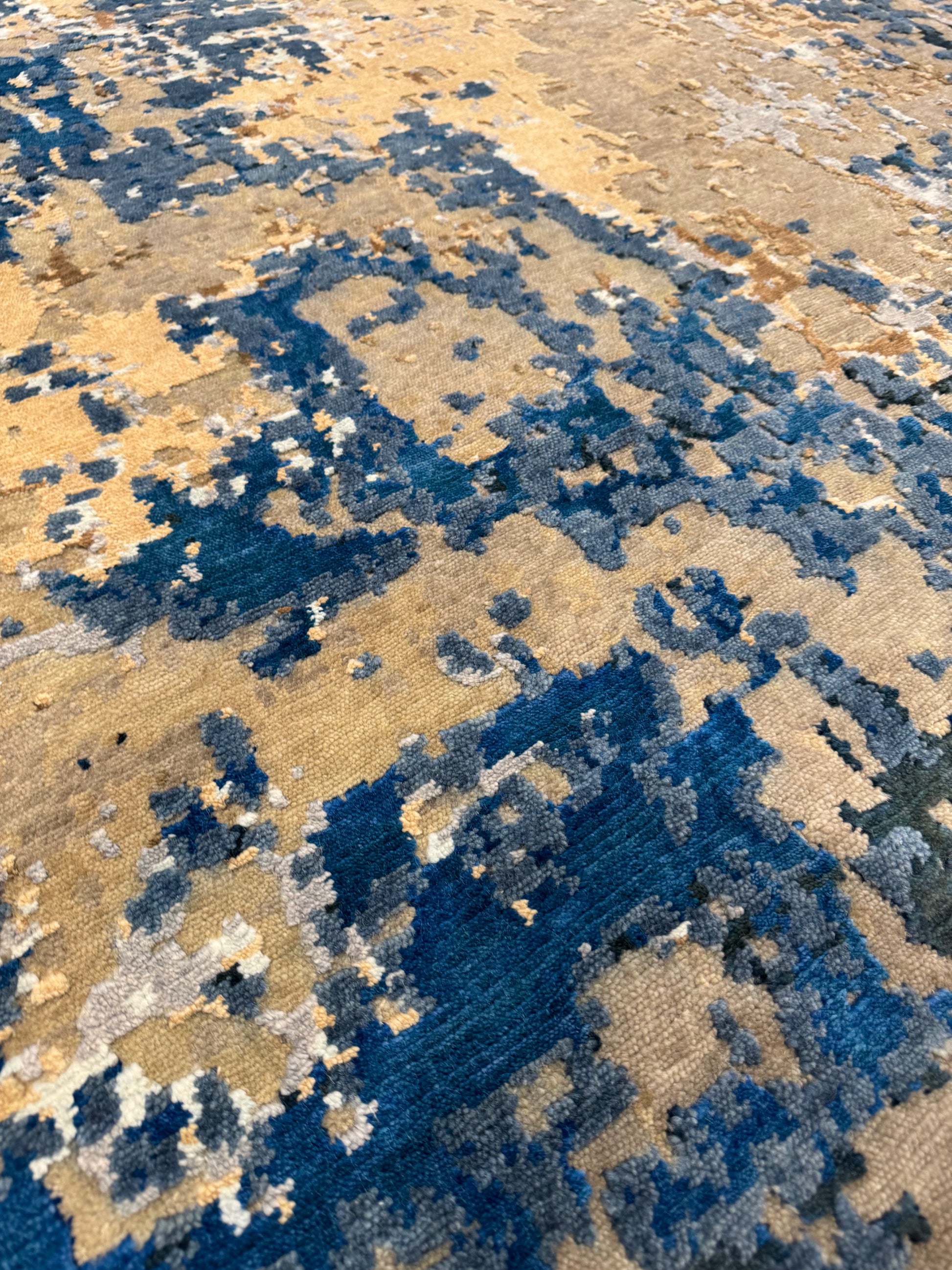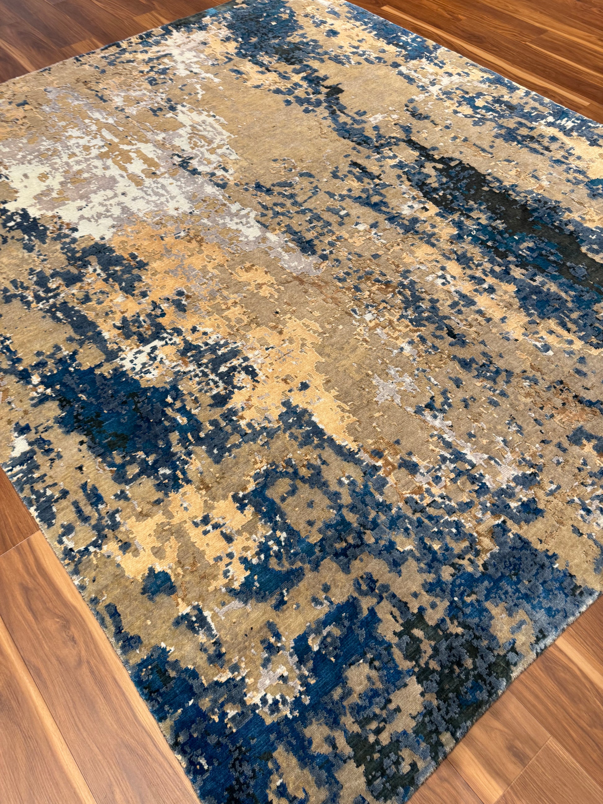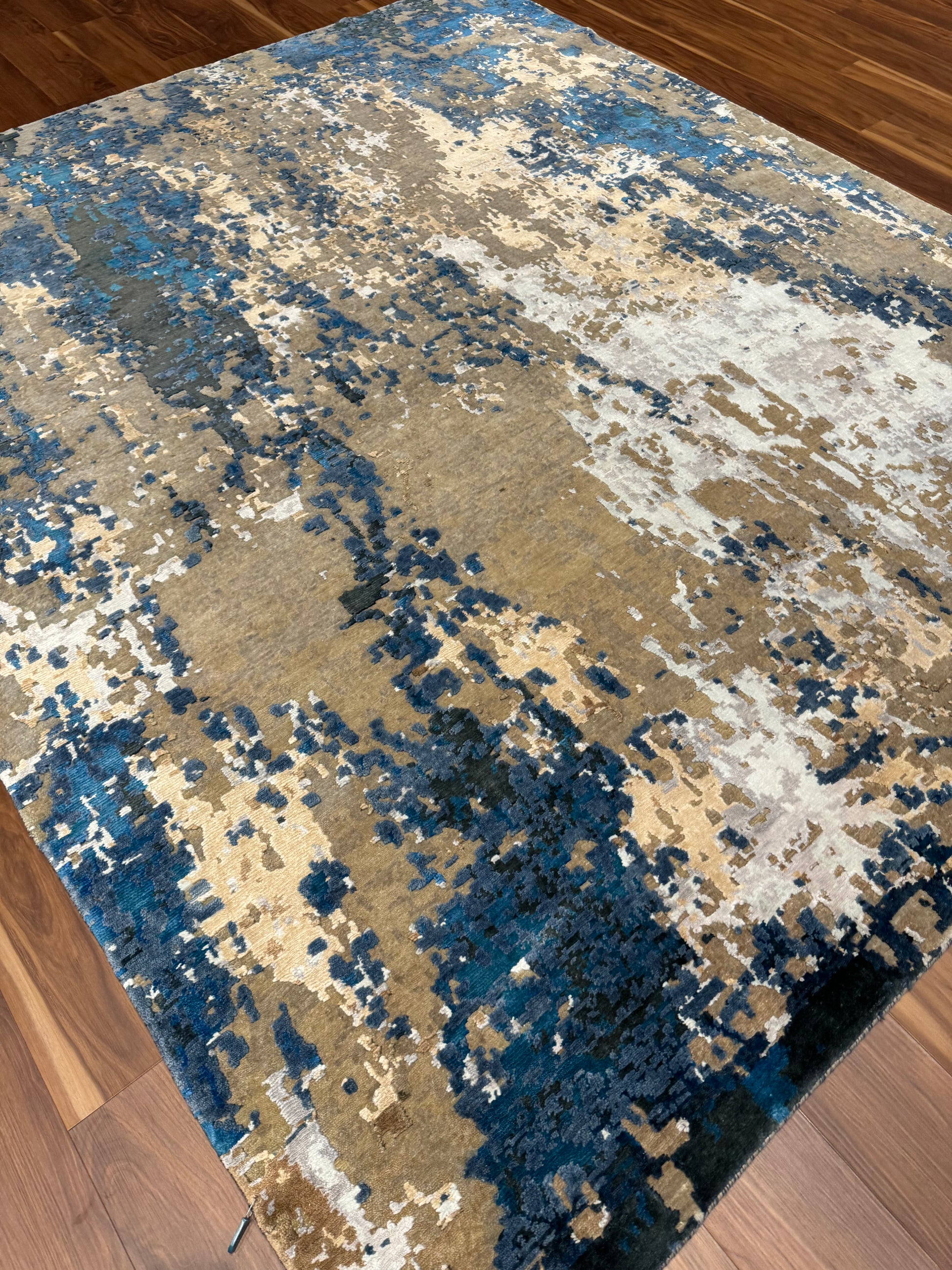 The 'Modern Abstract' rug is a stunning piece that embodies sophistication and contemporary elegance. Featuring an abstract pattern, this rug showcases a mesmerizing blend of blue, gold, and beige hues that evoke a sense of dynamic movement and artistic flair. Expertly crafted from high-quality wool and silk, the rug offers both luxurious softness and exquisite sheen, making it an ideal statement piece for any modern living space.