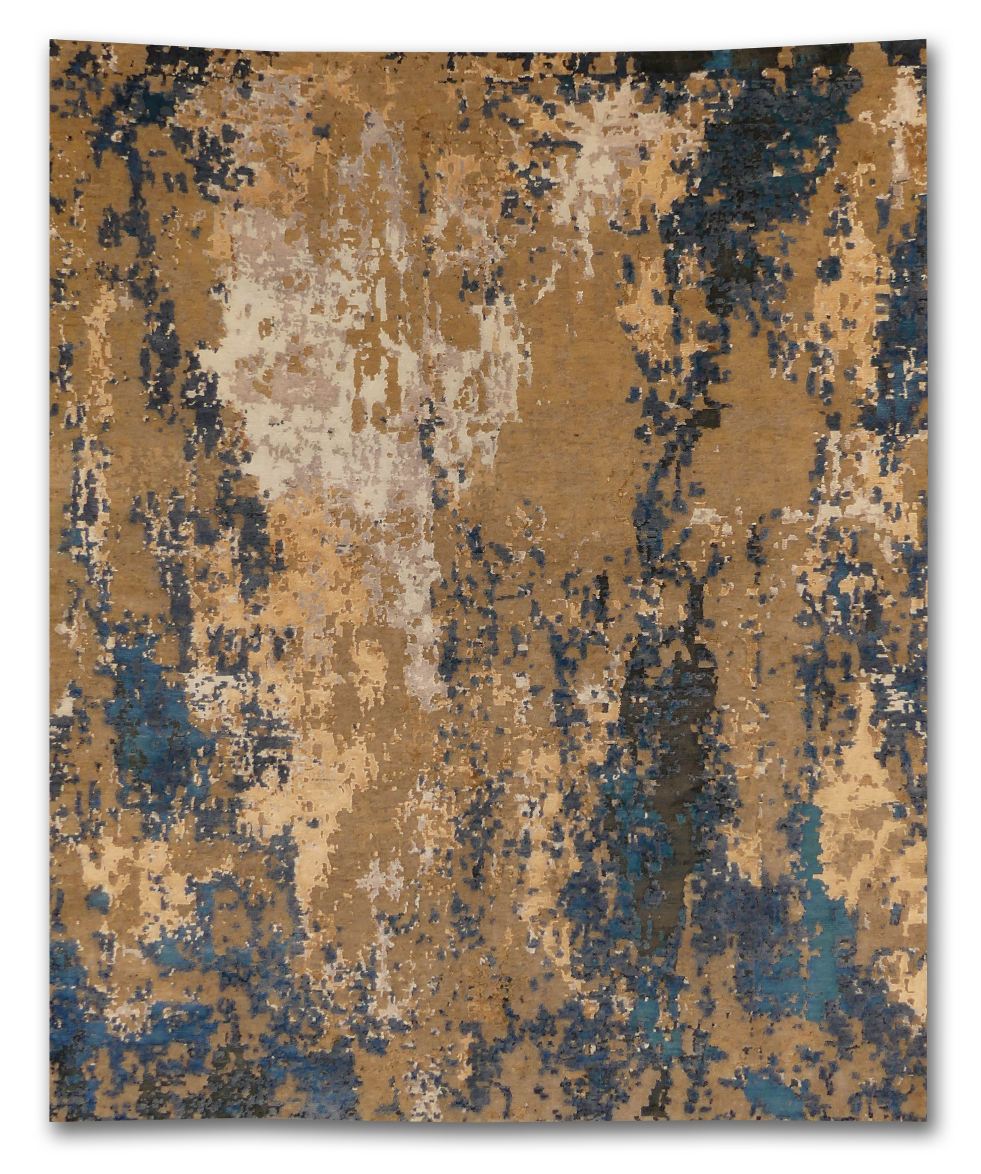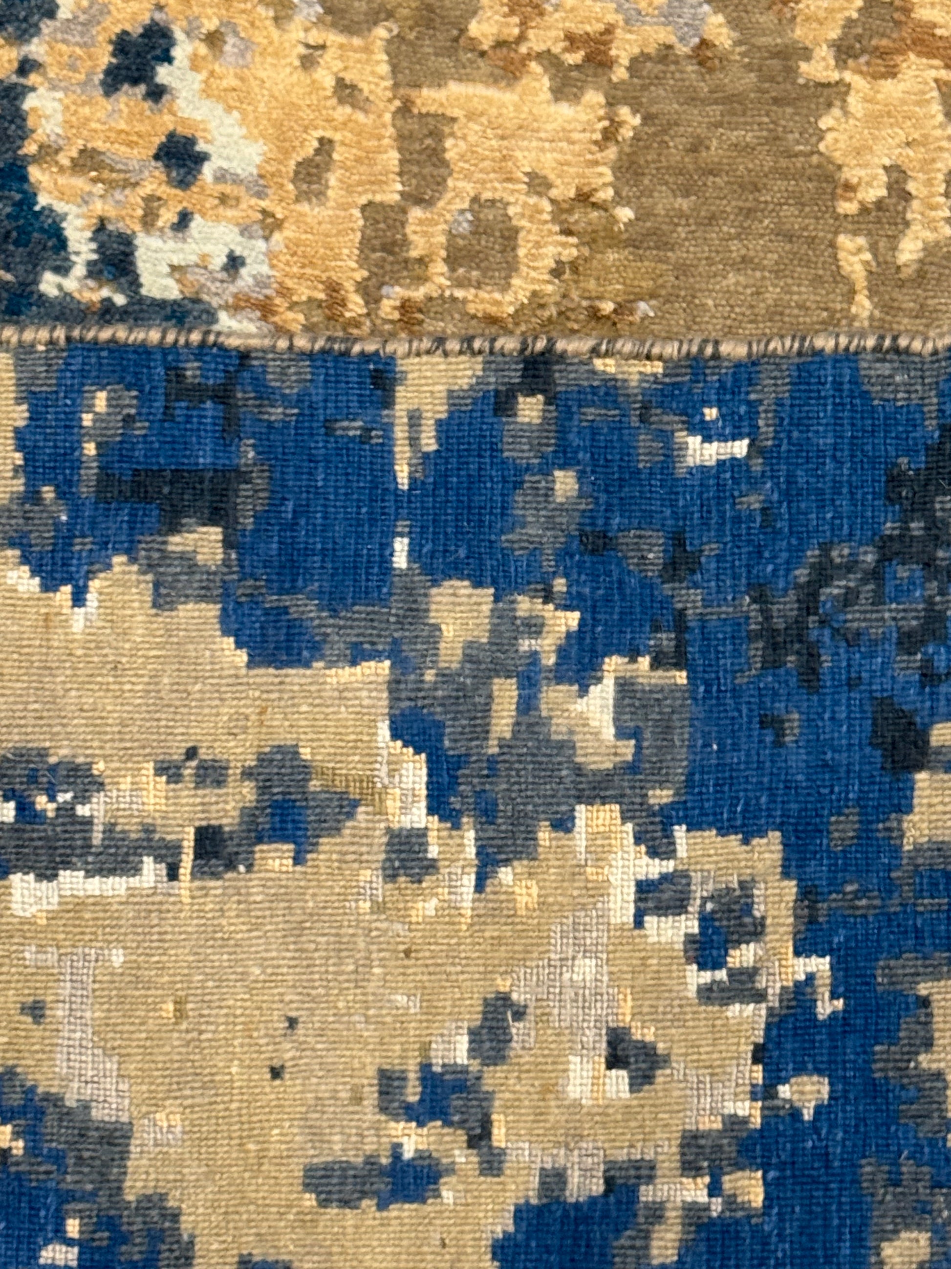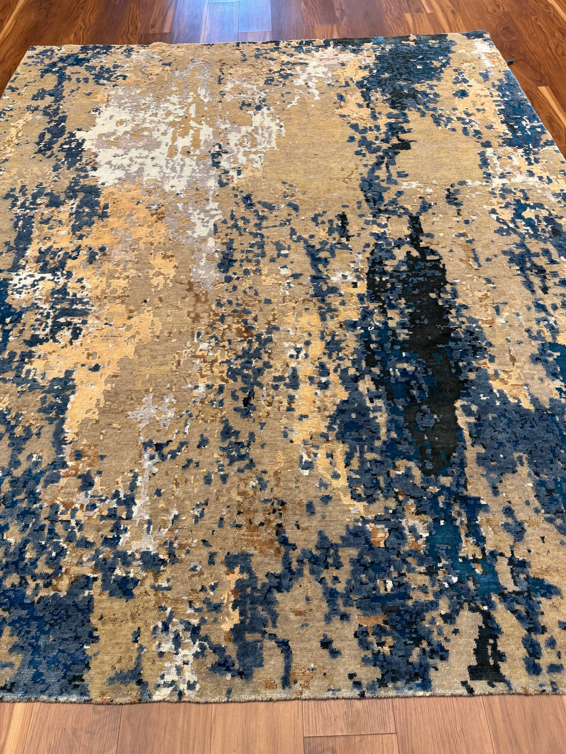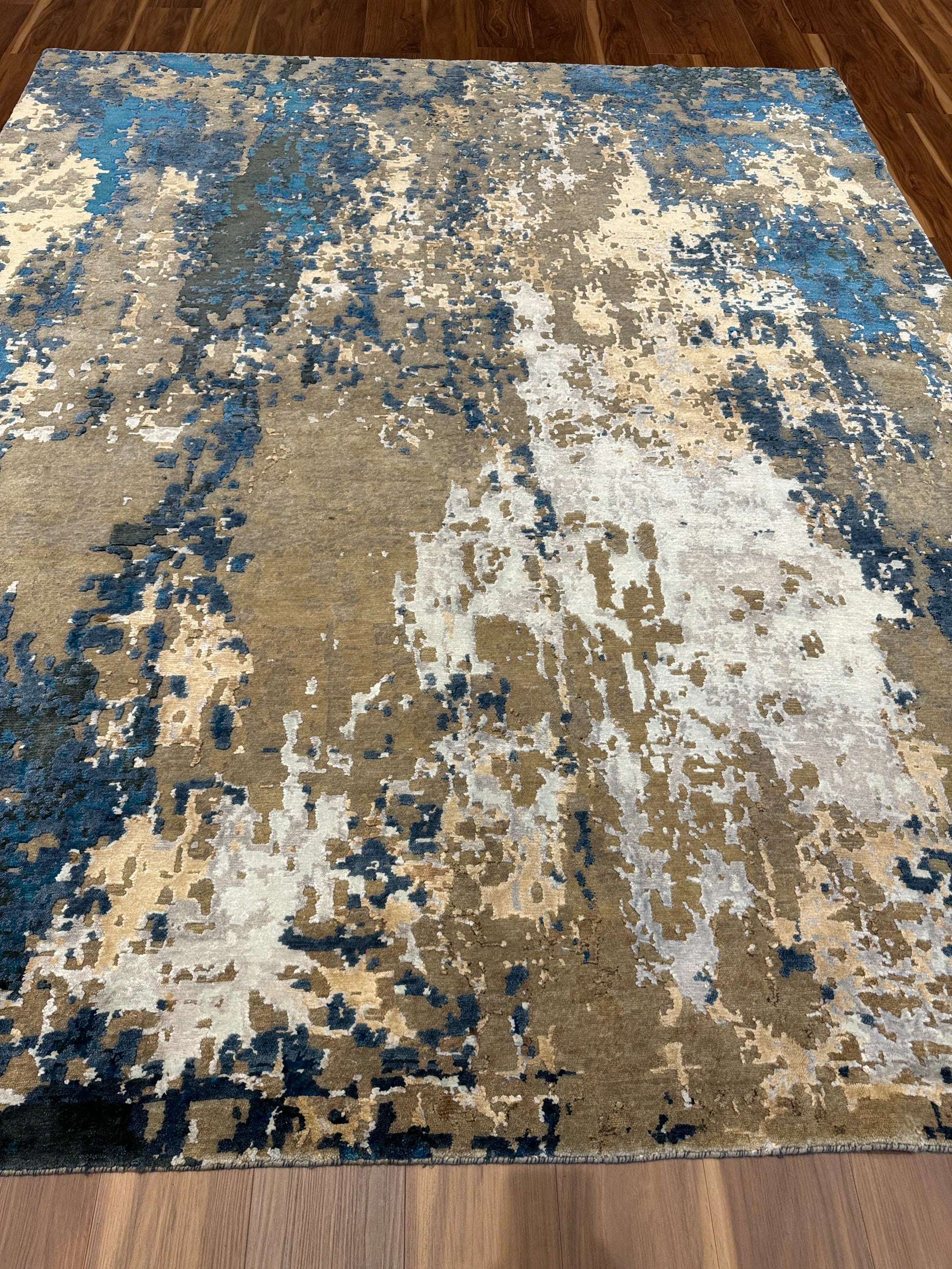 The 'Modern Abstract' rug is a stunning piece that embodies sophistication and contemporary elegance. Featuring an abstract pattern, this rug showcases a mesmerizing blend of blue, gold, and beige hues that evoke a sense of dynamic movement and artistic flair. Expertly crafted from high-quality wool and silk, the rug offers both luxurious softness and exquisite sheen, making it an ideal statement piece for any modern living space.