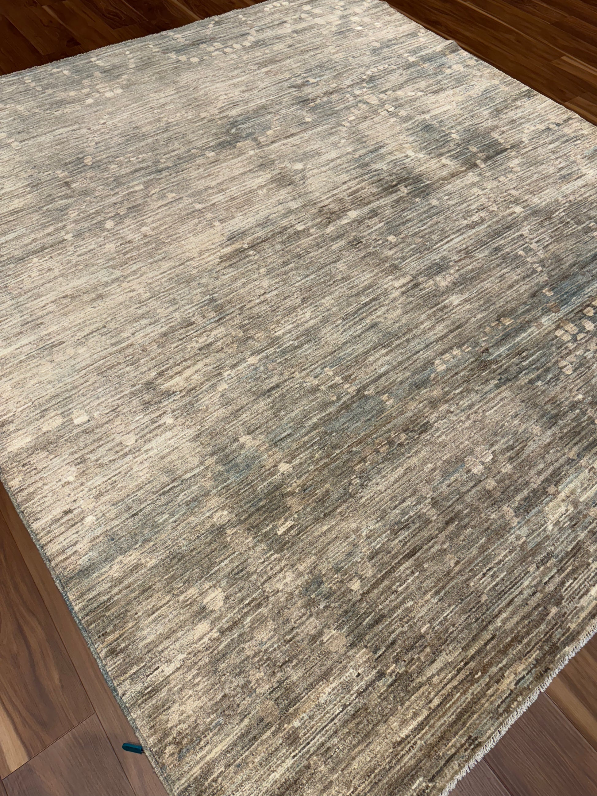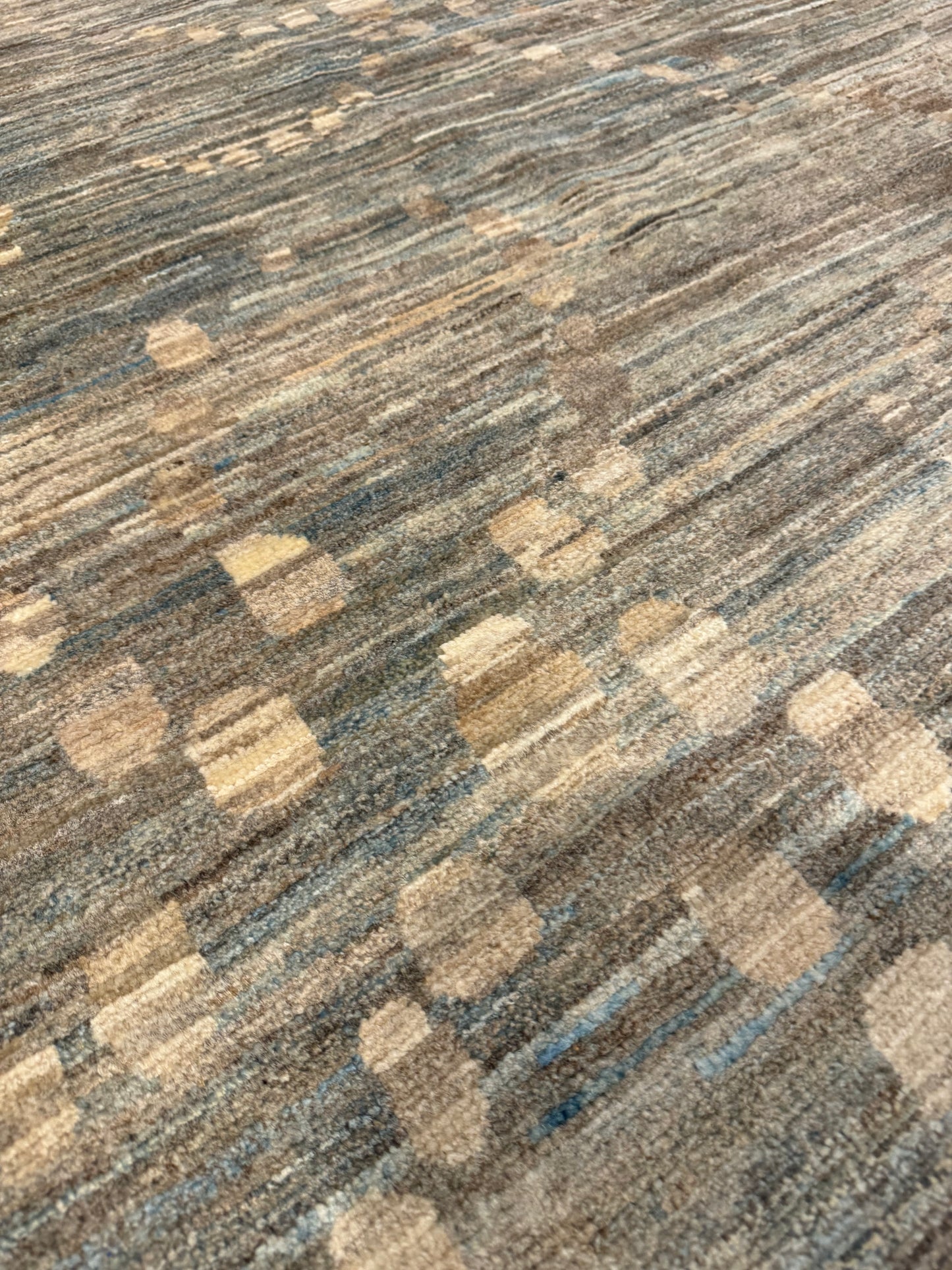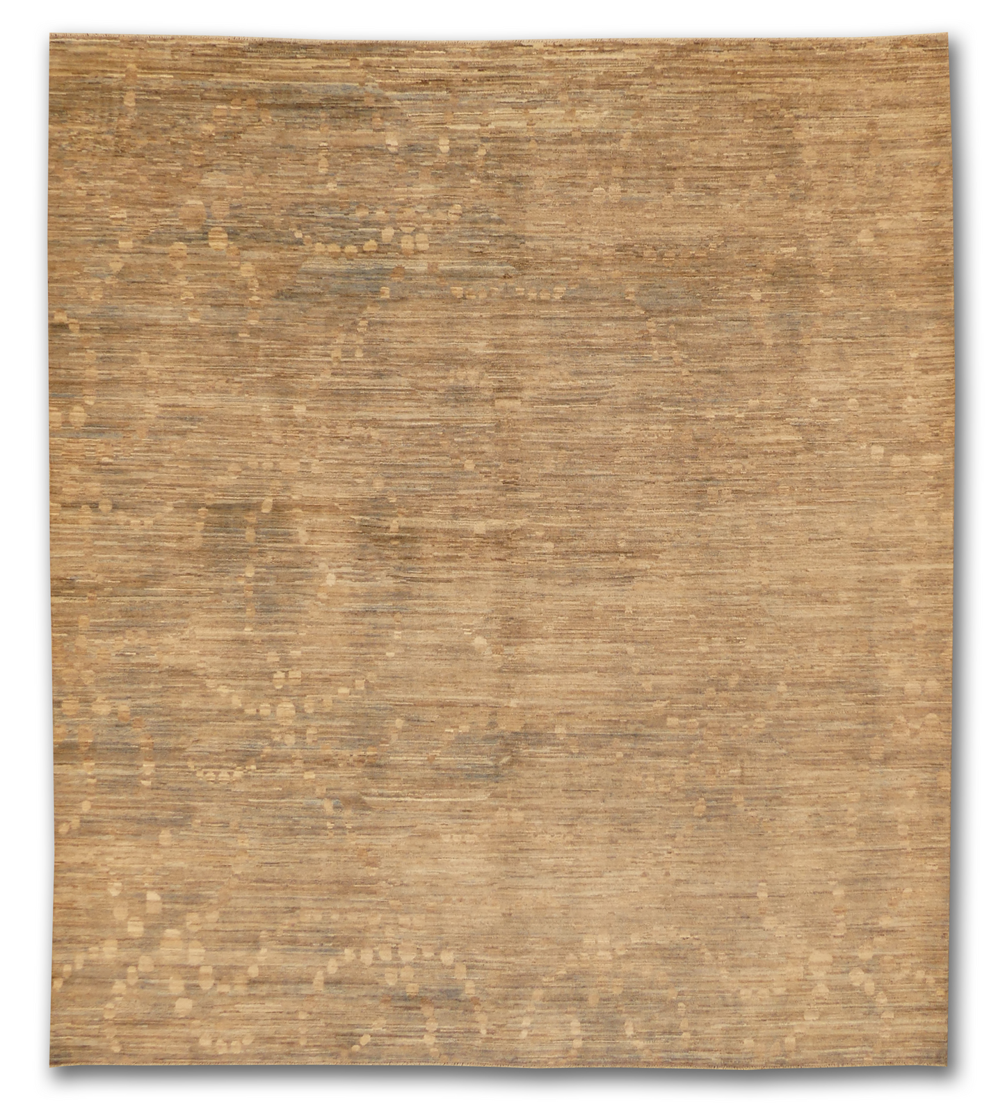 This modern Gabbeh rug, hand-knotted from high-quality wool, features a minimalist design with subtle, organic variations in its earthy beige and tan color palette. The slight irregularities give it a unique character, embracing a modern aesthetic that will complement contemporary interiors. It creates a tranquil foundation for any living space, reflecting a sophisticated blend of simplicity and warmth.