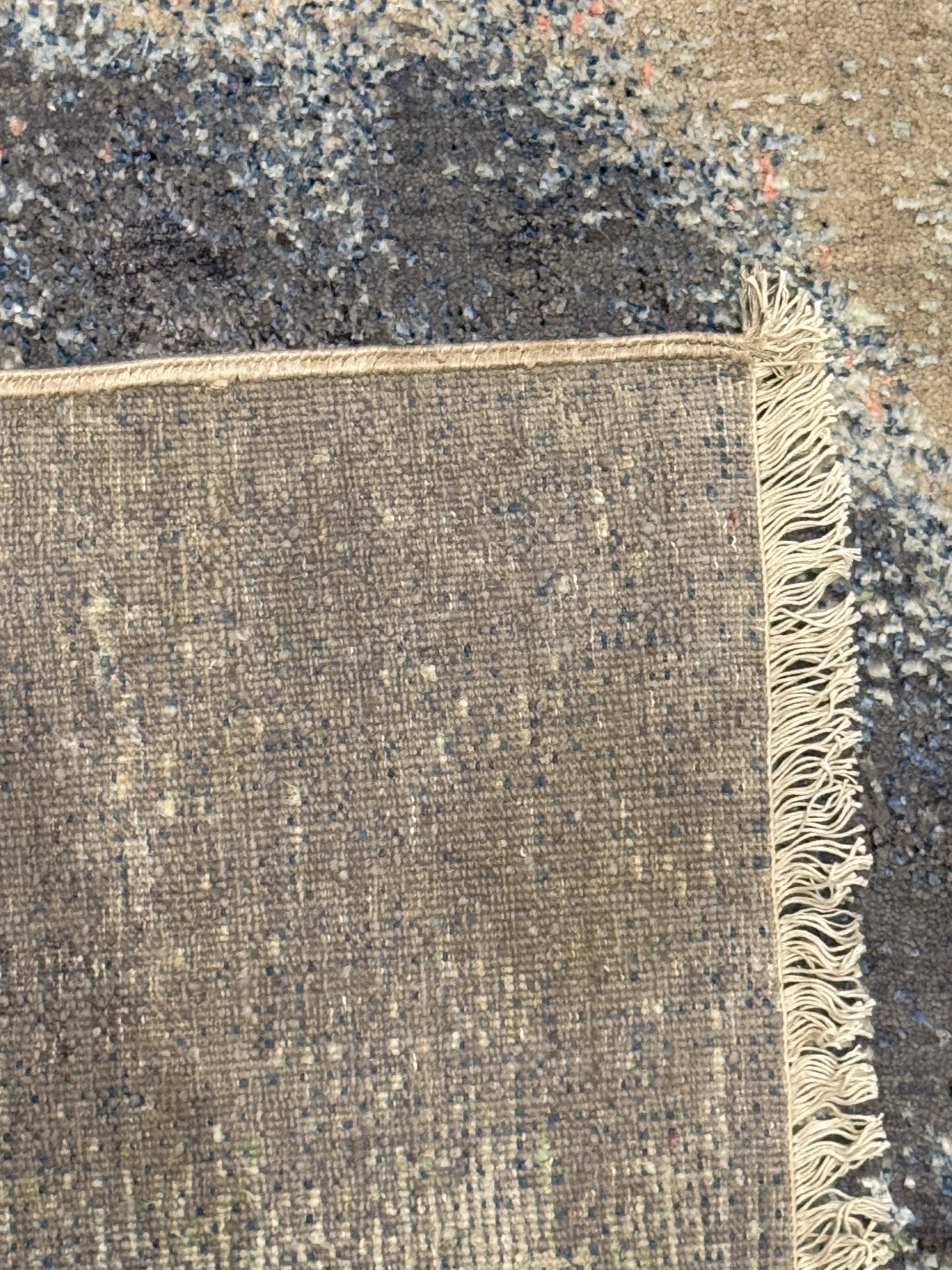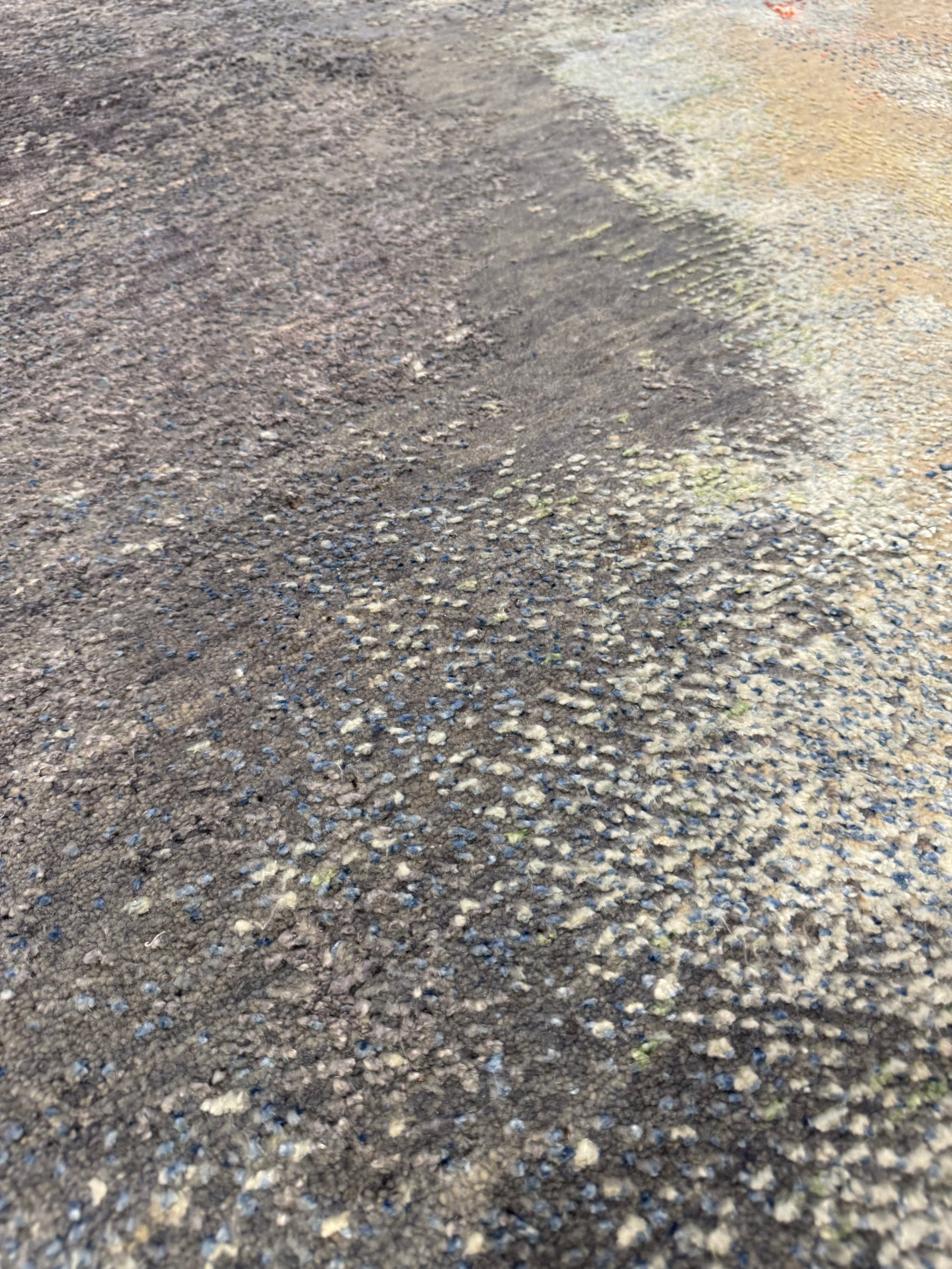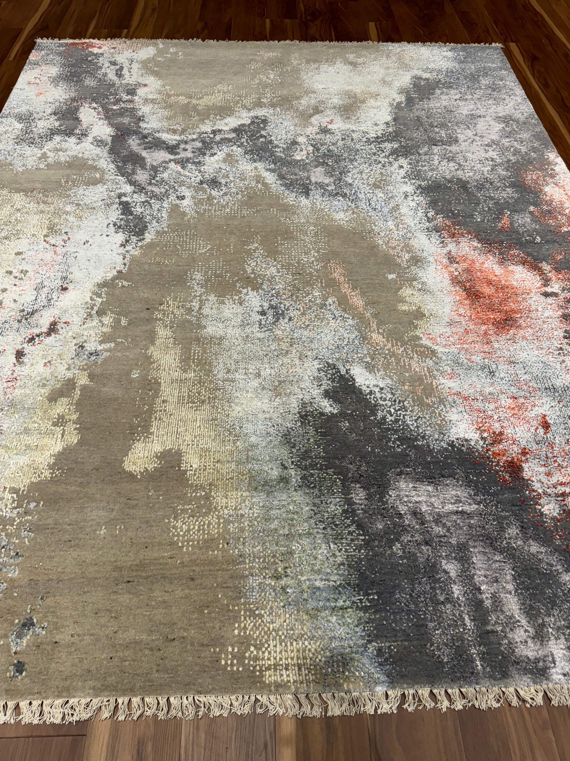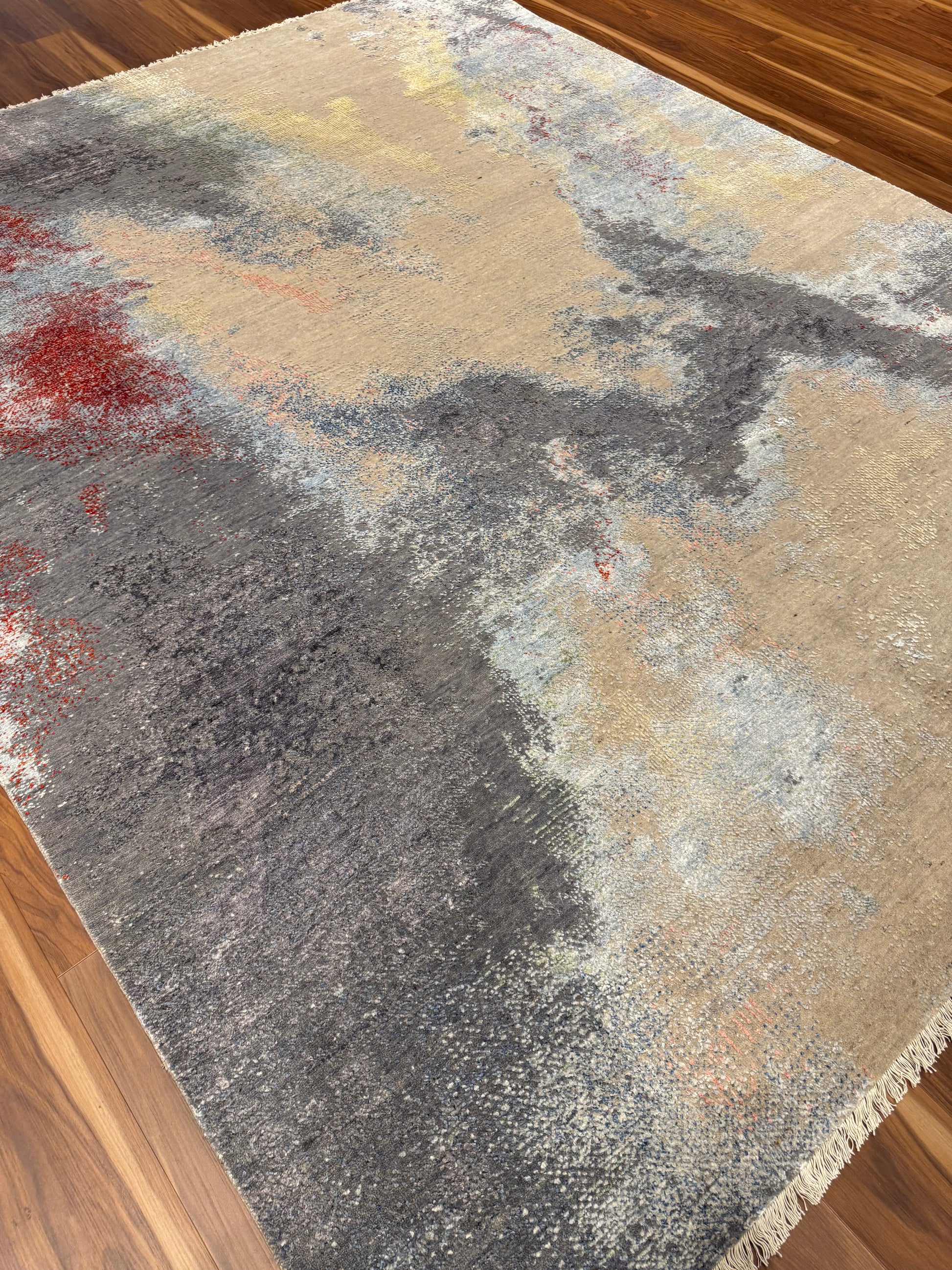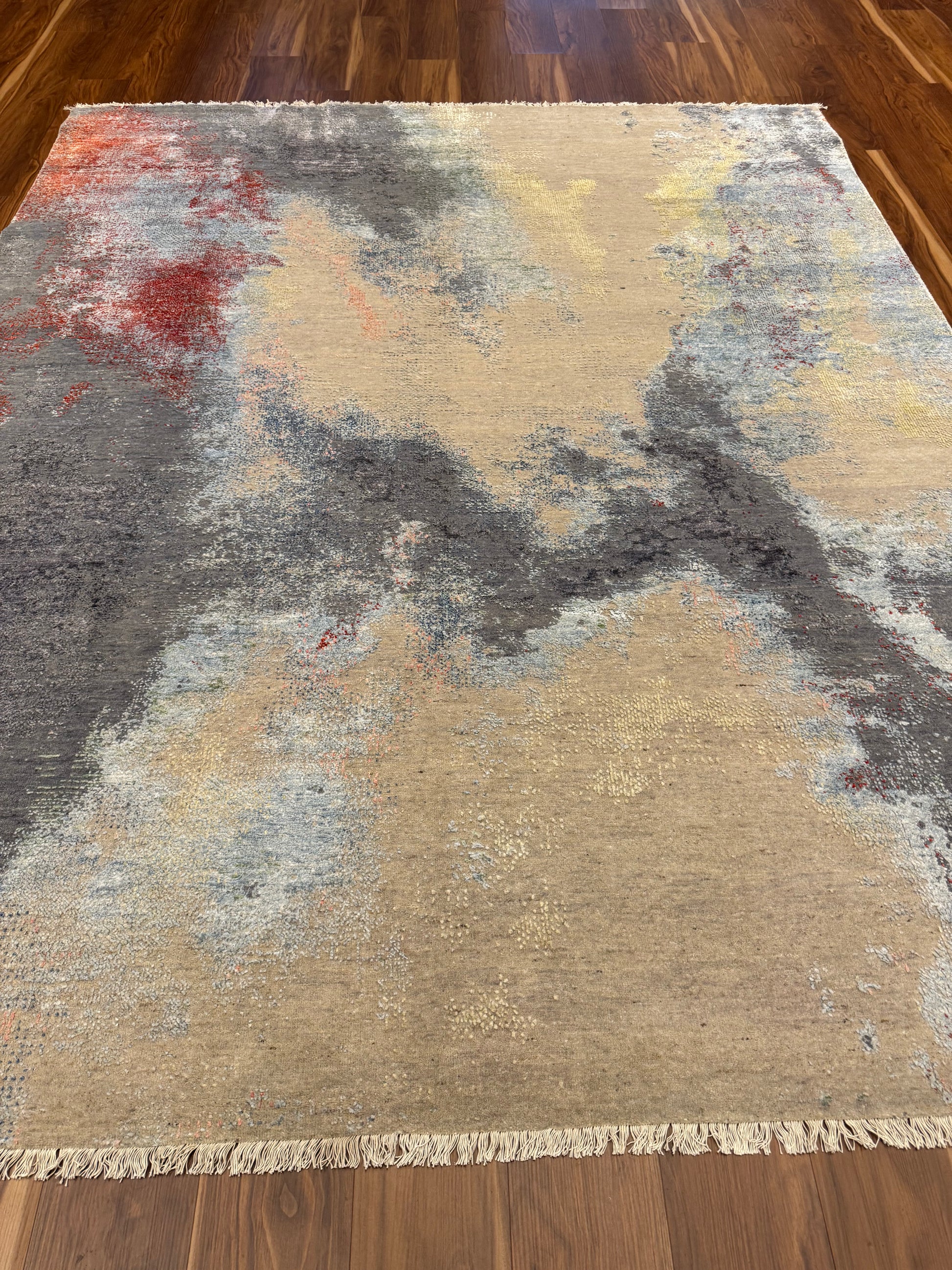 This Modern Abstract rug features a luxurious blend of wool and silk, creating a sumptuous feel underfoot. The rug boasts a contemporary abstract design with a harmonious gradient of warm, rich tones, moving from deep crimson to golden amber hues. Its subtle textural variations provide depth, making it a striking centerpiece in a modern living space or office. The fusion of color and texture embodies sophistication and would complement a range of interior decor themes.