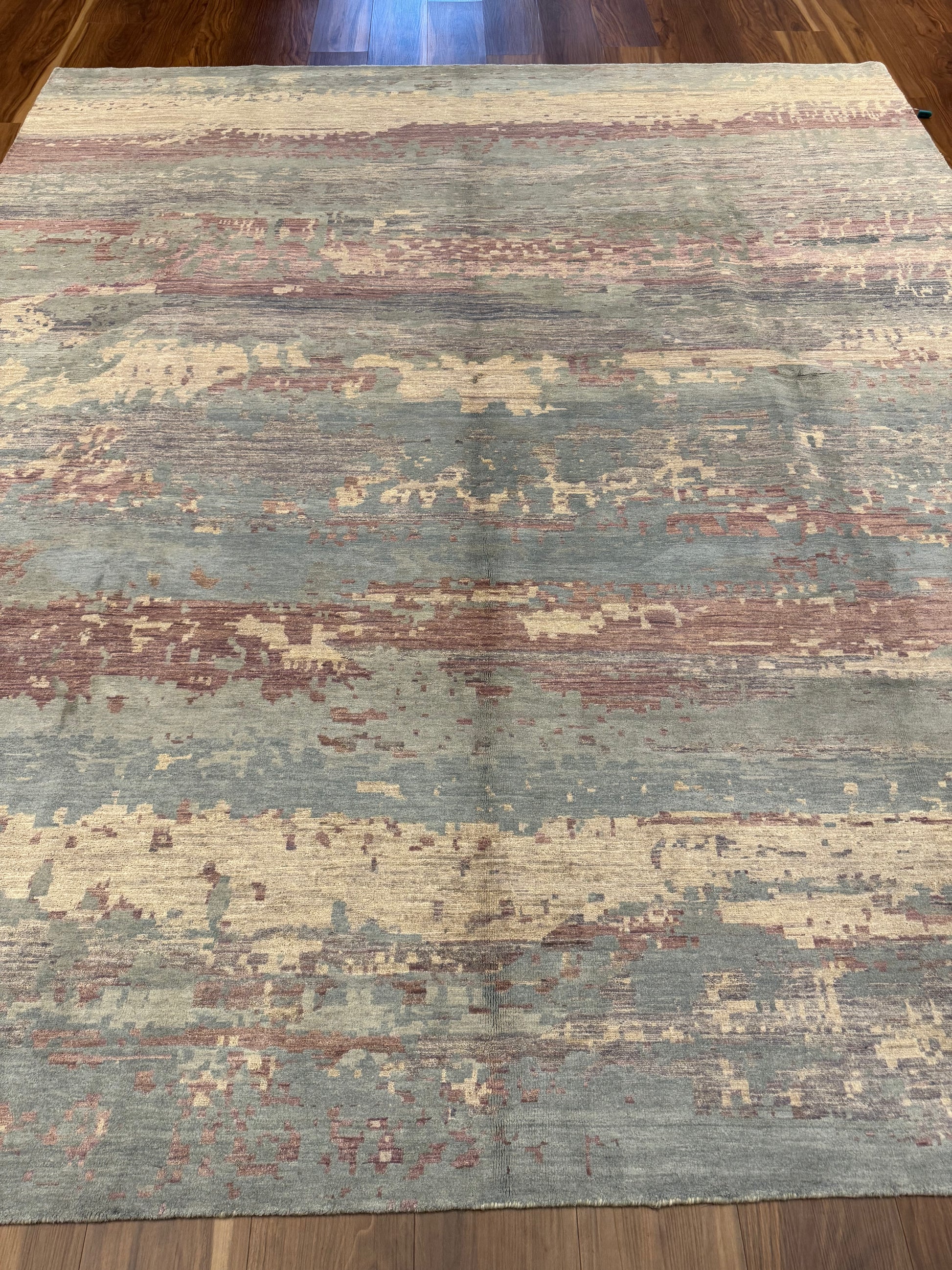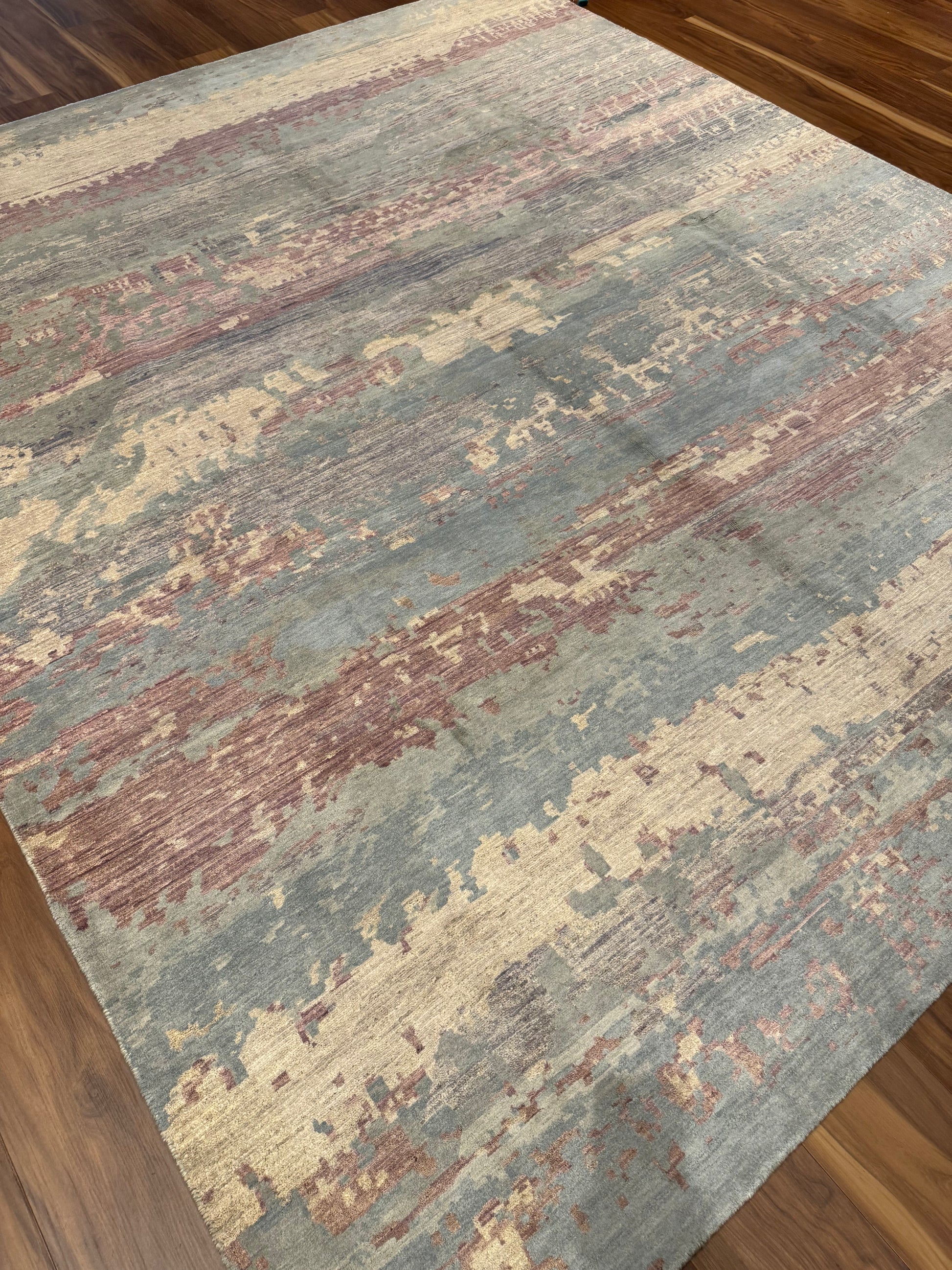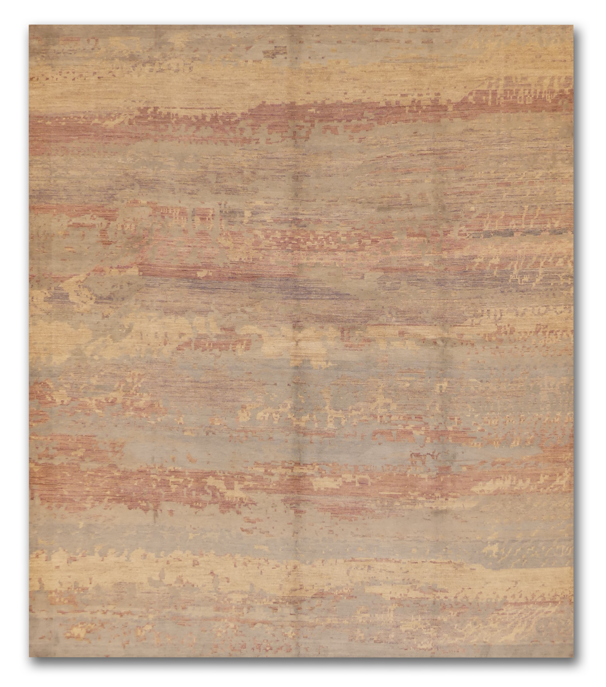 This exquisite wool rug flaunts a contemporary horizontal pattern, blending organic hues such as beige, brown, gold, and rust. Perfect for modern interiors, it showcases an elegant play of colors that evoke a serene and inviting ambiance, mirroring the beauty of aged materials with its subtle gradients and textures. Its durable wool construction promises comfort underfoot and long-lasting appeal, making it an ideal choice for any living space seeking a touch of modern sophistication.