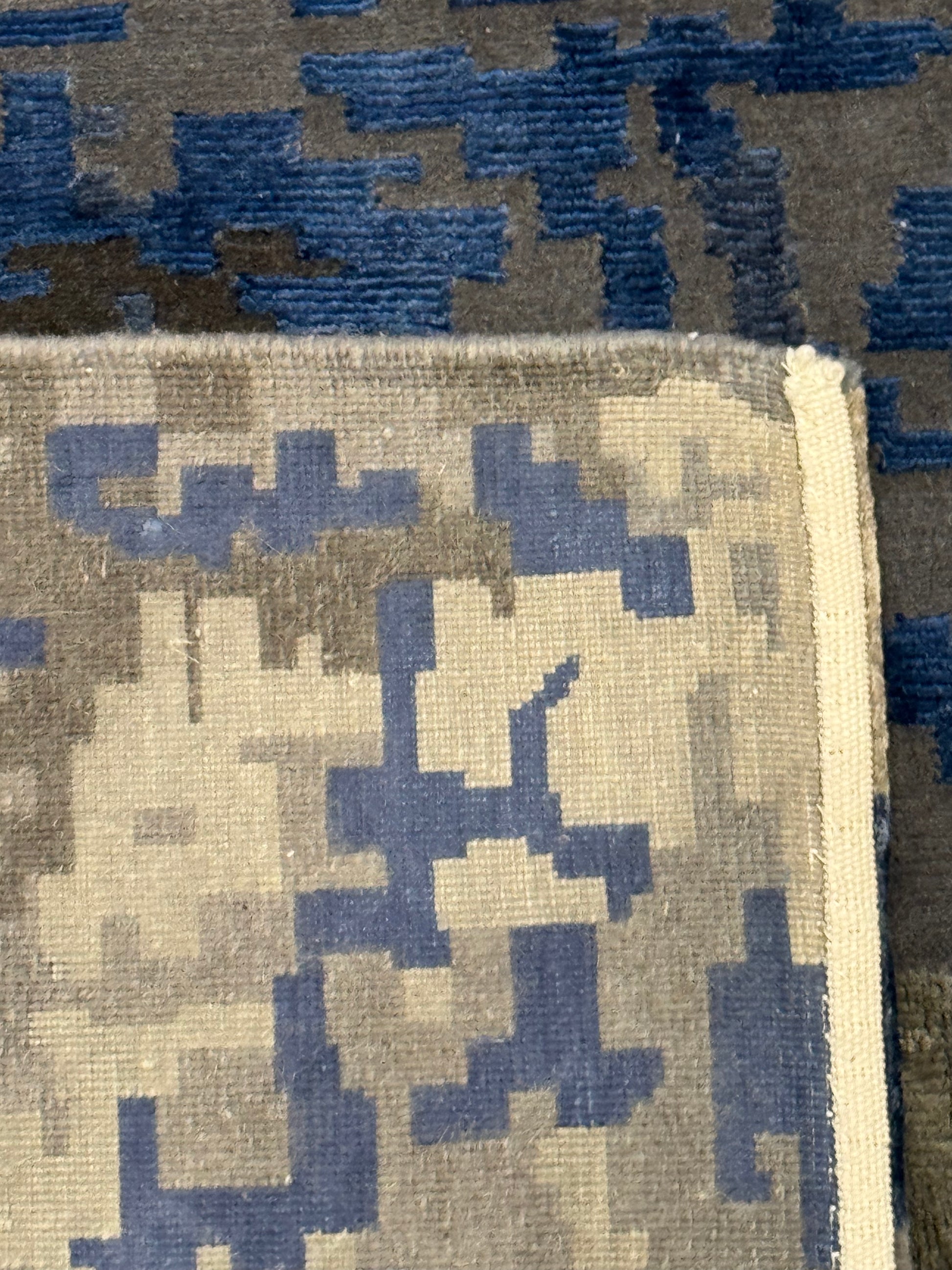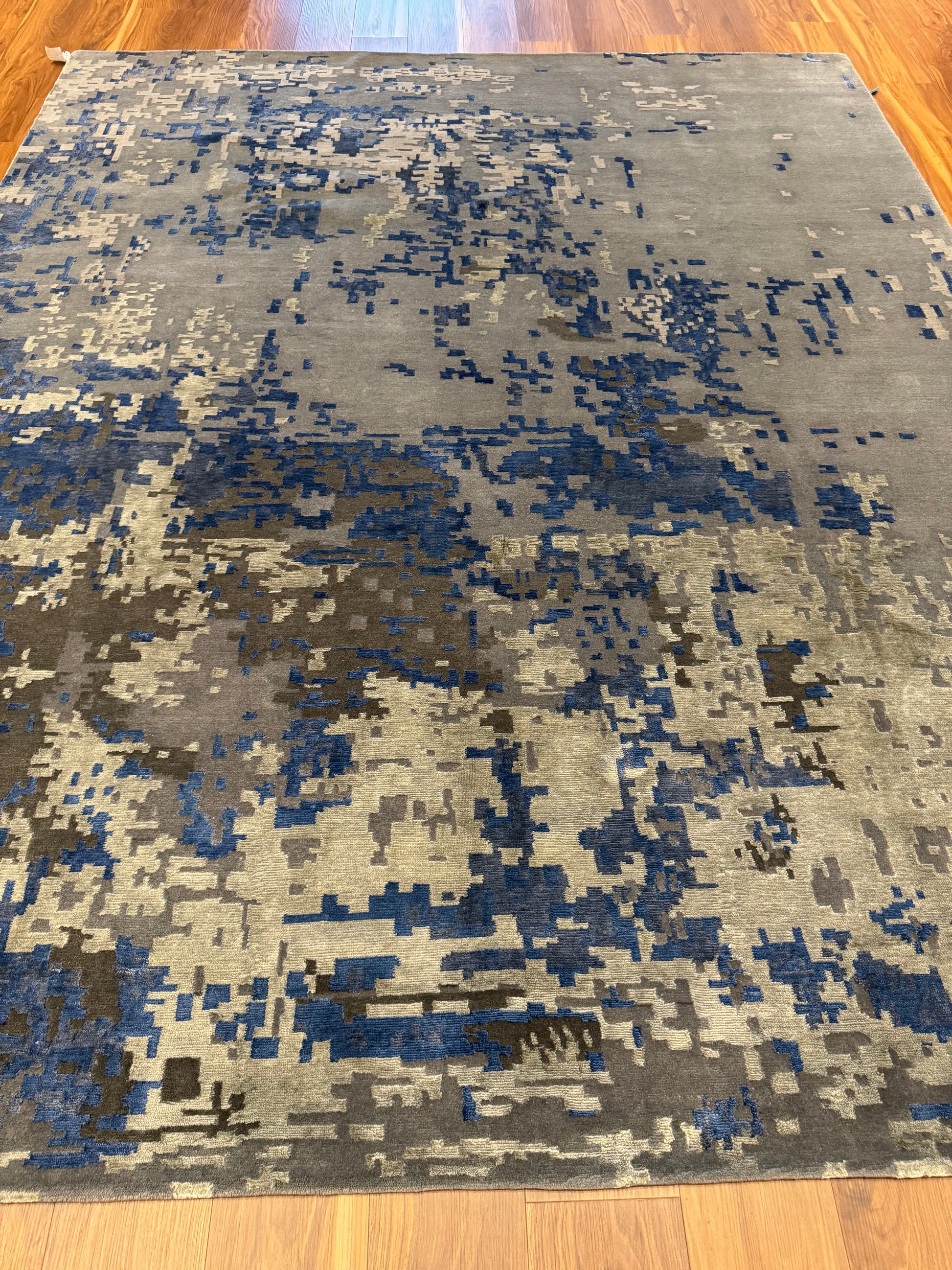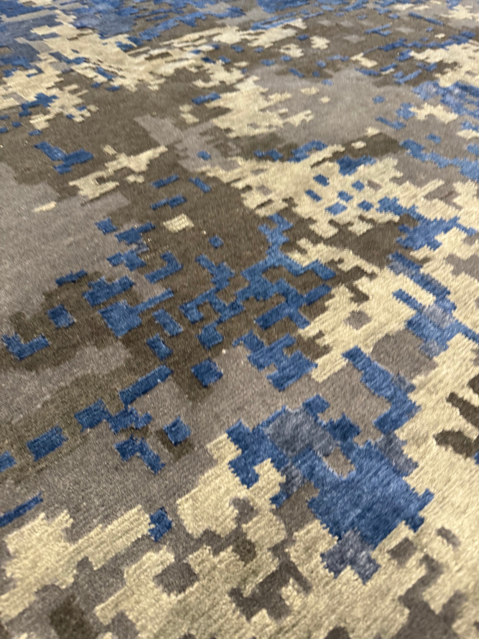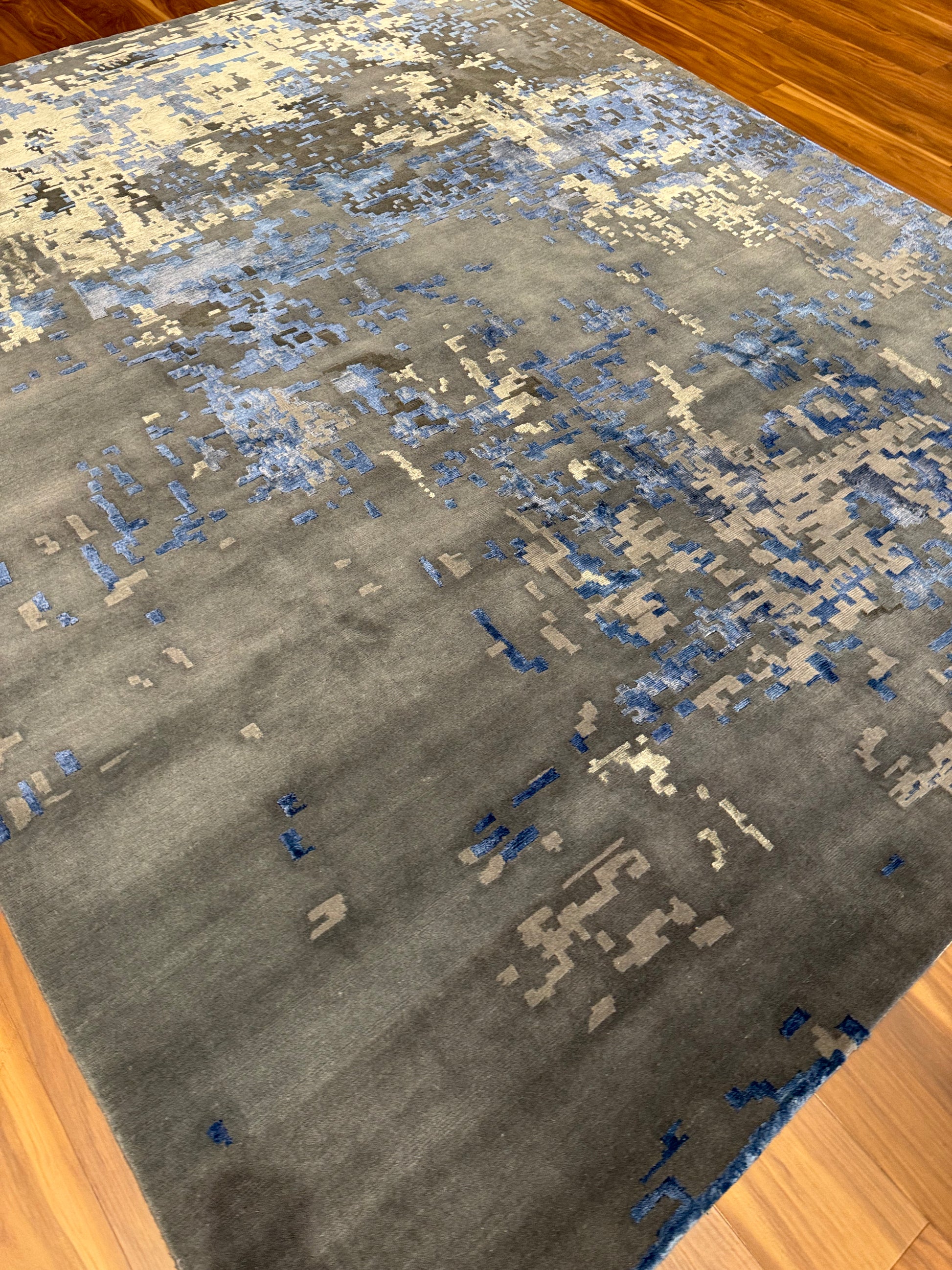 This exquisite Modern Abstract rug boasts a stunning composition that resembles a sophisticated blend of marble and water reflections. Its harmonious blend of wool and silk fibers imbues each step with a luxurious softness, while the high-low texture provides a delightful tactile experience. The subtle interaction of brown, blue, and beige hues gives this piece a unique versatility, suitable for a chic and contemporary interior decor.