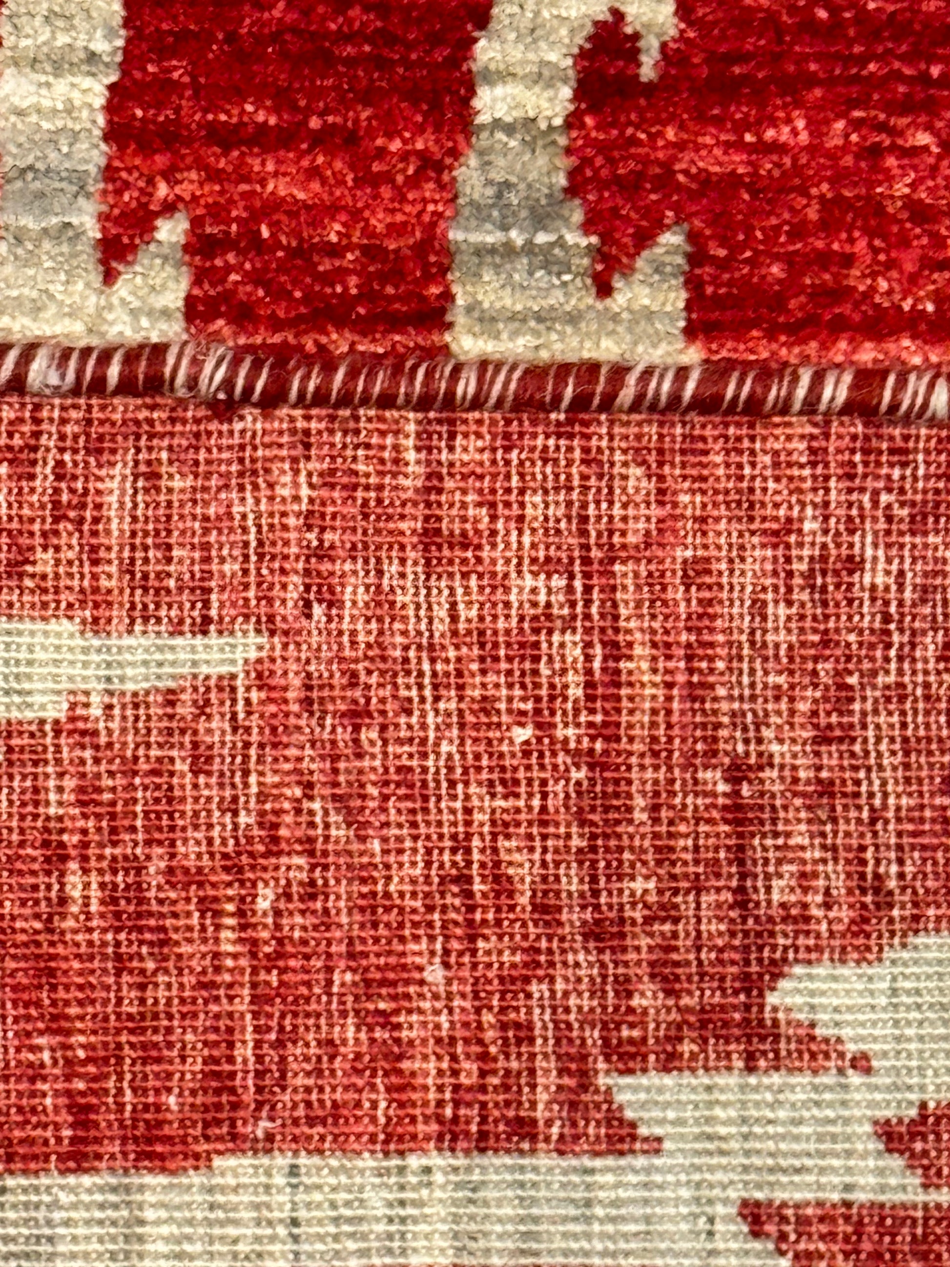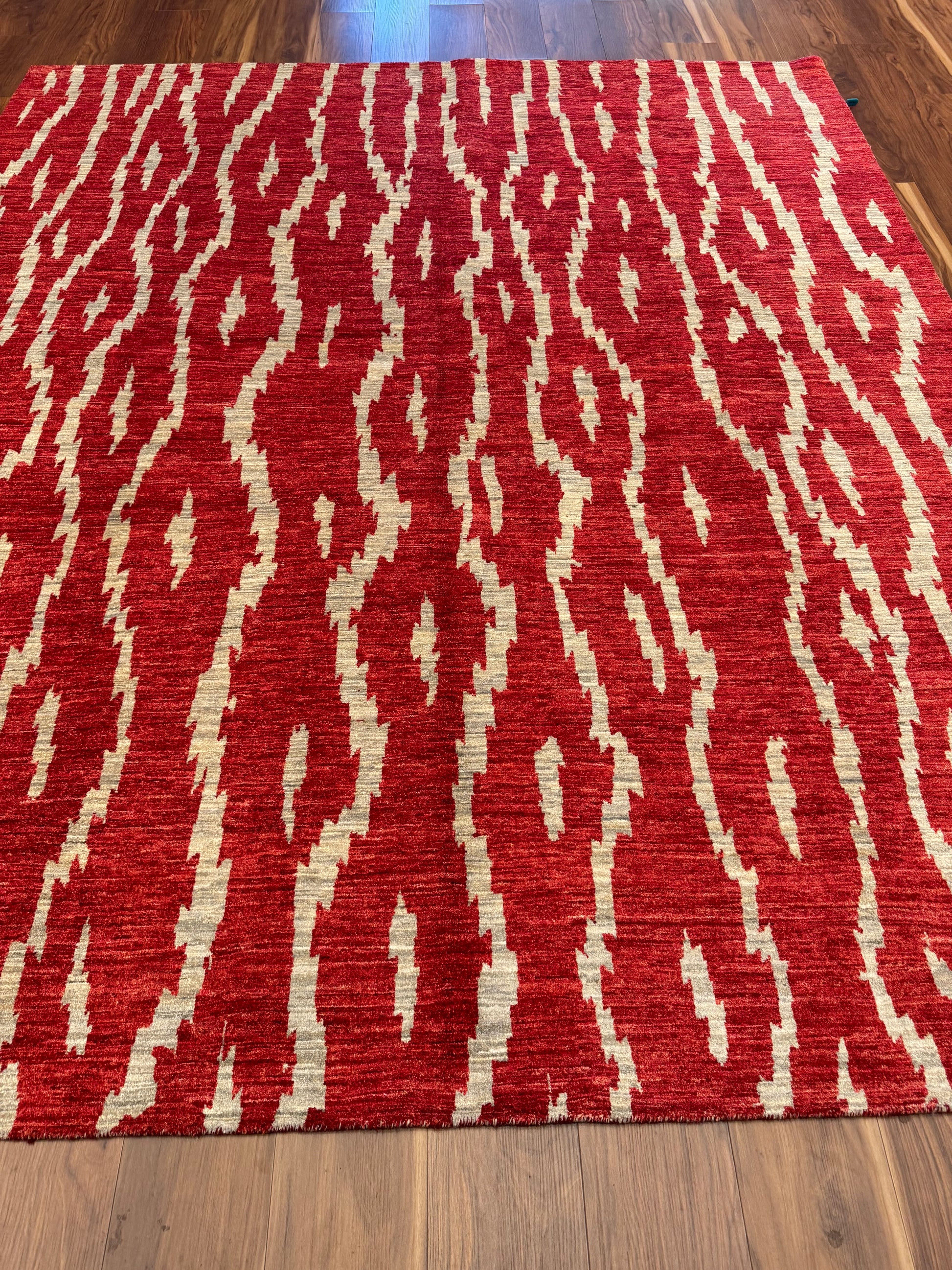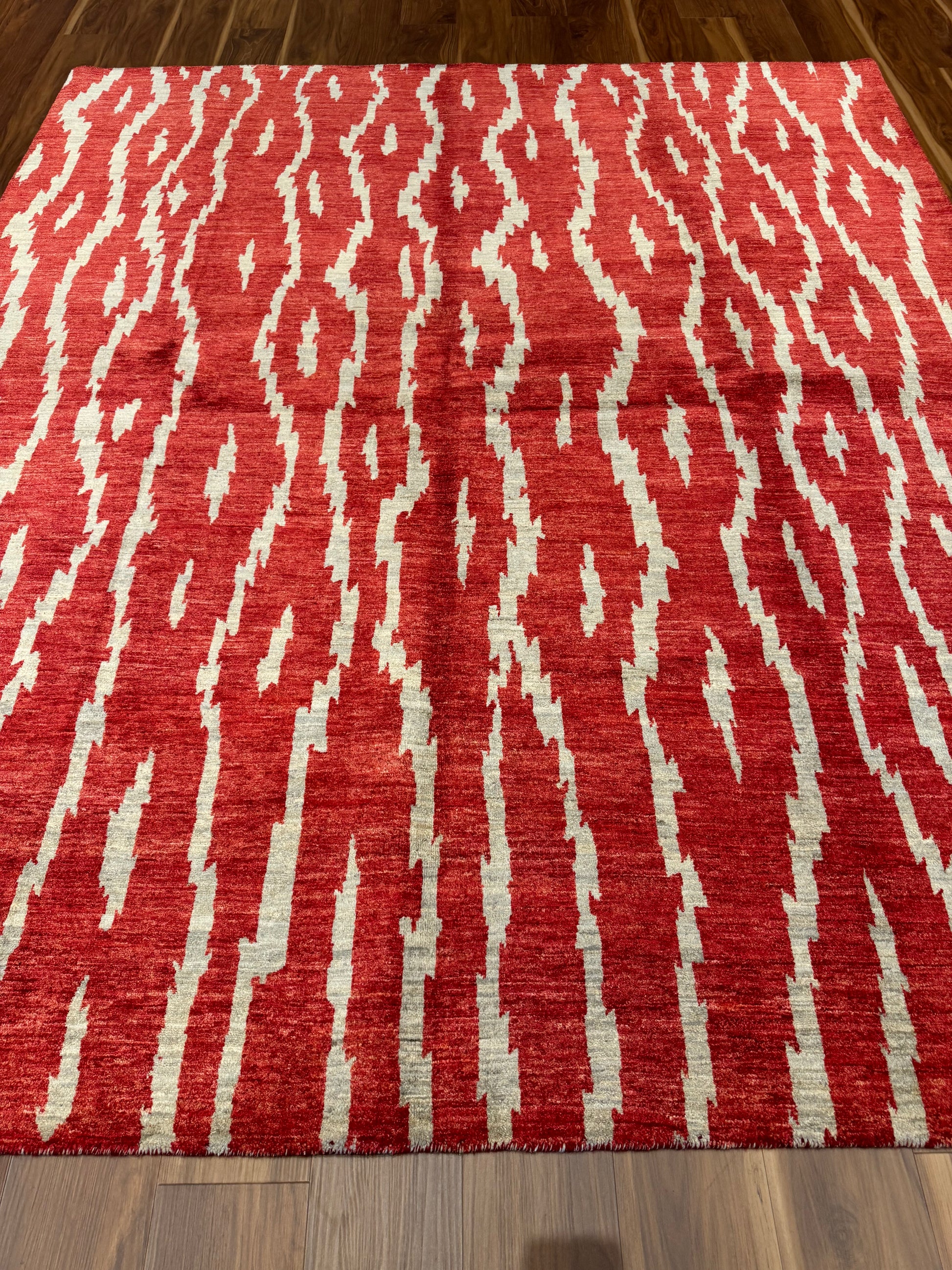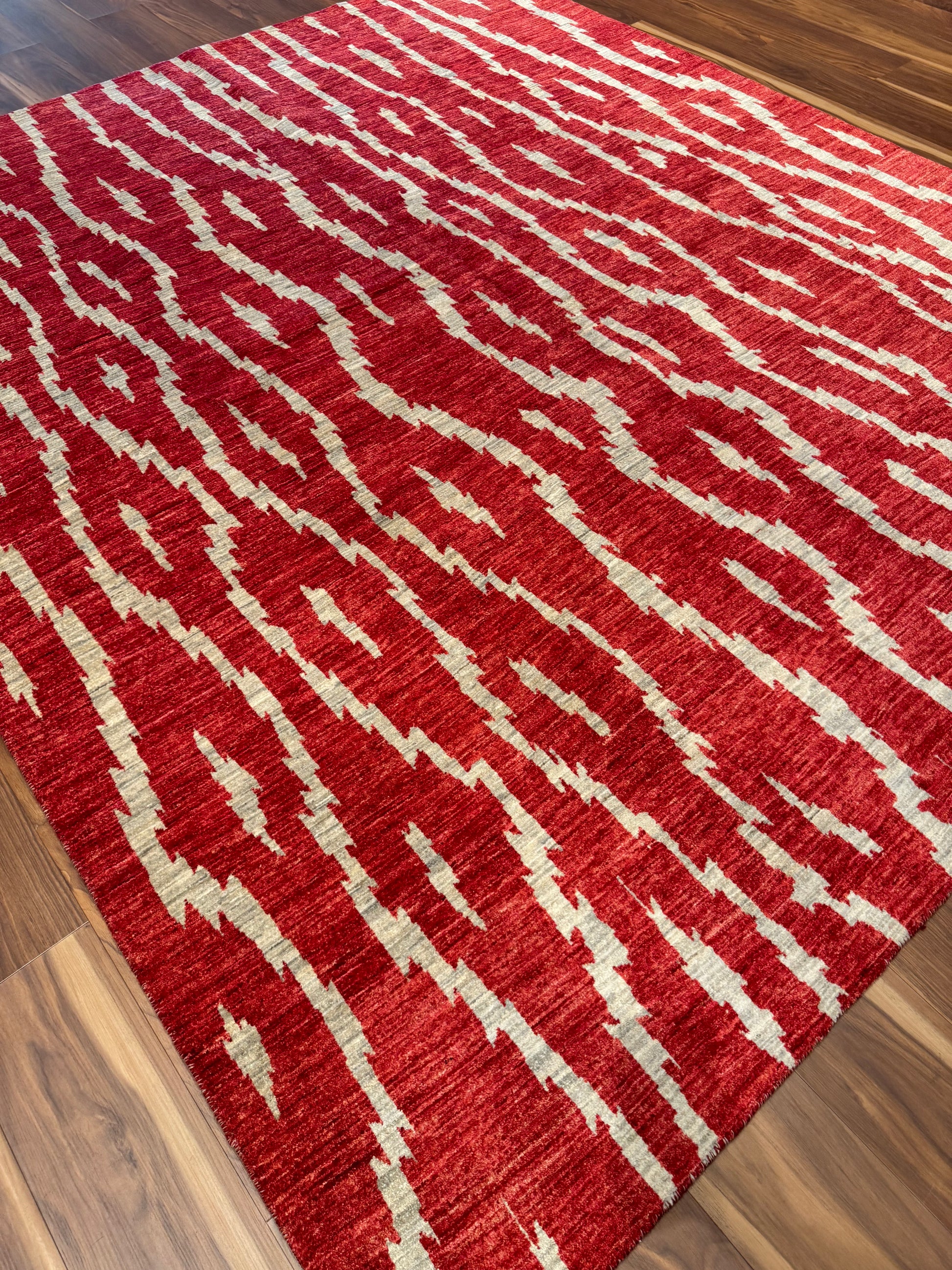 This striking Modern Gabbeh rug features a sophisticated and bold geometric pattern. The sharp contrast between the vibrant red backdrop and the elegant cream motifs gives this piece a contemporary edge. Expertly crafted from high-quality wool, this rug offers both comfort and style. Its dynamic design serves as a captivating centerpiece for any modern living space, blending traditional Gabbeh textures with a fresh, modern aesthetic.