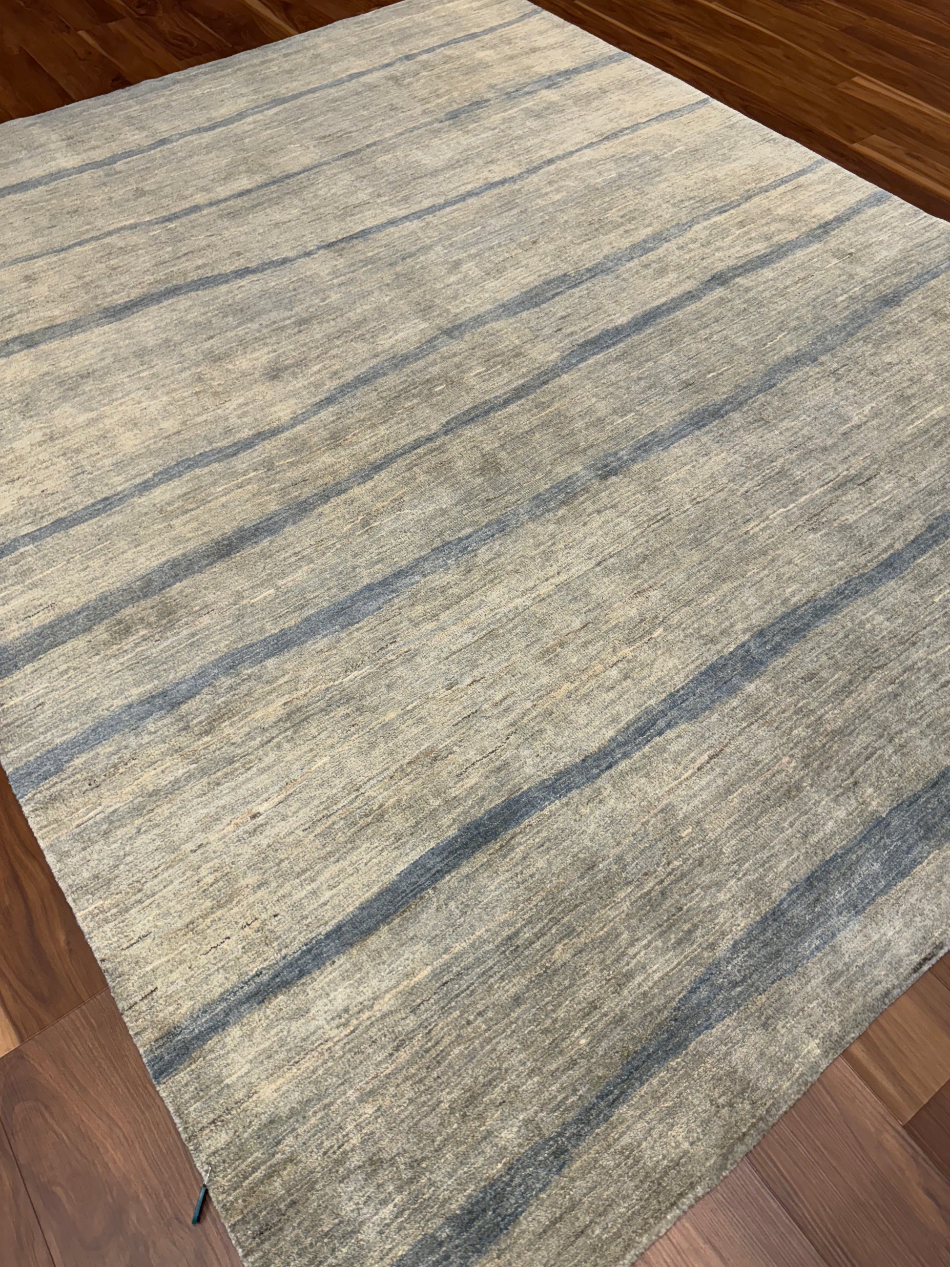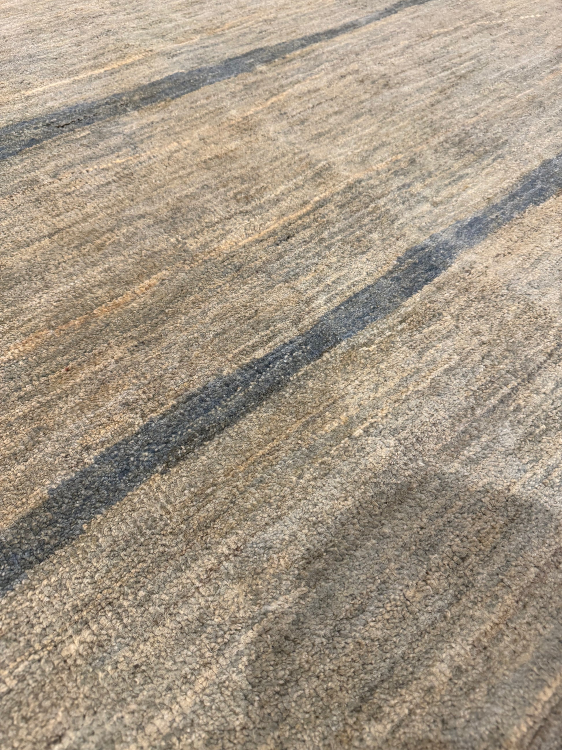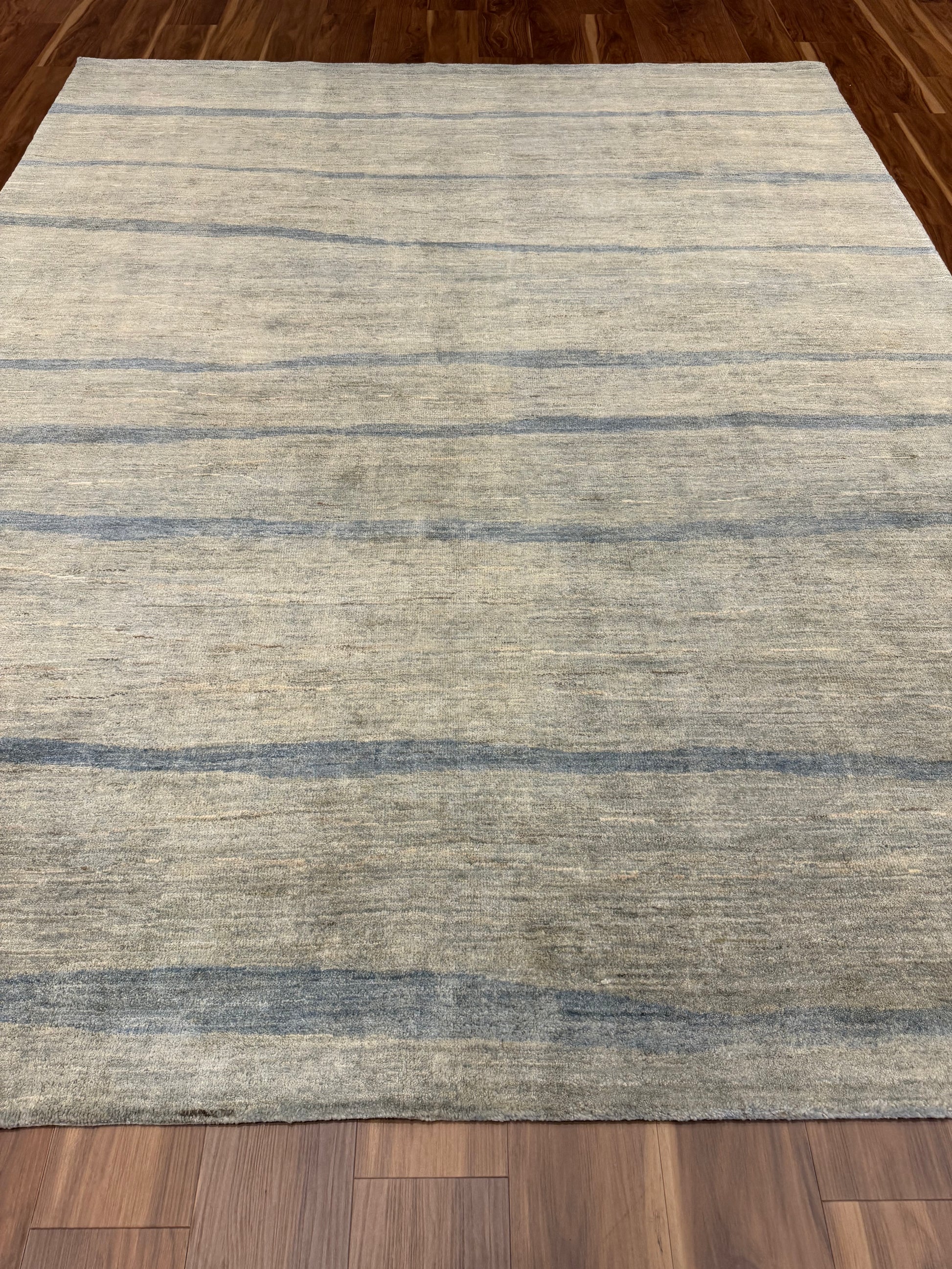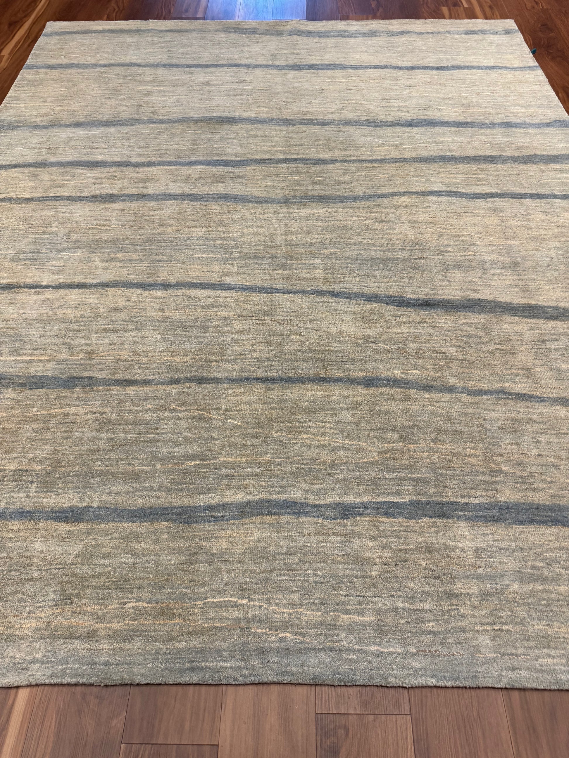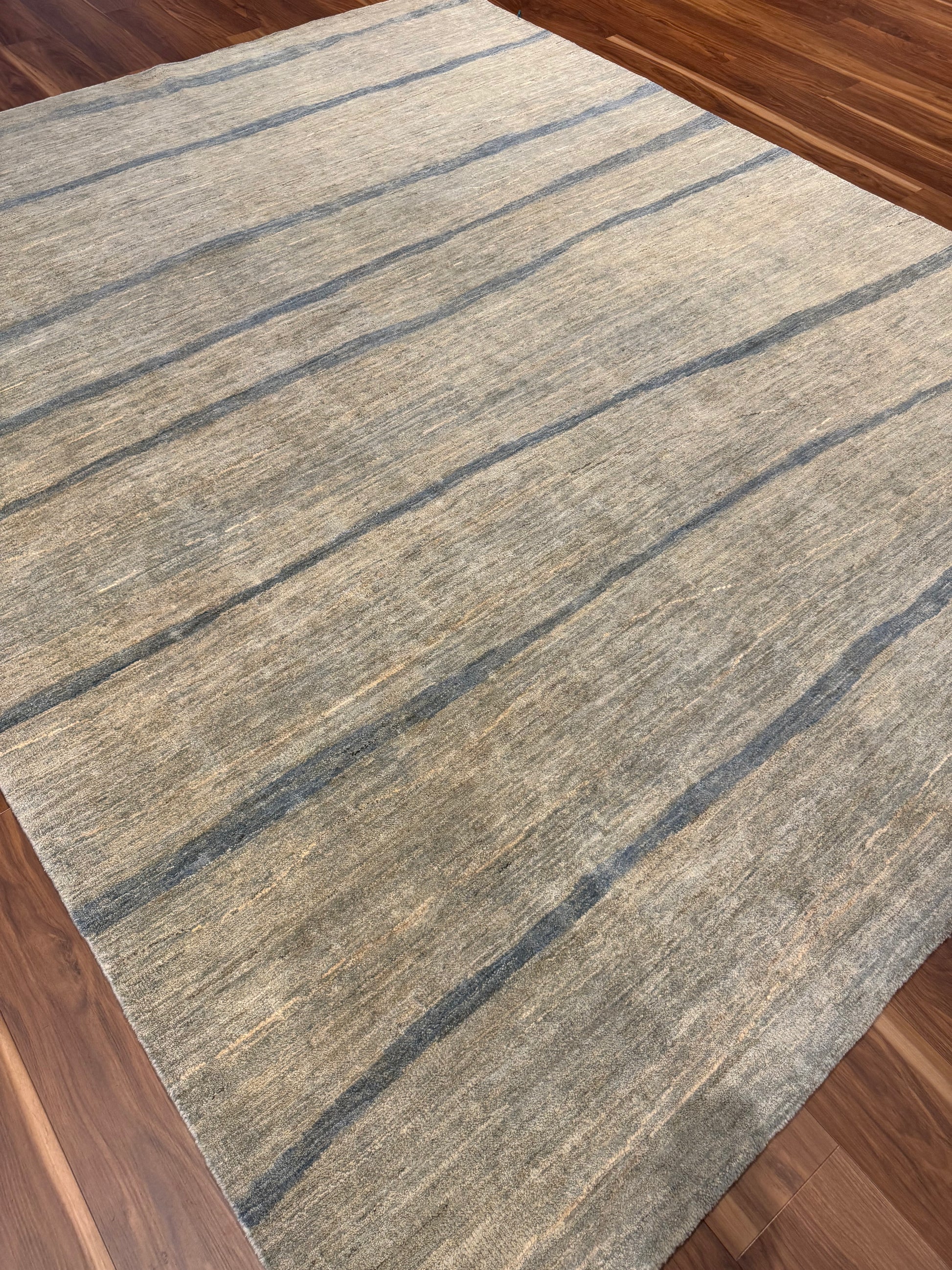 This sophisticated rug features a serene horizontal pattern, presenting a modern aesthetic with a touch of minimalism. The beige and taupe hues are accented by subtle grey lines that give it a textured appearance. Expertly crafted from high-quality wool, this contemporary piece promises both comfort and durability. Its understated elegance is perfect for enhancing a modern living space or complimenting an office environment, and it is versatile enough to integrate seamlessly with a variety of interior design schemes.