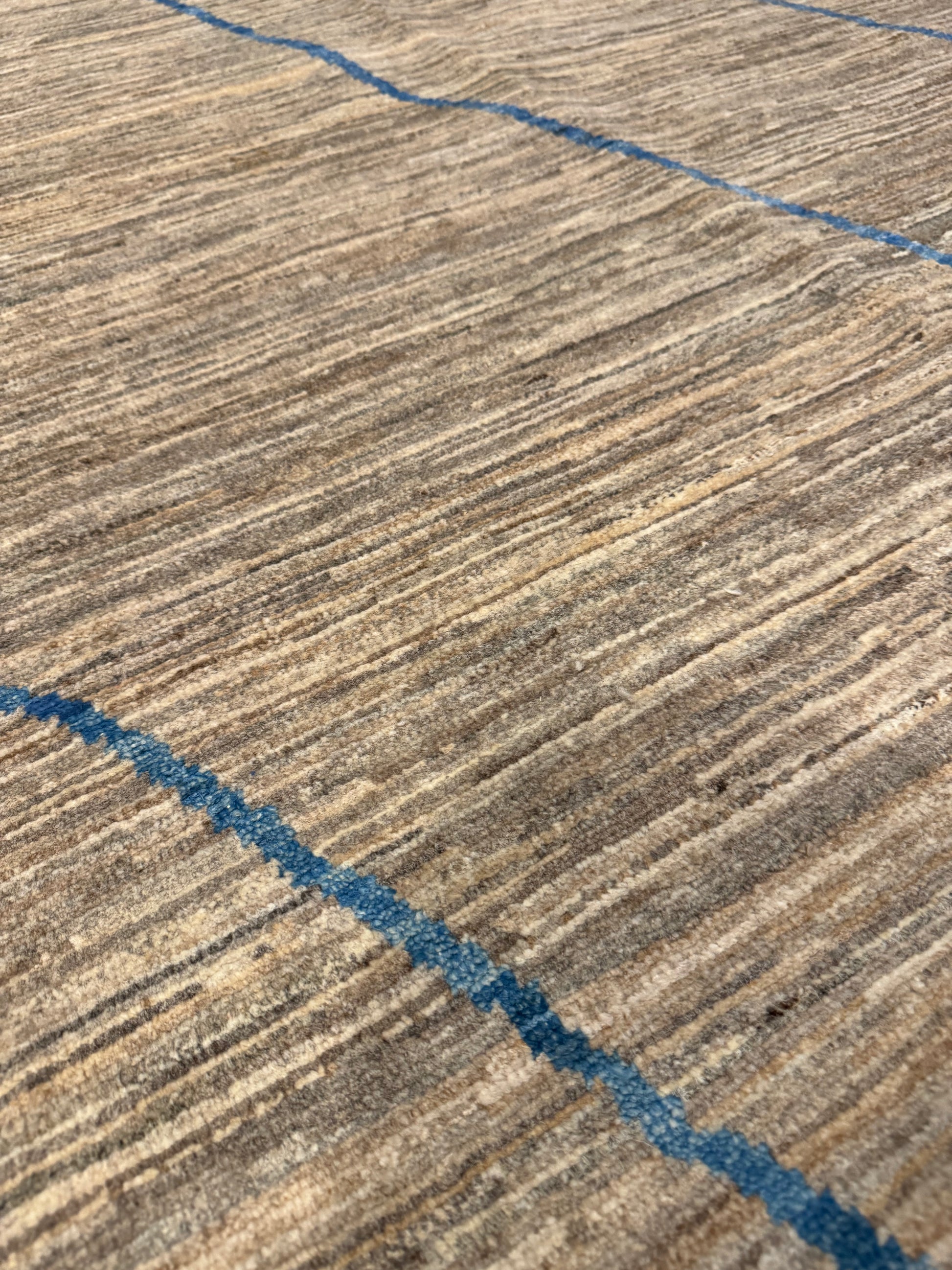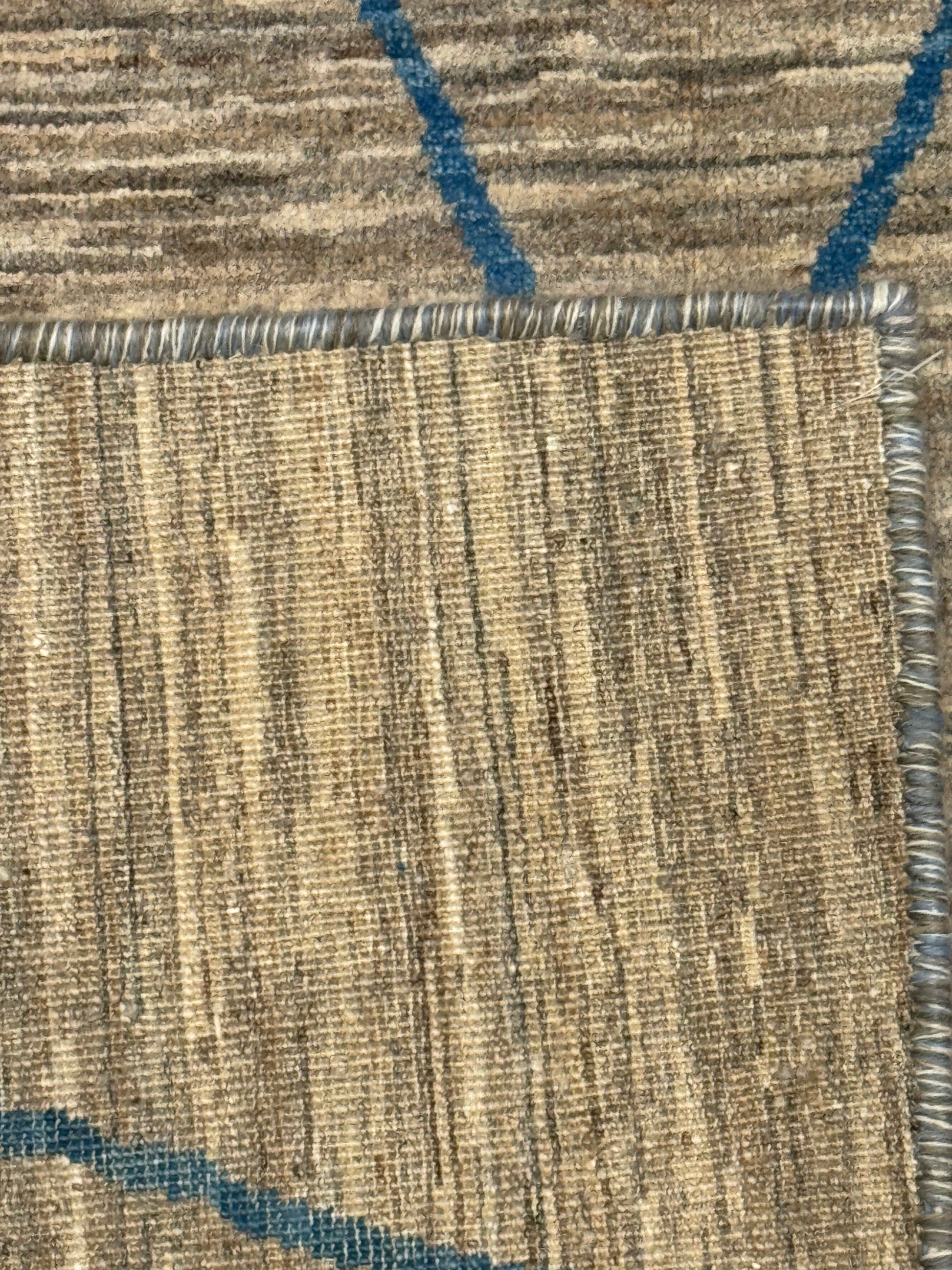 This elegant Moroccan rug boasts a modern interpretation of traditional Berber designs. Handwoven from high-quality wool, its rich texture and resilience make it a sublime addition to any space. The beige field is gracefully contrasted with a minimalist blue geometric pattern, offering a chic, yet understated touch to its timeless aesthetic. Perfect for those seeking to infuse a sense of cultural heritage with a modern twist in their home decor.