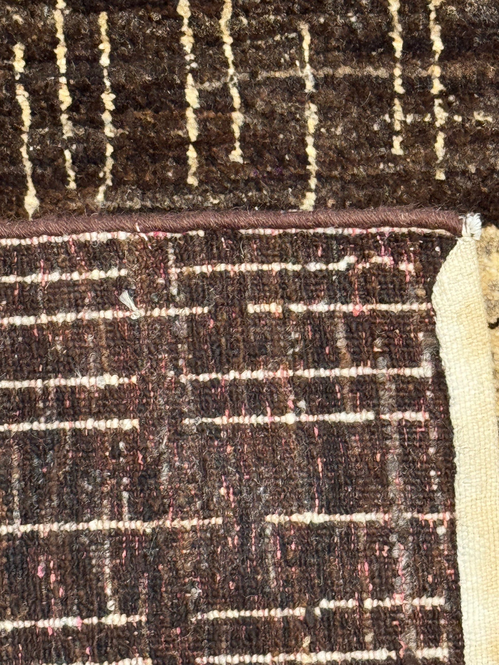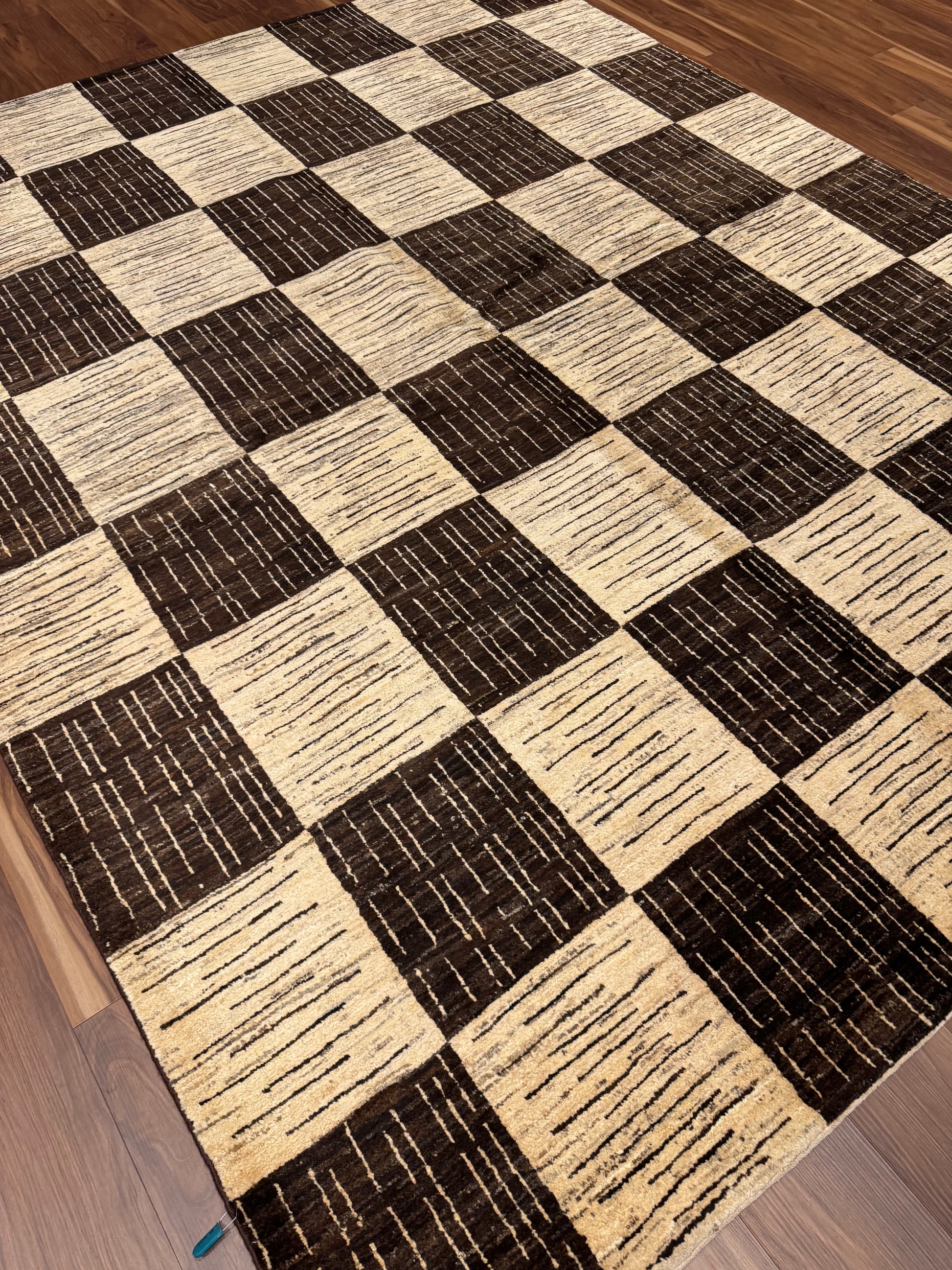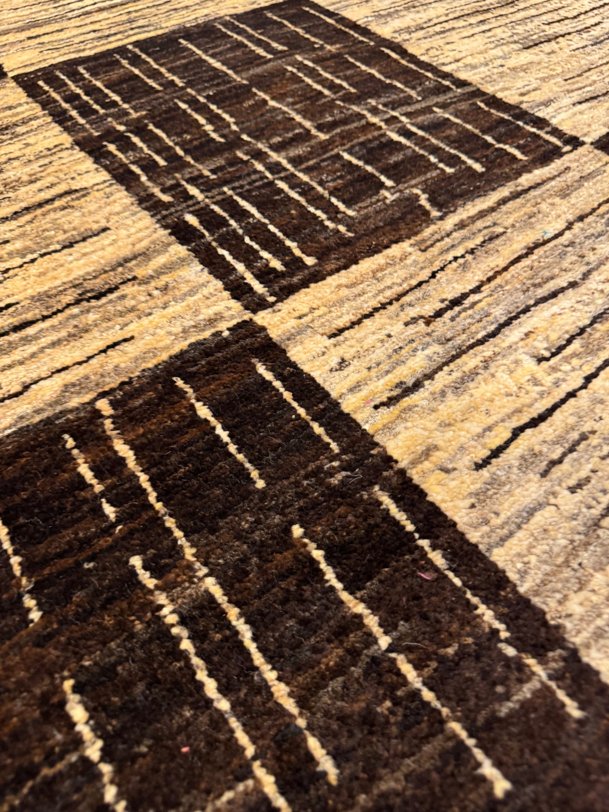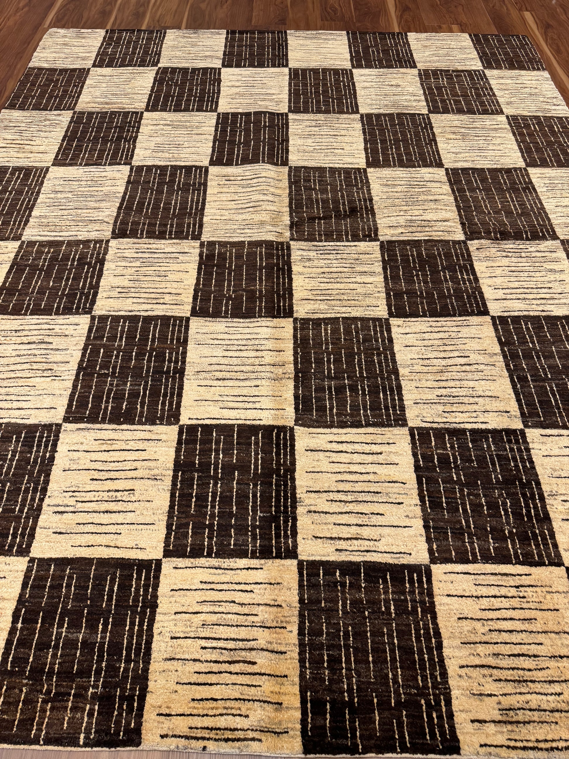This Modern (Squares) rug presents a chic and contemporary style that will enhance any living space. Boasting an interlocking squares pattern, the design is composed of alternating beige and brown tones, providing a sense of structure and sophistication. Made of a luxurious blend of wool and silk, this rug is as durable as it is soft to the touch. Its medium size and captivating geometric theme make it a versatile centerpiece for a living room, office, or bedroom.