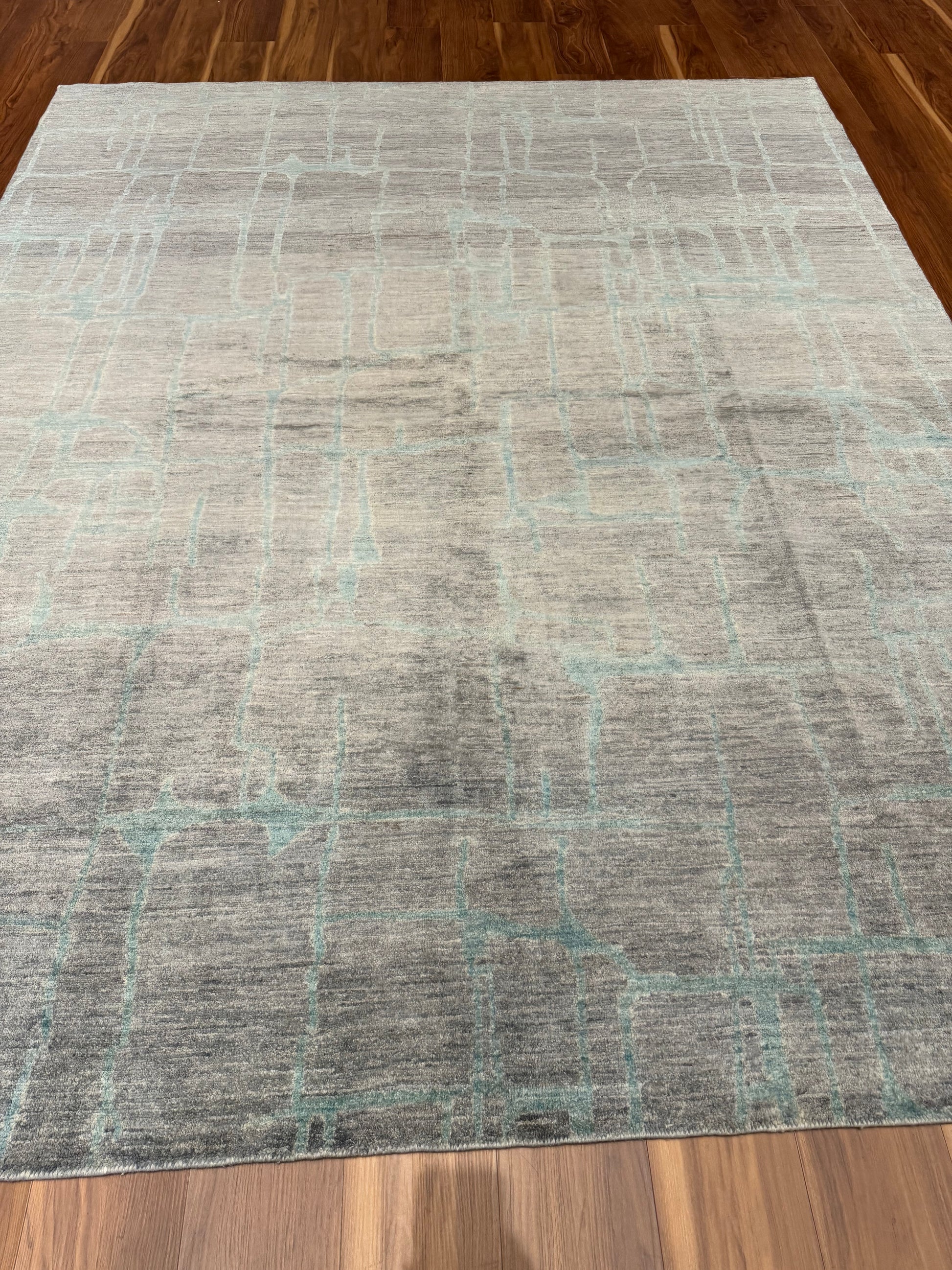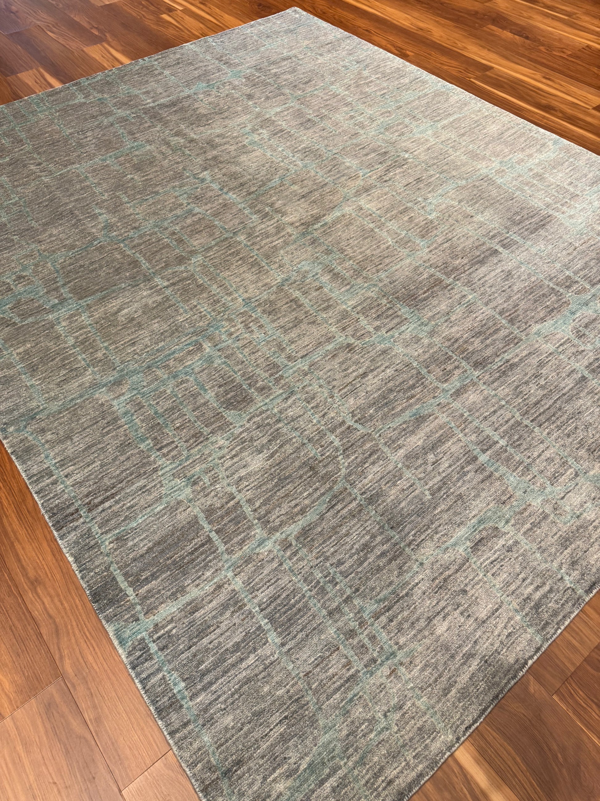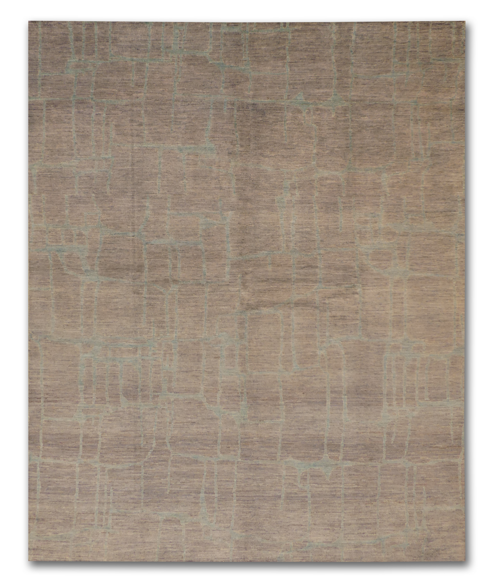 This contemporary wool/silk rug features a sophisticated and minimalistic design, perfect for modern interiors. Its subtle geometric pattern is rendered in a serene palette of taupe, beige, and light brown, with soft hints of teal providing a gentle contrast. The blend of wool and silk fibers gives the rug a luxurious feel and a subtle sheen, adding depth and elegance to the space.