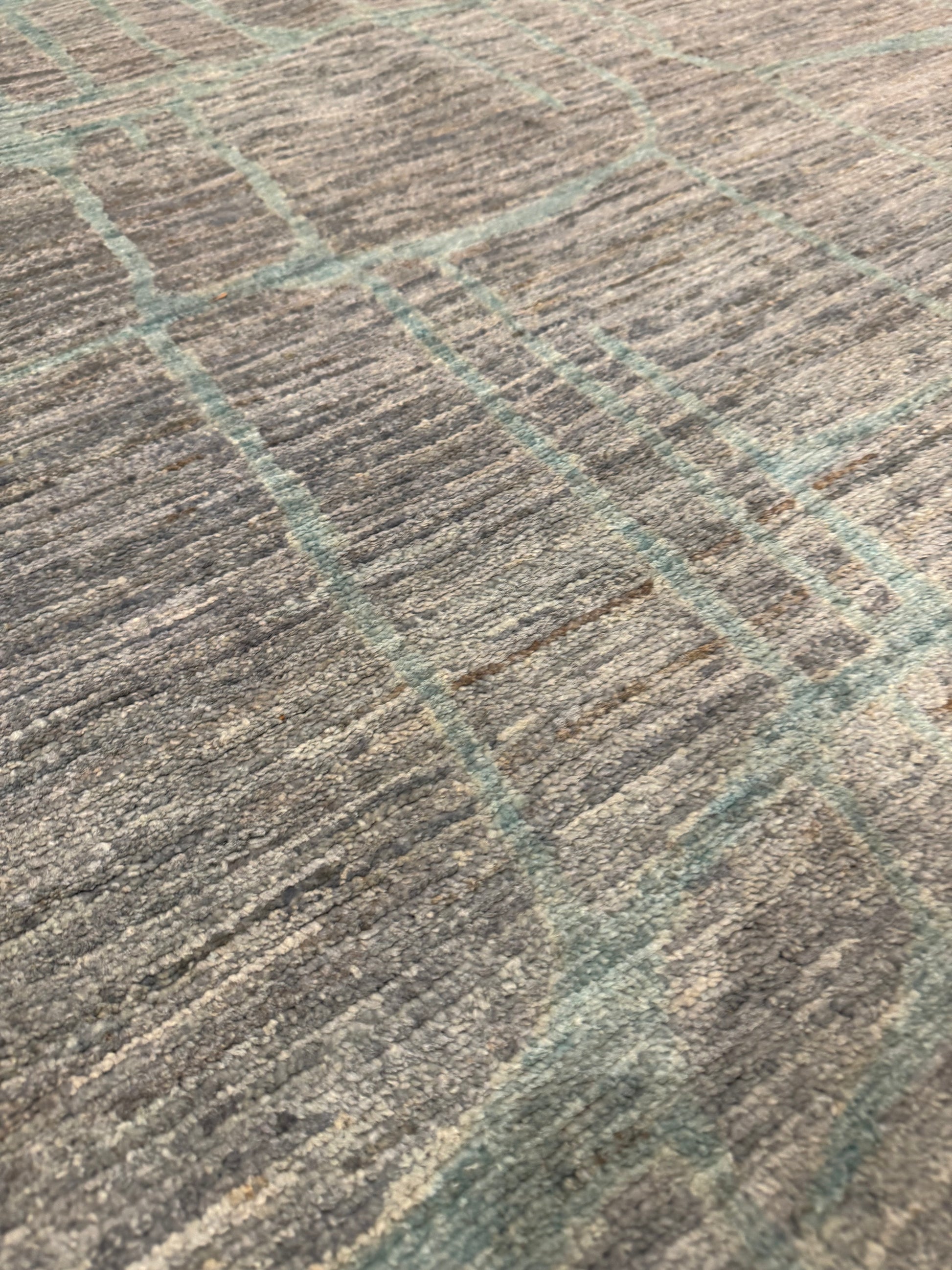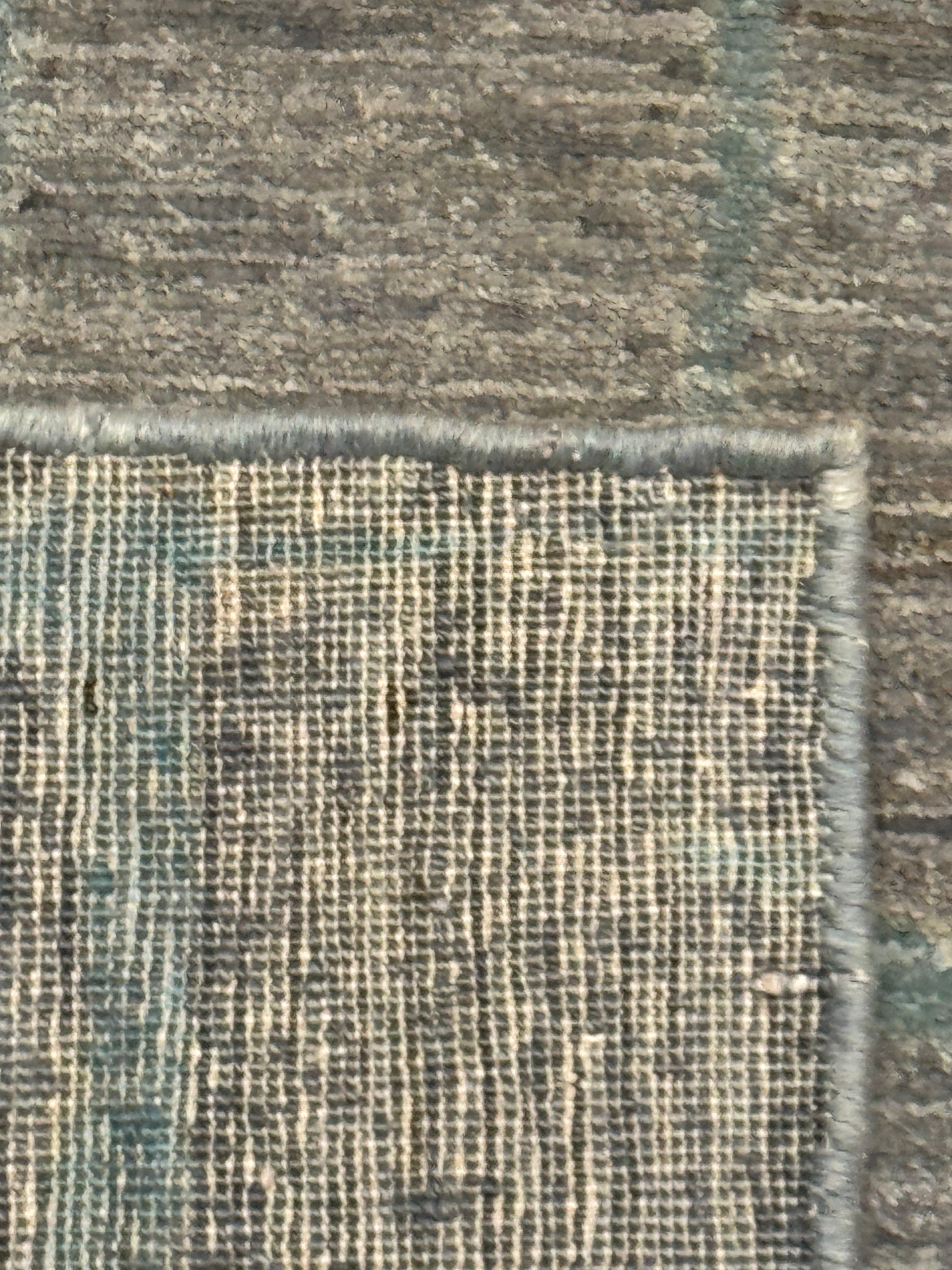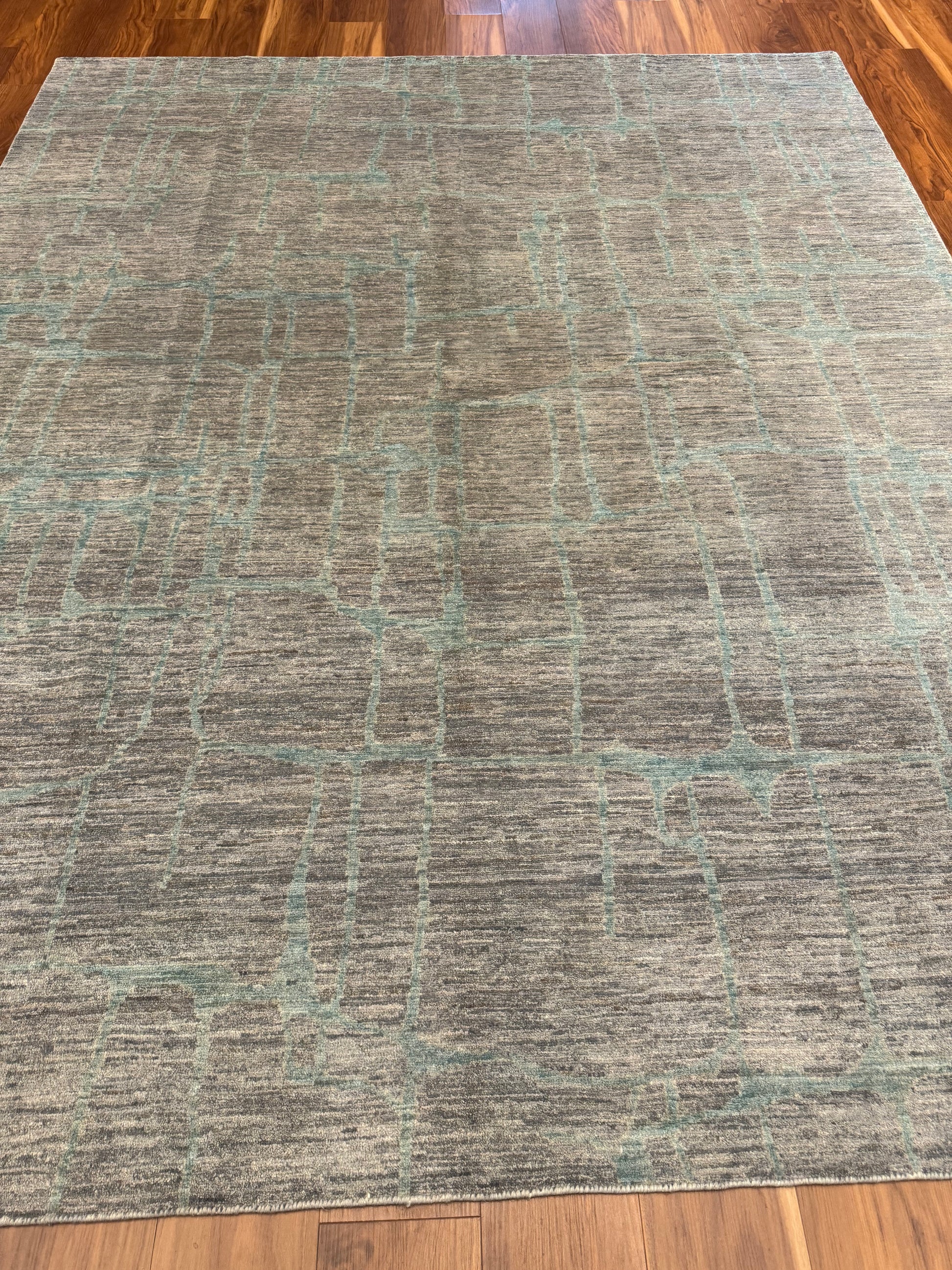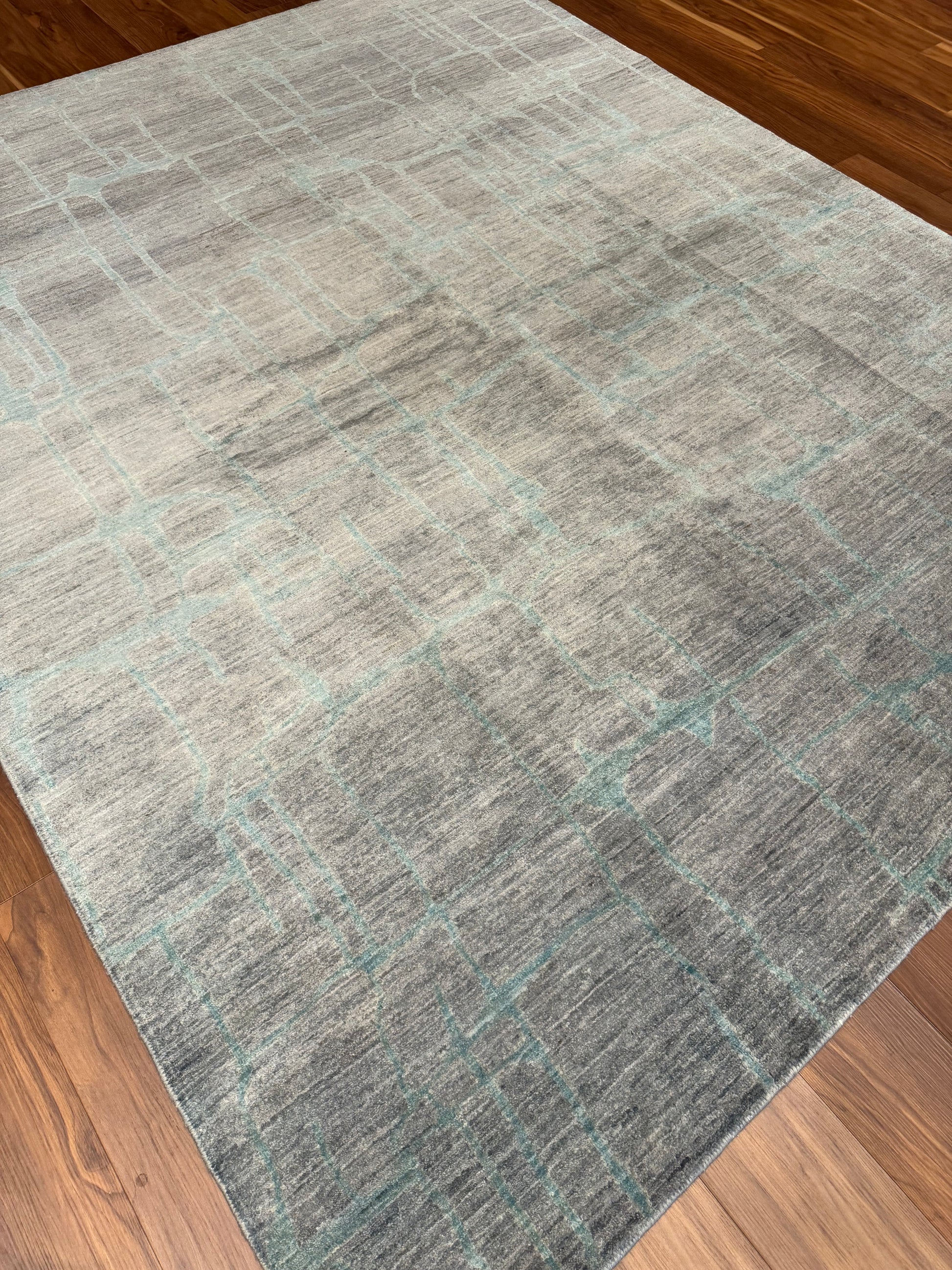 This contemporary wool/silk rug features a sophisticated and minimalistic design, perfect for modern interiors. Its subtle geometric pattern is rendered in a serene palette of taupe, beige, and light brown, with soft hints of teal providing a gentle contrast. The blend of wool and silk fibers gives the rug a luxurious feel and a subtle sheen, adding depth and elegance to the space.