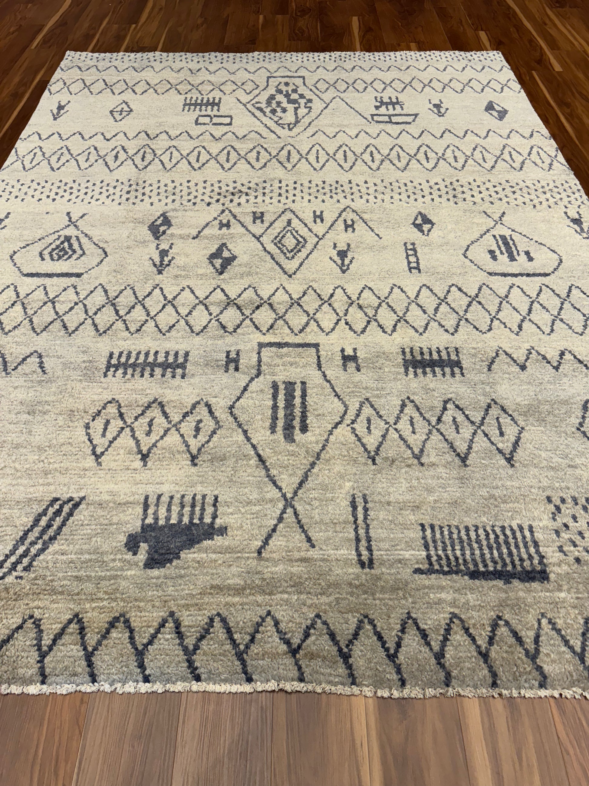 This exquisite Moroccan rug is a beautiful blend of traditional craft and contemporary elegance. Handwoven with a luxurious mix of wool and silk, it features a symphony of beige and brown hues that enrich its intricate geometric and symbolic patterns, reminiscent of the rich cultural heritage of Moroccan artisans. Perfect for adding a touch of global sophistication to any interior space.