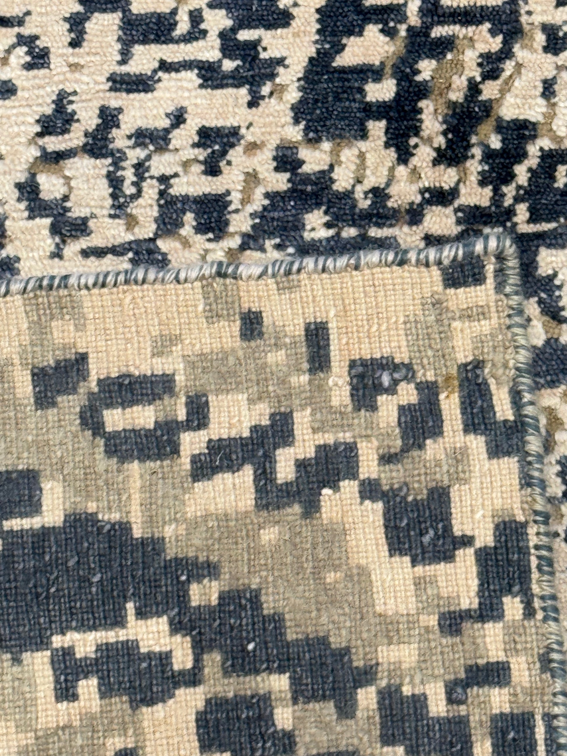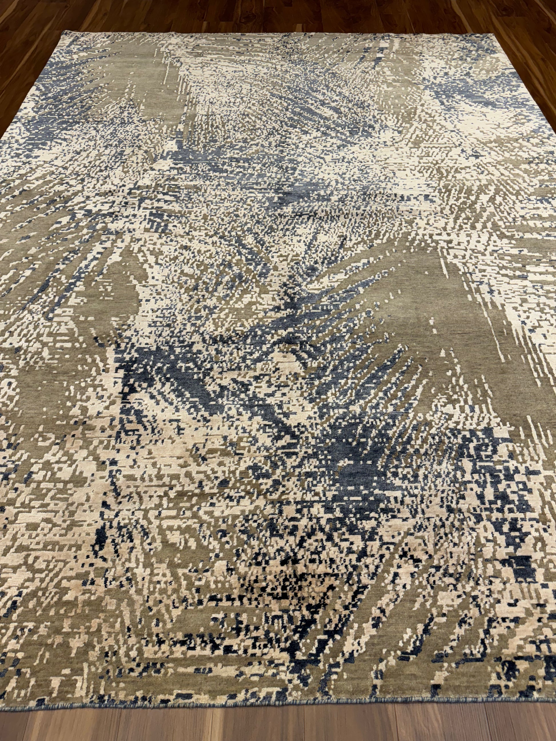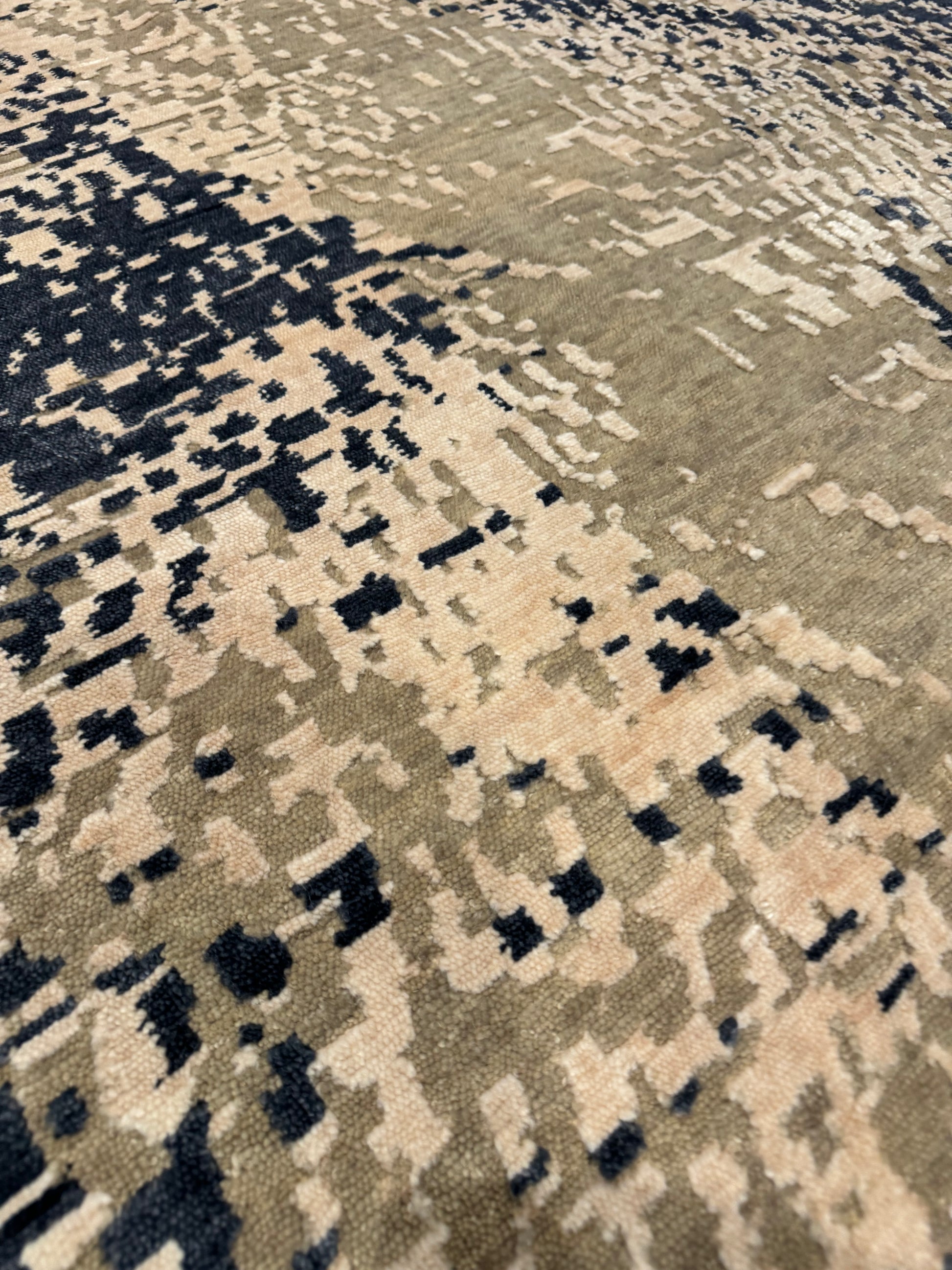 This exquisite Modern Abstract rug is a work of art for your floor, showcasing a dynamic pattern that captures the eye with its illusion of movement. Crafted from a luxurious blend of wool and silk, the rug's deep beige and brown tones are accented with hints of ivory, providing a nuanced palette that complements contemporary interiors. The sophisticated design adds a textured, multidimensional look that's both bold and inviting.